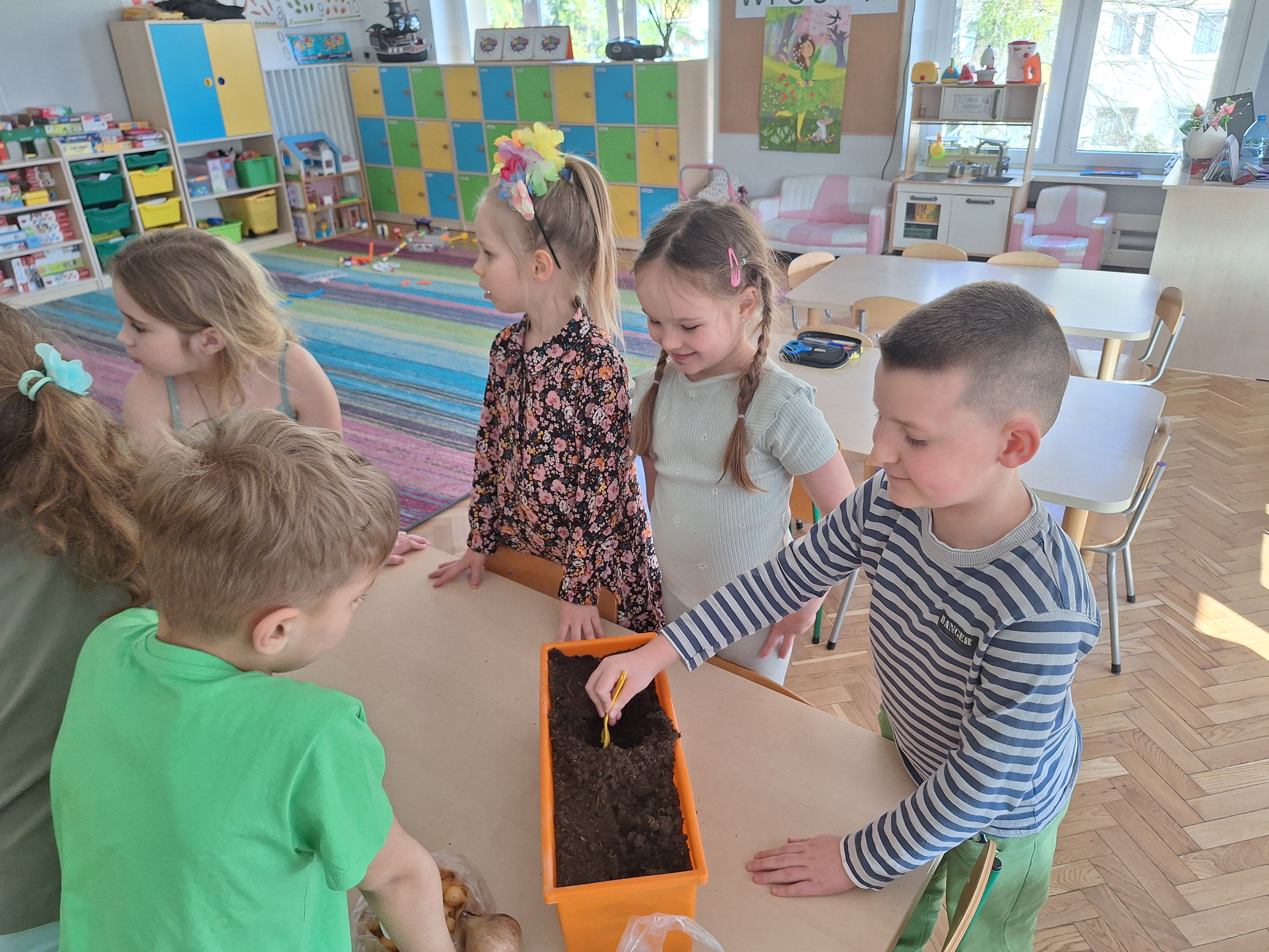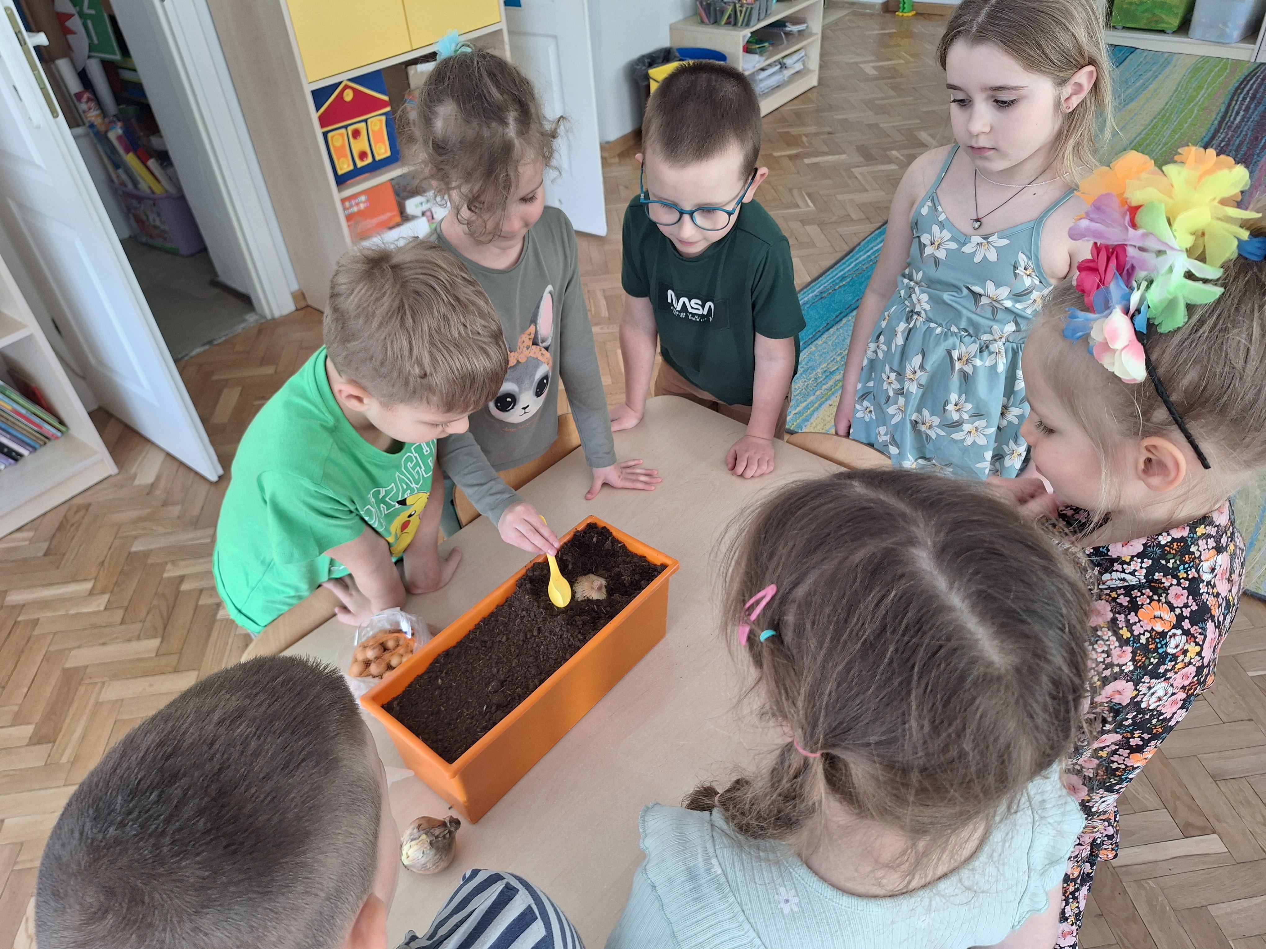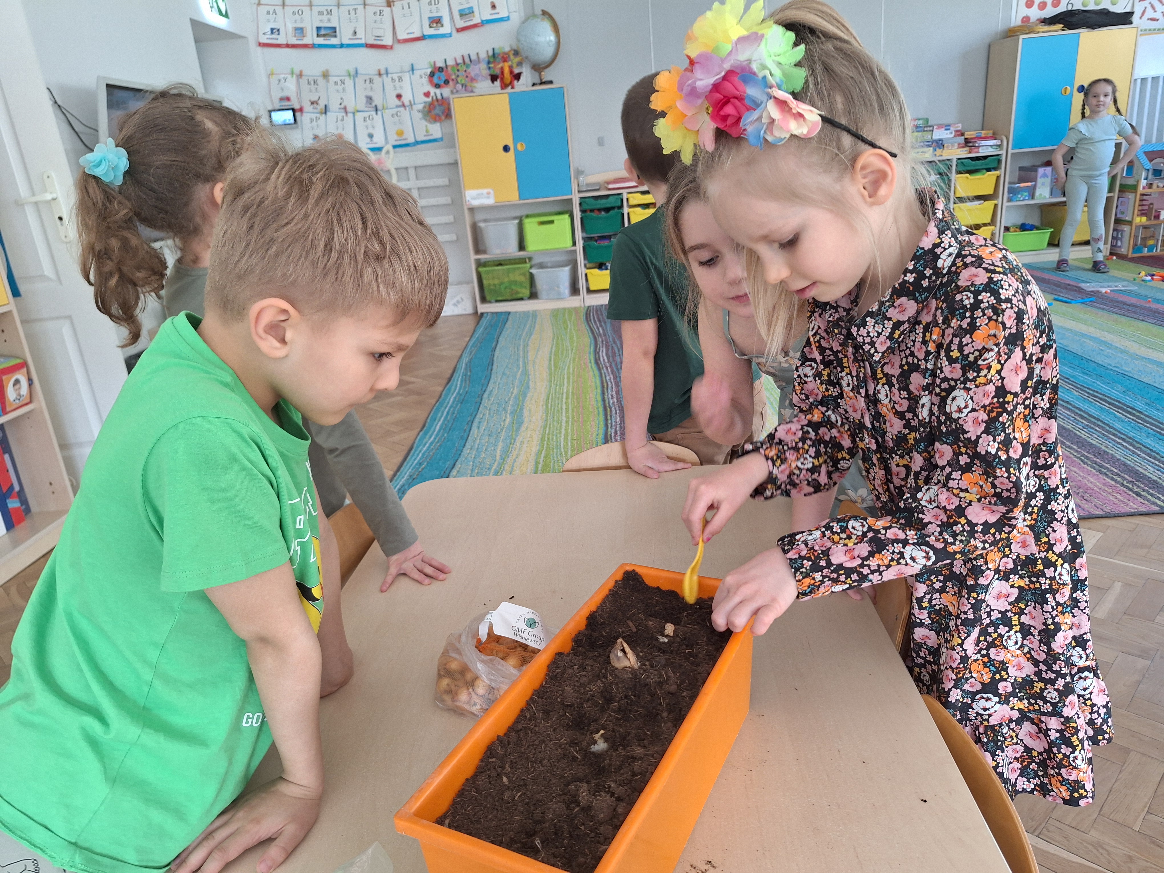 Po powrocie do sali dzieci zasadziło cebulkę w doniczce. Teraz będziemy wspólnie obserwować, jak rośliny rosną i rozwijają się wraz z nadejściem wiosny.