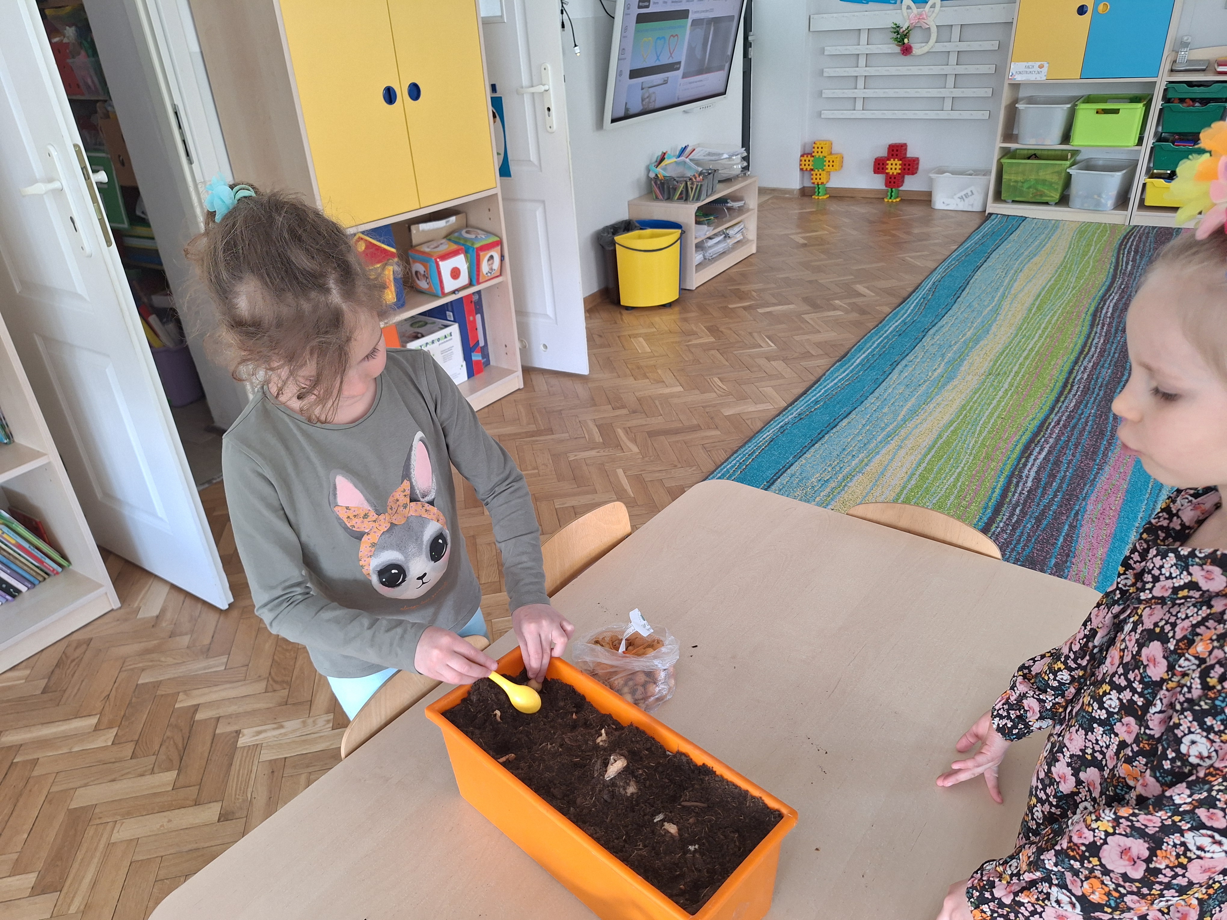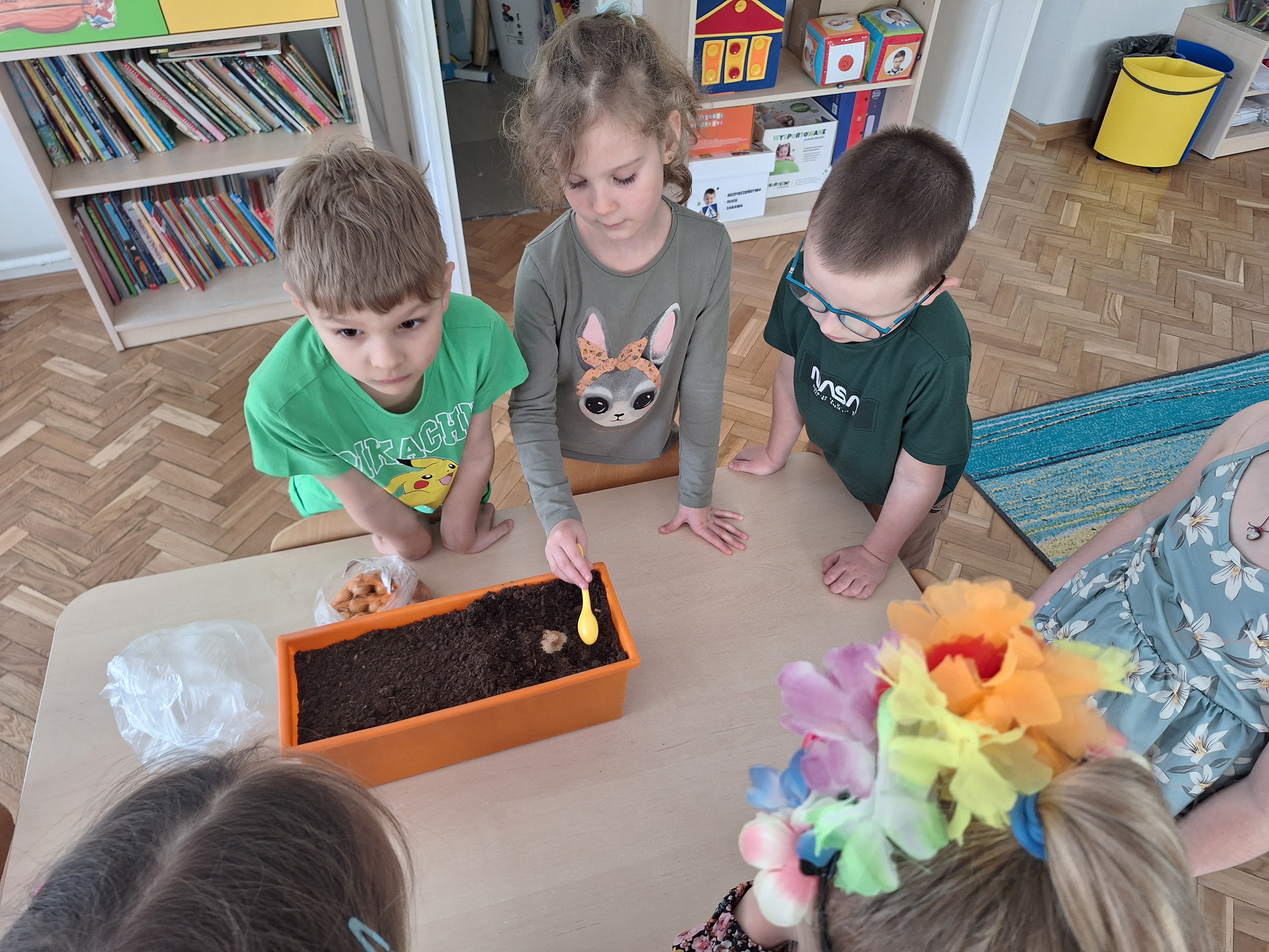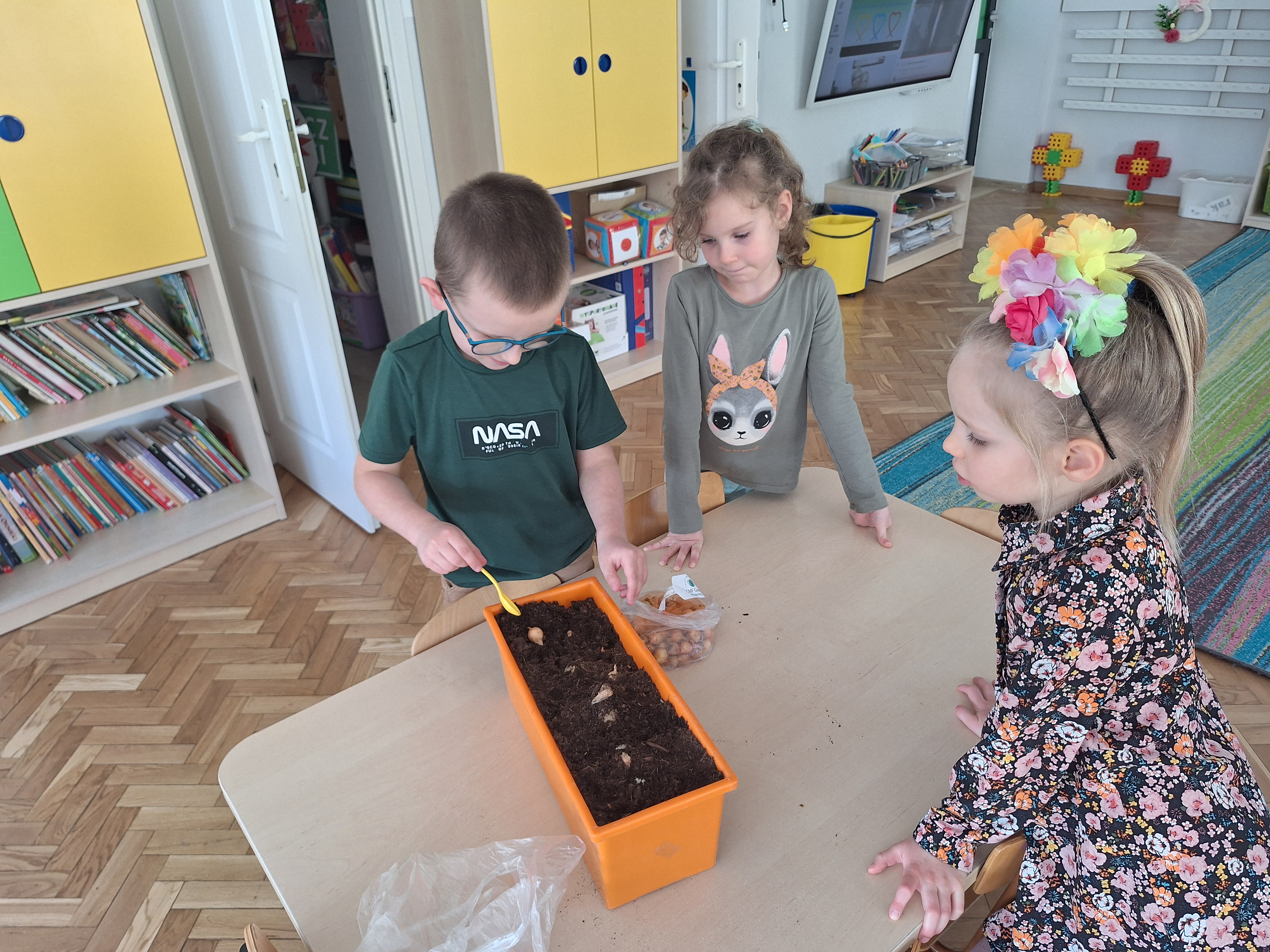 Po powrocie do sali dzieci zasadziło cebulkę w doniczce. Teraz będziemy wspólnie obserwować, jak rośliny rosną i rozwijają się wraz z nadejściem wiosny.
