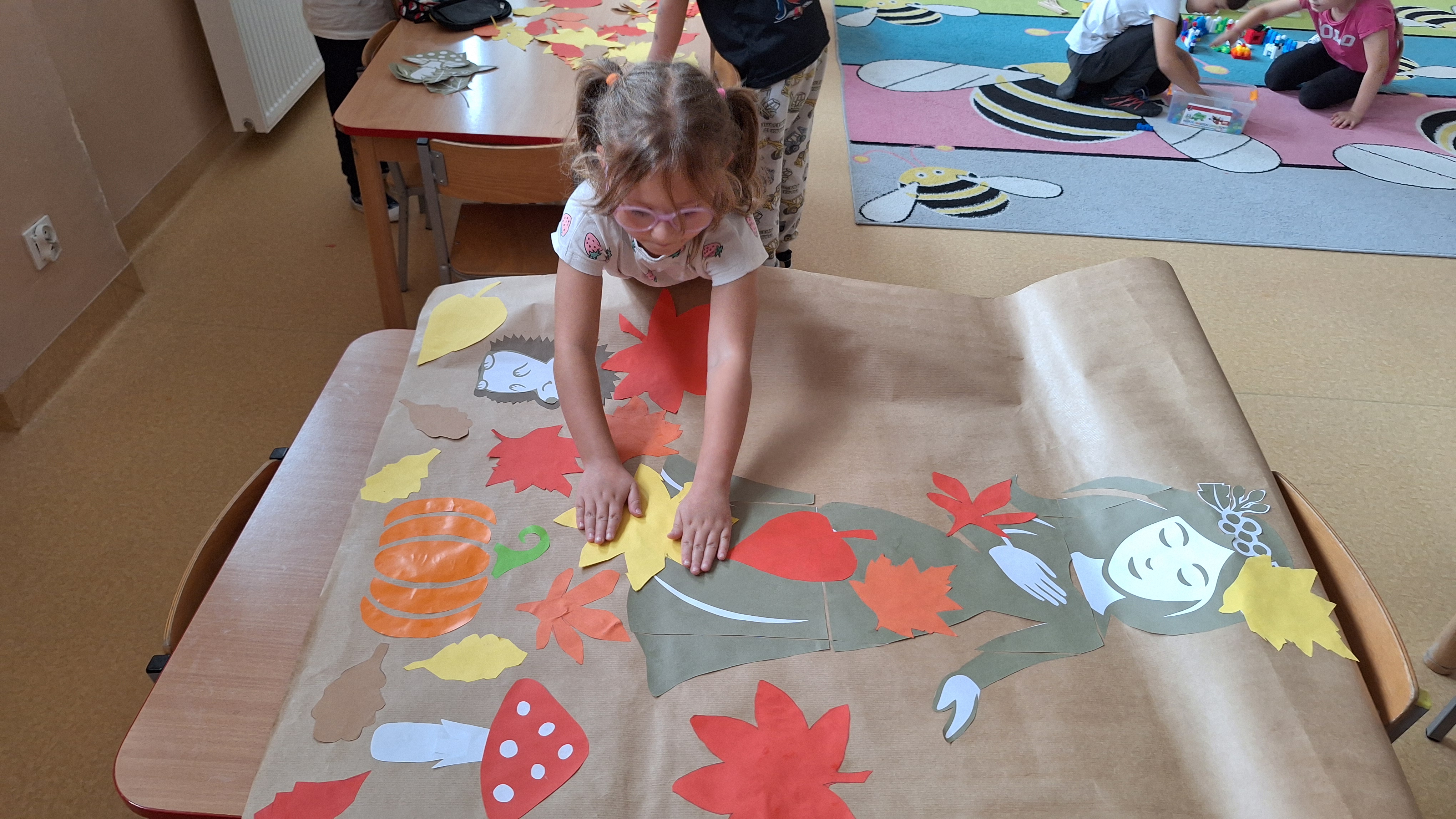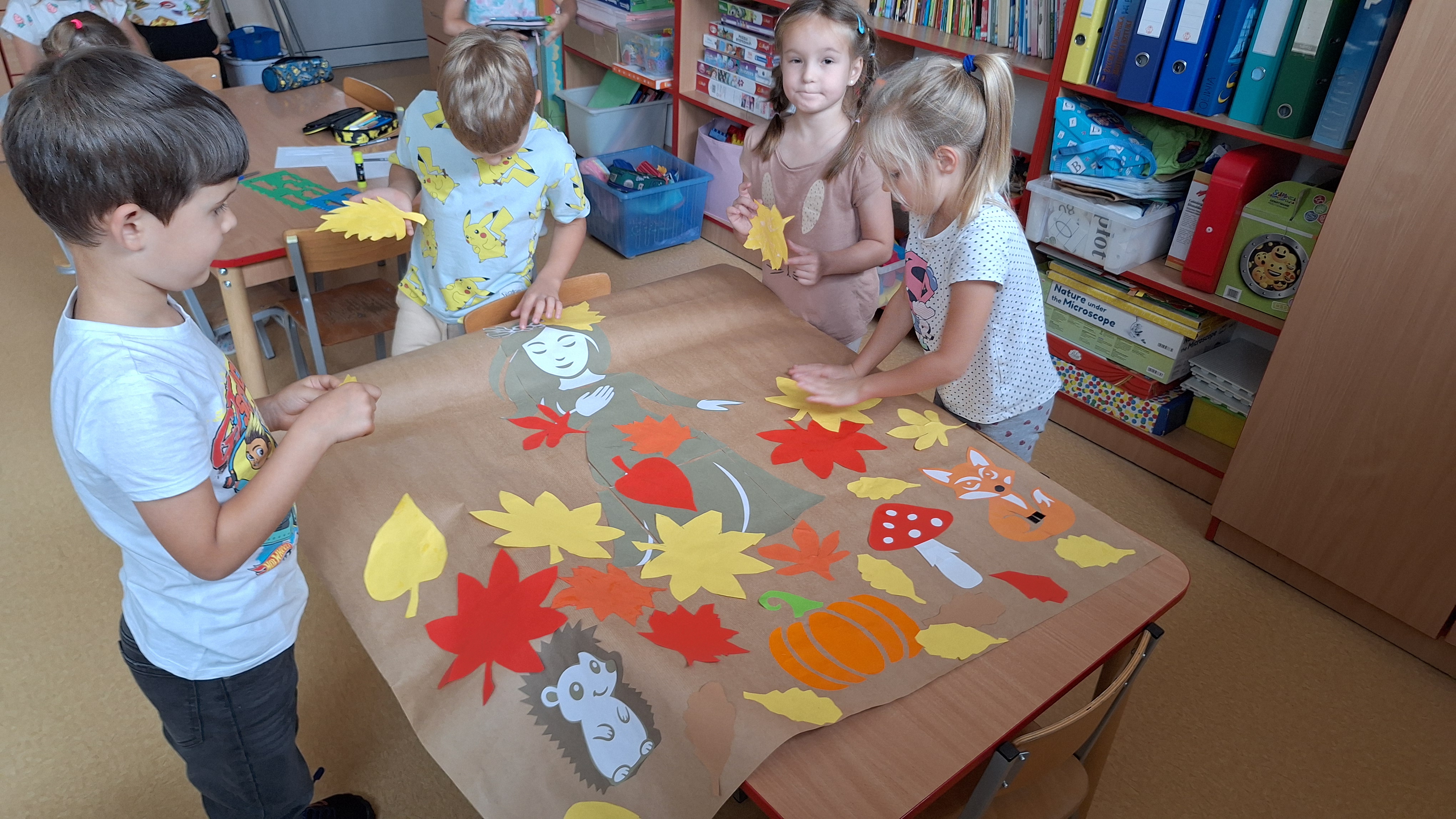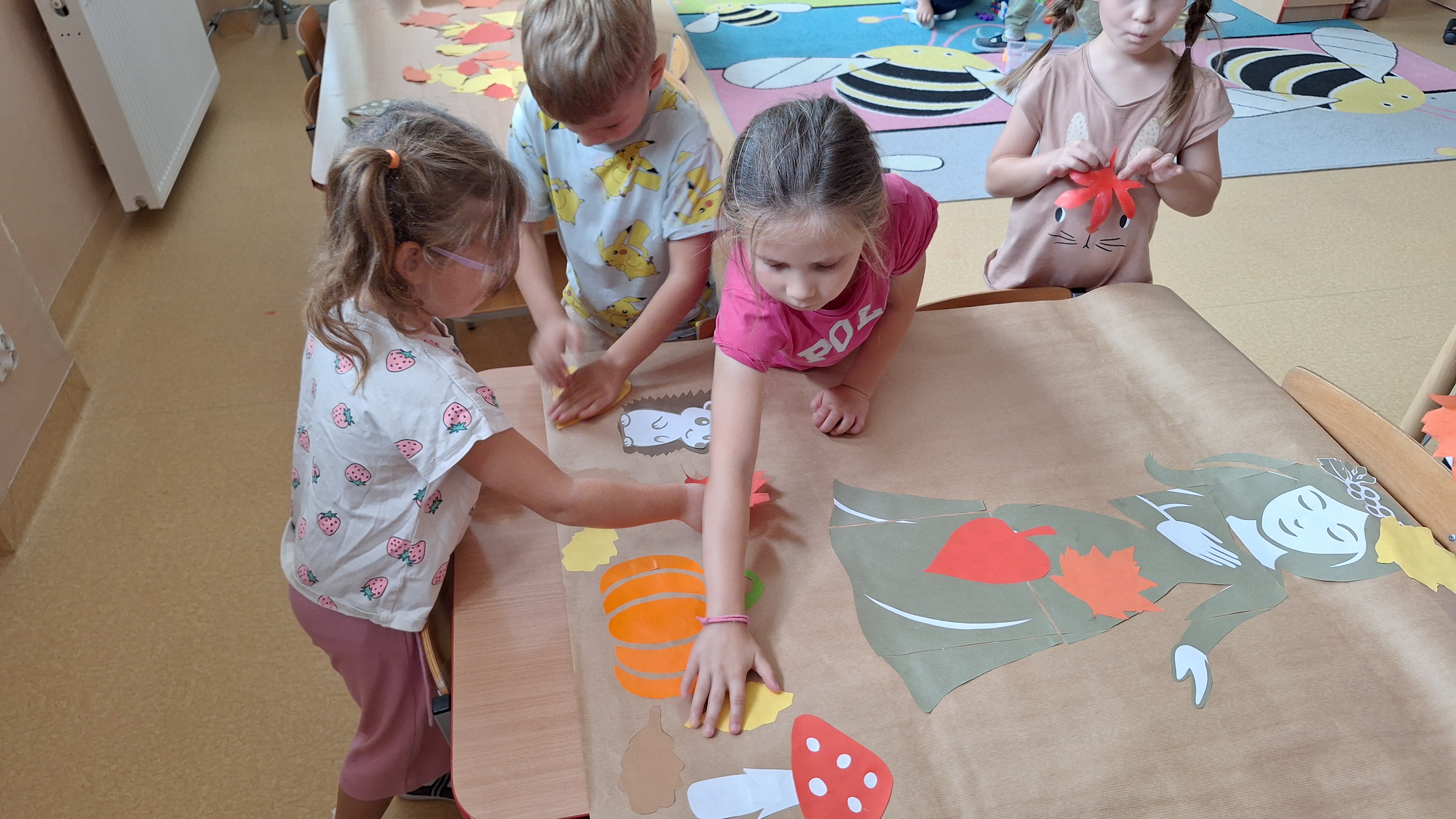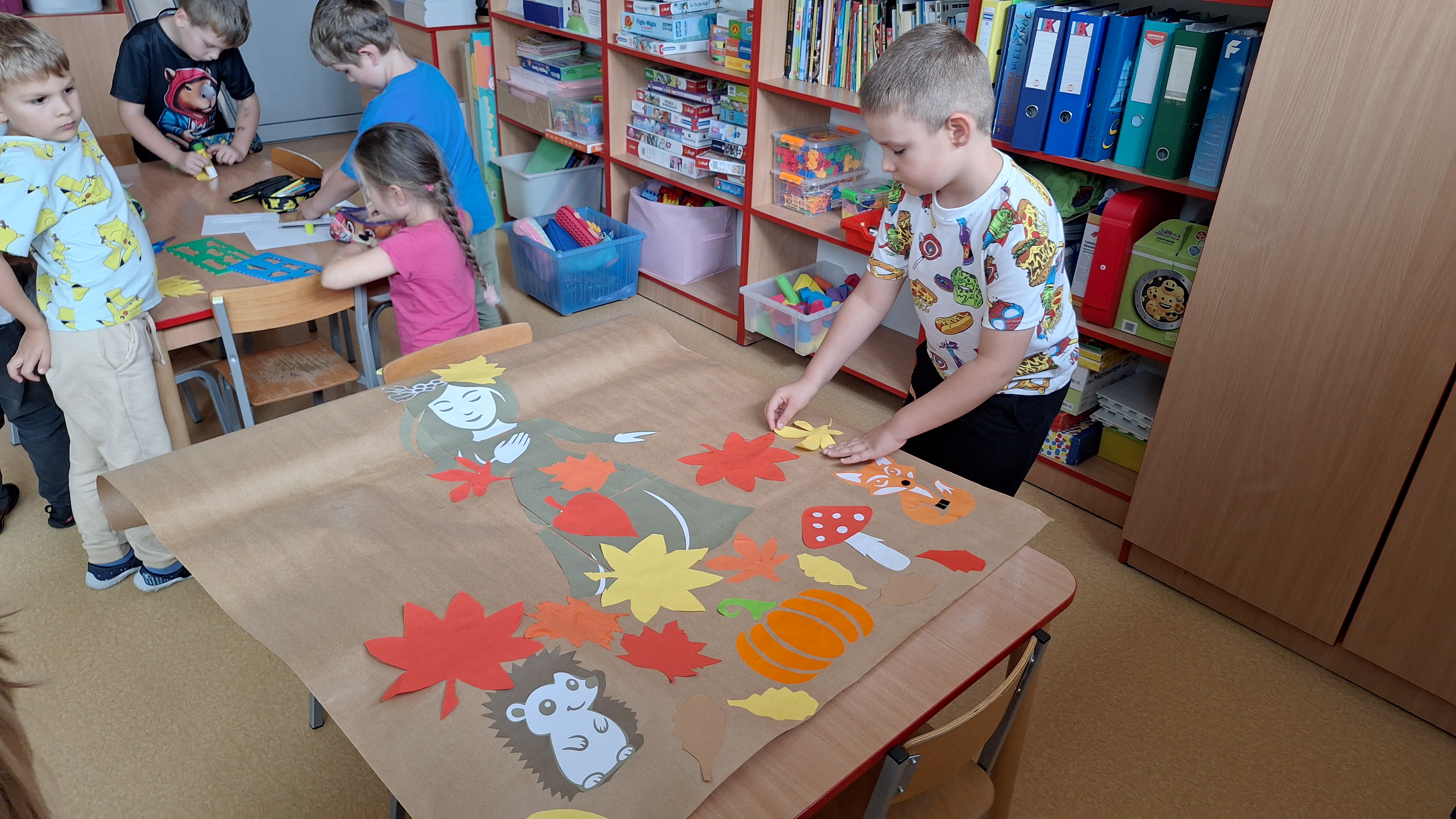 Następnie przystąpiliśmy do wspólnego wykonania plakatu „Witamy Jesień”. Przedszkolaki z zapałem tworzyły kolorowe liście, drzewa, kasztany, grzyby i inne jesienne symbole, wykorzystując różnorodne materiały plastyczne. Wspólna praca sprawiła wszystkim wiele radości i stała się piękną dekoracją naszej sali.
