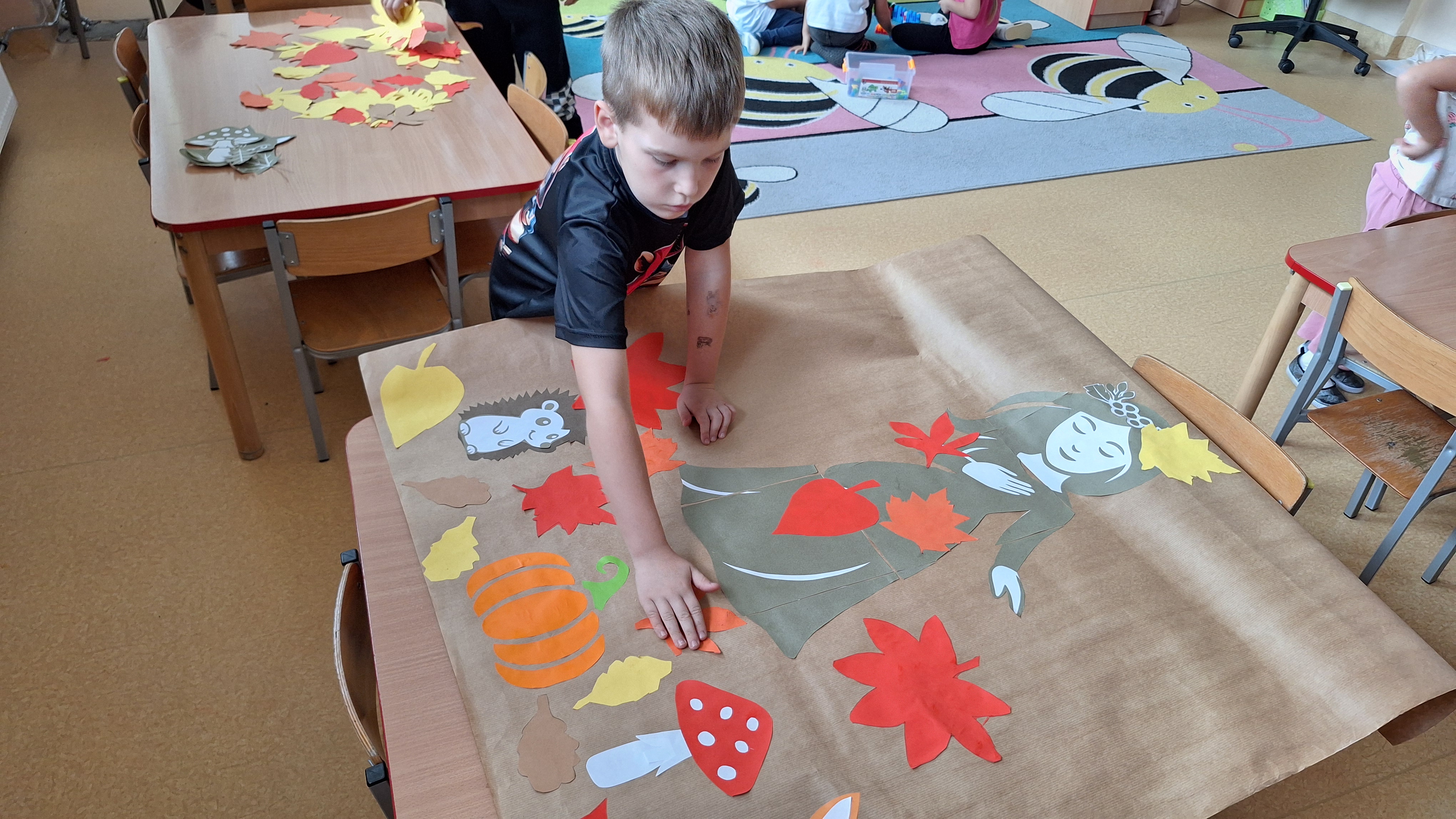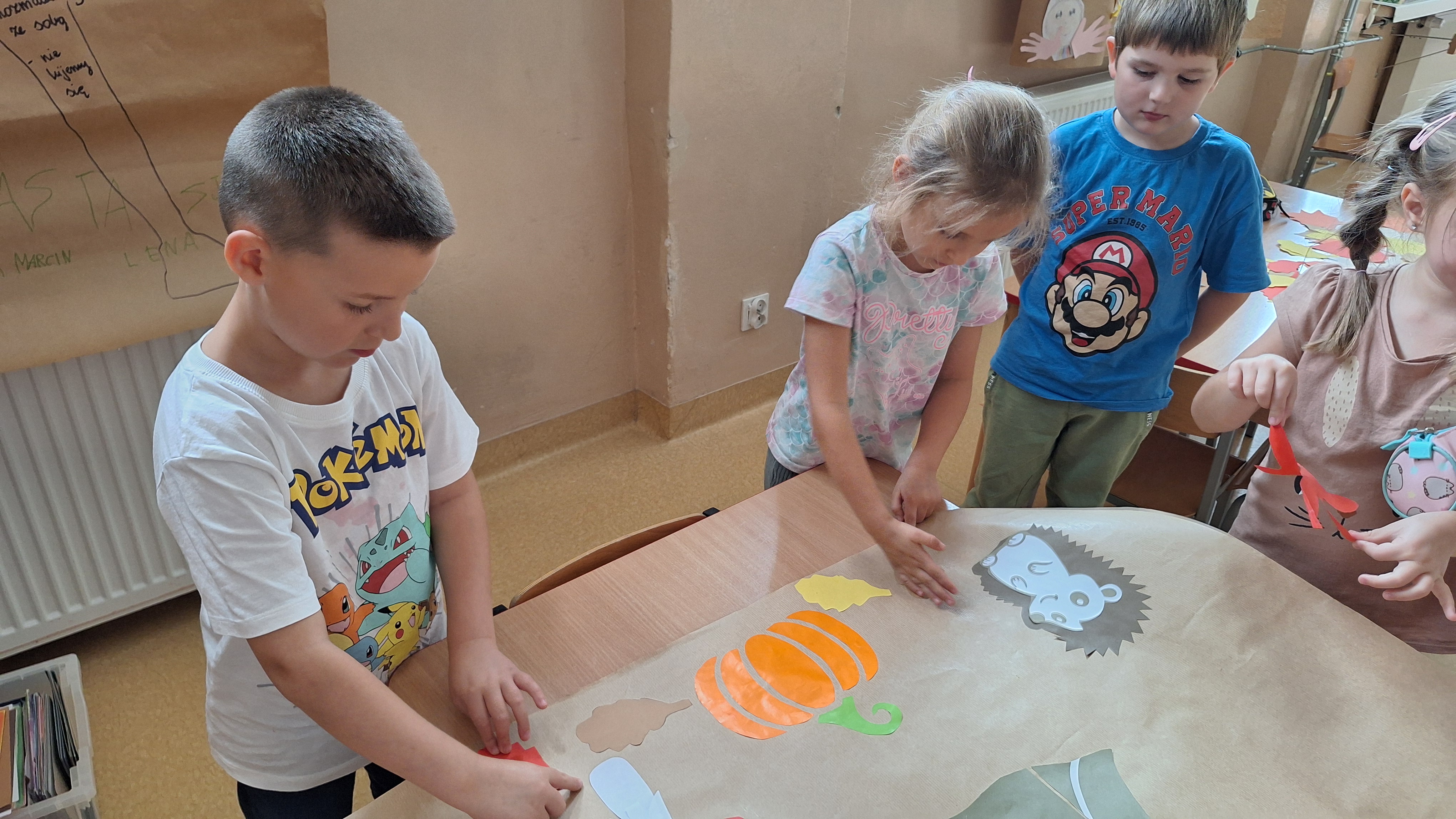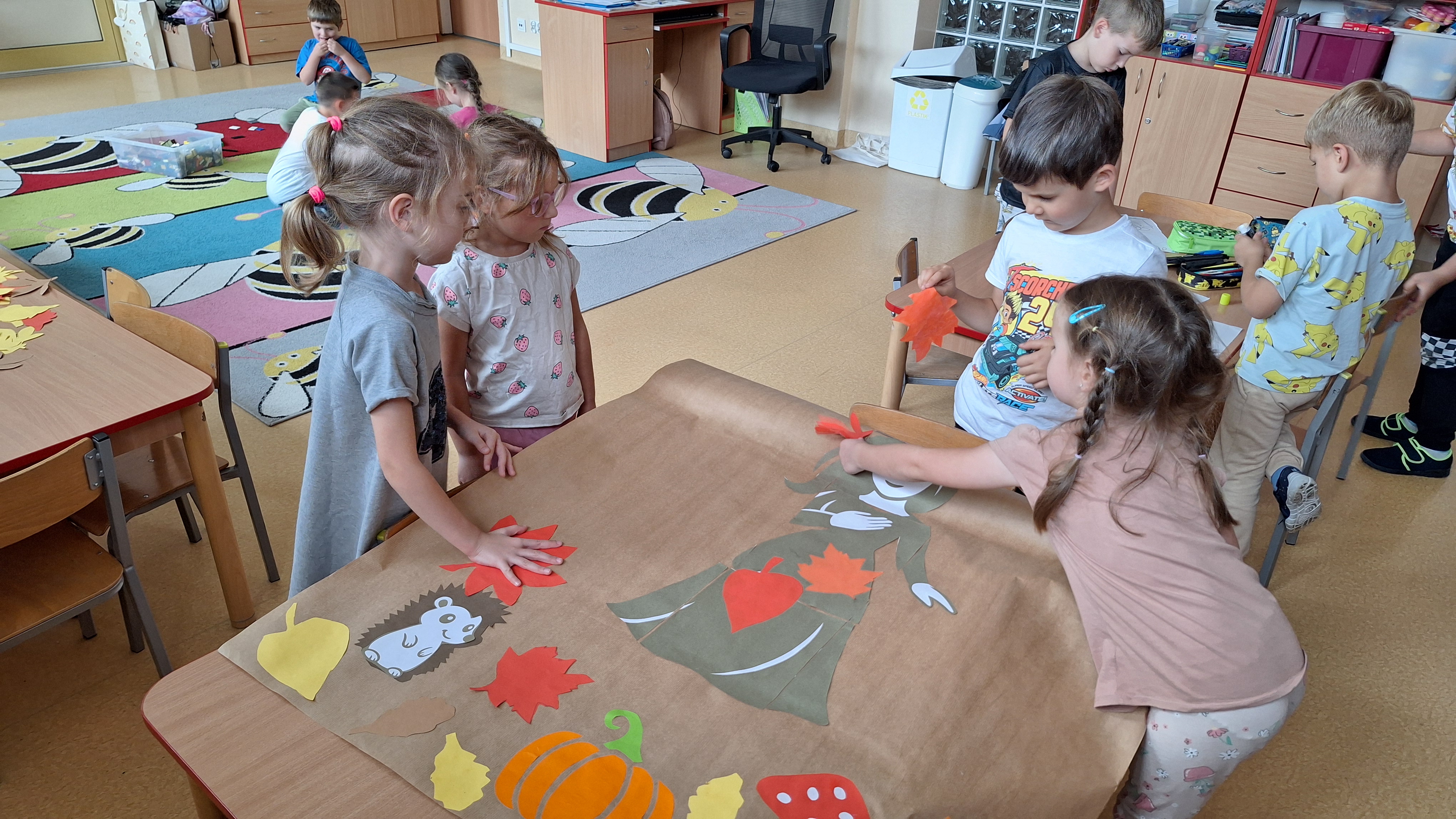 Następnie przystąpiliśmy do wspólnego wykonania plakatu „Witamy Jesień”. Przedszkolaki z zapałem tworzyły kolorowe liście, drzewa, kasztany, grzyby i inne jesienne symbole, wykorzystując różnorodne materiały plastyczne. Wspólna praca sprawiła wszystkim wiele radości i stała się piękną dekoracją naszej sali.