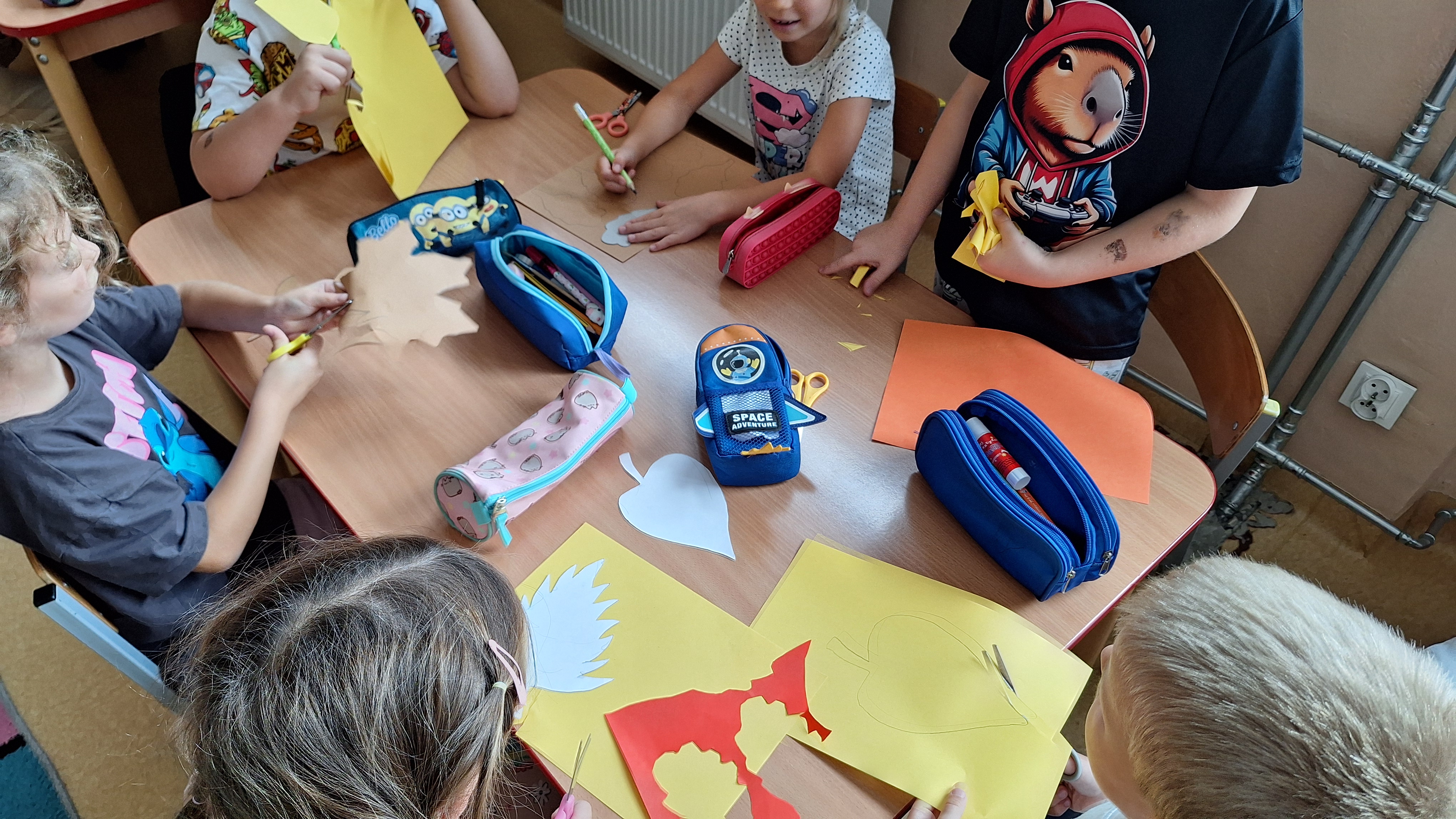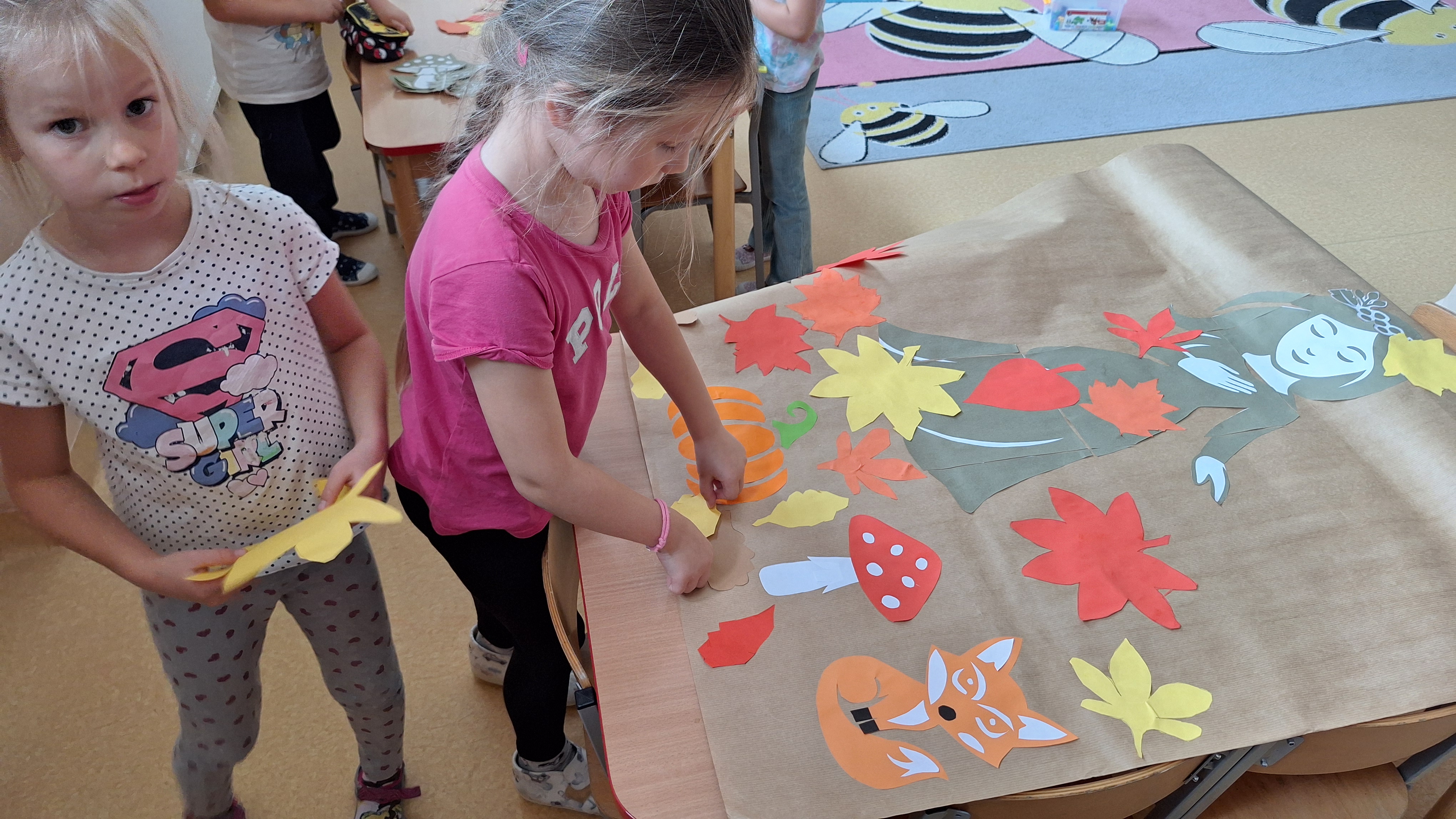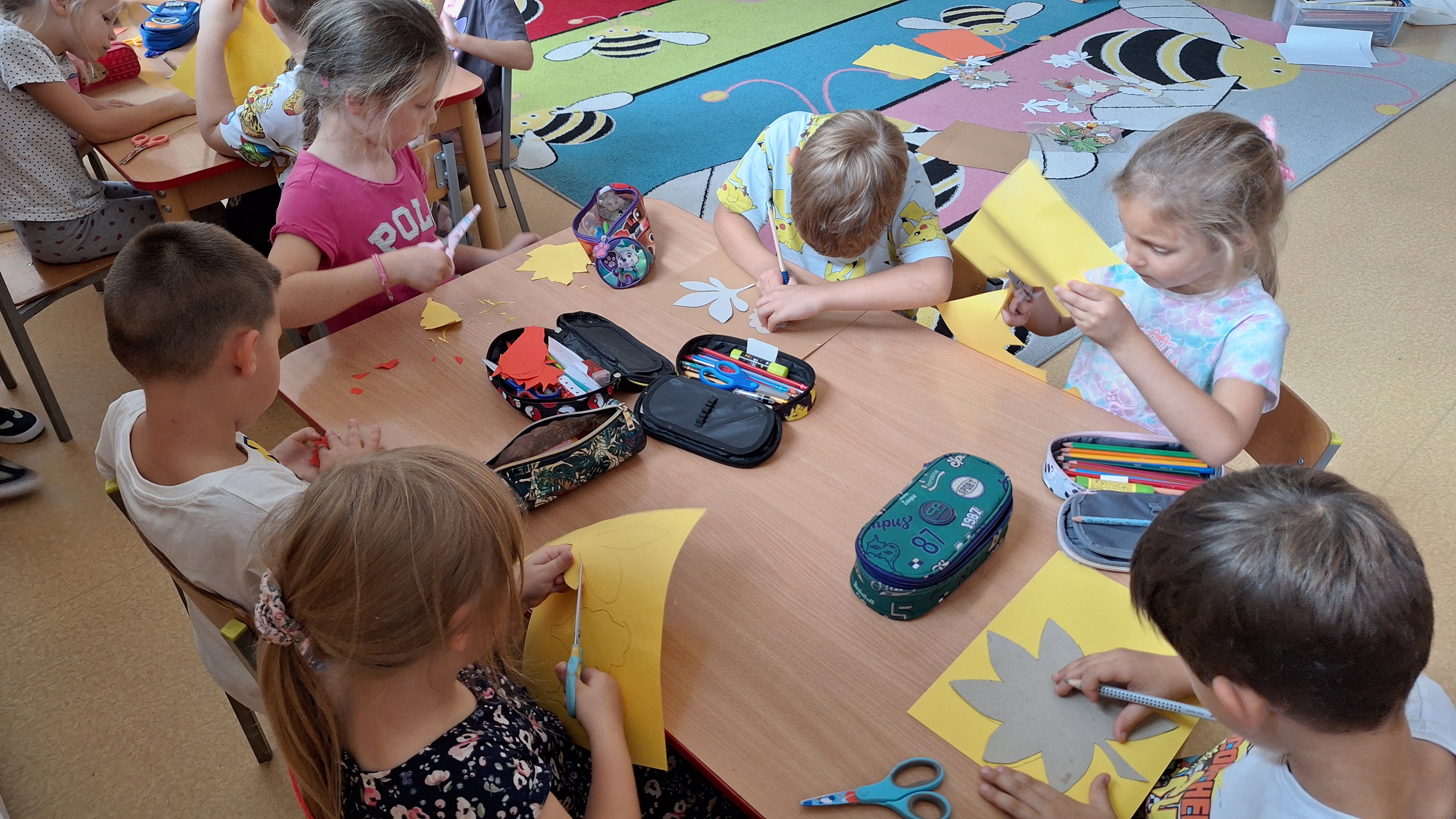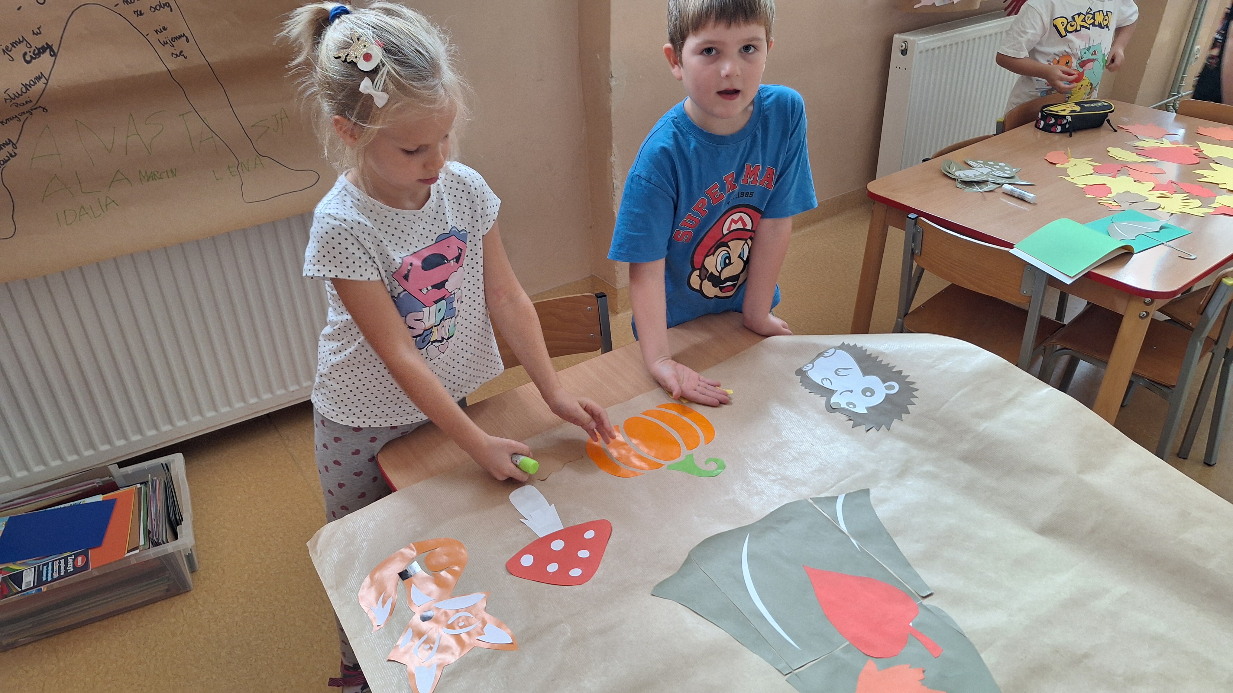 Następnie przystąpiliśmy do wspólnego wykonania plakatu „Witamy Jesień”. Przedszkolaki z zapałem tworzyły kolorowe liście, drzewa, kasztany, grzyby i inne jesienne symbole, wykorzystując różnorodne materiały plastyczne. Wspólna praca sprawiła wszystkim wiele radości i stała się piękną dekoracją naszej sali.