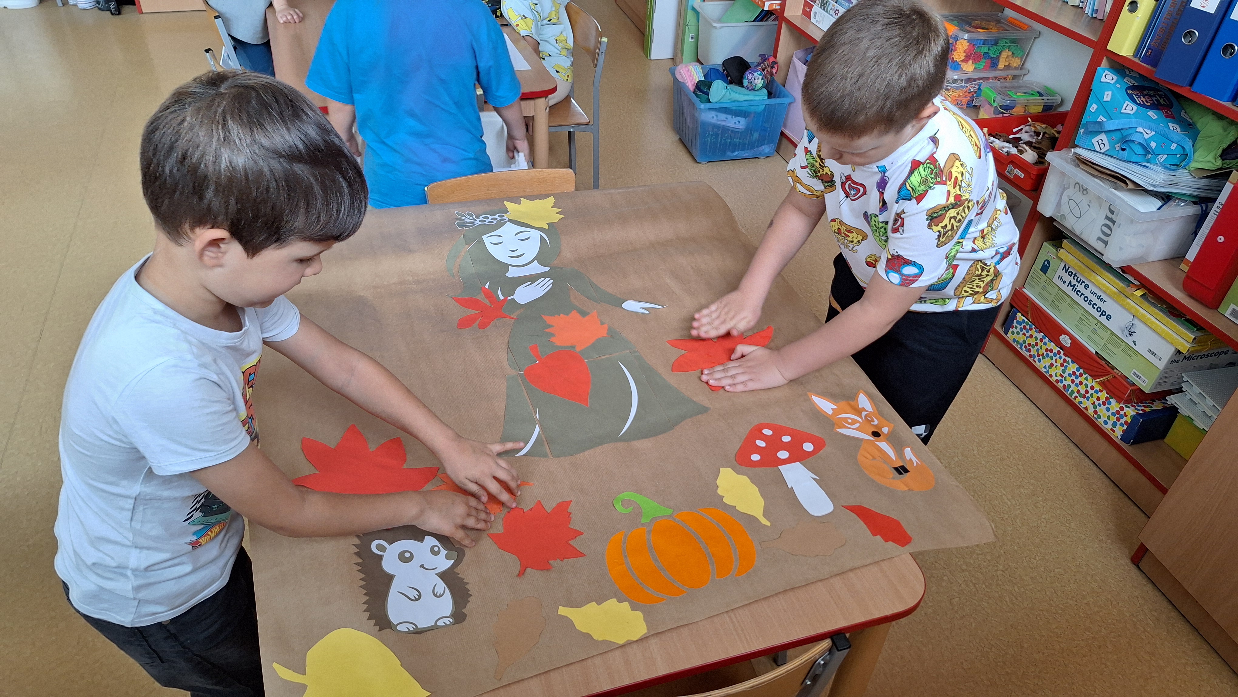 Na początku dzieci wzięły udział w obserwacjach przyrodniczych – wspólnie rozmawialiśmy o zmianach zachodzących w otoczeniu, kolorach liści, jesiennej pogodzie oraz o tym, jakie owoce i warzywa pojawiają się o tej porze roku. Dzieci dzieliły się własnymi spostrzeżeniami i doświadczeniami – opowiadały, co zaobserwowały podczas spacerów z rodzicami czy w drodze do przedszkola.