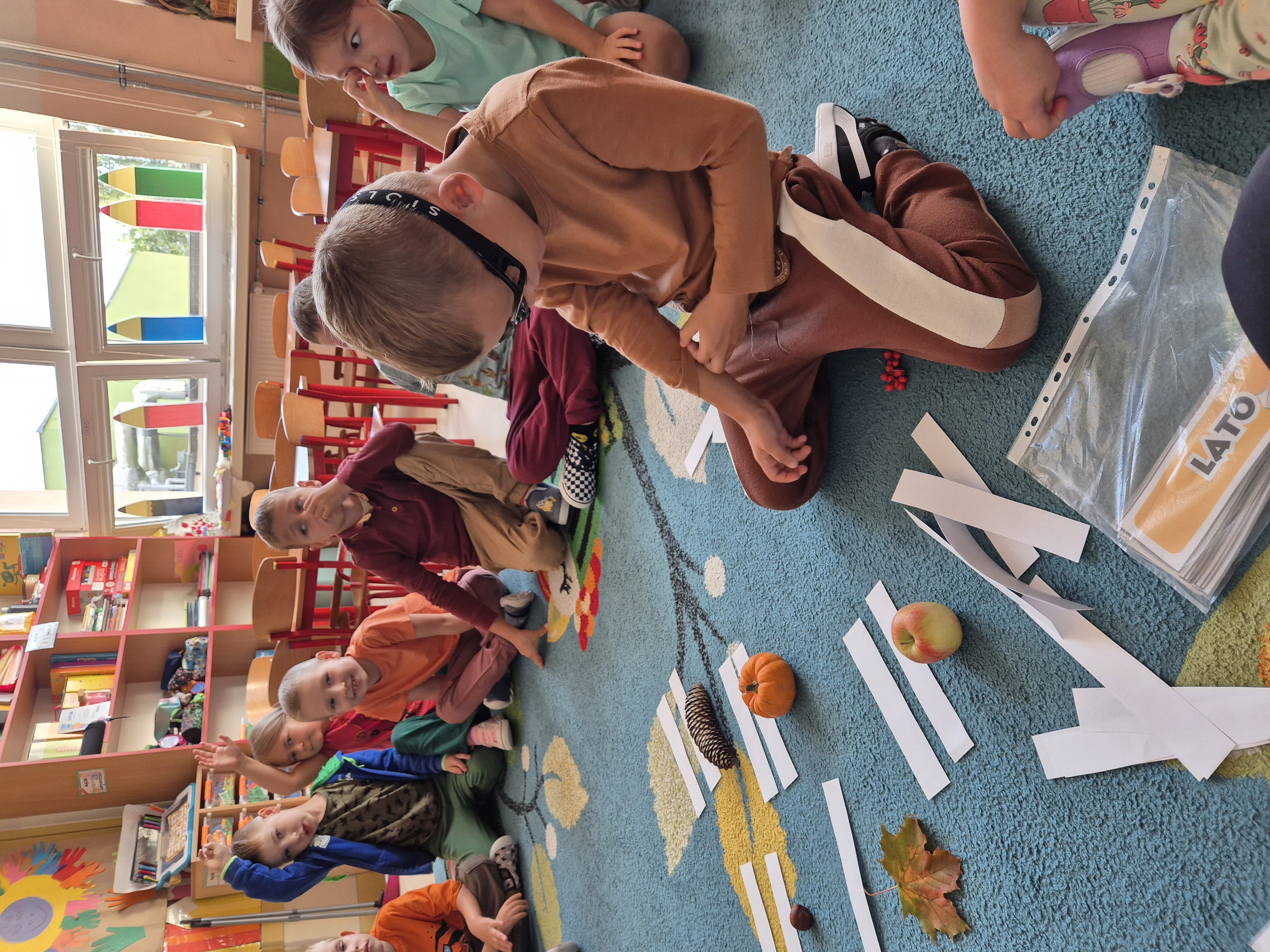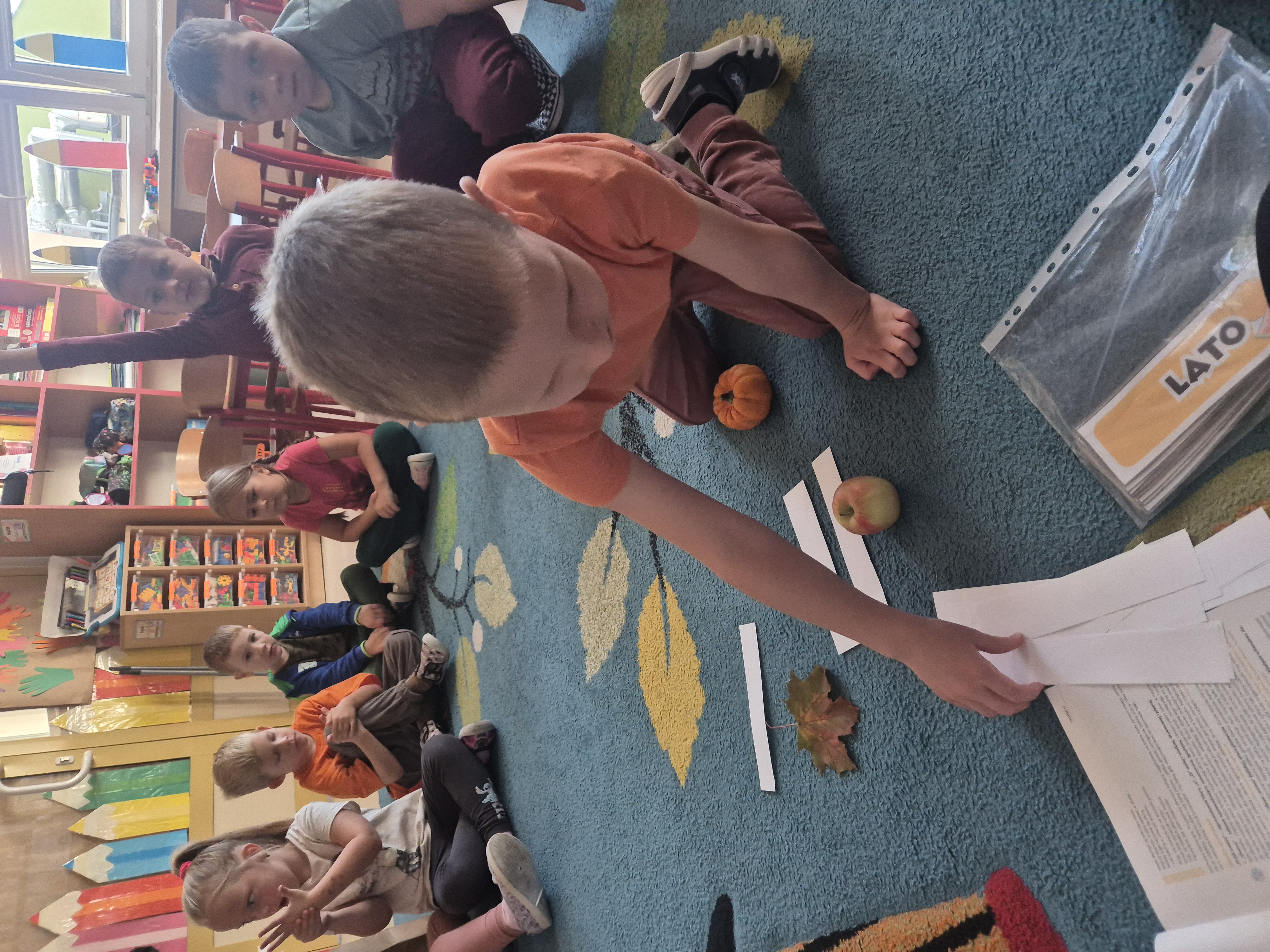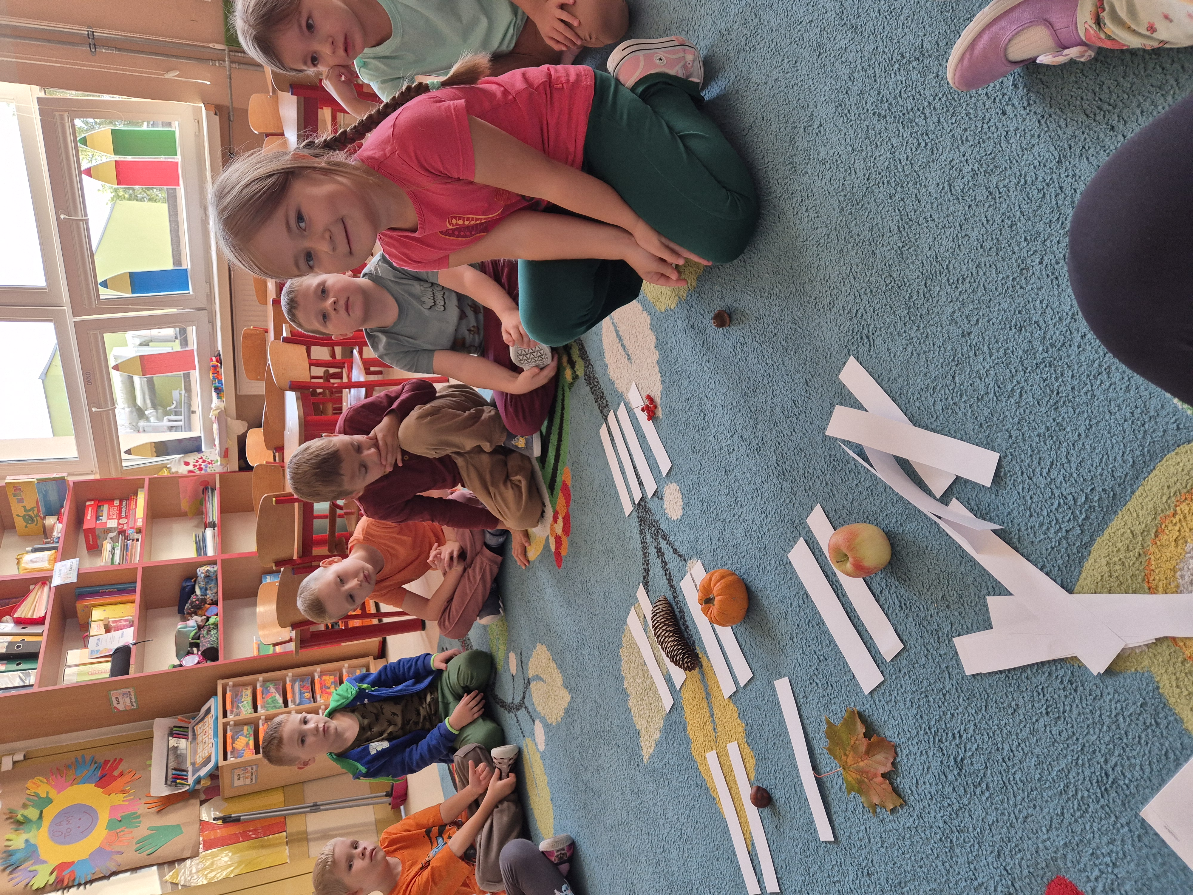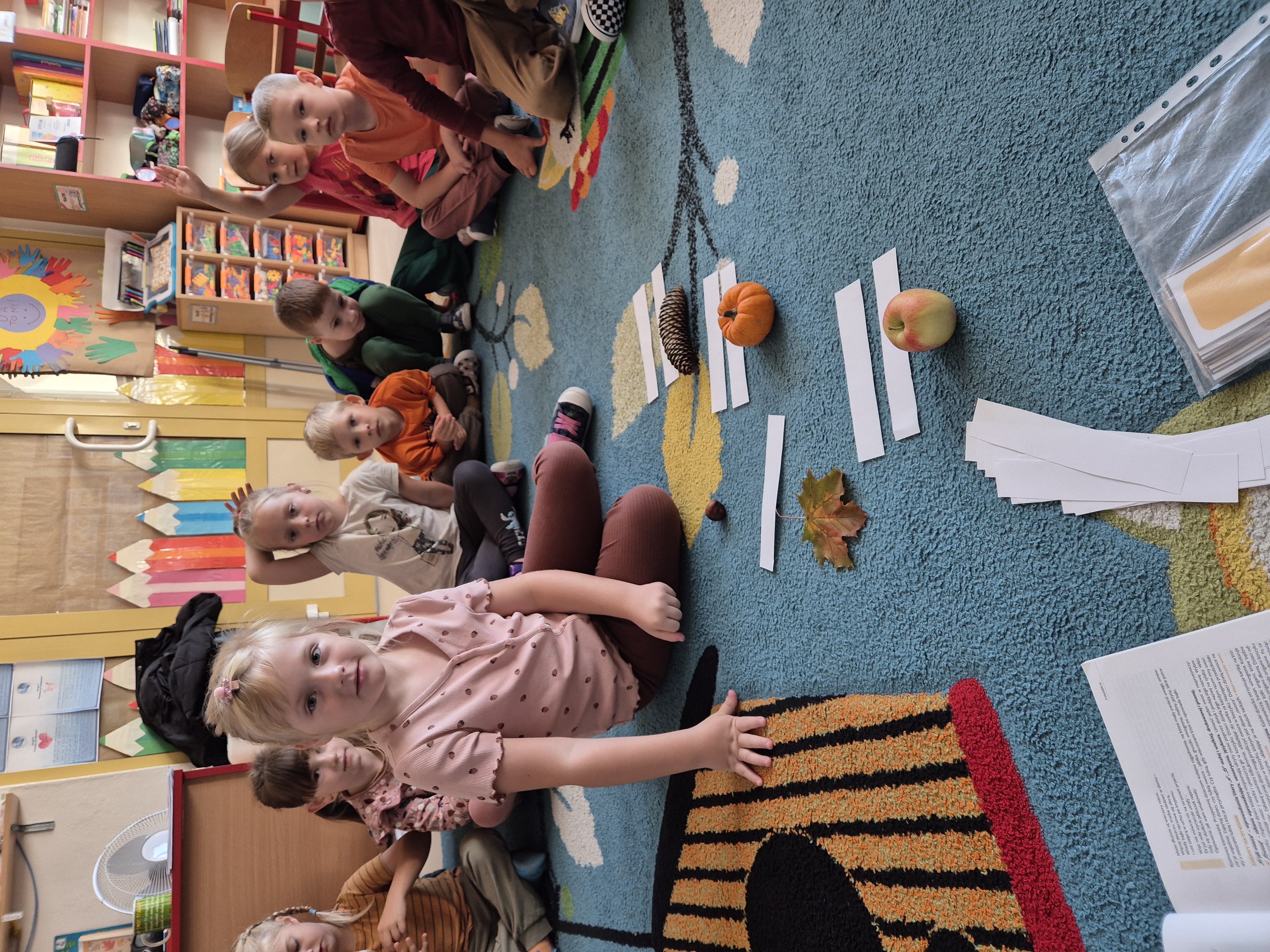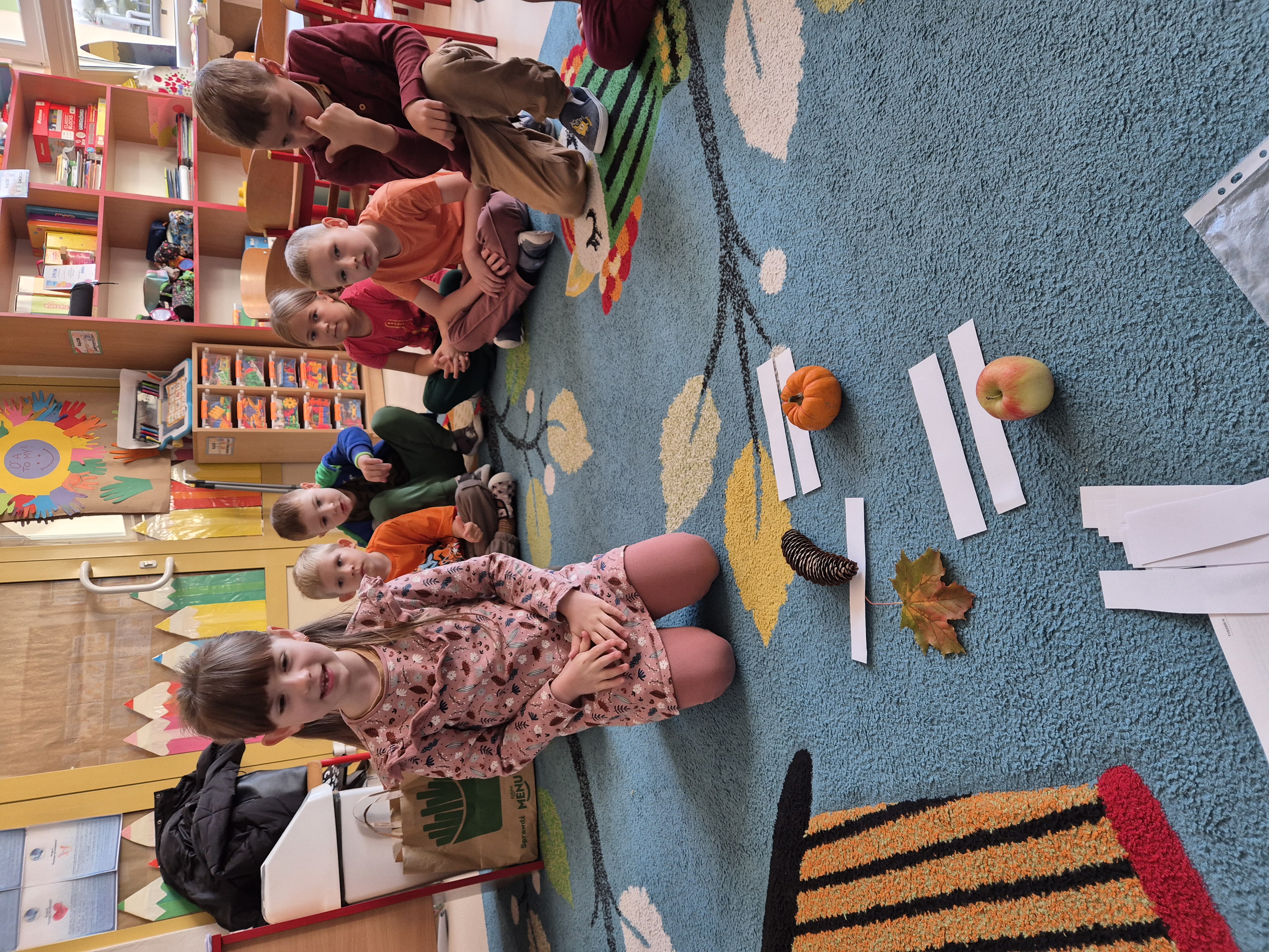 Na początku dzieci wzięły udział w obserwacjach przyrodniczych – wspólnie rozmawialiśmy o zmianach zachodzących w otoczeniu, kolorach liści, jesiennej pogodzie oraz o tym, jakie owoce i warzywa pojawiają się o tej porze roku. Dzieci dzieliły się własnymi spostrzeżeniami i doświadczeniami – opowiadały, co zaobserwowały podczas spacerów z rodzicami czy w drodze do przedszkola.