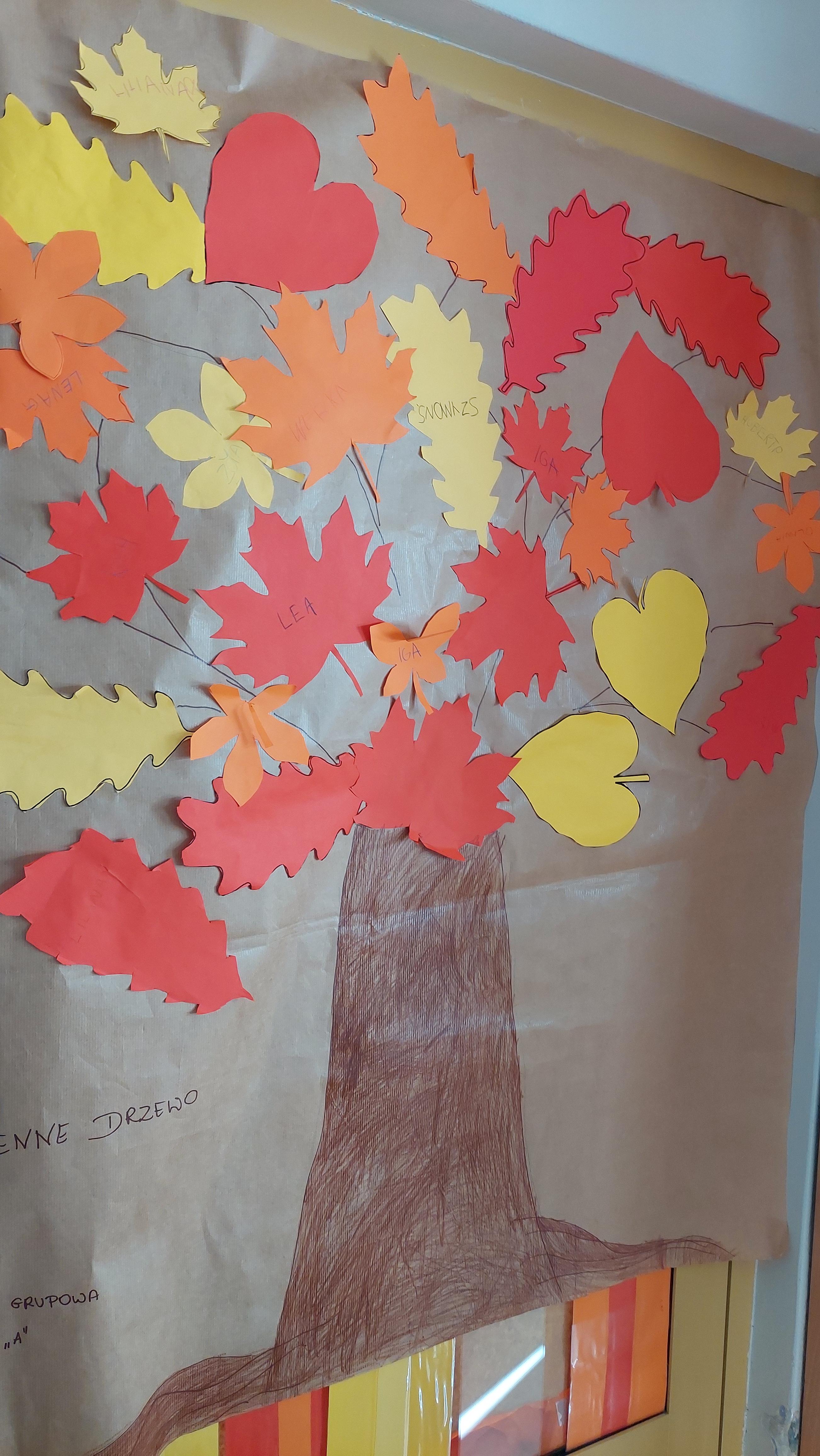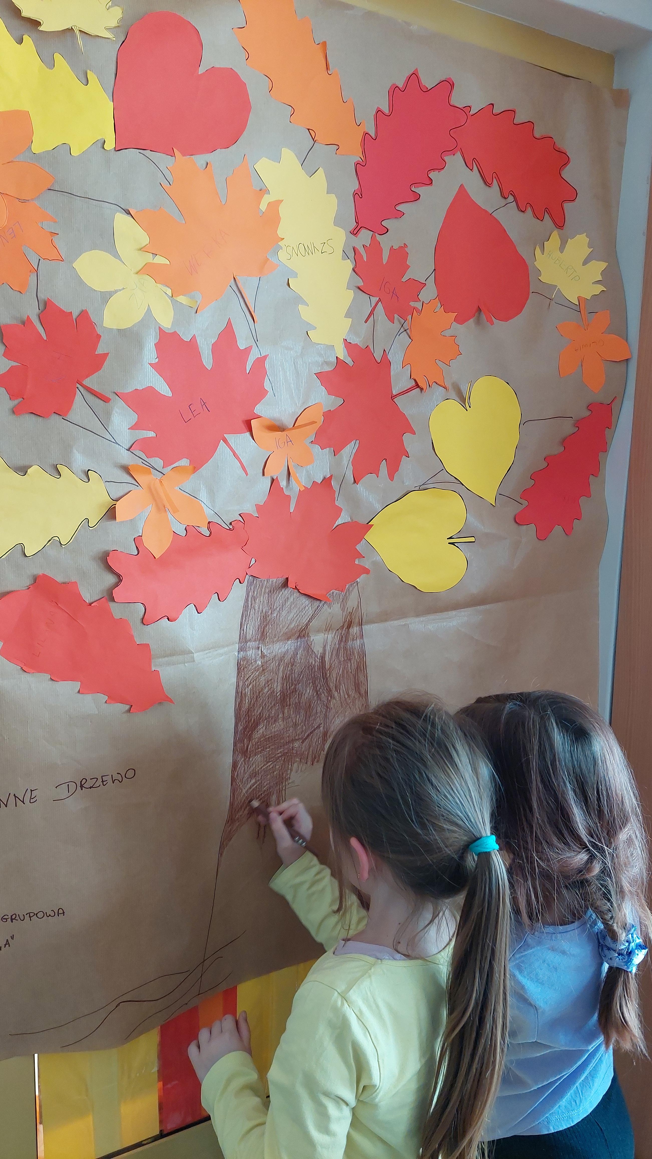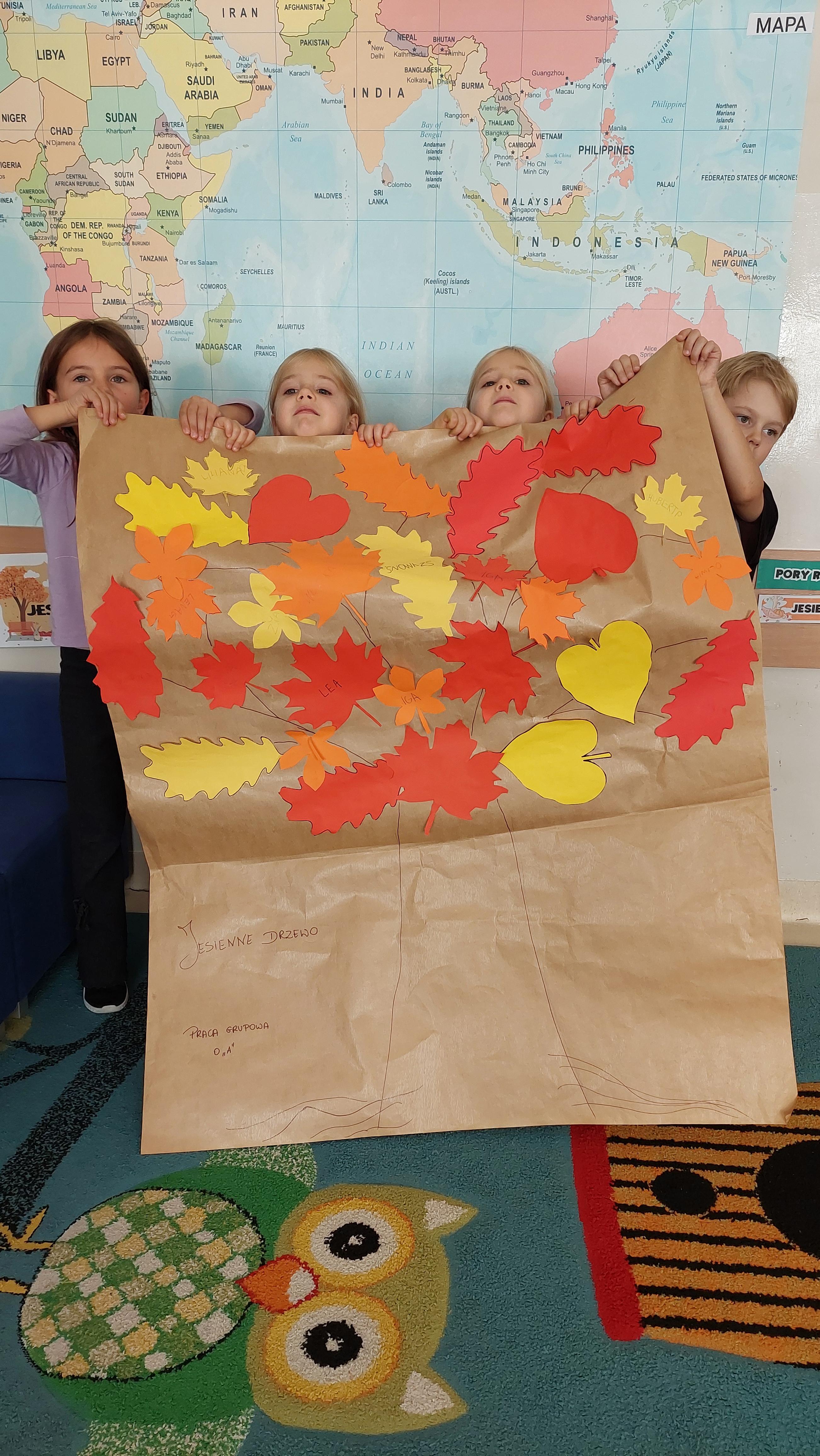 Następnie przystąpiliśmy do wspólnego wykonania plakatu „Witamy Jesień”. Przedszkolaki z zapałem tworzyły kolorowe liście i wspólne drzewo, co sprawiło wiele radości. Przyniesione dary jesieni dumnie wykorzystaliśmy na zajęciach:)