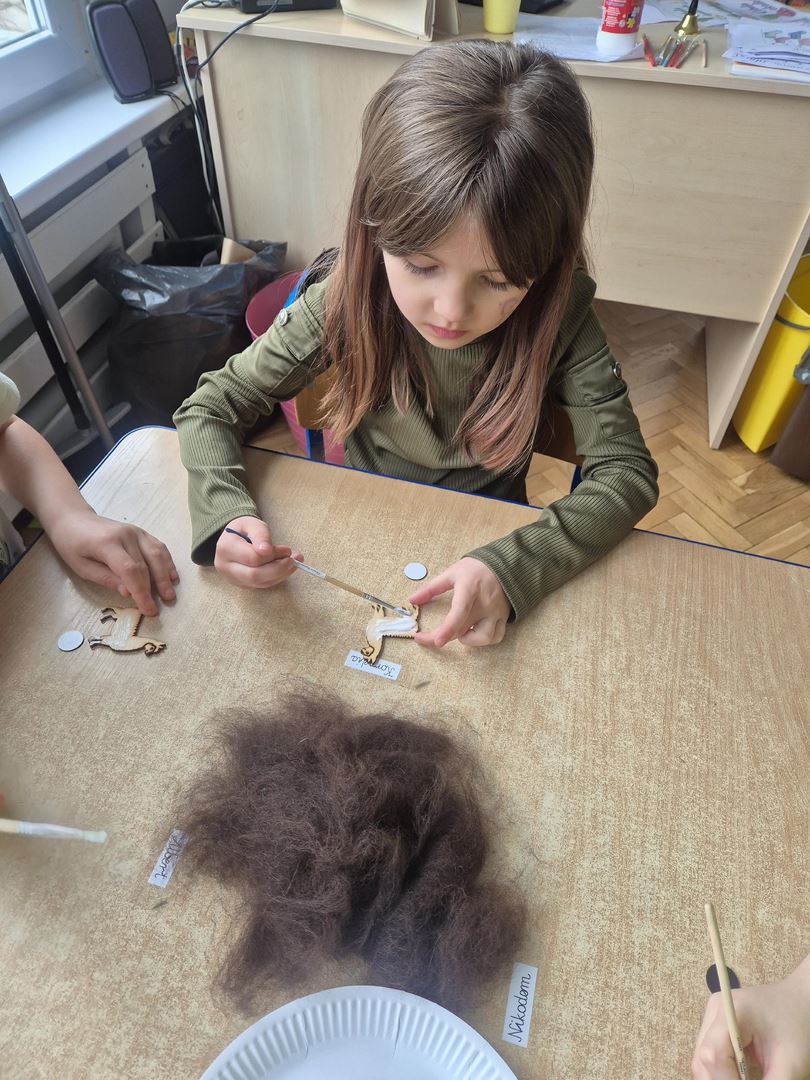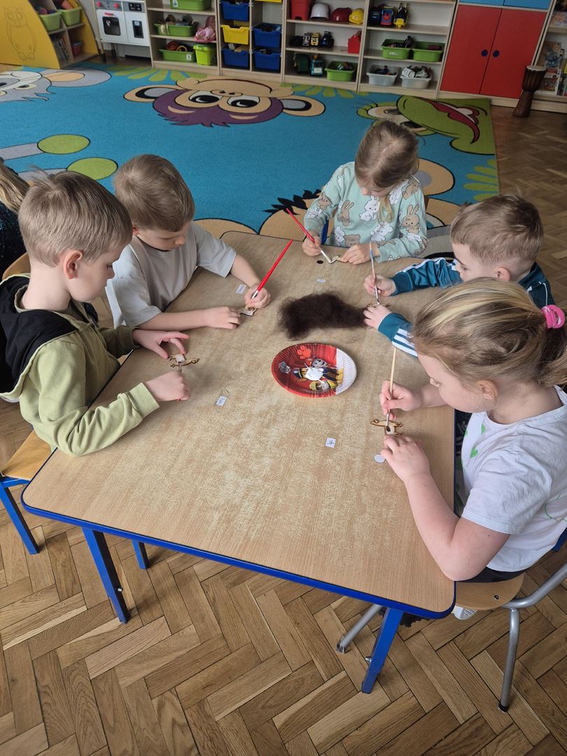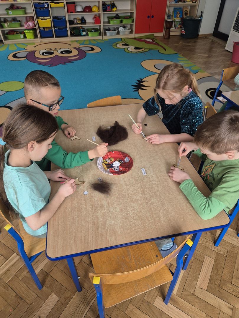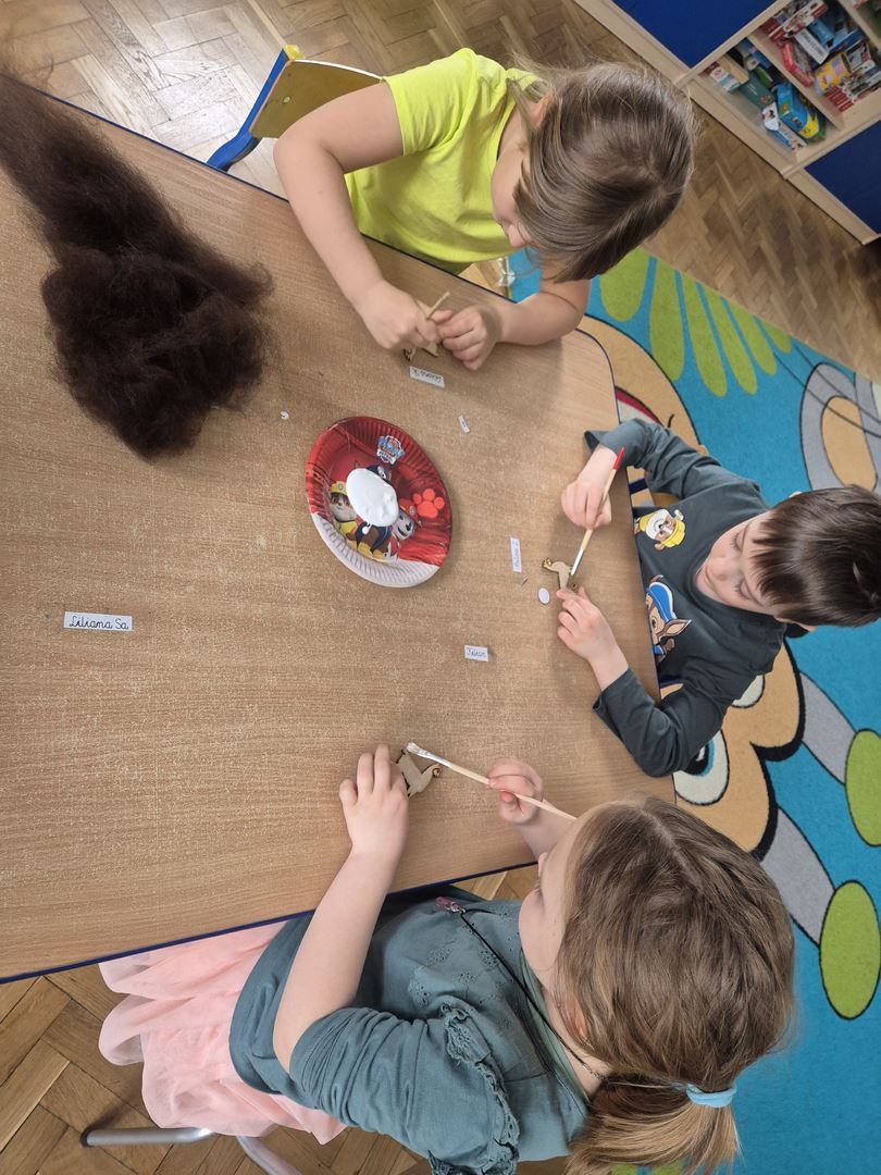 Dodatkowo przedszkolaki mogły wykazać się kreatywnością podczas zajęć plastycznych. Każde dziecko samodzielnie wykonało magnes z wizerunkiem alpaki, wykorzystując do tego miękką wełnę. Tworzenie własnych prac sprawiło dzieciom wiele radości, a gotowe magnesy stały się piękną pamiątką z tego niezwykłego dnia.