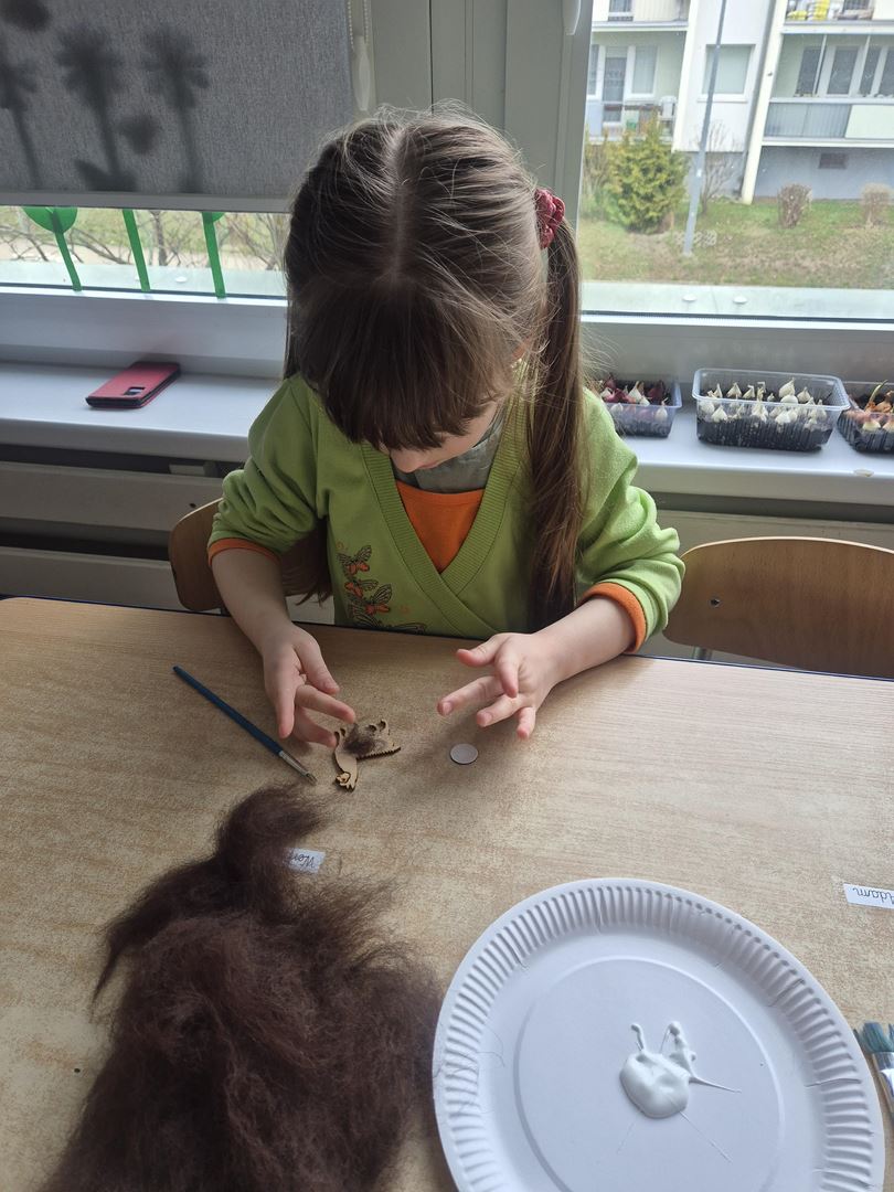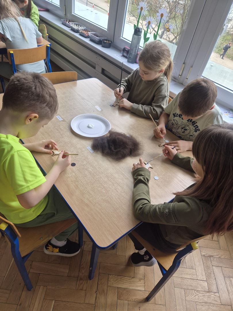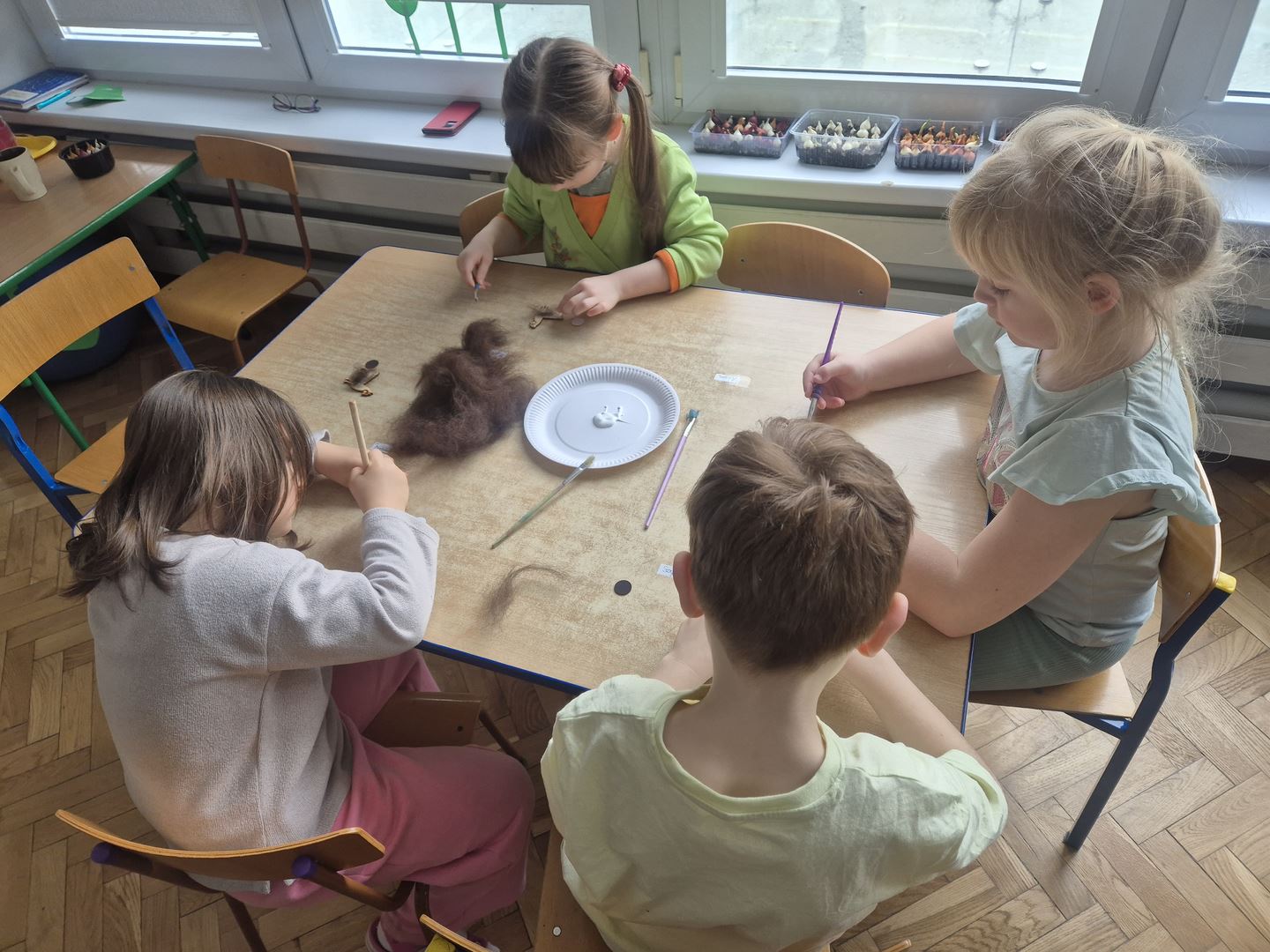 Dodatkowo przedszkolaki mogły wykazać się kreatywnością podczas zajęć plastycznych. Każde dziecko samodzielnie wykonało magnes z wizerunkiem alpaki, wykorzystując do tego miękką wełnę. Tworzenie własnych prac sprawiło dzieciom wiele radości, a gotowe magnesy stały się piękną pamiątką z tego niezwykłego dnia.