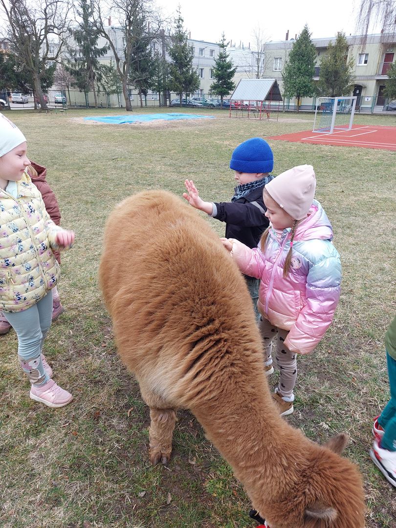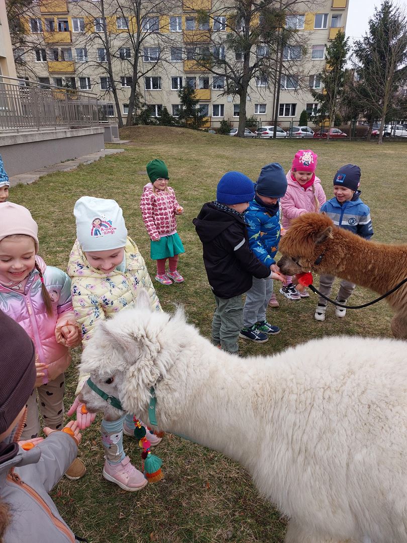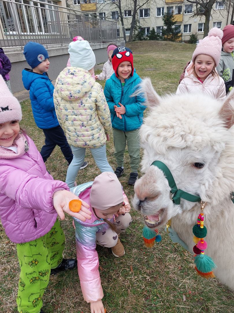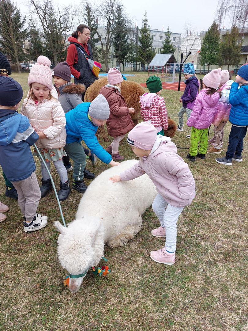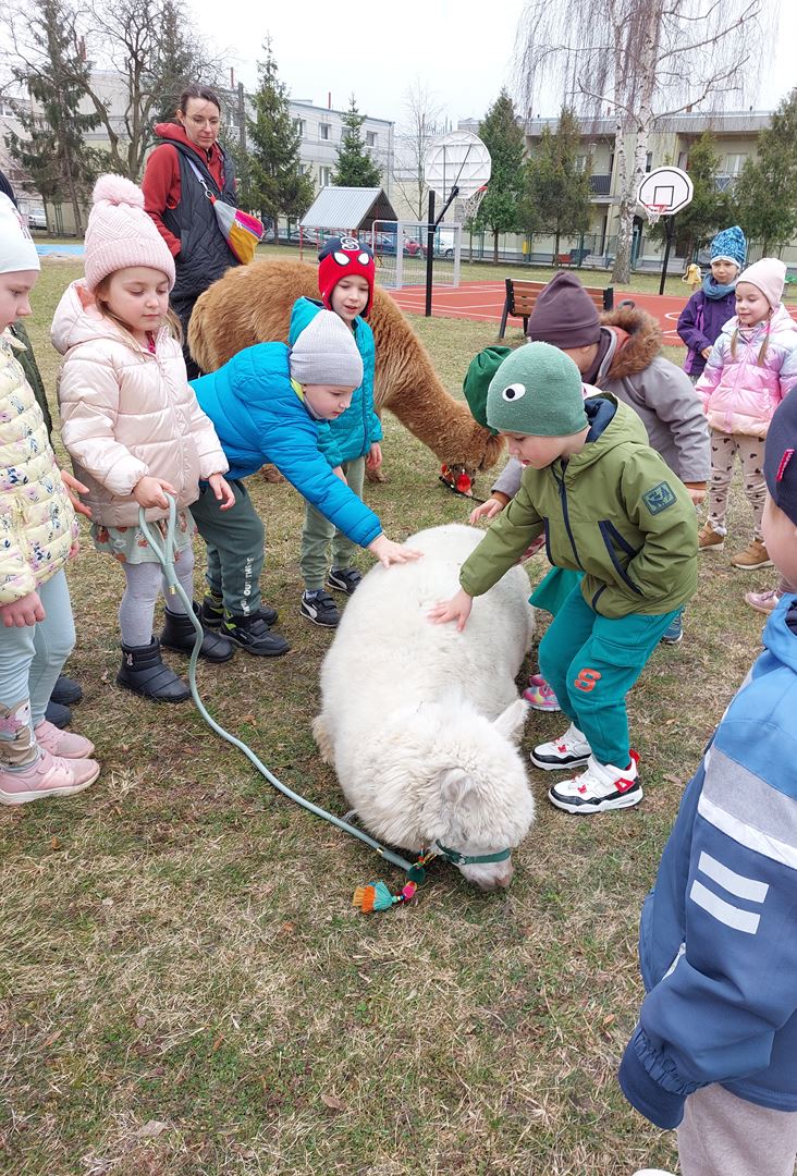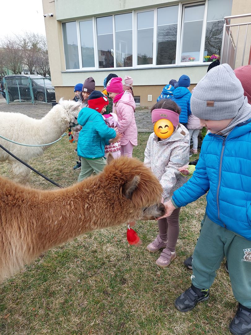20 marca, z okazji Pierwszego Dnia Wiosny, odwiedzili nas wyjątkowi goście - alpaki Diego oraz Karmel. Te sympatyczne, mięciutkie zwierzątka od razu podbiły serca dzieci. Panie opowiedziały, jak karmić alpaki i w których miejscach alpaki lubią być głaskane. To była super przygoda, i miłe powitanie wiosny!