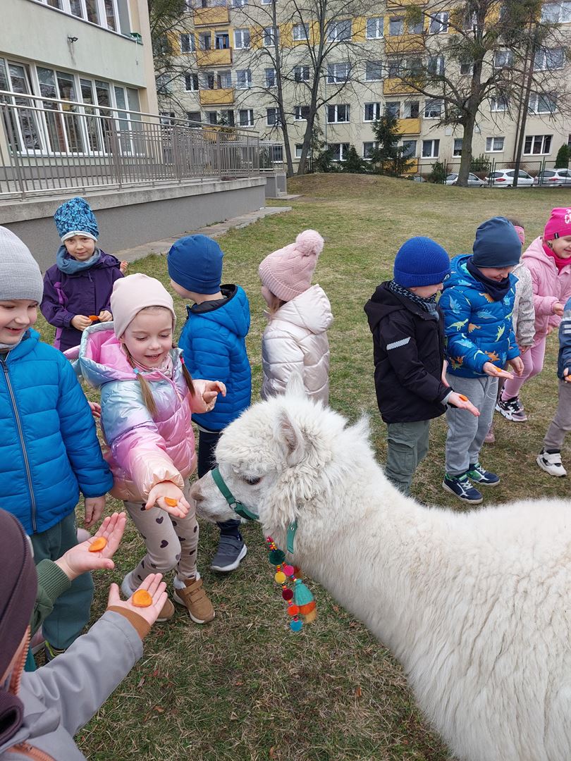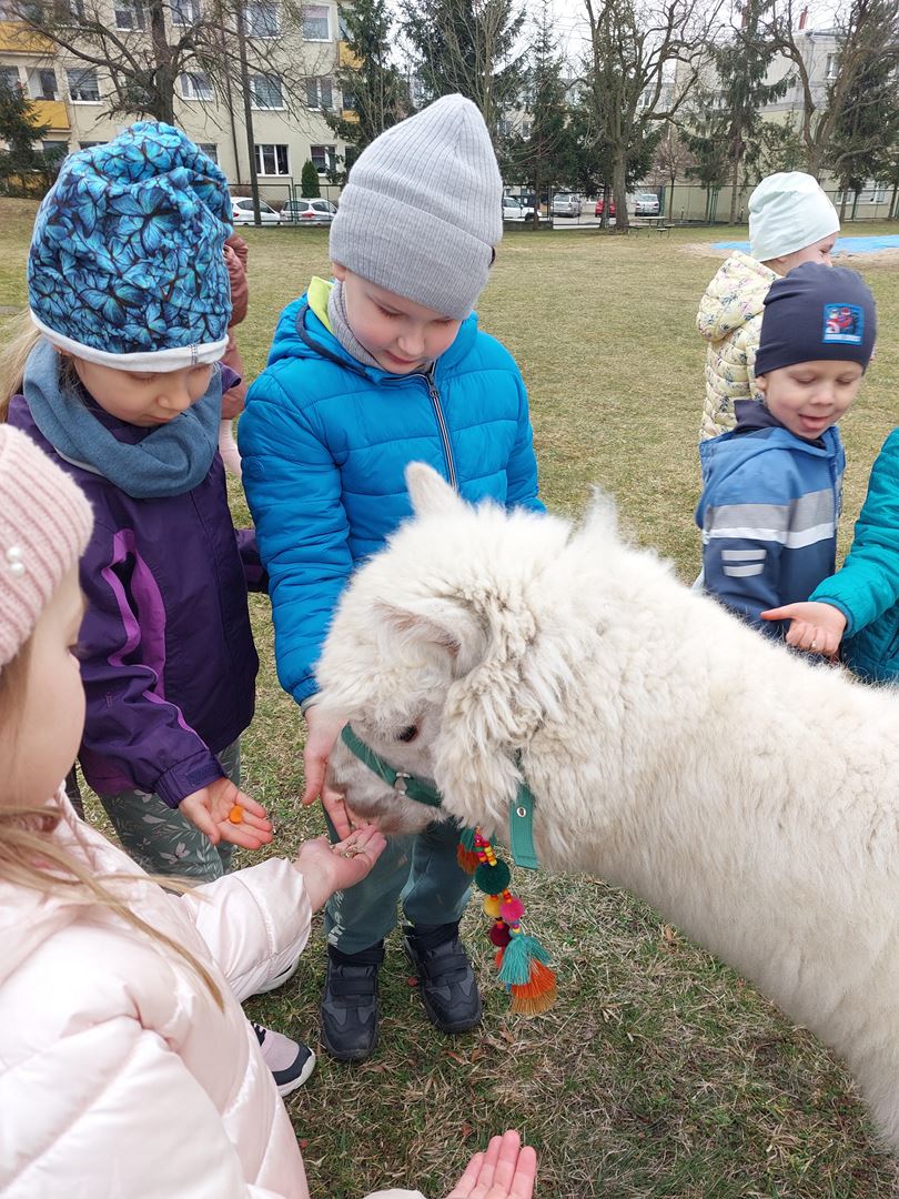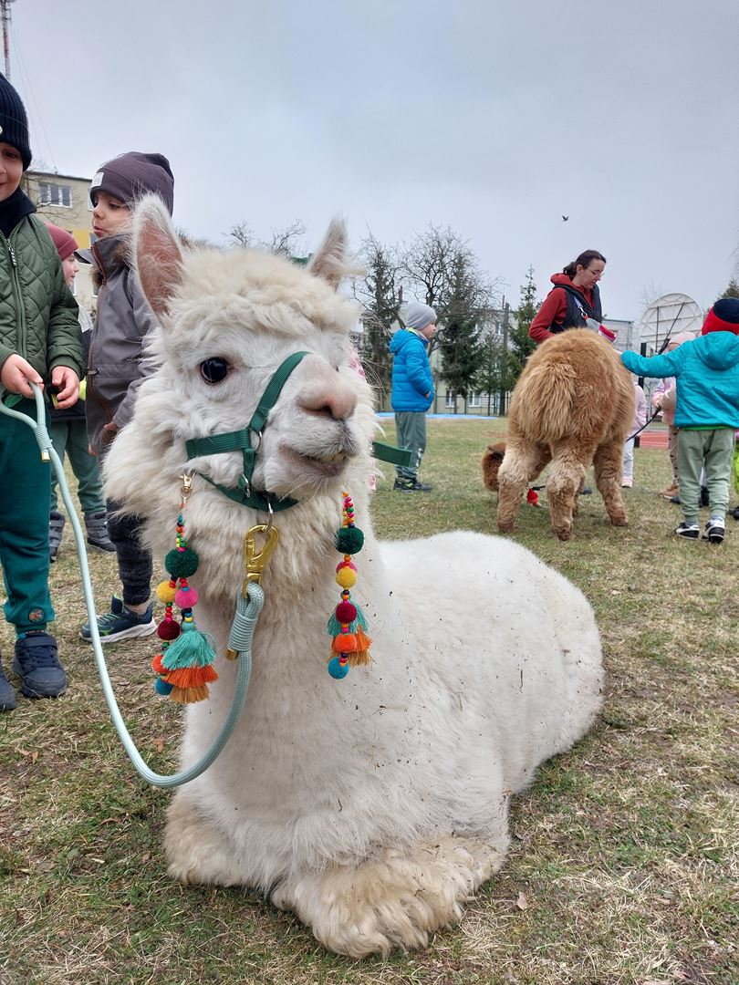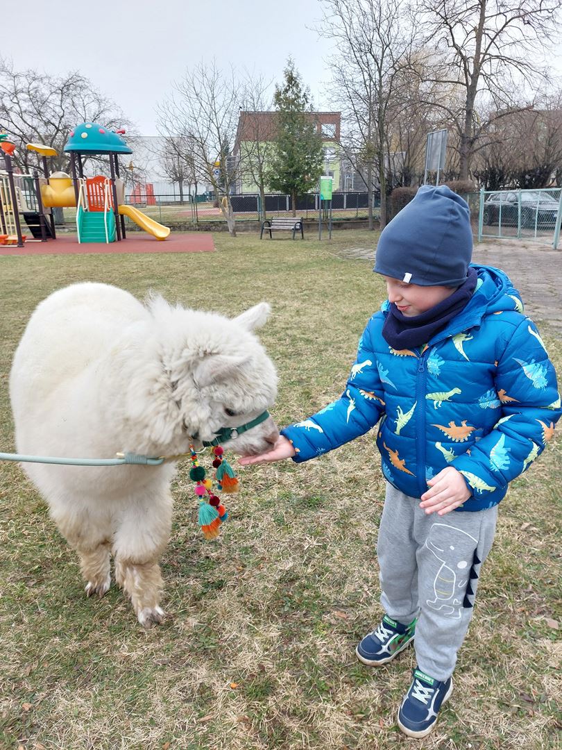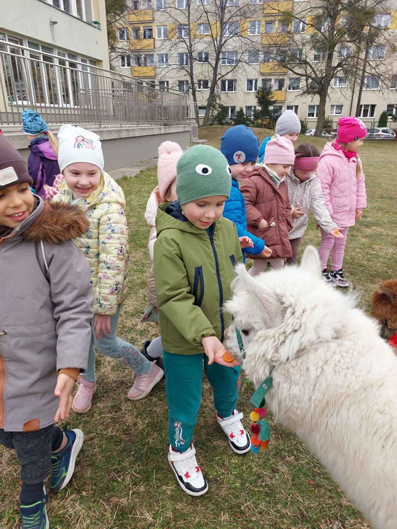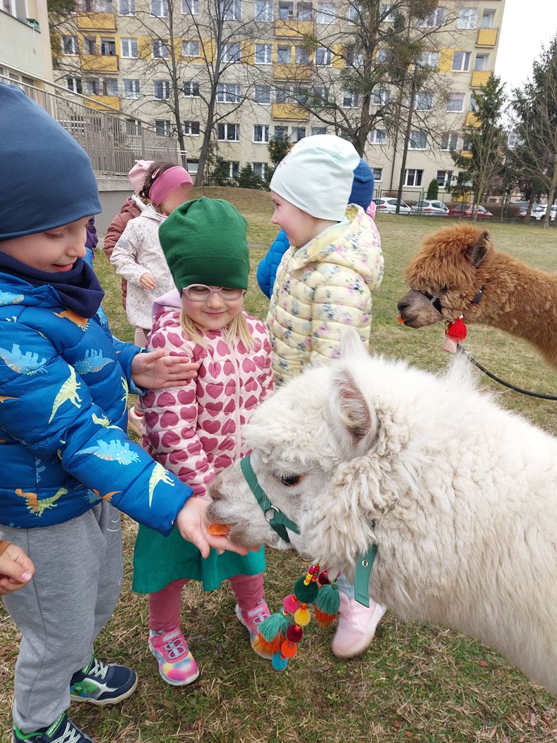 20 marca, z okazji Pierwszego Dnia Wiosny, odwiedzili nas wyjątkowi goście - alpaki Diego oraz Karmel. Te sympatyczne, mięciutkie zwierzątka od razu podbiły serca dzieci. Panie opowiedziały, jak karmić alpaki i w których miejscach alpaki lubią być głaskane. To była super przygoda, i miłe powitanie wiosny!