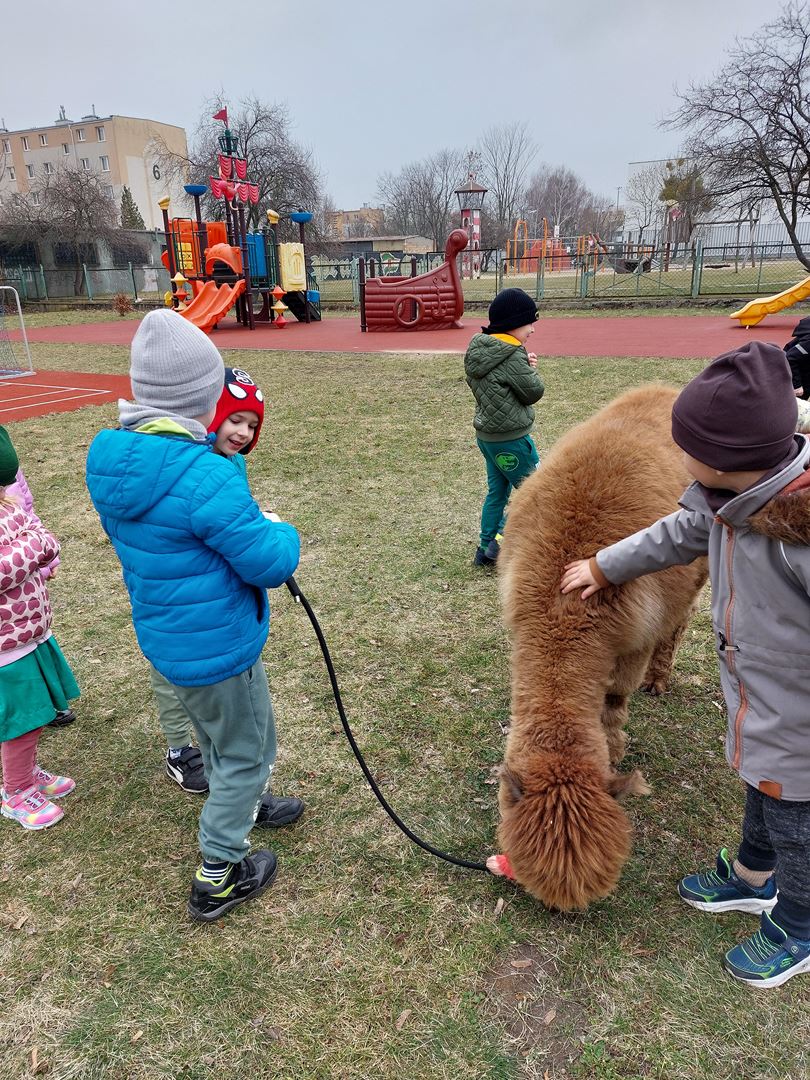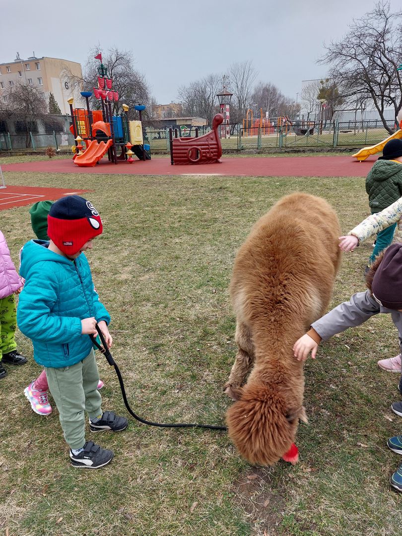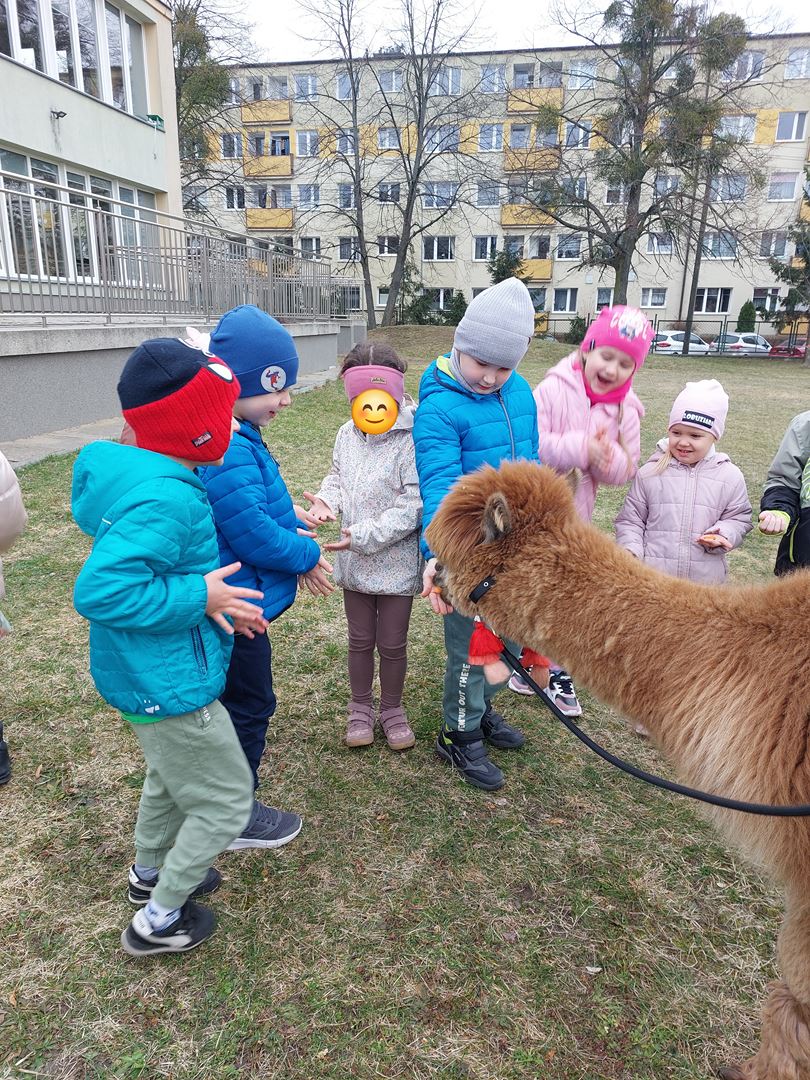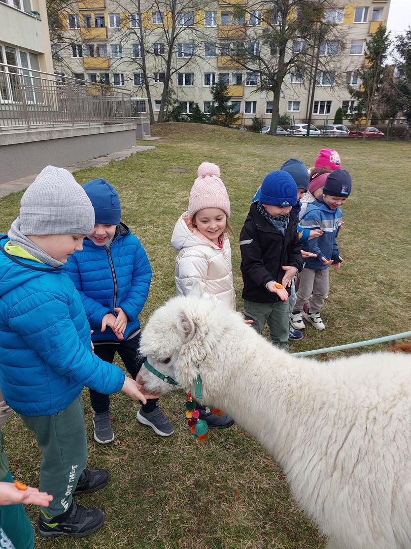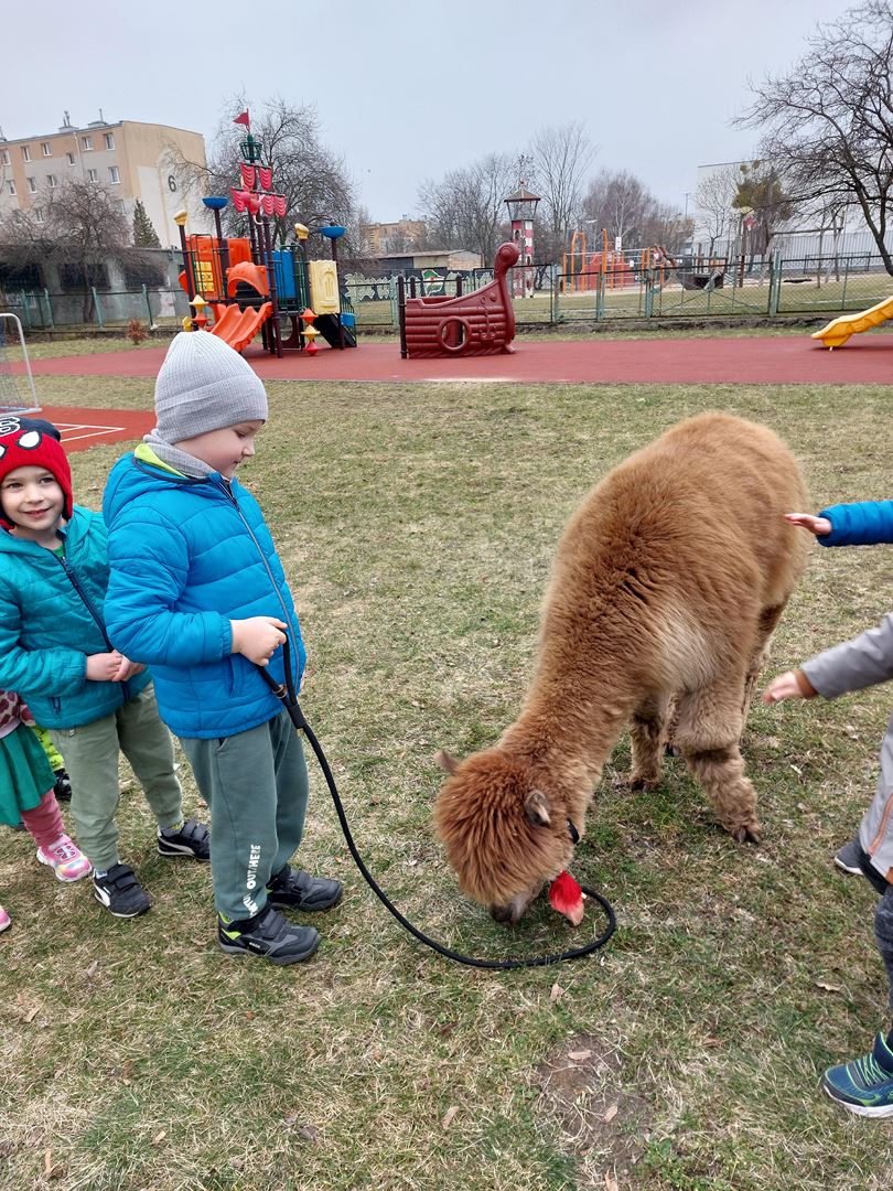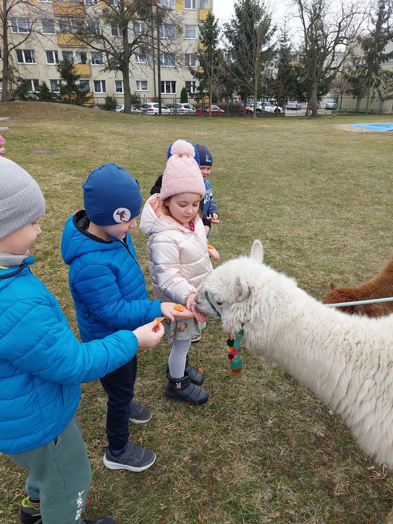 20 marca, z okazji Pierwszego Dnia Wiosny, odwiedzili nas wyjątkowi goście - alpaki Diego oraz Karmel. Te sympatyczne, mięciutkie zwierzątka od razu podbiły serca dzieci. Panie opowiedziały, jak karmić alpaki i w których miejscach alpaki lubią być głaskane. To była super przygoda, i miłe powitanie wiosny!