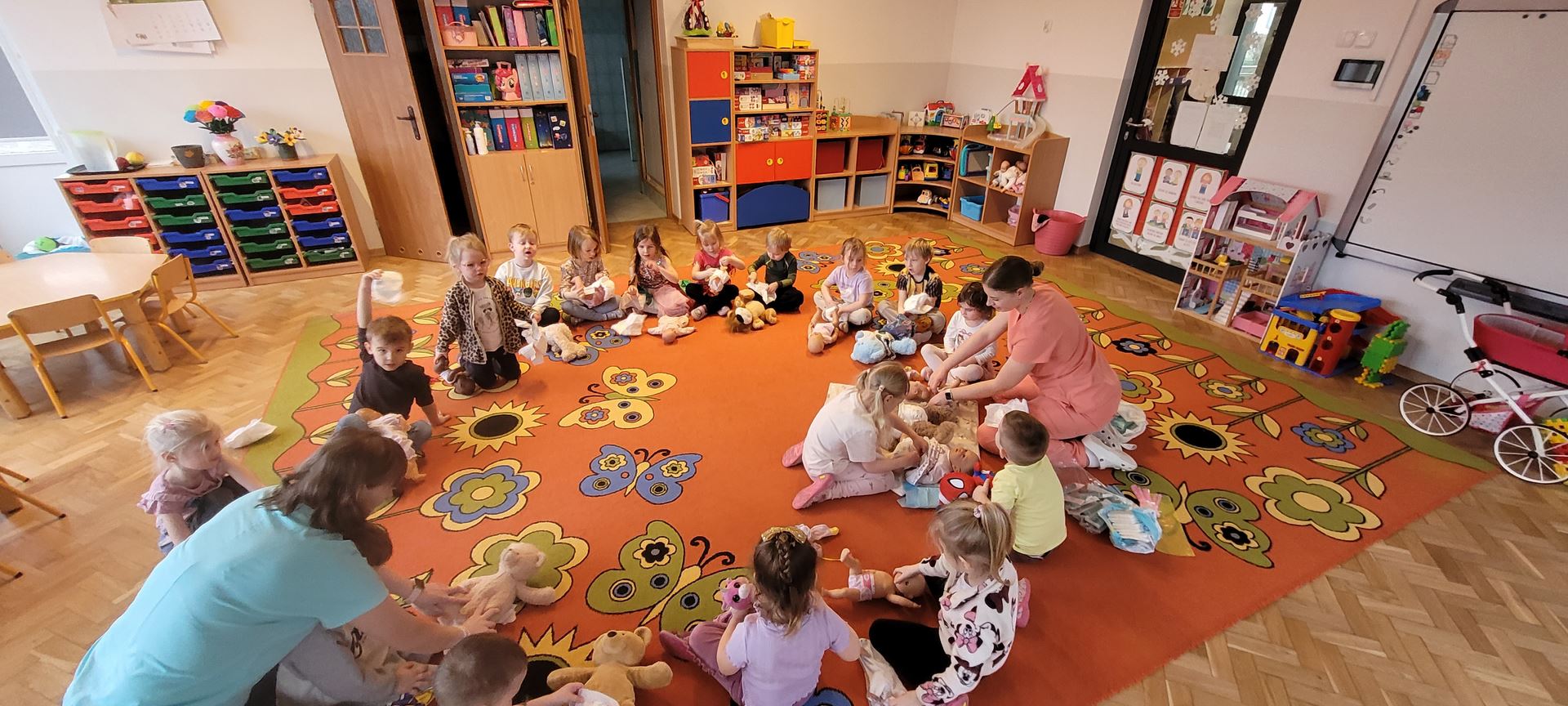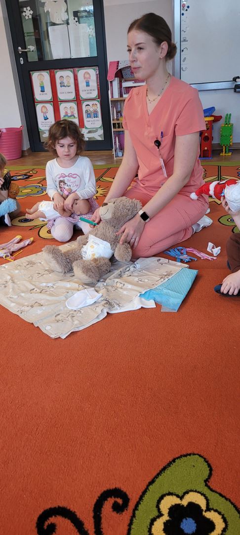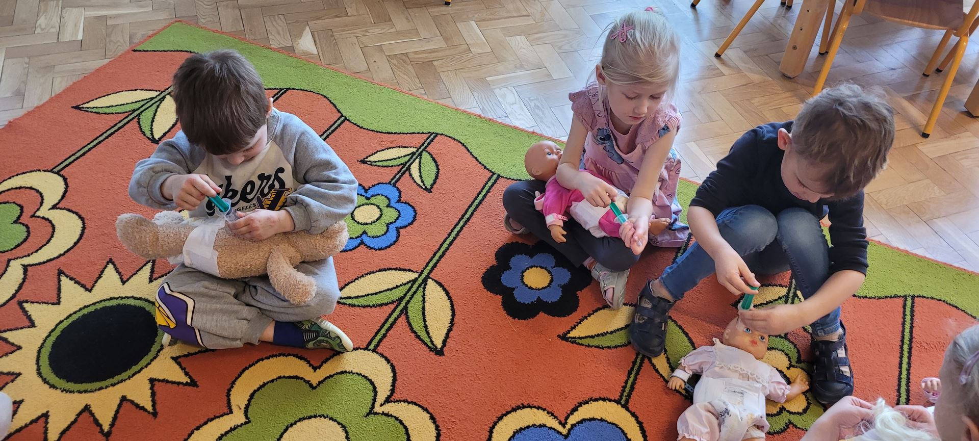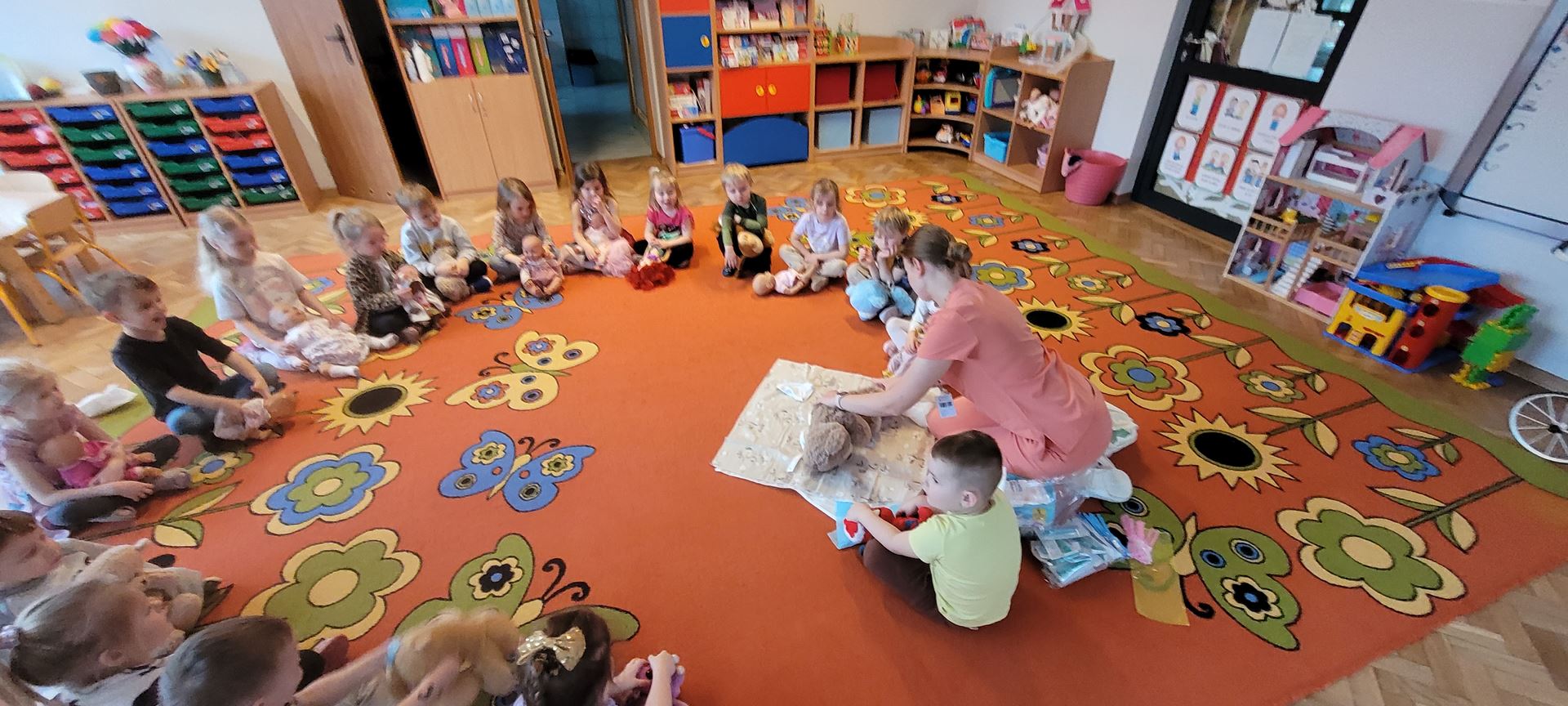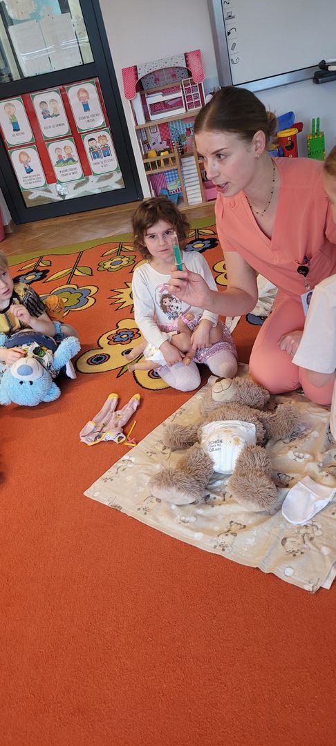Podczas spotkania maluchy otrzymały pieluszki i mogły wcielić się w rolę opiekunów – ubierały swoje lalki i misie. Dodatkowo zakładały opaski, na których zapisuje się dane „małych pacjentów”. Nie zabrakło również zabawy w wykonywanie zastrzyków, co wzbudziło wiele emocji i radości.