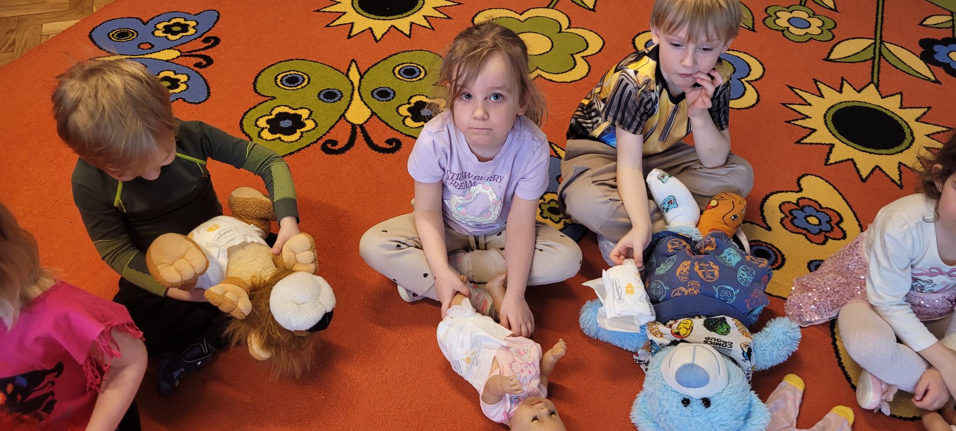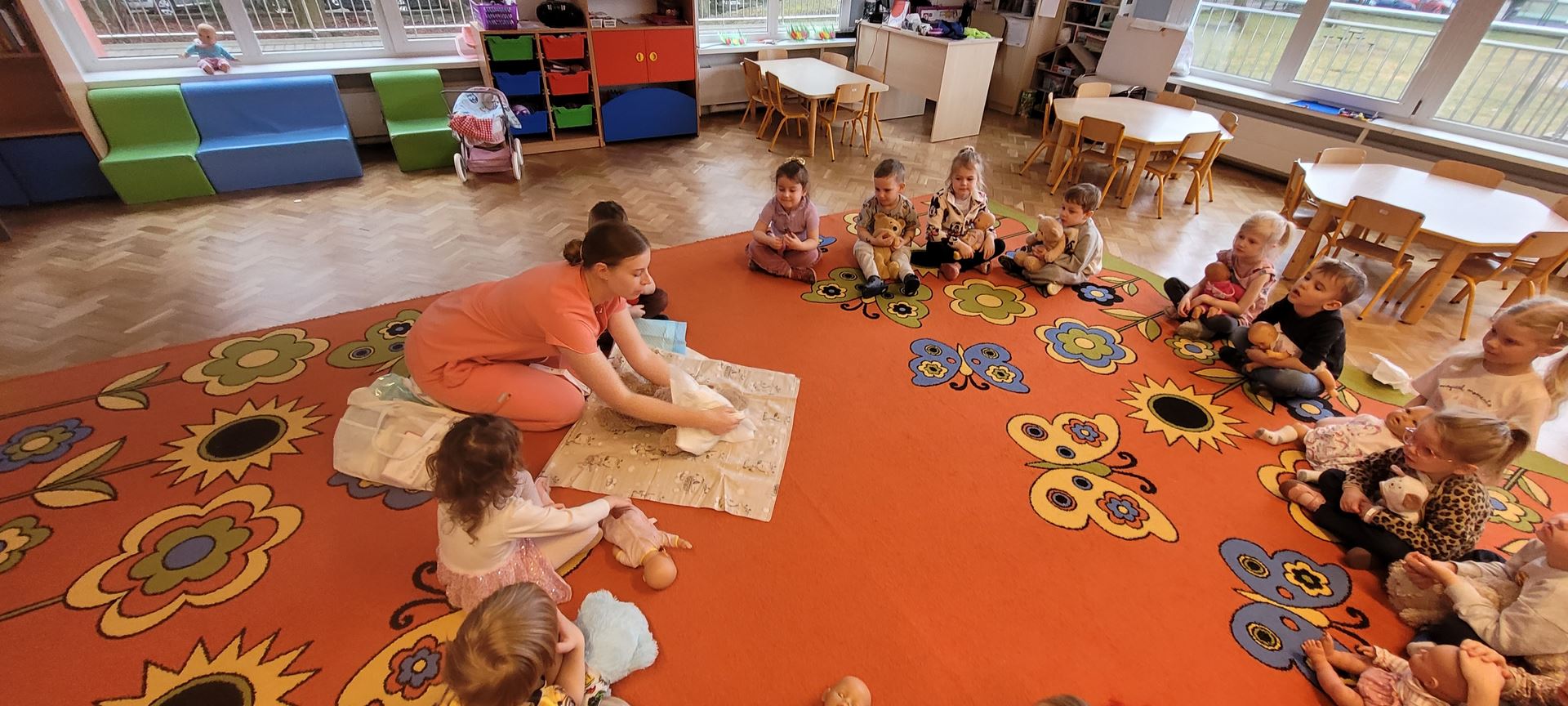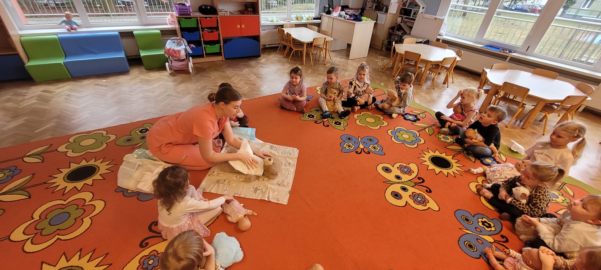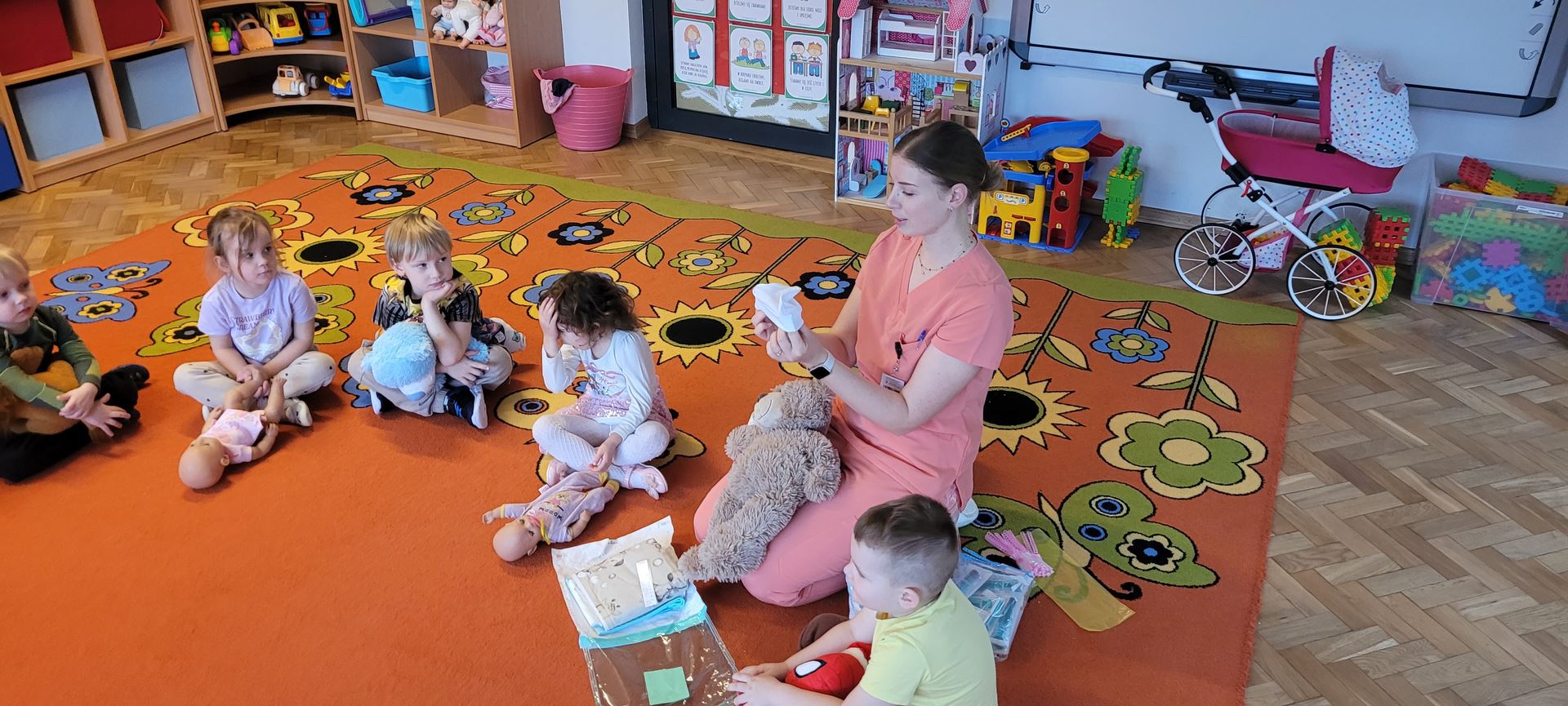 Podczas spotkania maluchy otrzymały pieluszki i mogły wcielić się w rolę opiekunów – ubierały swoje lalki i misie. Dodatkowo zakładały opaski, na których zapisuje się dane „małych pacjentów”. Nie zabrakło również zabawy w wykonywanie zastrzyków, co wzbudziło wiele emocji i radości.