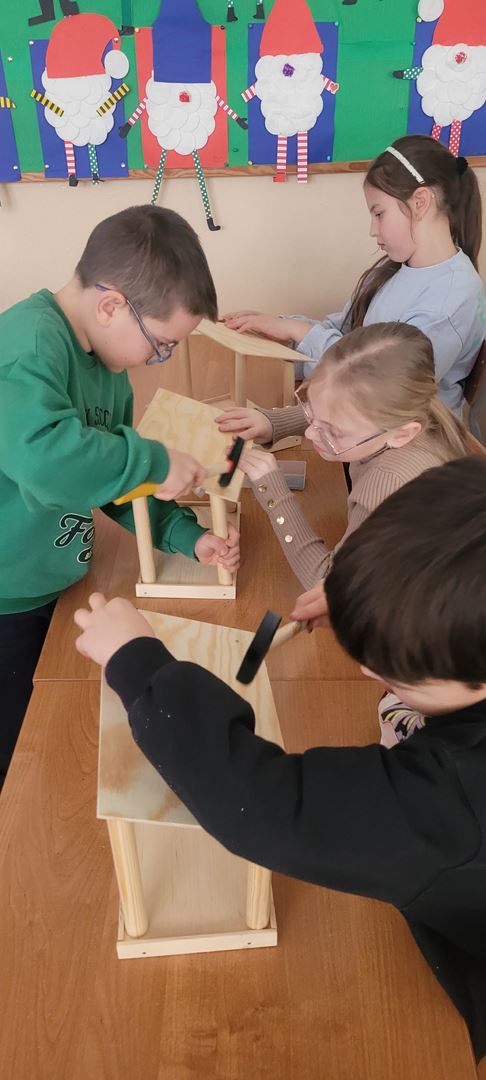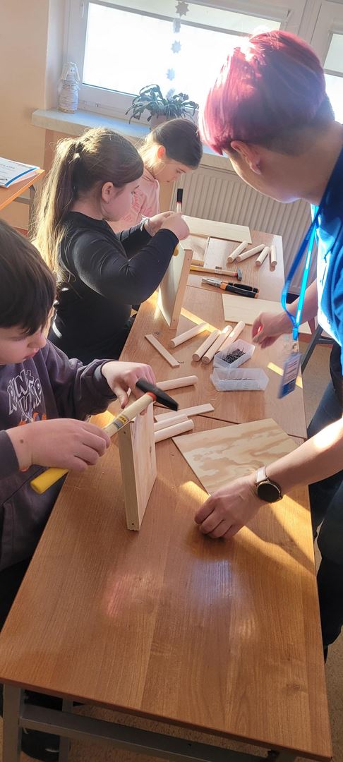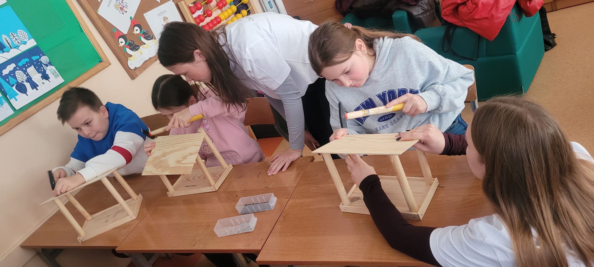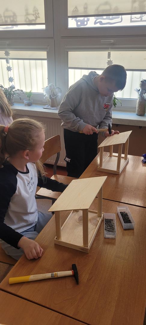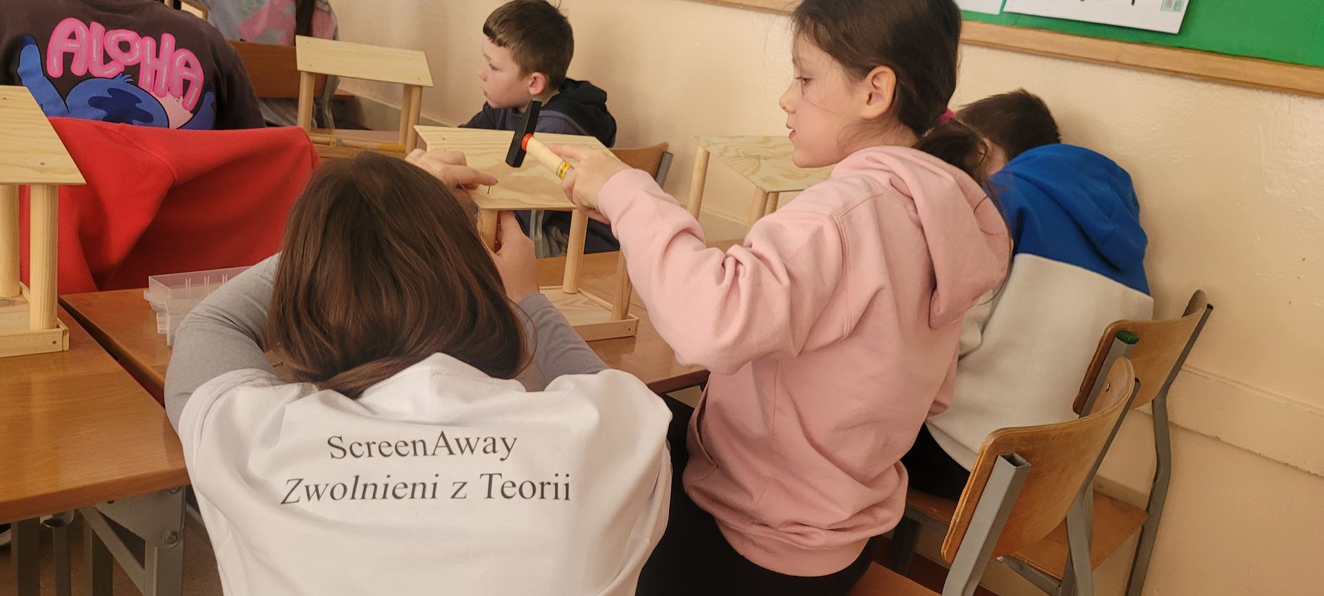 W dniu 02.02.2026 r. odbyły się spotkania i zajęcia dla uczniów naszej szkoły. Uczniowie klasy 3a brali udział w projekcie edukacyjnym pt. „Screen Away”, którego celem jest zachęcenie dzieci do ograniczenia korzystania z telefonów komórkowych oraz odkrywania własnych pasji i aktywności poza ekranem. Projekt realizowany był przez uczennice liceum w ramach Ogólnopolskiej Olimpiady Projektów Społecznych „Zwolnieni z teorii”. Aby uatrakcyjnić wydarzenie, do współpracy zaproszono przeszkolonych pracowników Castoramy, którzy przygotowali warsztaty stolarskie. Dzieci miały okazję samodzielnie wykonać karmniki z drewna, korzystając z podstawowych narzędzi, takich jak młotek i klej do drewna.