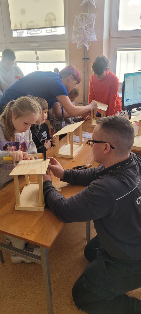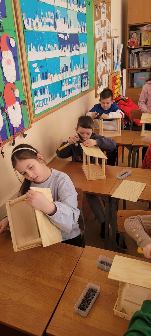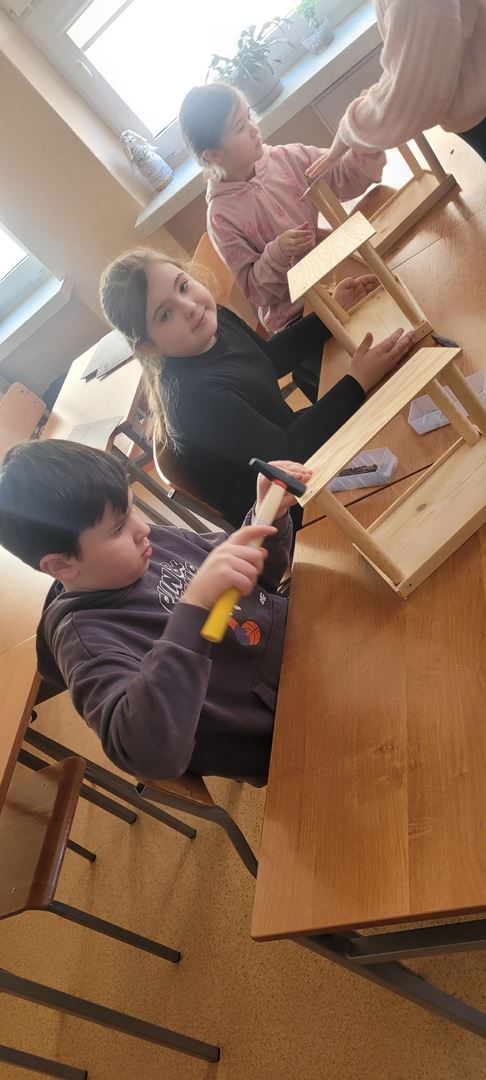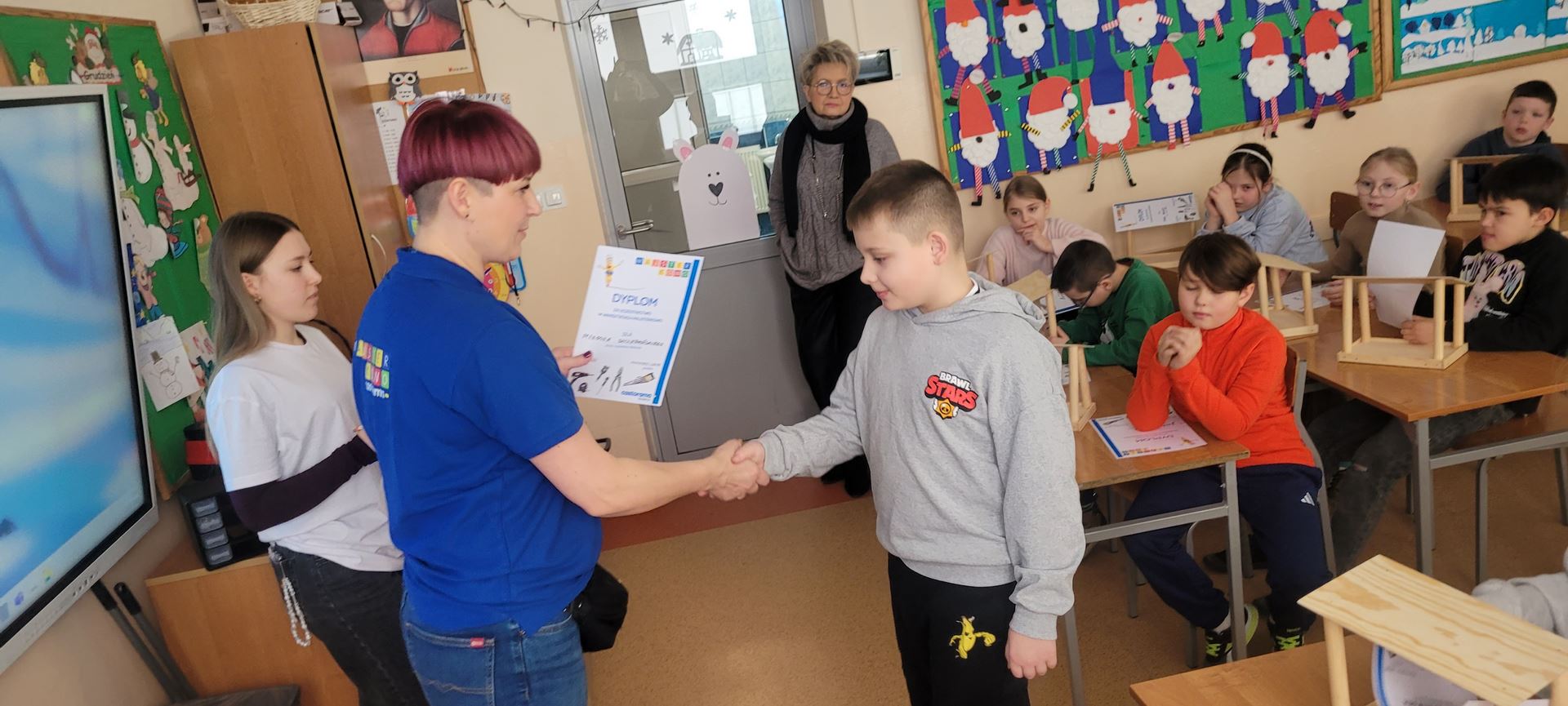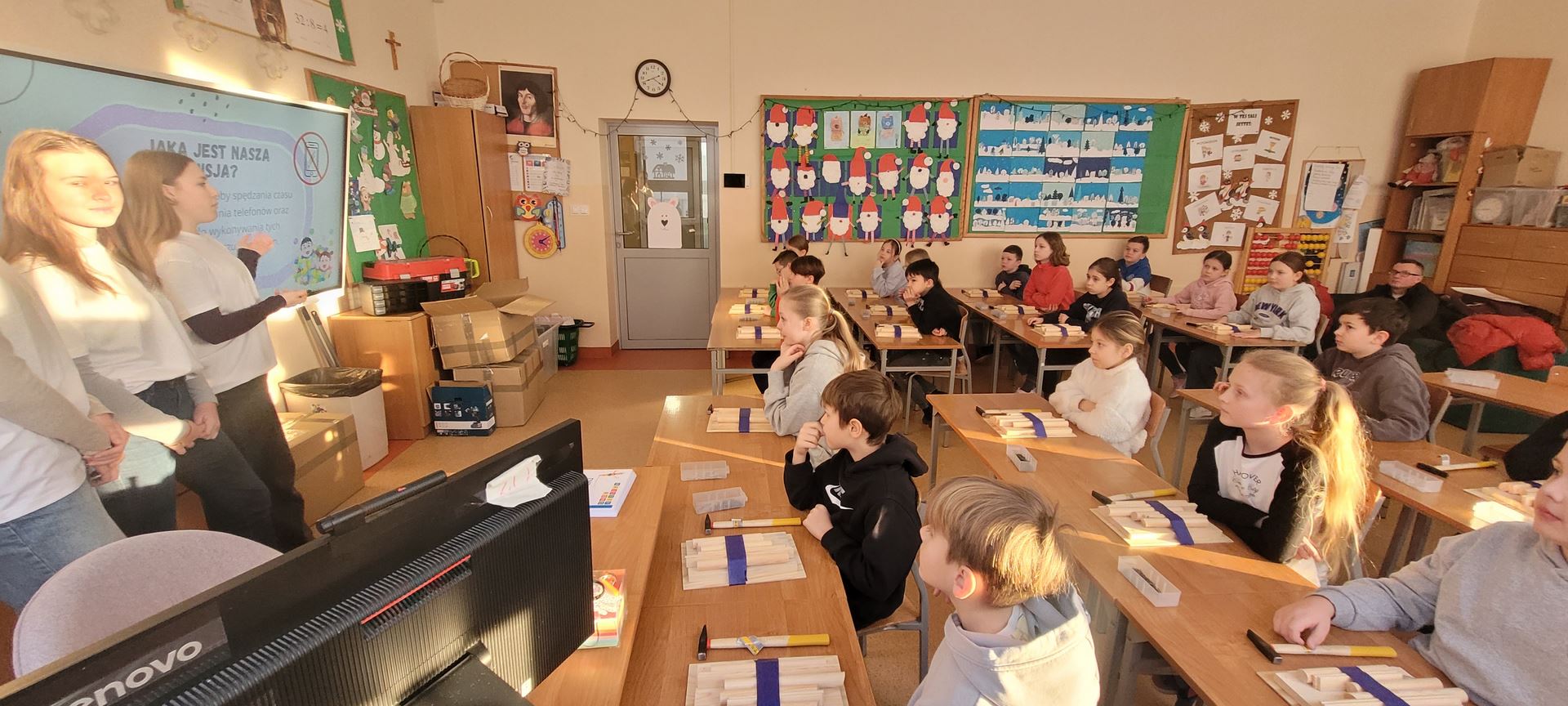 W dniu 02.02.2026 r. odbyły się spotkania i zajęcia dla uczniów naszej szkoły. Uczniowie klasy 3a brali udział w projekcie edukacyjnym pt. „Screen Away”, którego celem jest zachęcenie dzieci do ograniczenia korzystania z telefonów komórkowych oraz odkrywania własnych pasji i aktywności poza ekranem. Projekt realizowany był przez uczennice liceum w ramach Ogólnopolskiej Olimpiady Projektów Społecznych „Zwolnieni z teorii”. Aby uatrakcyjnić wydarzenie, do współpracy zaproszono przeszkolonych pracowników Castoramy, którzy przygotowali warsztaty stolarskie. Dzieci miały okazję samodzielnie wykonać karmniki z drewna, korzystając z podstawowych narzędzi, takich jak młotek i klej do drewna.