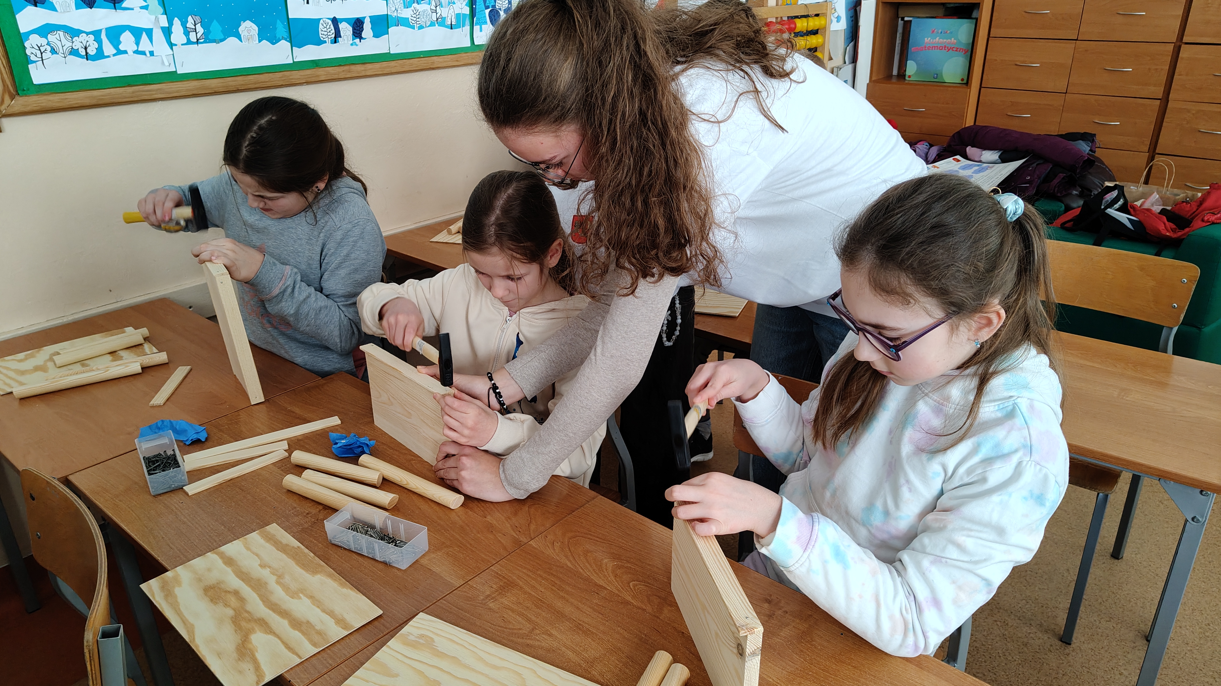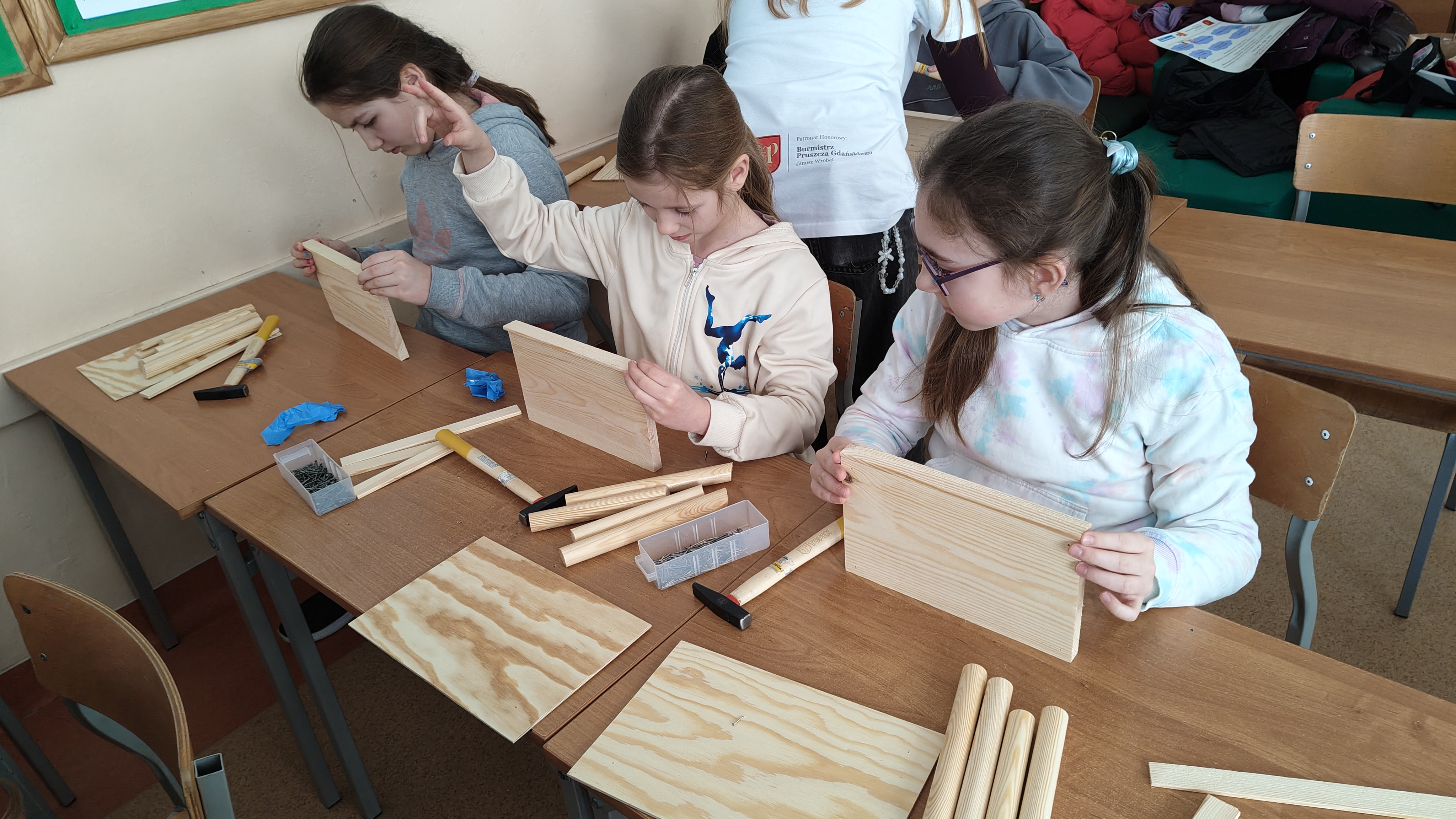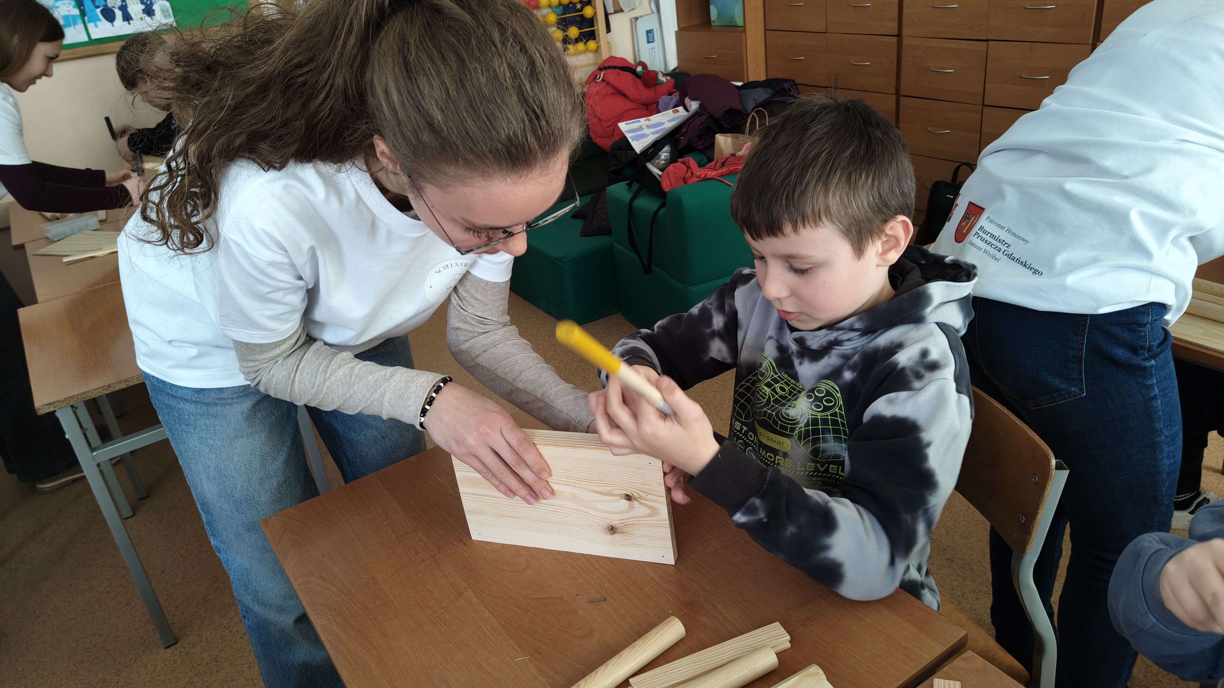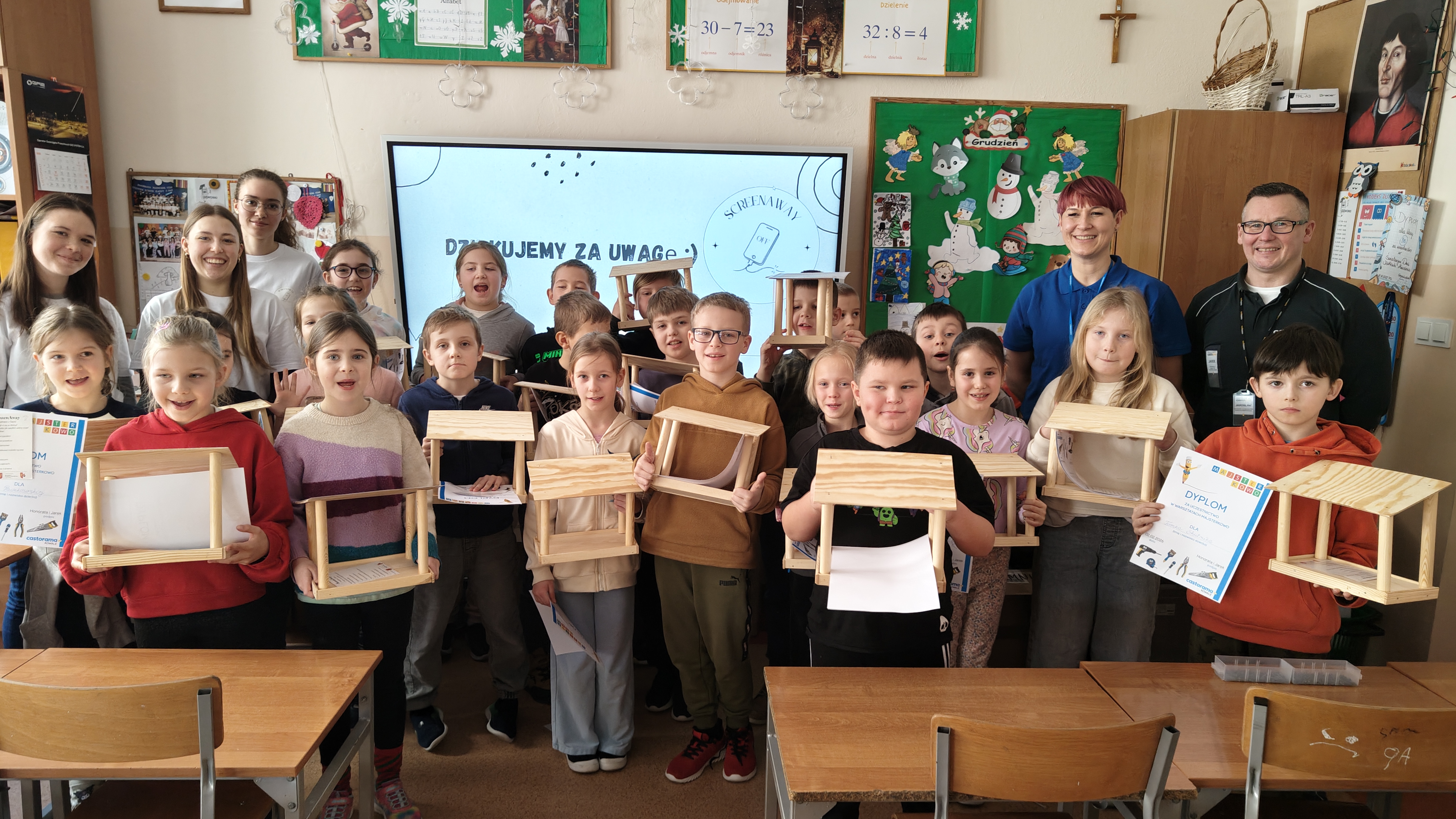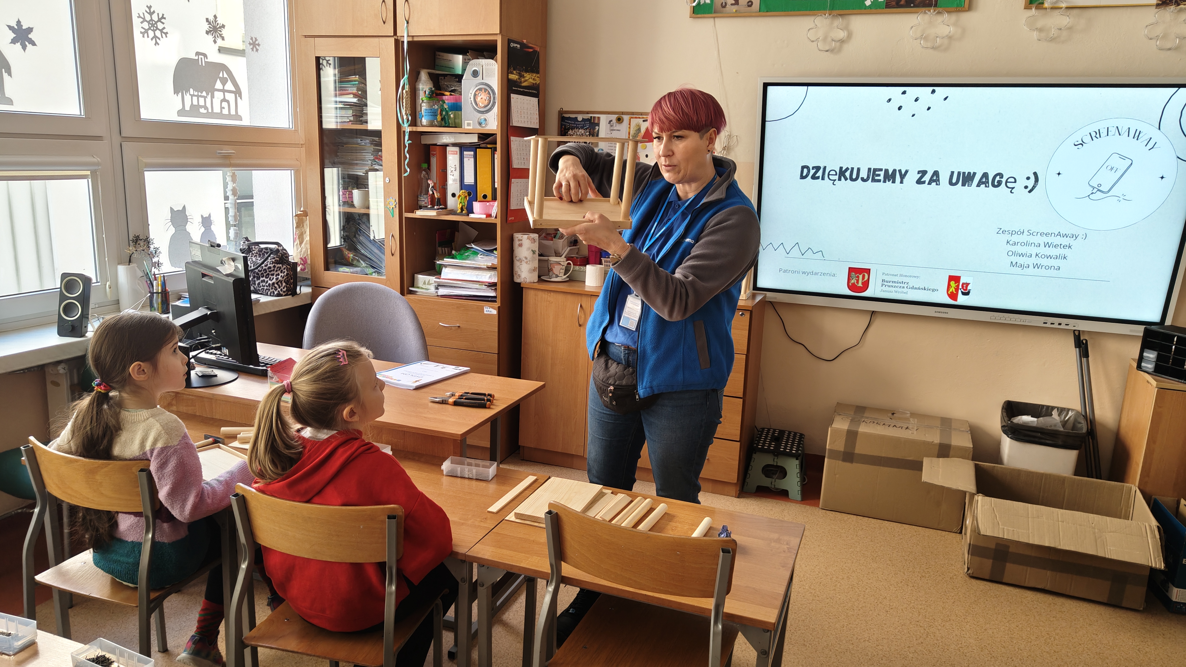 W poniedziałek 2 lutego, uczniowie klasy 2a, 2c i 3a, uczestniczyli w nietypowych warsztatach, prowadzonych przez uczennice trzeciej klasy LO w Pruszczu Gdańskim: Karolinę Witek, Oliwię Kowalik i Maję Wrona. Dziewczynki realizują projekt pod nazwą "Screen Away", którego celem jest zachęcenie dzieci do ograniczenia korzystania z telefonów komórkowych oraz odkrywania własnych pasji i aktywności pozascreenowych. Ponadto wymienione uczennice biorą udział w Ogólnopolskiej Olimpiadzie Projektów Społecznych pt. "Zwolnieni z teorii". Warsztaty miały charakter zajęć praktyczno-technicznych, na których dzieci własnoręcznie tworzyły -z użyciem prostych narzędzi- przestrzenną pracę z drewna. Aby uatrakcyjnić zajęcia, na spotkanie zaproszono przeszkolonych pracowników Castoramy, którzy przywieźli potrzebne materiały i służyli pomocą. Uczniowie z wielkim zaangażowaniem przystąpili do pracy, za którą otrzymali pamiątkowe dyplomy. Gotowe konstrukcje zabrali ze sobą do domu -tylko od ich wyobraźni zależy, jak będą one wykorzystane (karmnik dla ptaków, domek dla lalek czy też jako półka). To były z pewnością ciekawe i pożyteczne warsztaty!