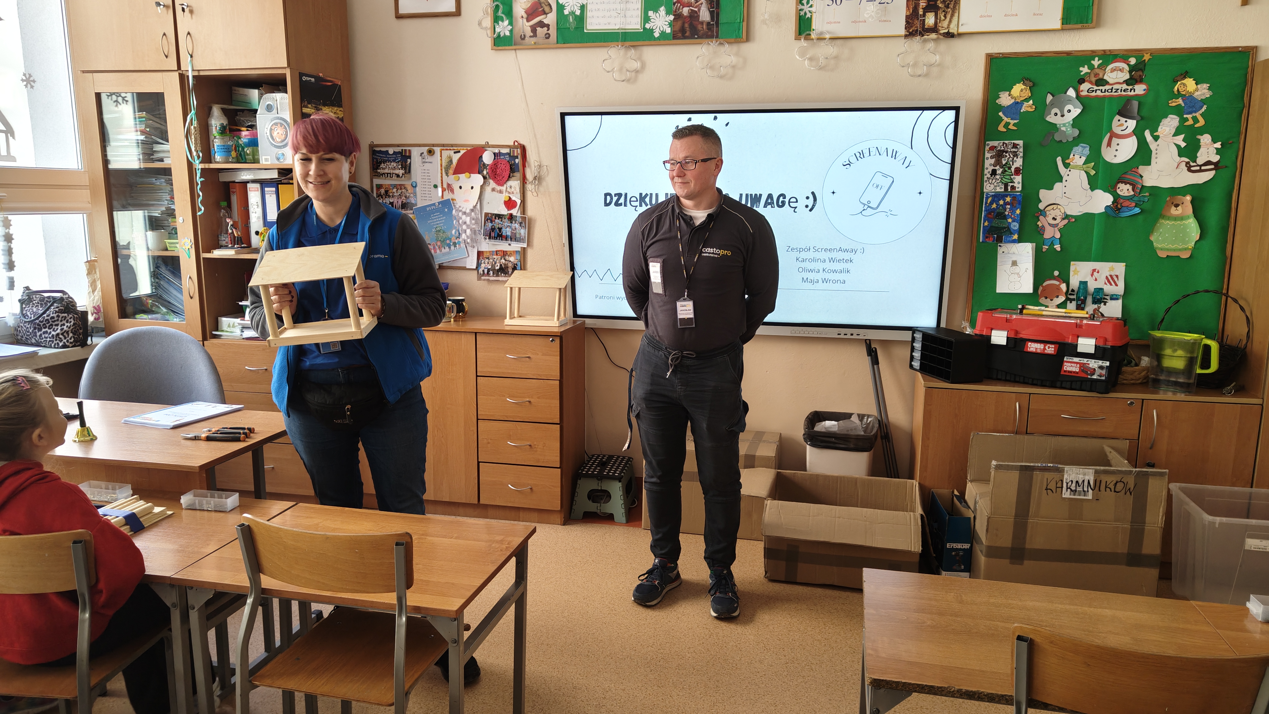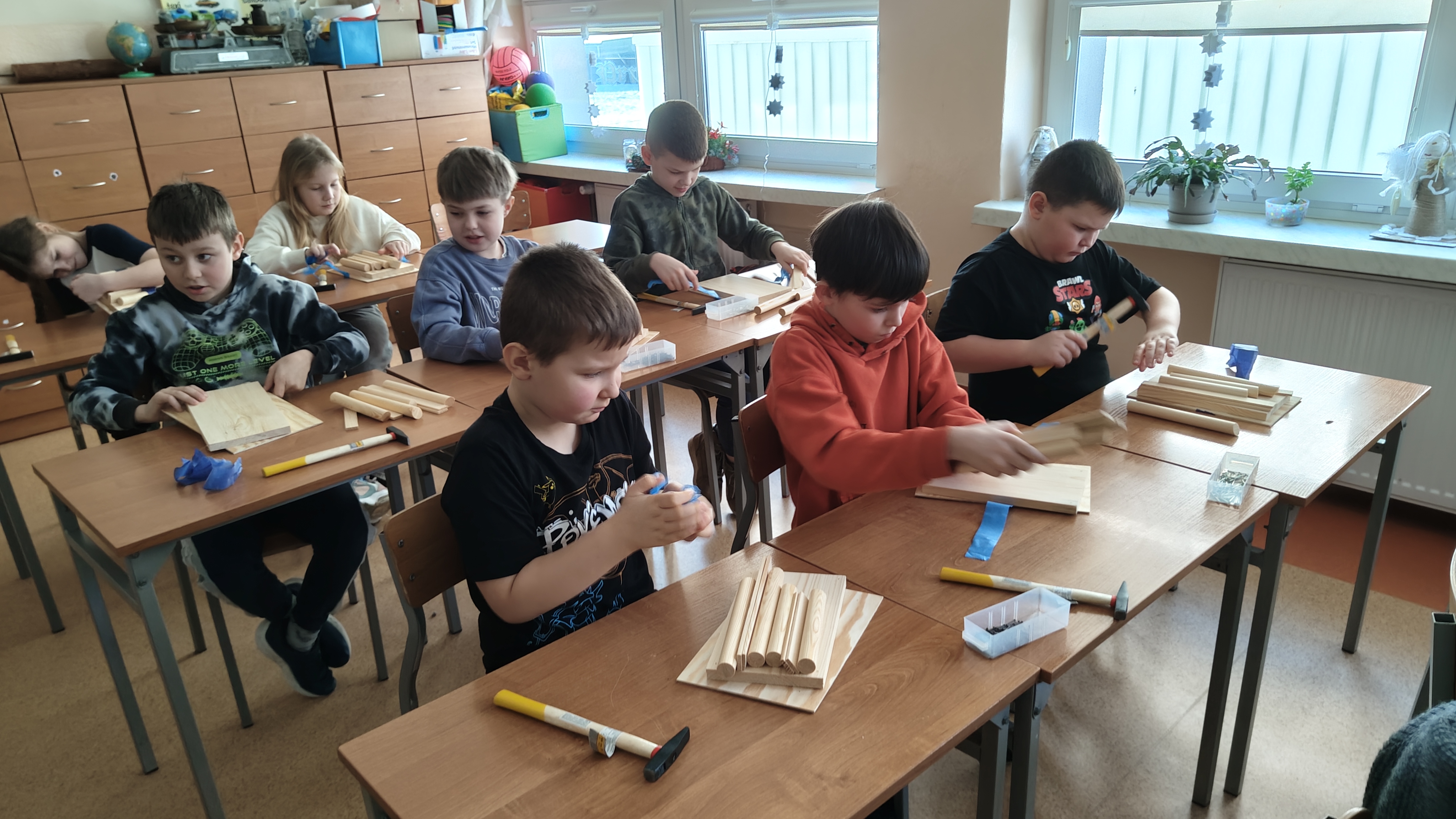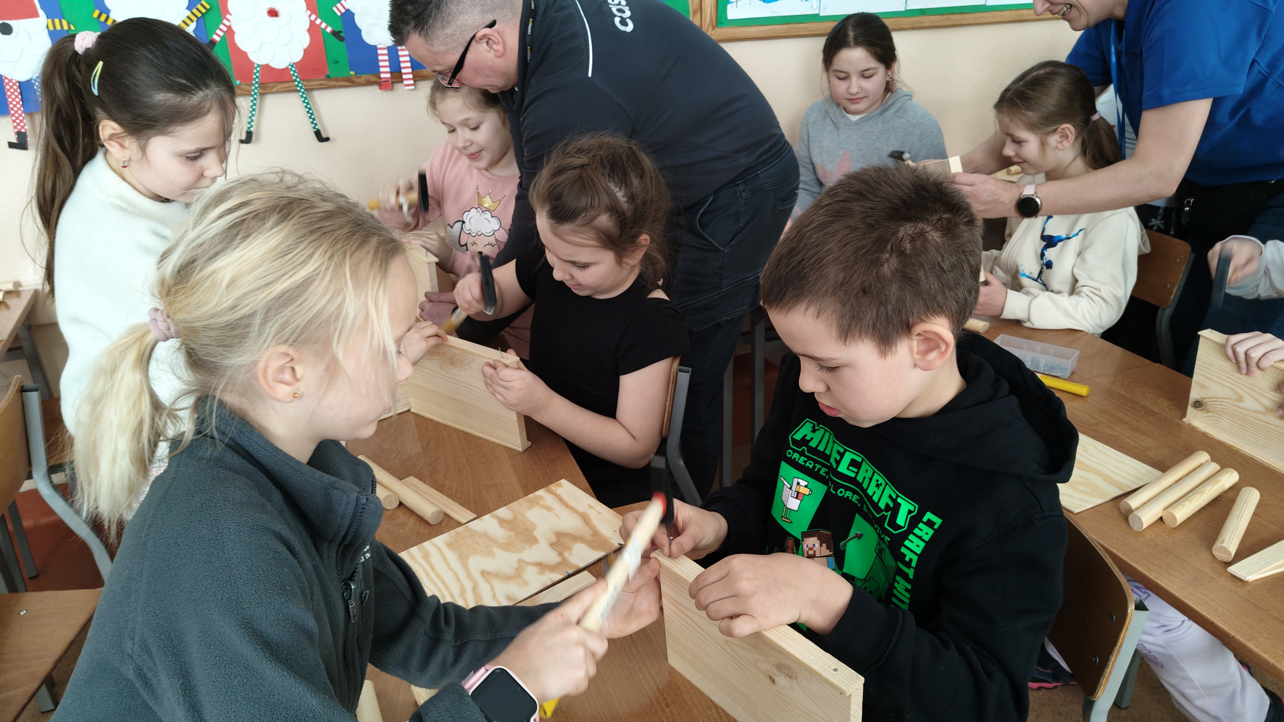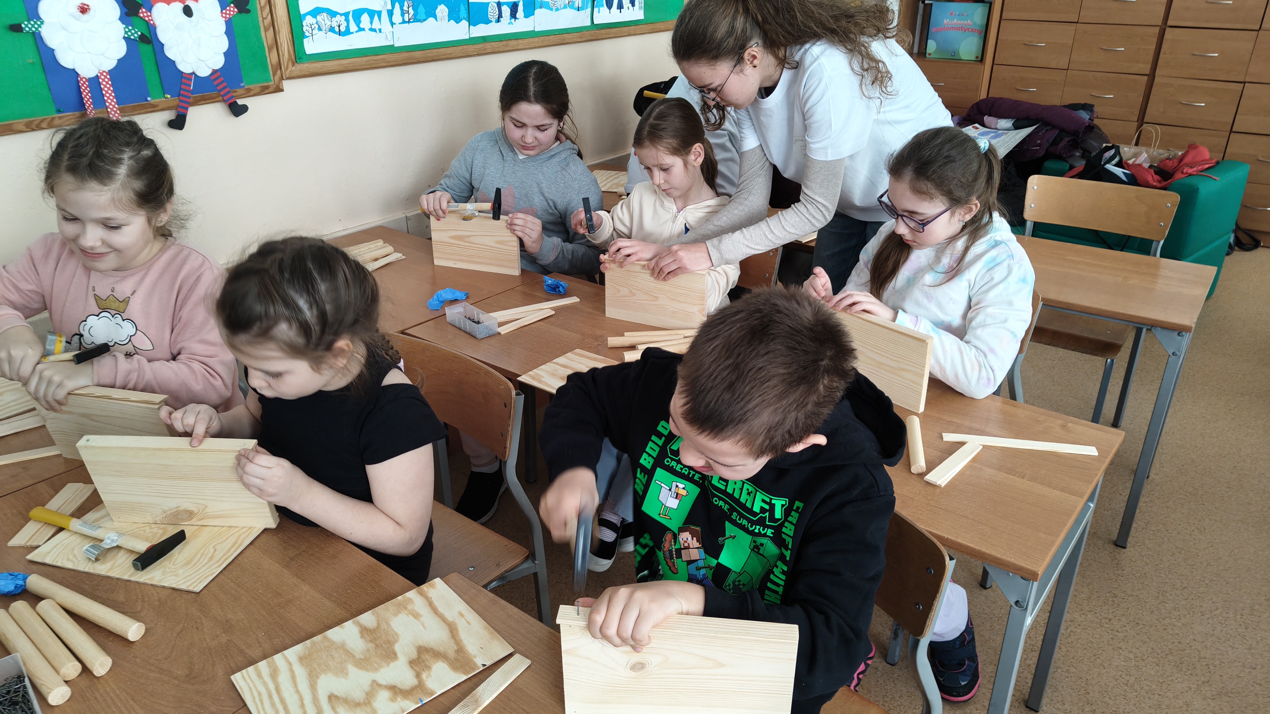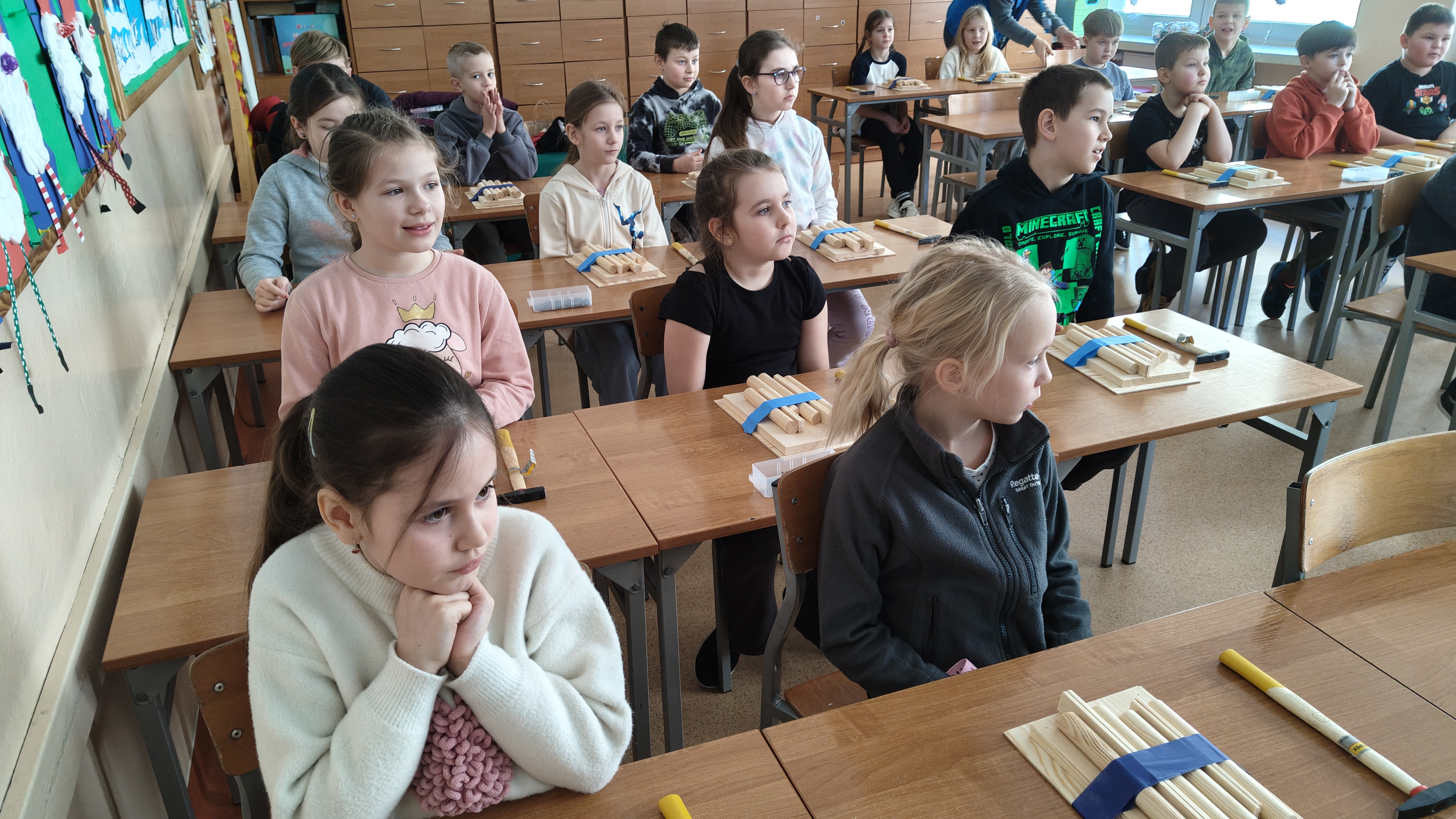 W poniedziałek 2 lutego, uczniowie klasy 2a, 2c i 3a, uczestniczyli w nietypowych warsztatach, prowadzonych przez uczennice trzeciej klasy LO w Pruszczu Gdańskim: Karolinę Witek, Oliwię Kowalik i Maję Wrona. Dziewczynki realizują projekt pod nazwą "Screen Away", którego celem jest zachęcenie dzieci do ograniczenia korzystania z telefonów komórkowych oraz odkrywania własnych pasji i aktywności pozascreenowych. Ponadto wymienione uczennice biorą udział w Ogólnopolskiej Olimpiadzie Projektów Społecznych pt. "Zwolnieni z teorii". Warsztaty miały charakter zajęć praktyczno-technicznych, na których dzieci własnoręcznie tworzyły -z użyciem prostych narzędzi- przestrzenną pracę z drewna. Aby uatrakcyjnić zajęcia, na spotkanie zaproszono przeszkolonych pracowników Castoramy, którzy przywieźli potrzebne materiały i służyli pomocą. Uczniowie z wielkim zaangażowaniem przystąpili do pracy, za którą otrzymali pamiątkowe dyplomy. Gotowe konstrukcje zabrali ze sobą do domu -tylko od ich wyobraźni zależy, jak będą one wykorzystane (karmnik dla ptaków, domek dla lalek czy też jako półka). To były z pewnością ciekawe i pożyteczne warsztaty!