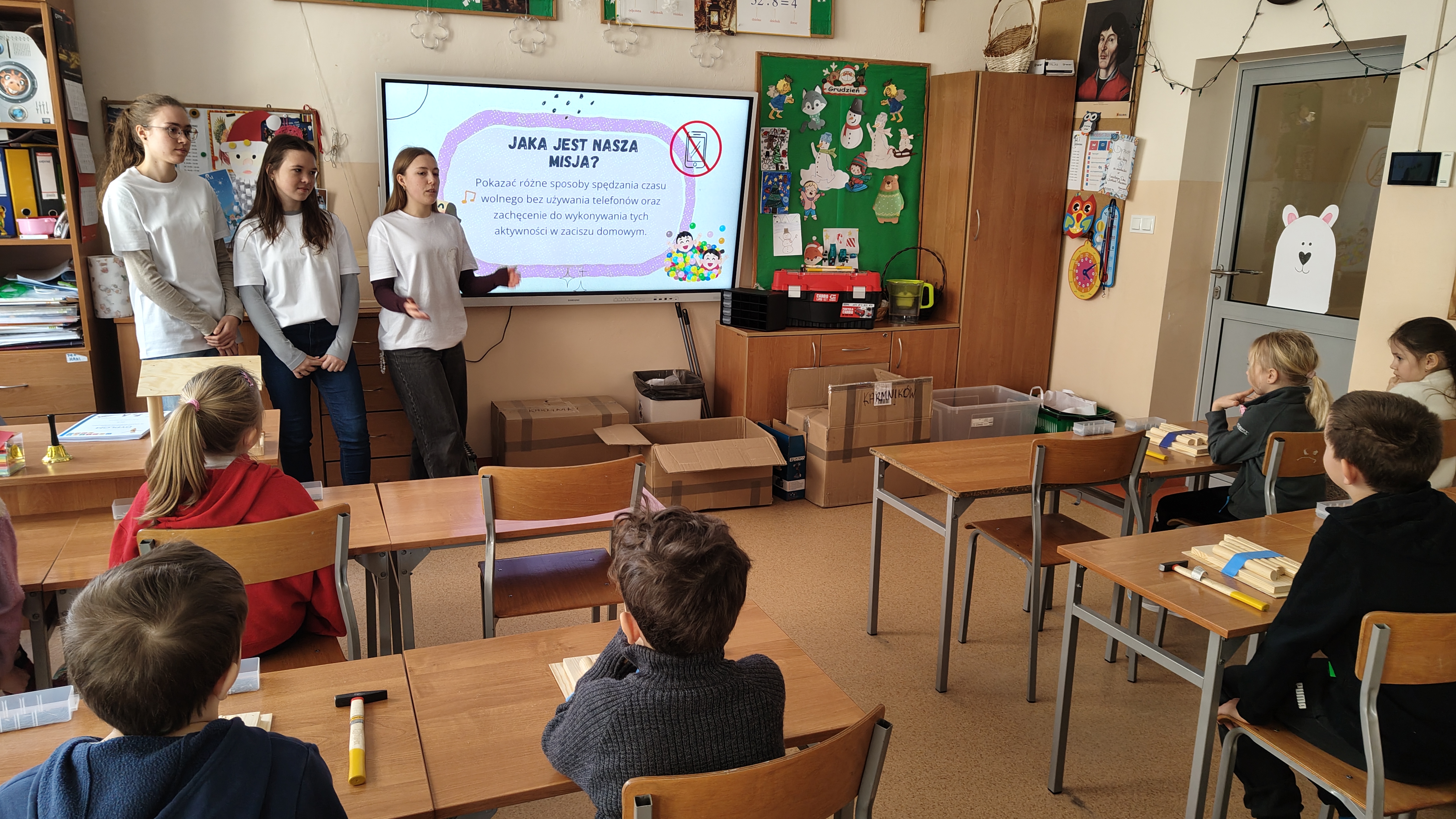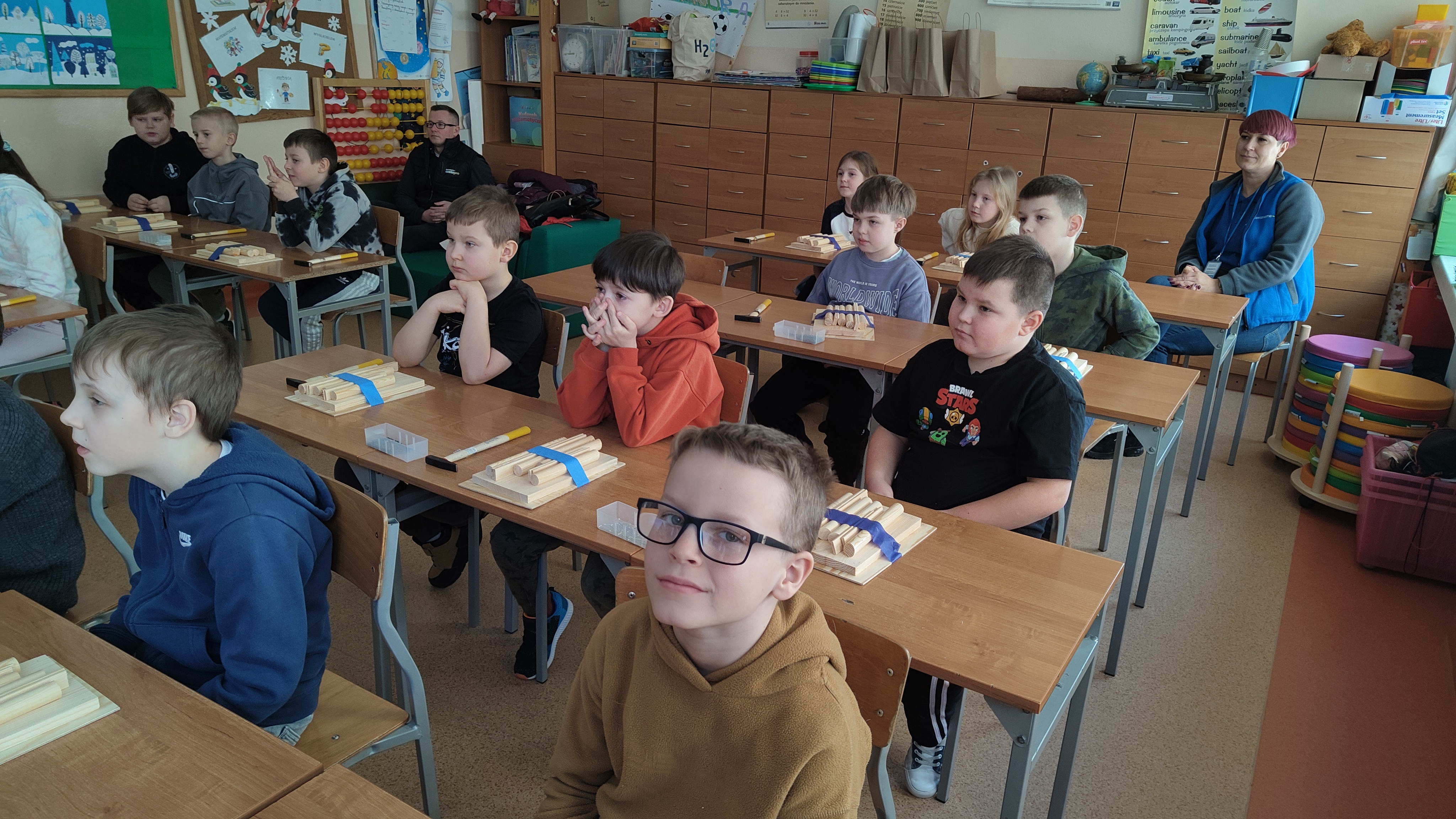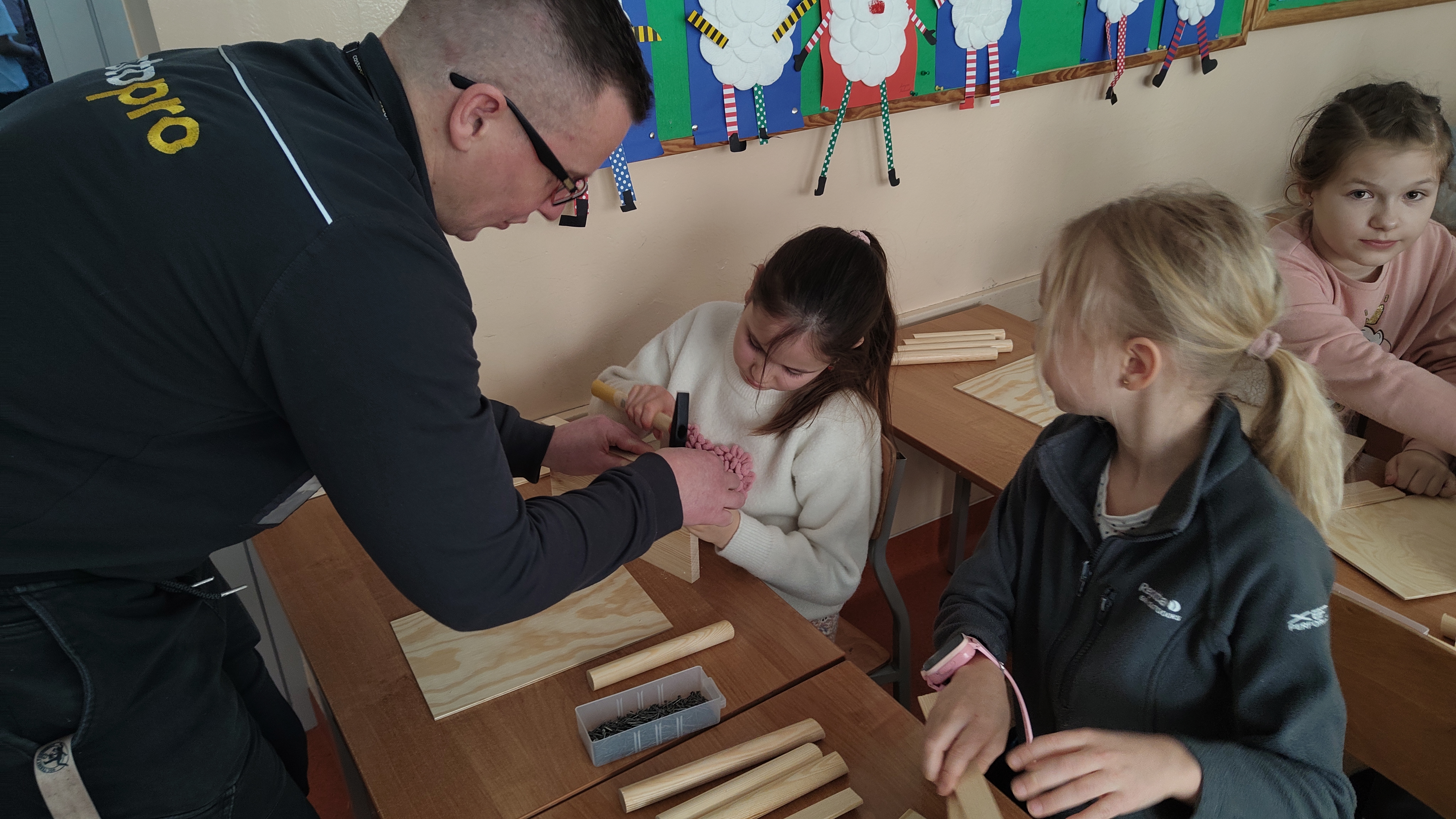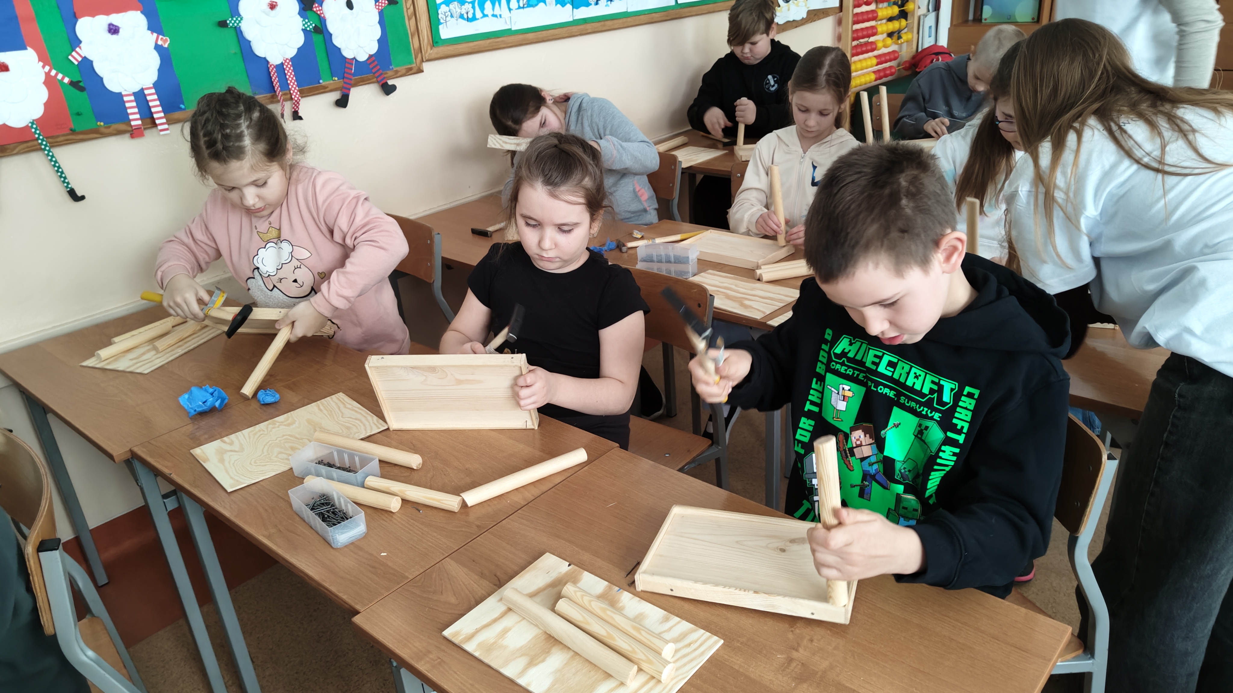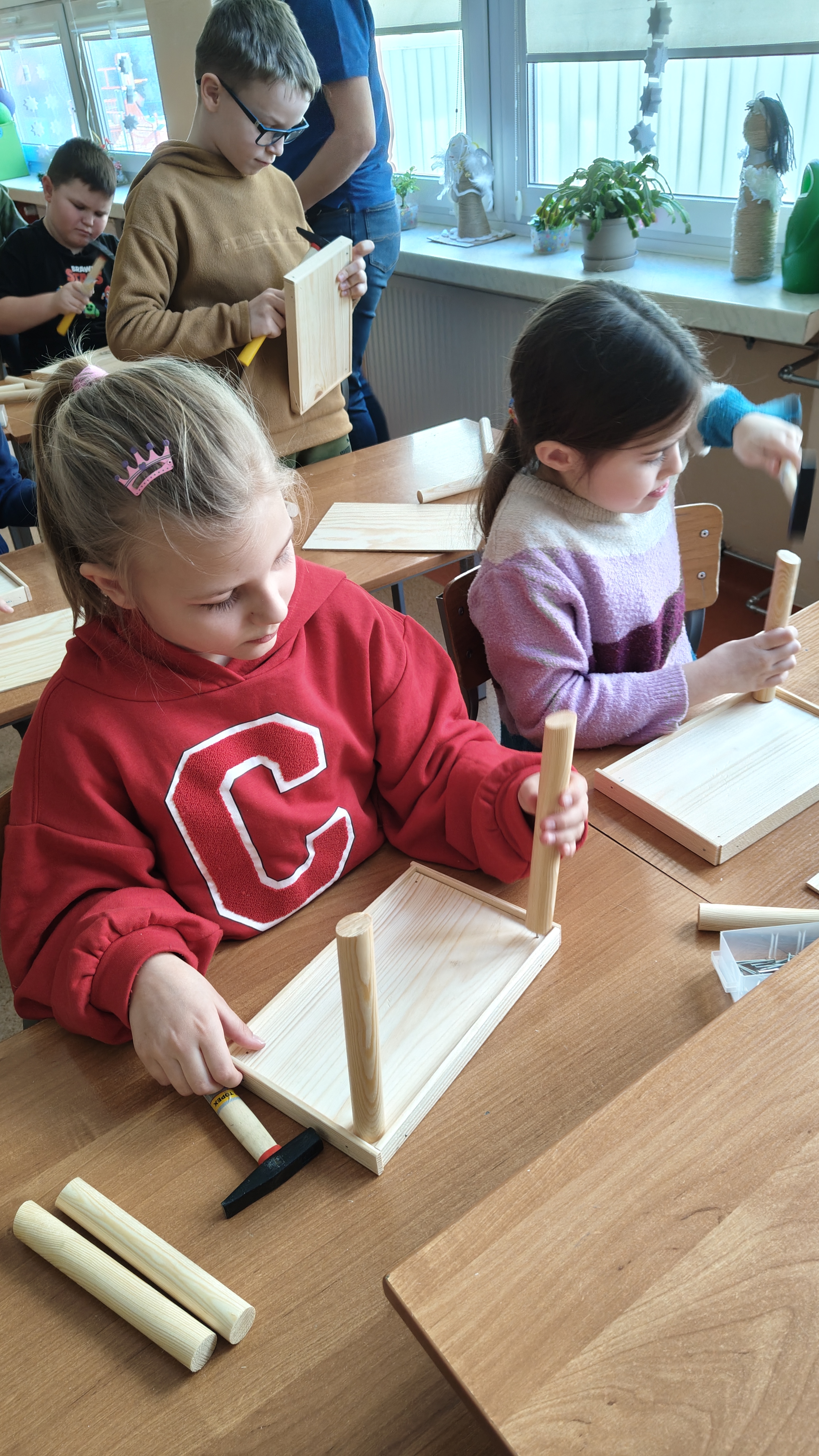W poniedziałek 2 lutego, uczniowie klasy 2a, 2c i 3a, uczestniczyli w nietypowych warsztatach, prowadzonych przez uczennice trzeciej klasy LO w Pruszczu Gdańskim: Karolinę Witek, Oliwię Kowalik i Maję Wrona. Dziewczynki realizują projekt pod nazwą "Screen Away", którego celem jest zachęcenie dzieci do ograniczenia korzystania z telefonów komórkowych oraz odkrywania własnych pasji i aktywności pozascreenowych. Ponadto wymienione uczennice biorą udział w Ogólnopolskiej Olimpiadzie Projektów Społecznych pt. "Zwolnieni z teorii". Warsztaty miały charakter zajęć praktyczno-technicznych, na których dzieci własnoręcznie tworzyły -z użyciem prostych narzędzi- przestrzenną pracę z drewna. Aby uatrakcyjnić zajęcia, na spotkanie zaproszono przeszkolonych pracowników Castoramy, którzy przywieźli potrzebne materiały i służyli pomocą. Uczniowie z wielkim zaangażowaniem przystąpili do pracy, za którą otrzymali pamiątkowe dyplomy. Gotowe konstrukcje zabrali ze sobą do domu -tylko od ich wyobraźni zależy, jak będą one wykorzystane (karmnik dla ptaków, domek dla lalek czy też jako półka). To były z pewnością ciekawe i pożyteczne warsztaty!