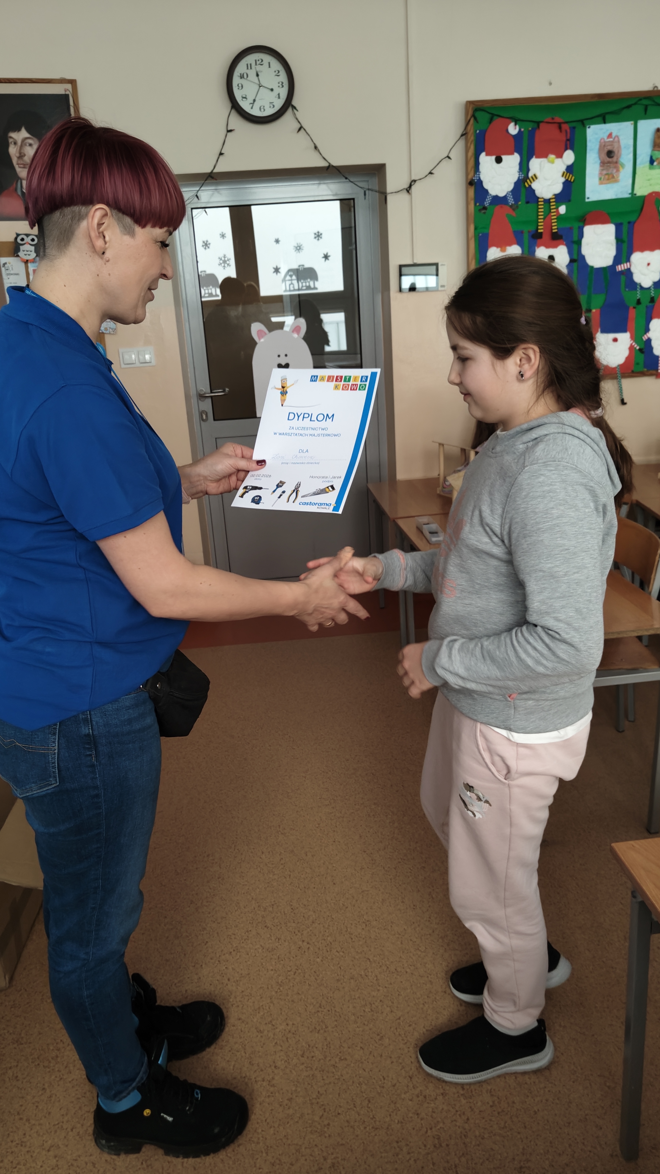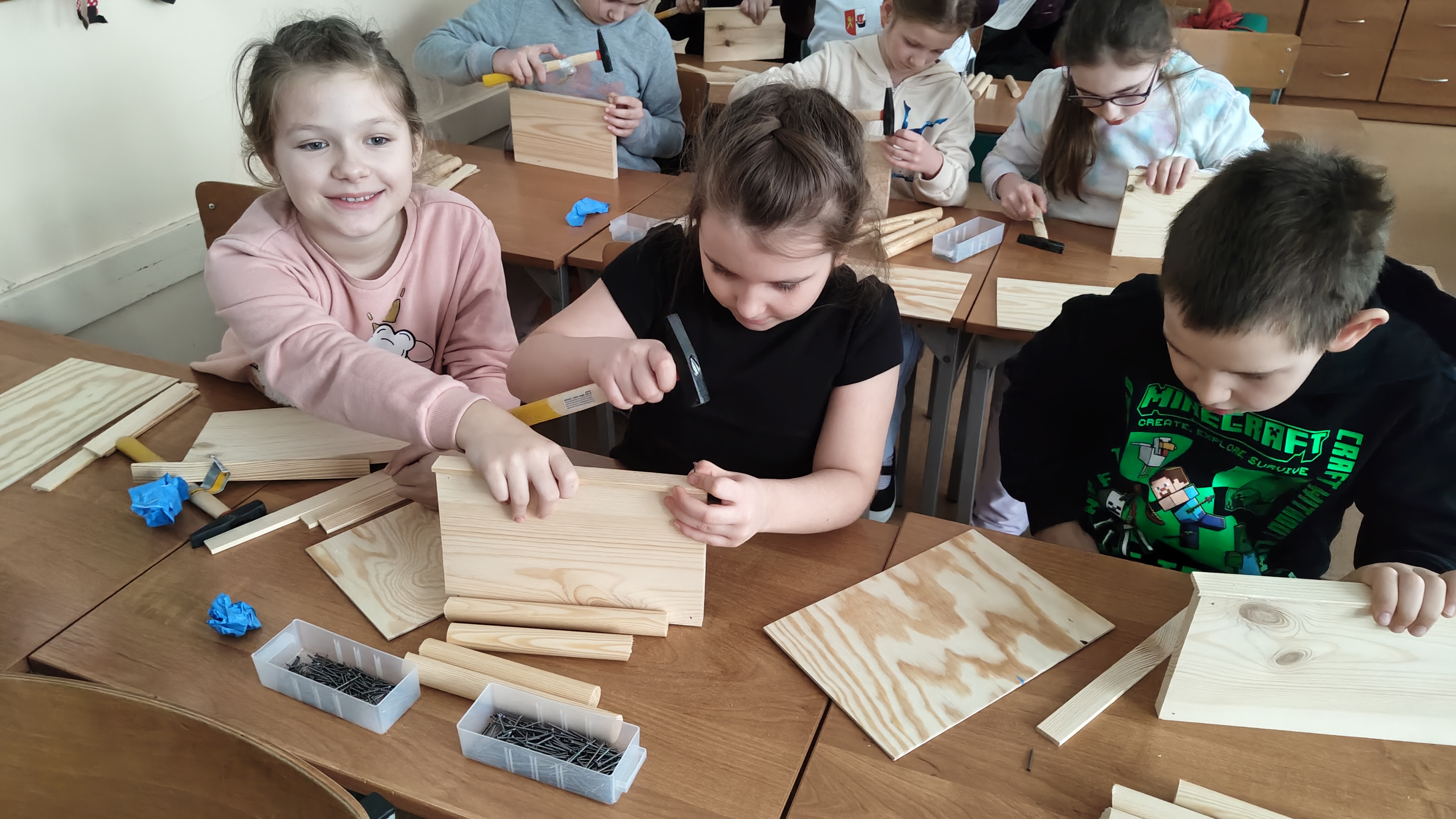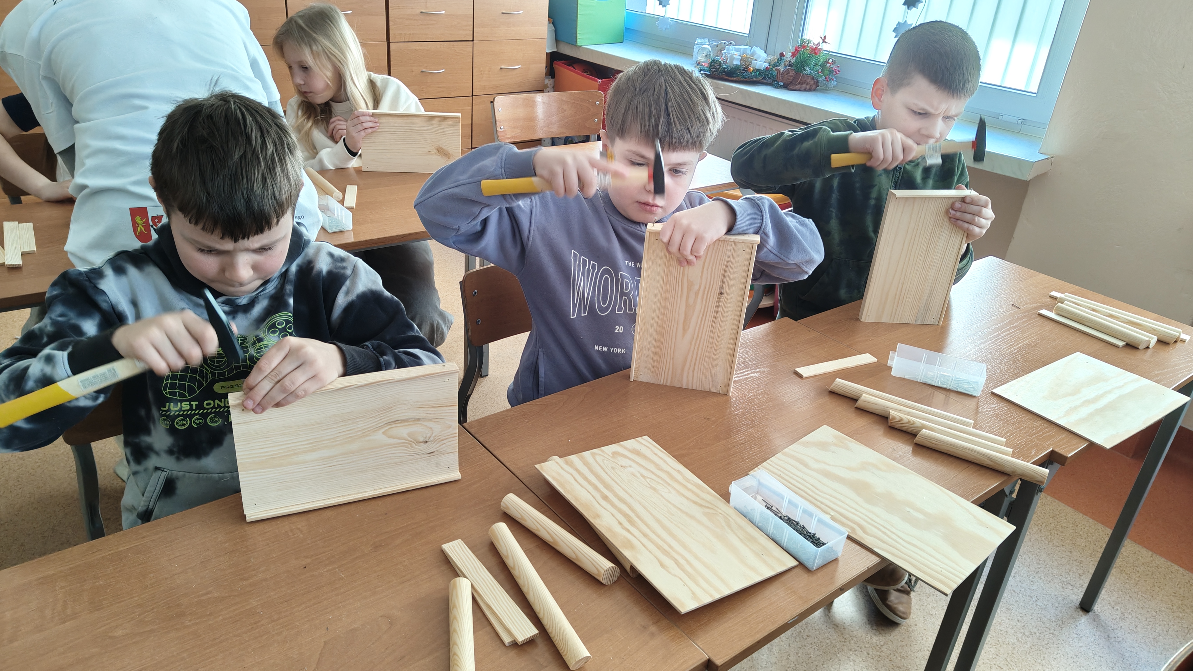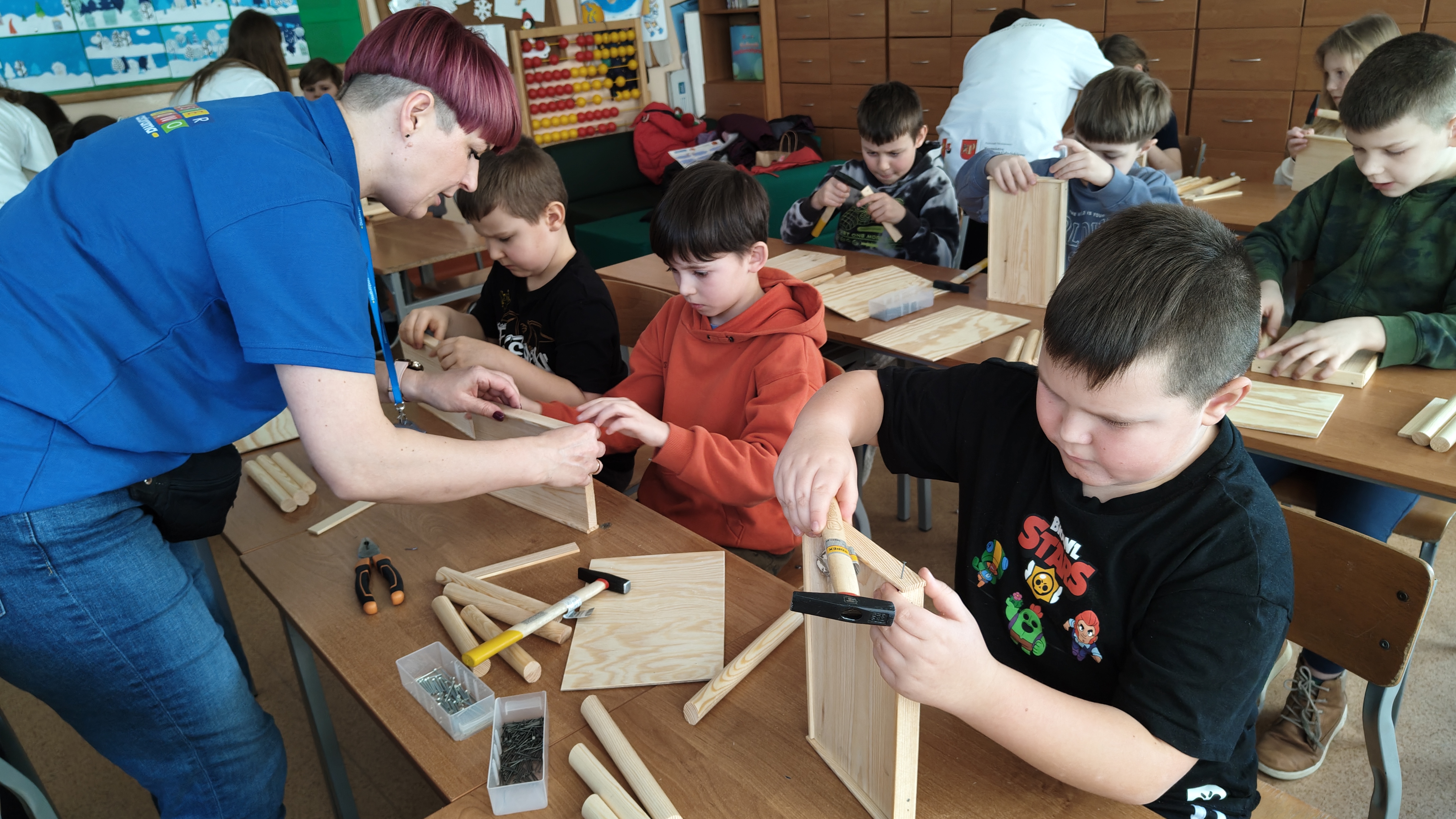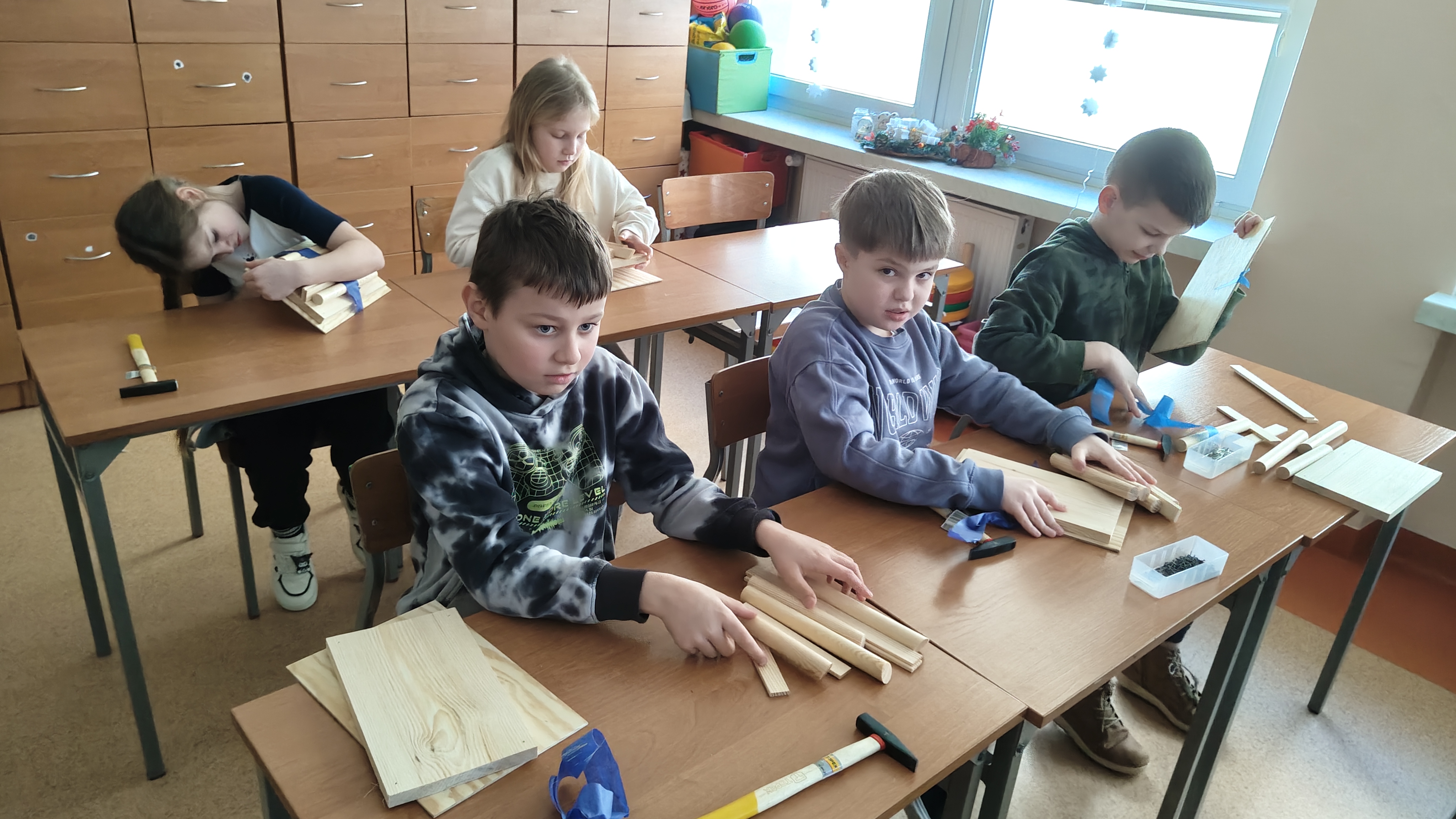 W poniedziałek 2 lutego, uczniowie klasy 2a, 2c i 3a, uczestniczyli w nietypowych warsztatach, prowadzonych przez uczennice trzeciej klasy LO w Pruszczu Gdańskim: Karolinę Witek, Oliwię Kowalik i Maję Wrona. Dziewczynki realizują projekt pod nazwą "Screen Away", którego celem jest zachęcenie dzieci do ograniczenia korzystania z telefonów komórkowych oraz odkrywania własnych pasji i aktywności pozascreenowych. Ponadto wymienione uczennice biorą udział w Ogólnopolskiej Olimpiadzie Projektów Społecznych pt. "Zwolnieni z teorii". Warsztaty miały charakter zajęć praktyczno-technicznych, na których dzieci własnoręcznie tworzyły -z użyciem prostych narzędzi- przestrzenną pracę z drewna. Aby uatrakcyjnić zajęcia, na spotkanie zaproszono przeszkolonych pracowników Castoramy, którzy przywieźli potrzebne materiały i służyli pomocą. Uczniowie z wielkim zaangażowaniem przystąpili do pracy, za którą otrzymali pamiątkowe dyplomy. Gotowe konstrukcje zabrali ze sobą do domu -tylko od ich wyobraźni zależy, jak będą one wykorzystane (karmnik dla ptaków, domek dla lalek czy też jako półka). To były z pewnością ciekawe i pożyteczne warsztaty!