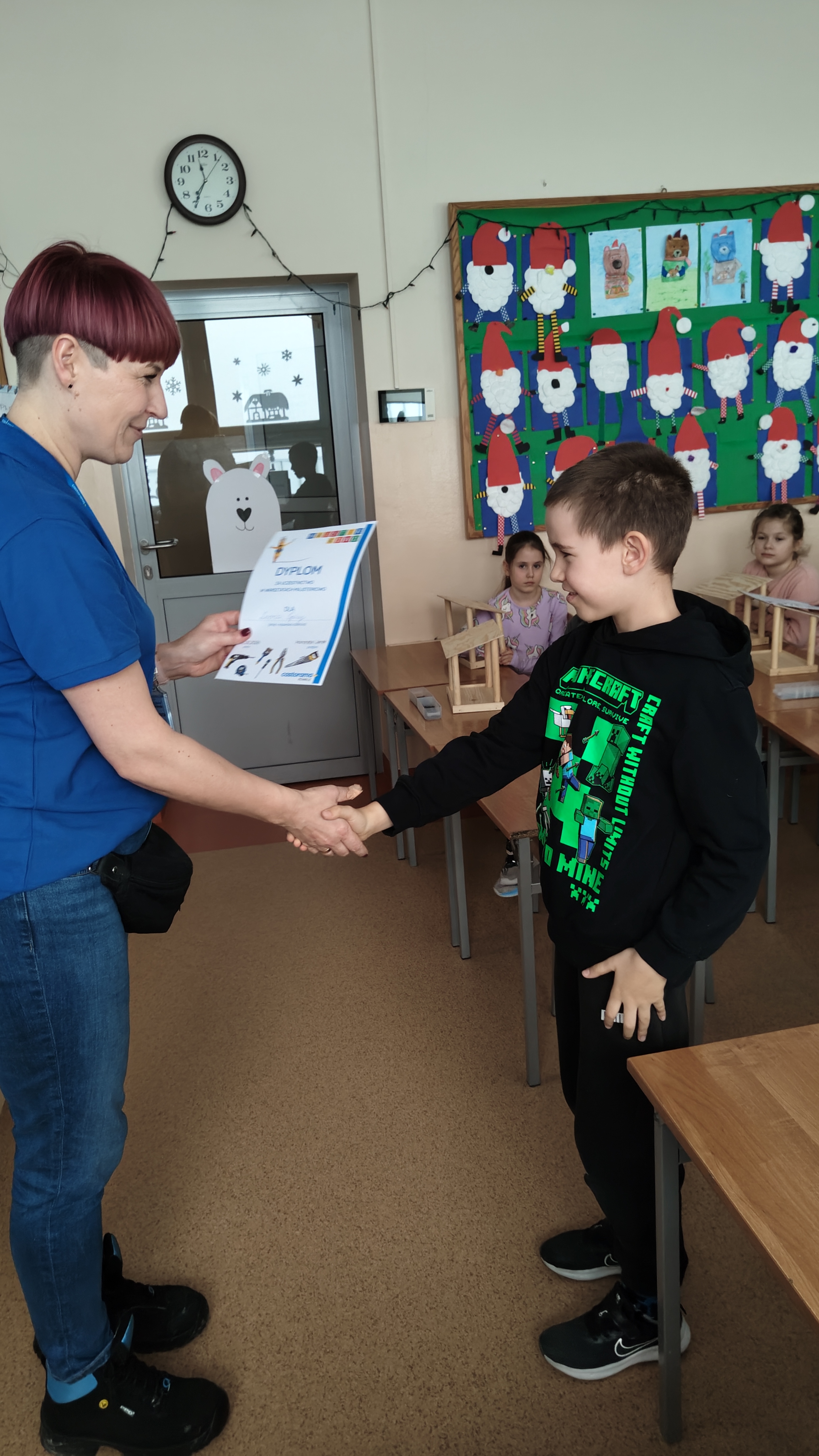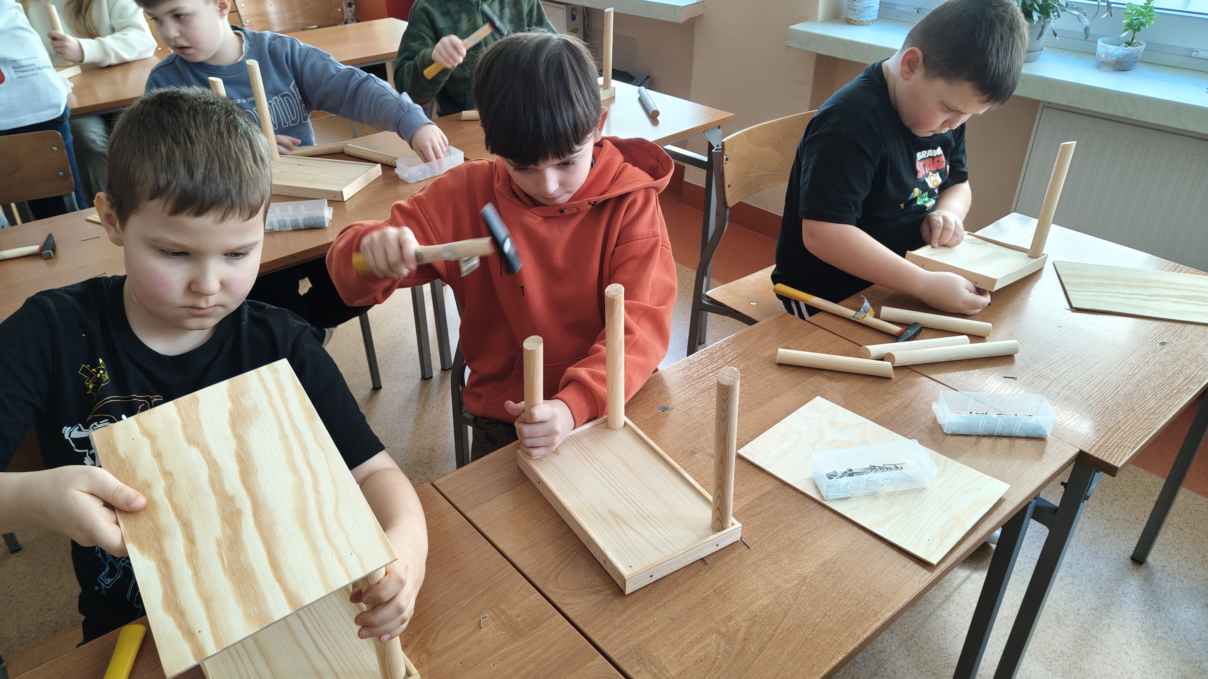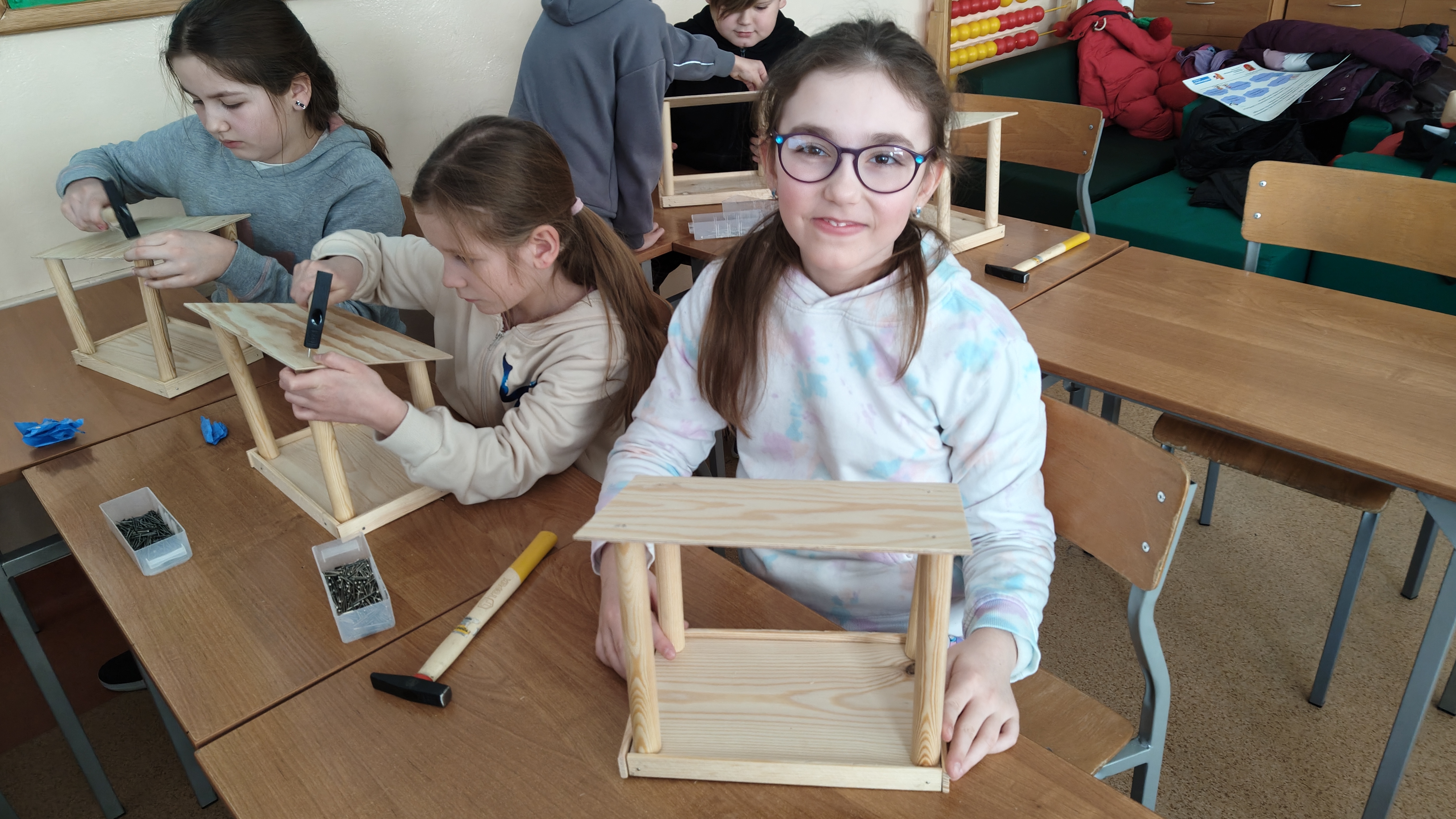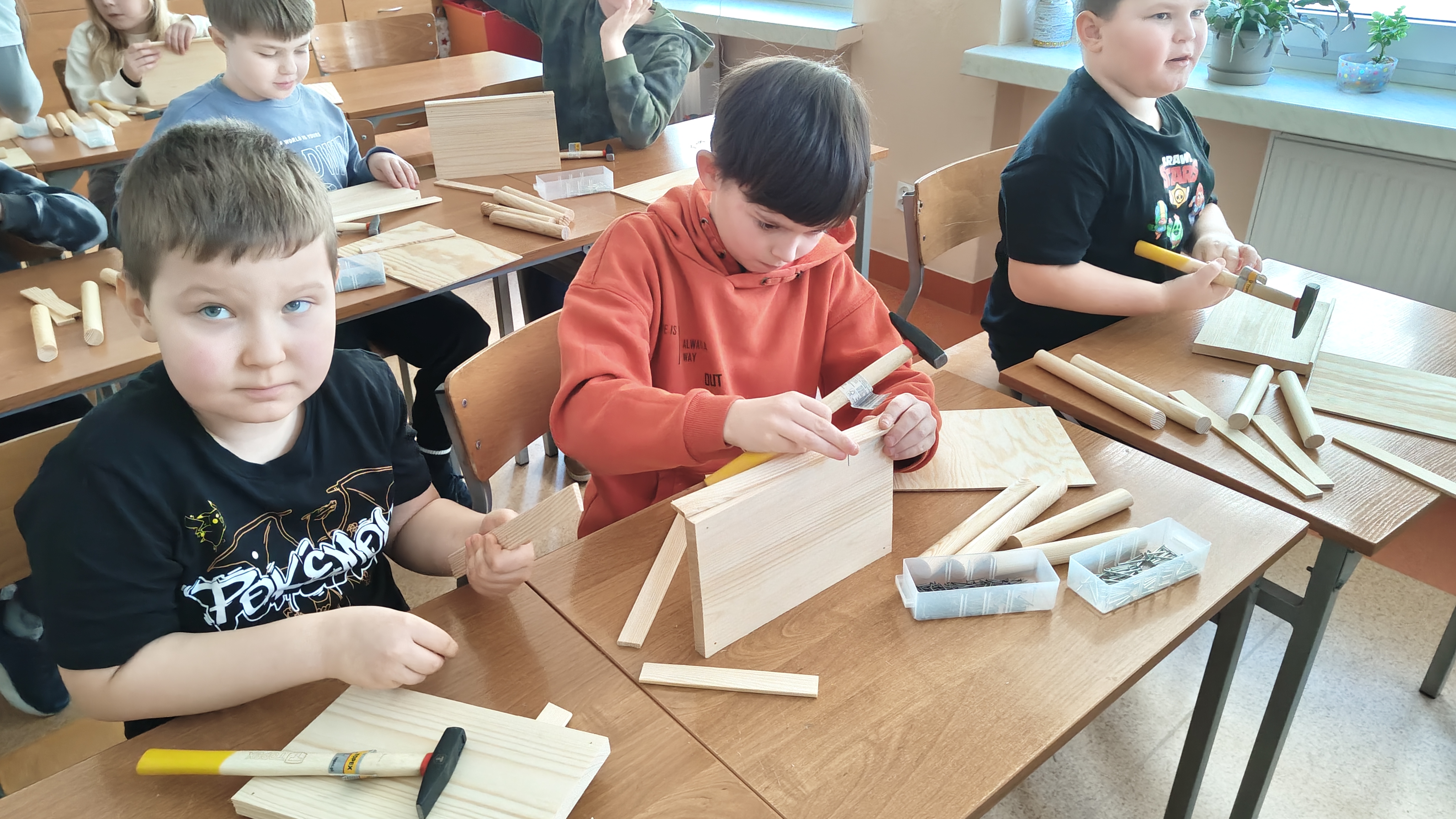 W poniedziałek 2 lutego, uczniowie klasy 2a, 2c i 3a, uczestniczyli w nietypowych warsztatach, prowadzonych przez uczennice trzeciej klasy LO w Pruszczu Gdańskim: Karolinę Witek, Oliwię Kowalik i Maję Wrona. Dziewczynki realizują projekt pod nazwą "Screen Away", którego celem jest zachęcenie dzieci do ograniczenia korzystania z telefonów komórkowych oraz odkrywania własnych pasji i aktywności pozascreenowych. Ponadto wymienione uczennice biorą udział w Ogólnopolskiej Olimpiadzie Projektów Społecznych pt. "Zwolnieni z teorii". Warsztaty miały charakter zajęć praktyczno-technicznych, na których dzieci własnoręcznie tworzyły -z użyciem prostych narzędzi- przestrzenną pracę z drewna. Aby uatrakcyjnić zajęcia, na spotkanie zaproszono przeszkolonych pracowników Castoramy, którzy przywieźli potrzebne materiały i służyli pomocą. Uczniowie z wielkim zaangażowaniem przystąpili do pracy, za którą otrzymali pamiątkowe dyplomy. Gotowe konstrukcje zabrali ze sobą do domu -tylko od ich wyobraźni zależy, jak będą one wykorzystane (karmnik dla ptaków, domek dla lalek czy też jako półka). To były z pewnością ciekawe i pożyteczne warsztaty!