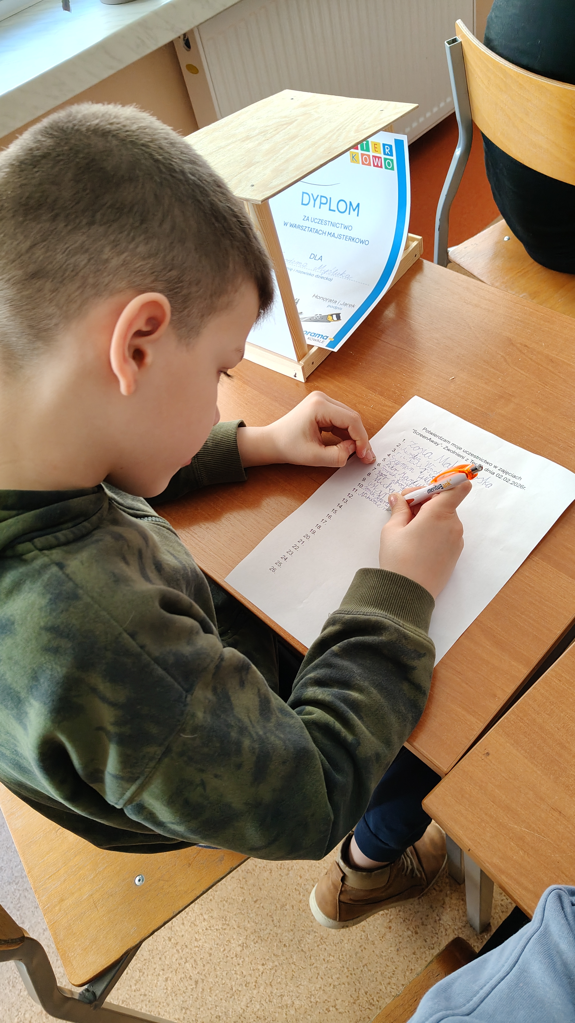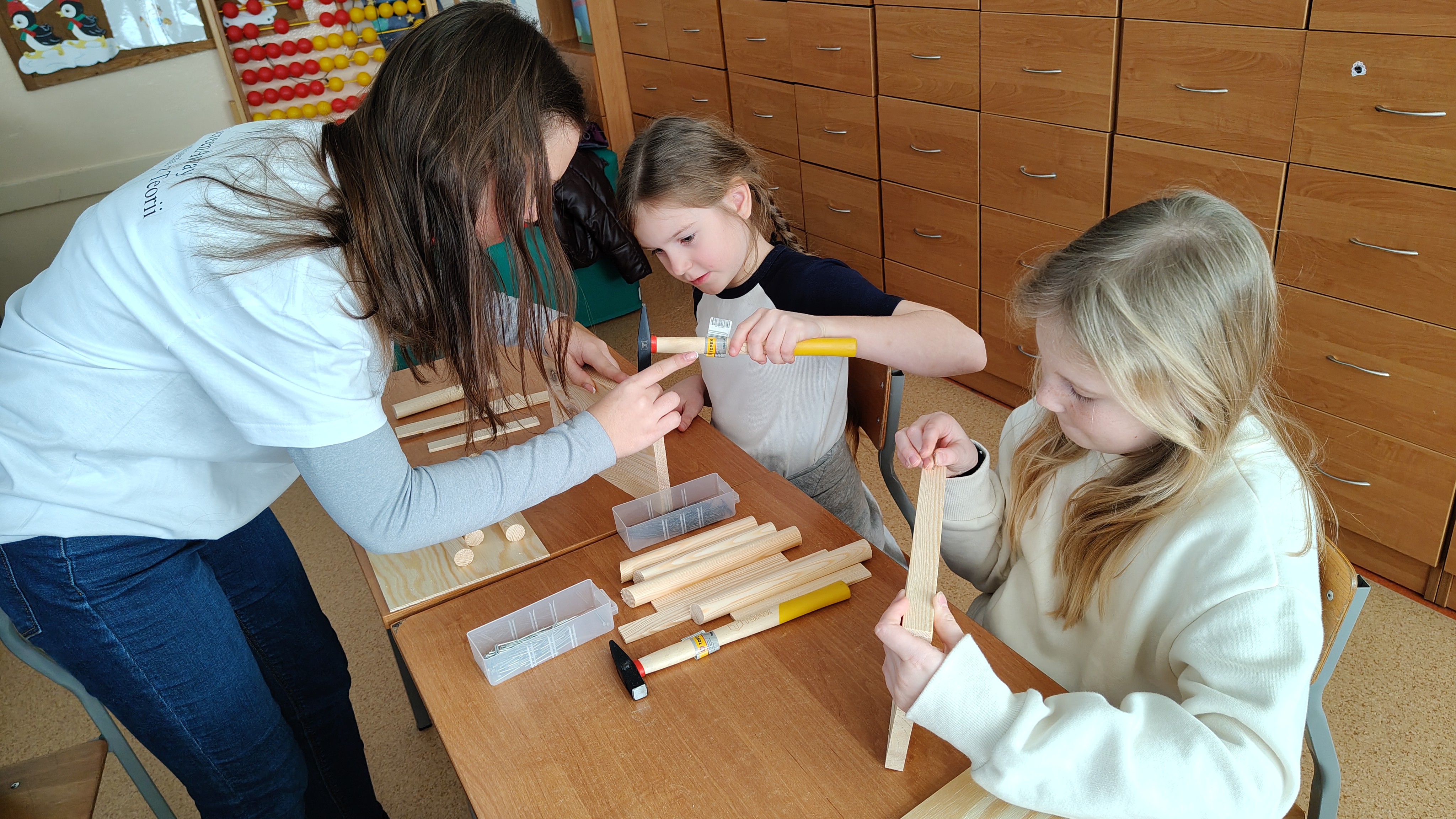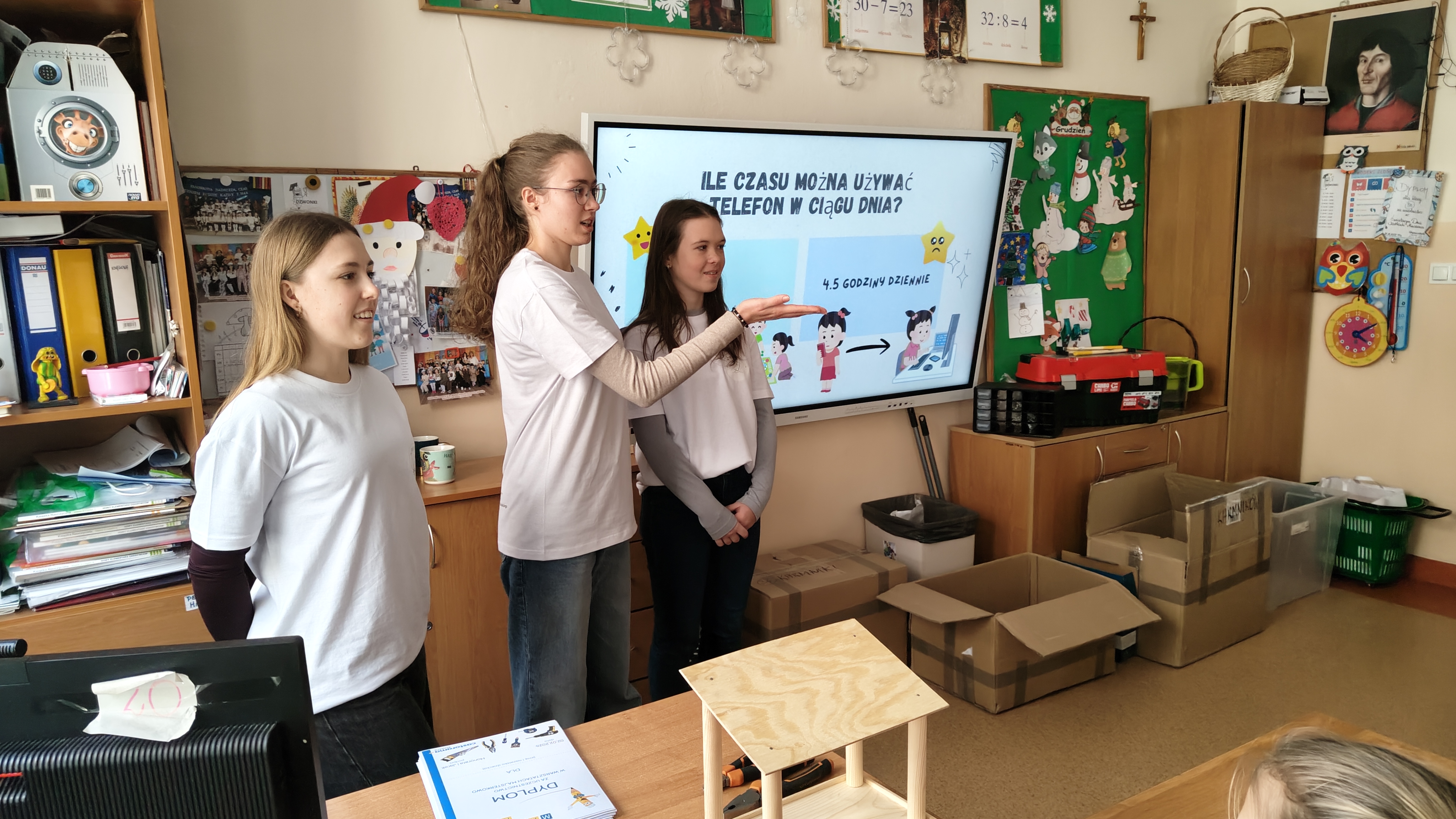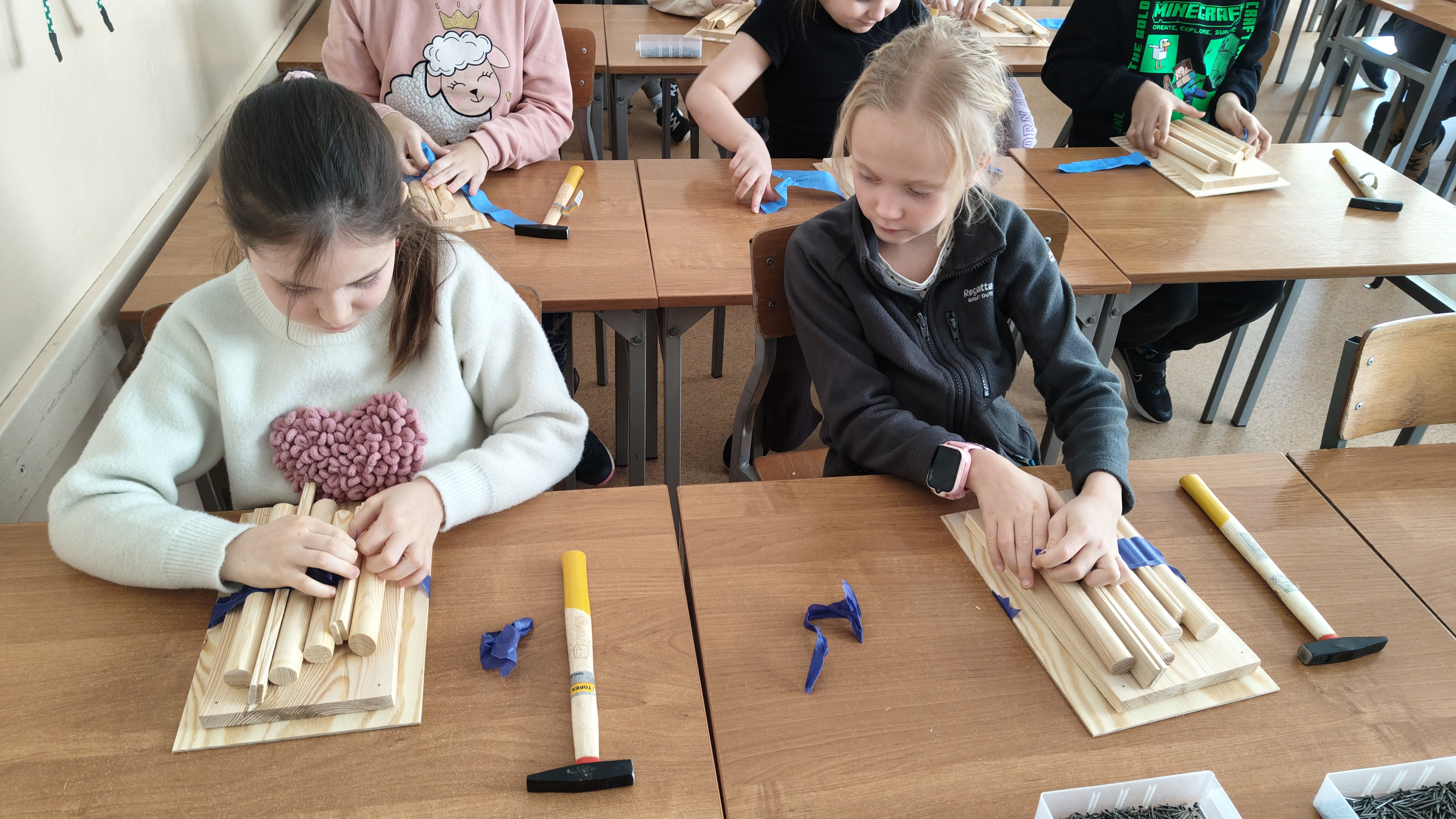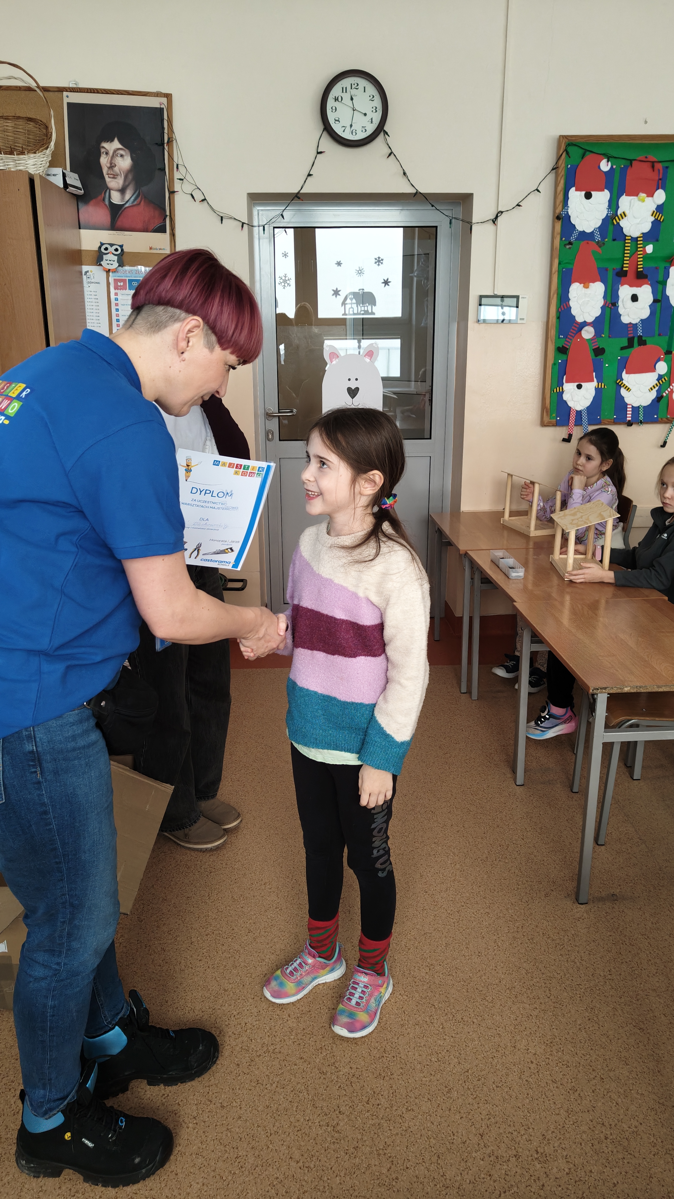 W poniedziałek 2 lutego, uczniowie klasy 2a, 2c i 3a, uczestniczyli w nietypowych warsztatach, prowadzonych przez uczennice trzeciej klasy LO w Pruszczu Gdańskim: Karolinę Witek, Oliwię Kowalik i Maję Wrona. Dziewczynki realizują projekt pod nazwą "Screen Away", którego celem jest zachęcenie dzieci do ograniczenia korzystania z telefonów komórkowych oraz odkrywania własnych pasji i aktywności pozascreenowych. Ponadto wymienione uczennice biorą udział w Ogólnopolskiej Olimpiadzie Projektów Społecznych pt. "Zwolnieni z teorii". Warsztaty miały charakter zajęć praktyczno-technicznych, na których dzieci własnoręcznie tworzyły -z użyciem prostych narzędzi- przestrzenną pracę z drewna. Aby uatrakcyjnić zajęcia, na spotkanie zaproszono przeszkolonych pracowników Castoramy, którzy przywieźli potrzebne materiały i służyli pomocą. Uczniowie z wielkim zaangażowaniem przystąpili do pracy, za którą otrzymali pamiątkowe dyplomy. Gotowe konstrukcje zabrali ze sobą do domu -tylko od ich wyobraźni zależy, jak będą one wykorzystane (karmnik dla ptaków, domek dla lalek czy też jako półka). To były z pewnością ciekawe i pożyteczne warsztaty!