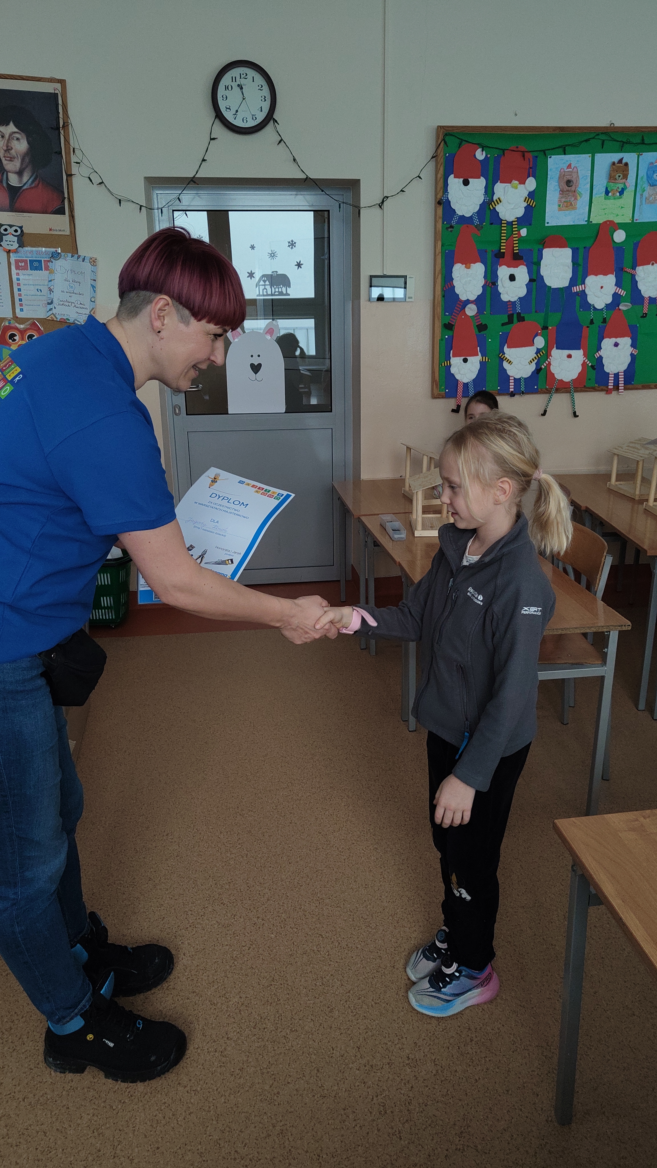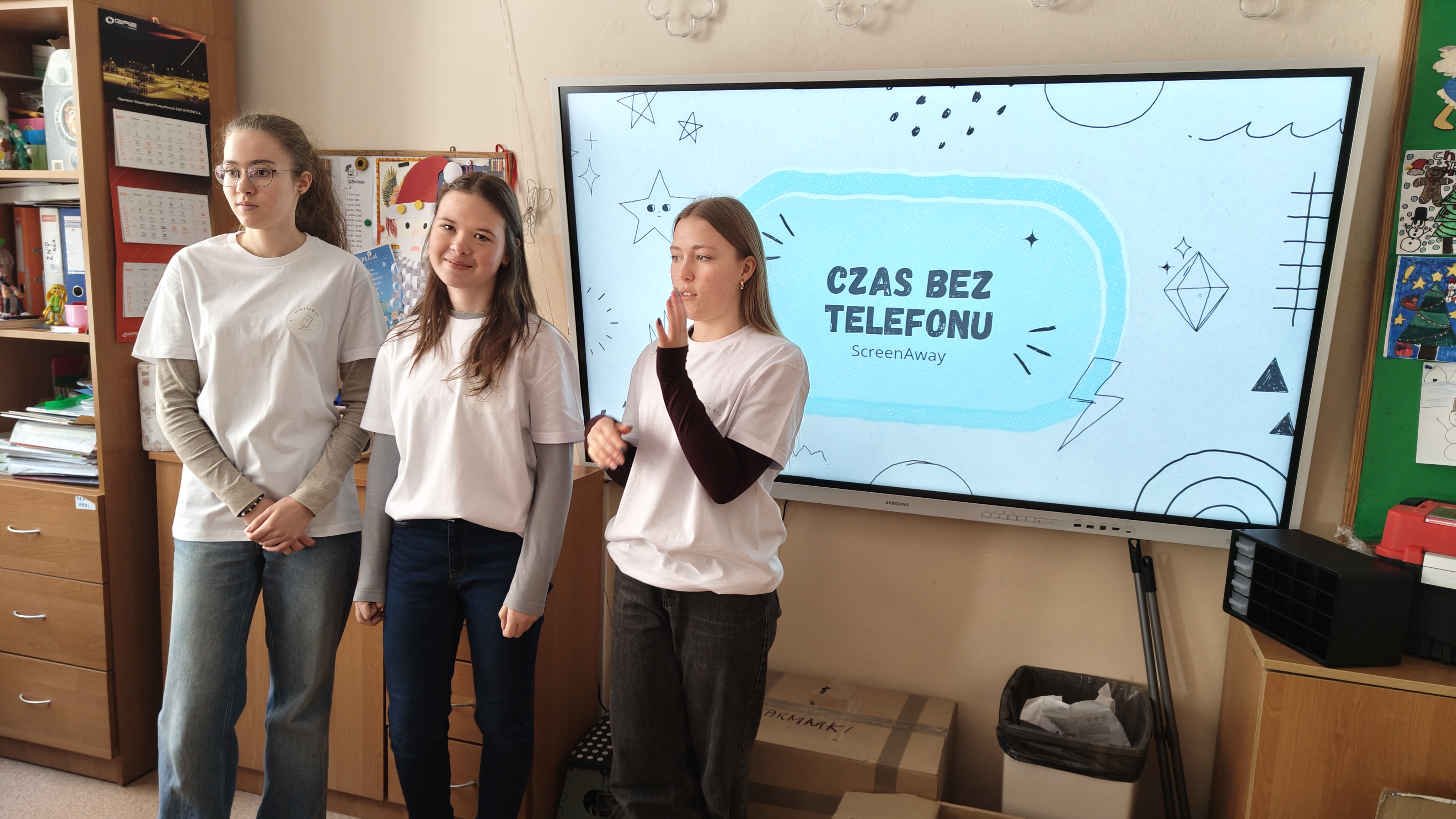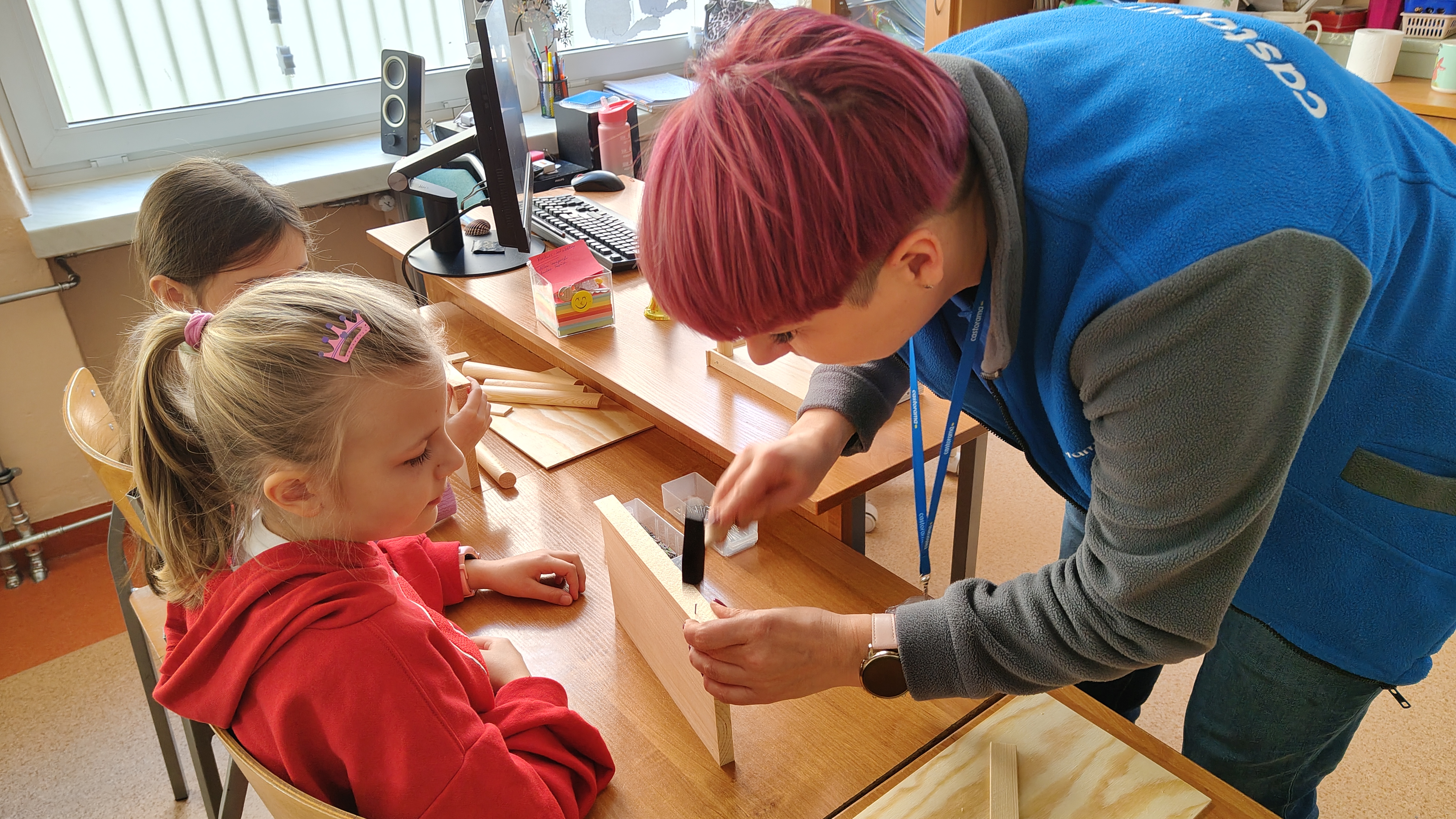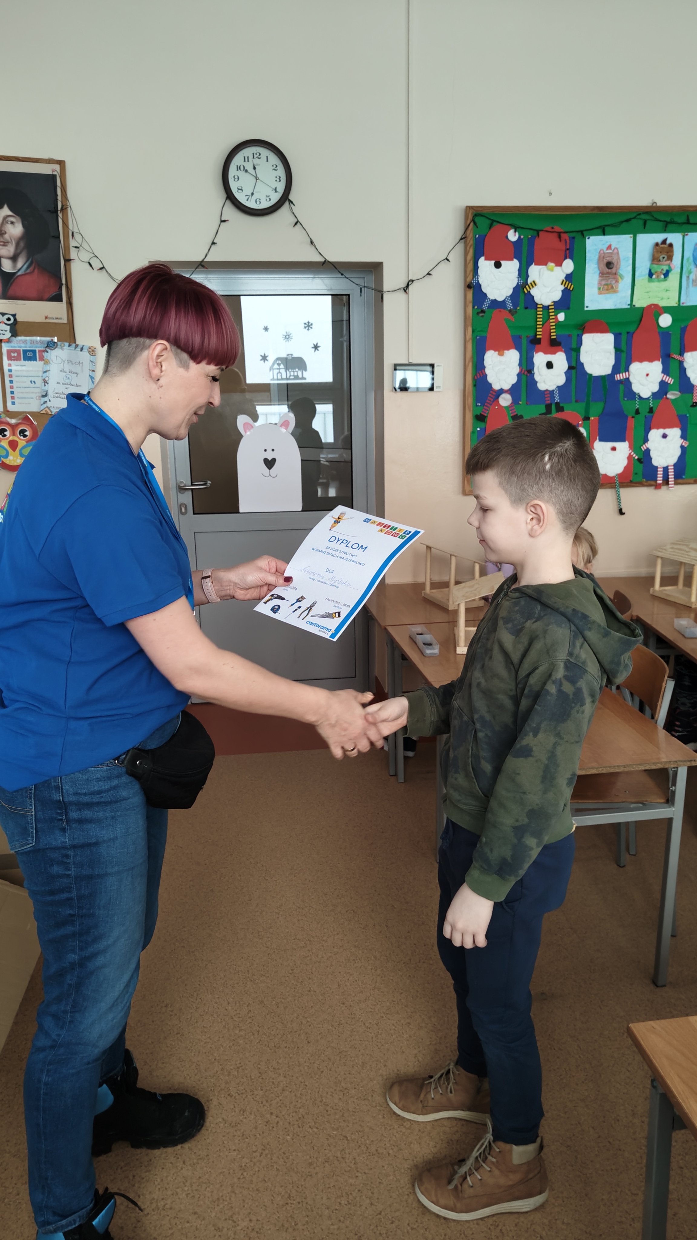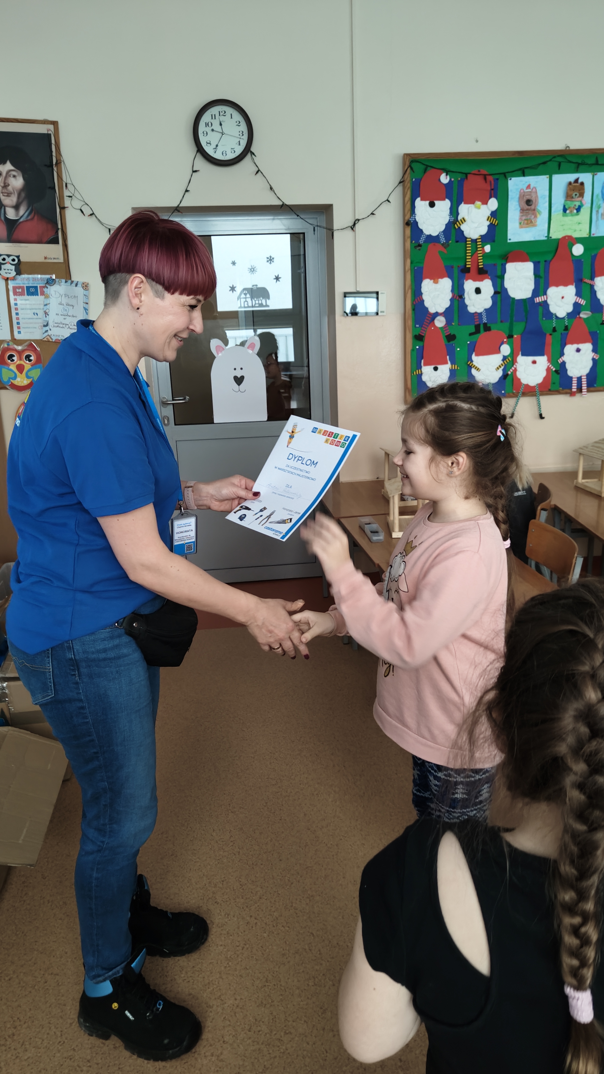 W poniedziałek 2 lutego, uczniowie klasy 2a, 2c i 3a, uczestniczyli w nietypowych warsztatach, prowadzonych przez uczennice trzeciej klasy LO w Pruszczu Gdańskim: Karolinę Witek, Oliwię Kowalik i Maję Wrona. Dziewczynki realizują projekt pod nazwą "Screen Away", którego celem jest zachęcenie dzieci do ograniczenia korzystania z telefonów komórkowych oraz odkrywania własnych pasji i aktywności pozascreenowych. Ponadto wymienione uczennice biorą udział w Ogólnopolskiej Olimpiadzie Projektów Społecznych pt. "Zwolnieni z teorii". Warsztaty miały charakter zajęć praktyczno-technicznych, na których dzieci własnoręcznie tworzyły -z użyciem prostych narzędzi- przestrzenną pracę z drewna. Aby uatrakcyjnić zajęcia, na spotkanie zaproszono przeszkolonych pracowników Castoramy, którzy przywieźli potrzebne materiały i służyli pomocą. Uczniowie z wielkim zaangażowaniem przystąpili do pracy, za którą otrzymali pamiątkowe dyplomy. Gotowe konstrukcje zabrali ze sobą do domu -tylko od ich wyobraźni zależy, jak będą one wykorzystane (karmnik dla ptaków, domek dla lalek czy też jako półka). To były z pewnością ciekawe i pożyteczne warsztaty!