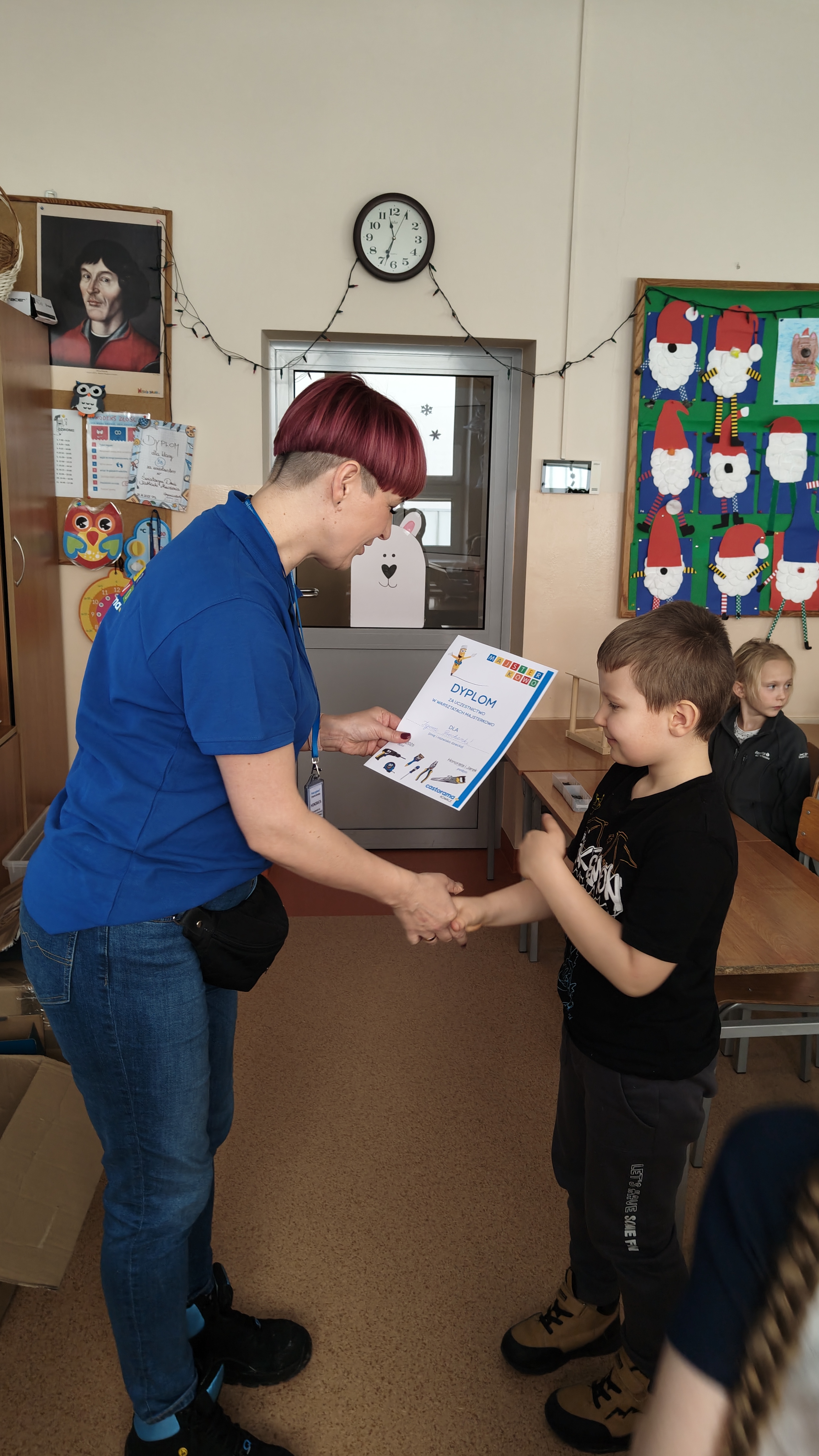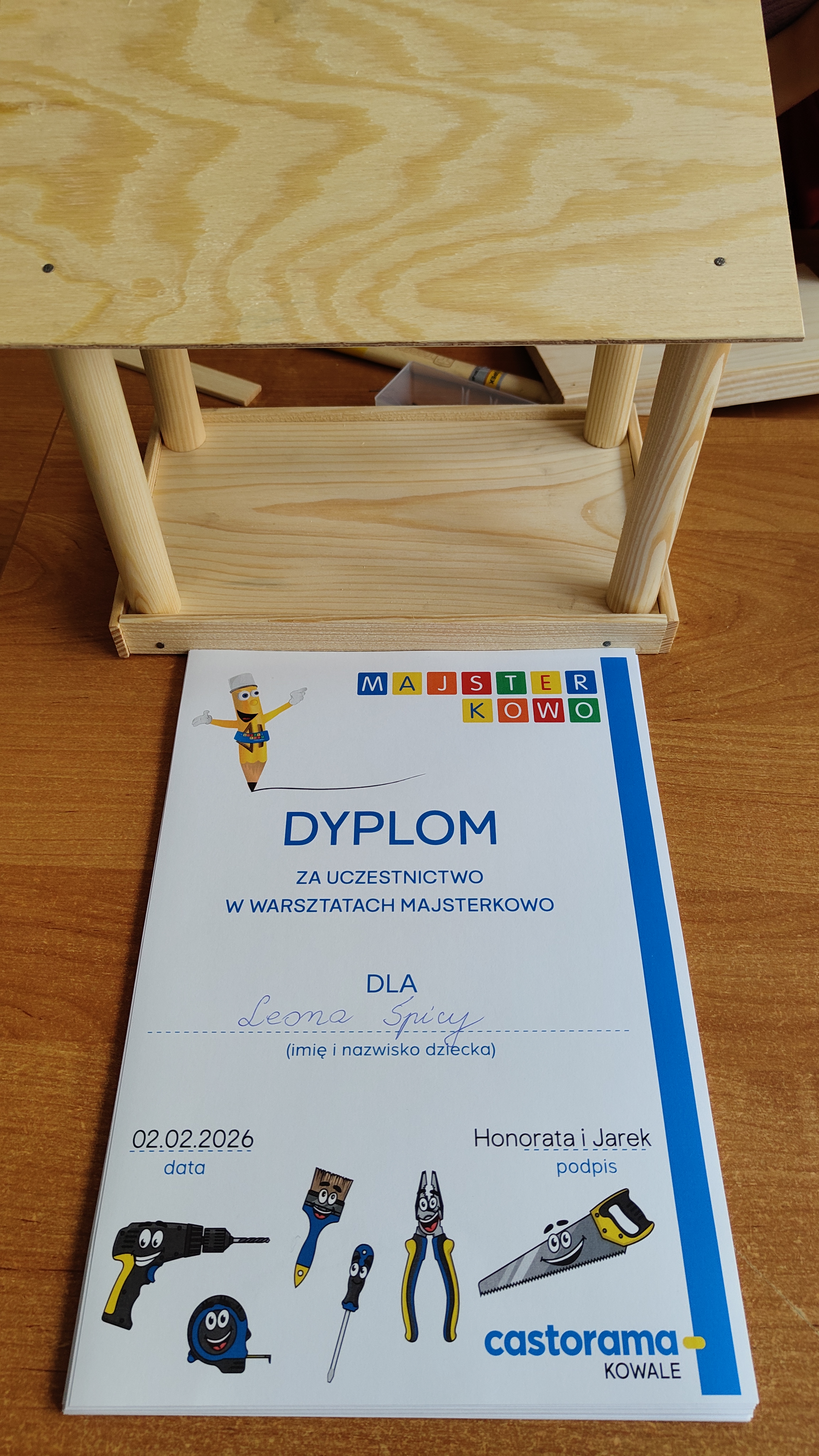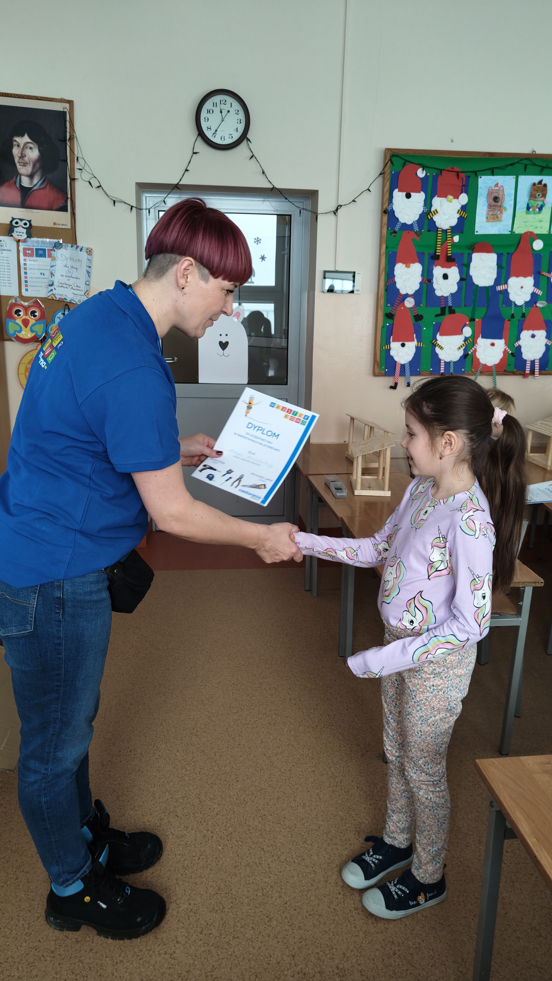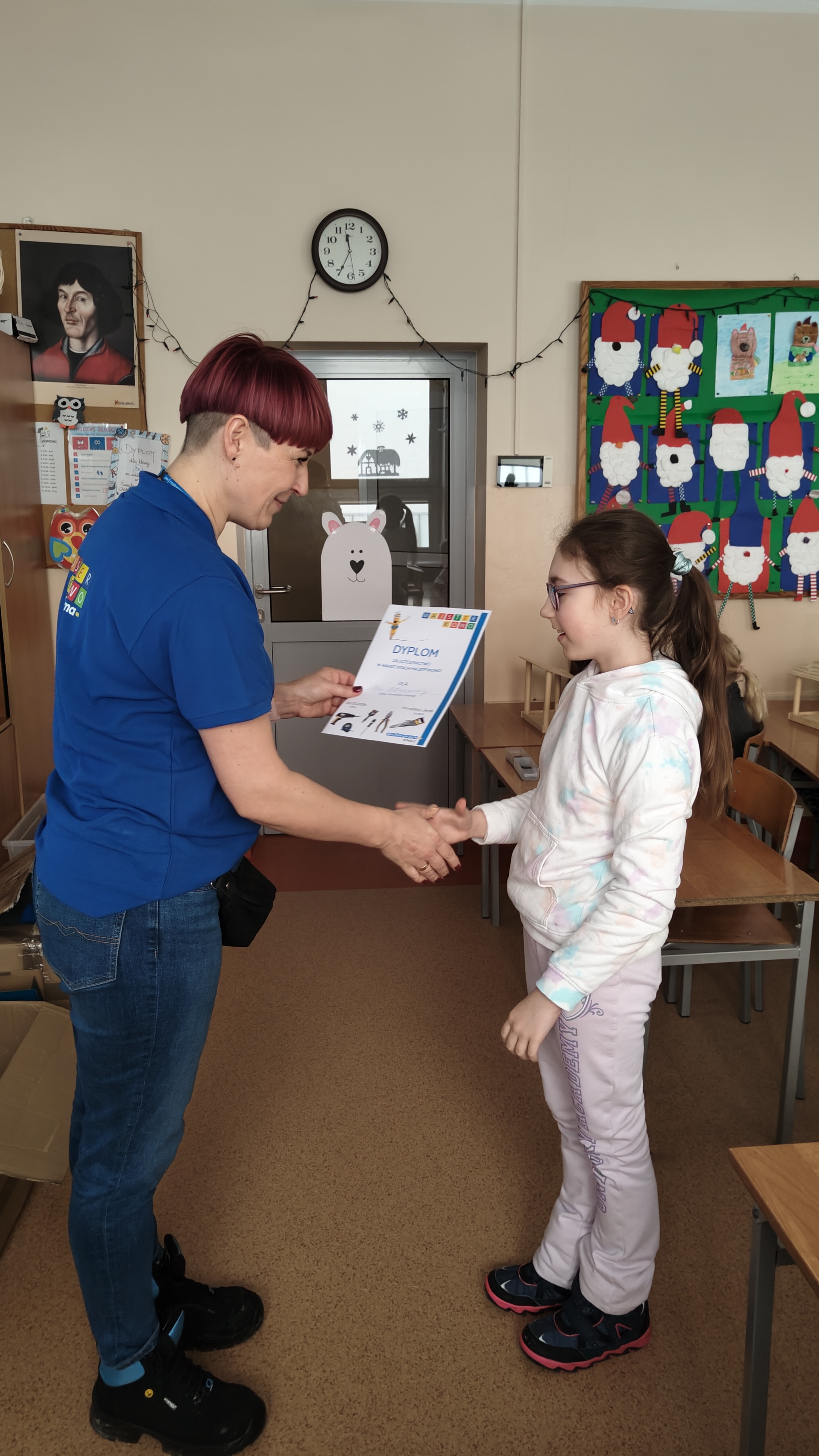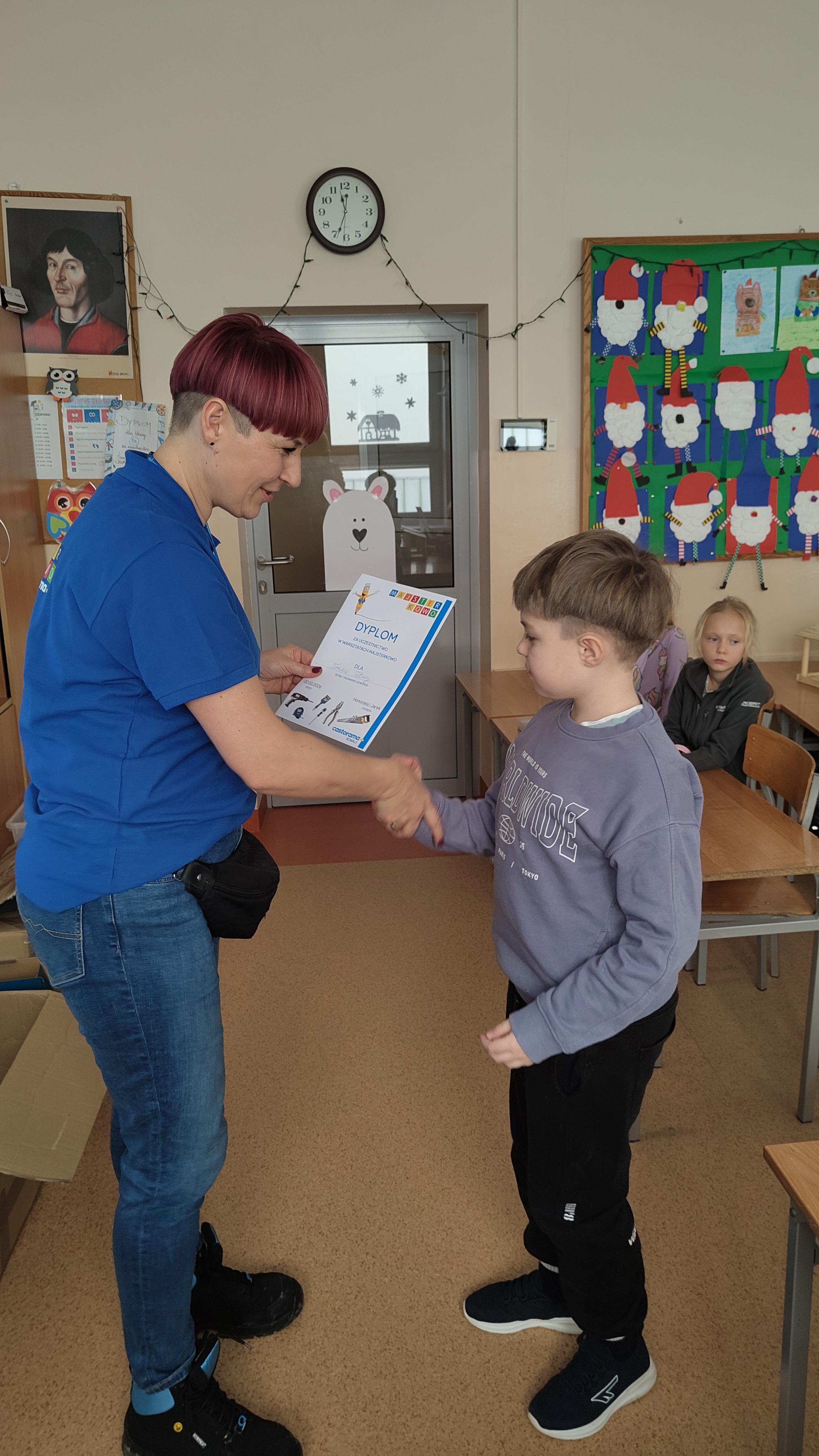 W poniedziałek 2 lutego, uczniowie klasy 2a, 2c i 3a, uczestniczyli w nietypowych warsztatach, prowadzonych przez uczennice trzeciej klasy LO w Pruszczu Gdańskim: Karolinę Witek, Oliwię Kowalik i Maję Wrona. Dziewczynki realizują projekt pod nazwą "Screen Away", którego celem jest zachęcenie dzieci do ograniczenia korzystania z telefonów komórkowych oraz odkrywania własnych pasji i aktywności pozascreenowych. Ponadto wymienione uczennice biorą udział w Ogólnopolskiej Olimpiadzie Projektów Społecznych pt. "Zwolnieni z teorii". Warsztaty miały charakter zajęć praktyczno-technicznych, na których dzieci własnoręcznie tworzyły -z użyciem prostych narzędzi- przestrzenną pracę z drewna. Aby uatrakcyjnić zajęcia, na spotkanie zaproszono przeszkolonych pracowników Castoramy, którzy przywieźli potrzebne materiały i służyli pomocą. Uczniowie z wielkim zaangażowaniem przystąpili do pracy, za którą otrzymali pamiątkowe dyplomy. Gotowe konstrukcje zabrali ze sobą do domu -tylko od ich wyobraźni zależy, jak będą one wykorzystane (karmnik dla ptaków, domek dla lalek czy też jako półka). To były z pewnością ciekawe i pożyteczne warsztaty!