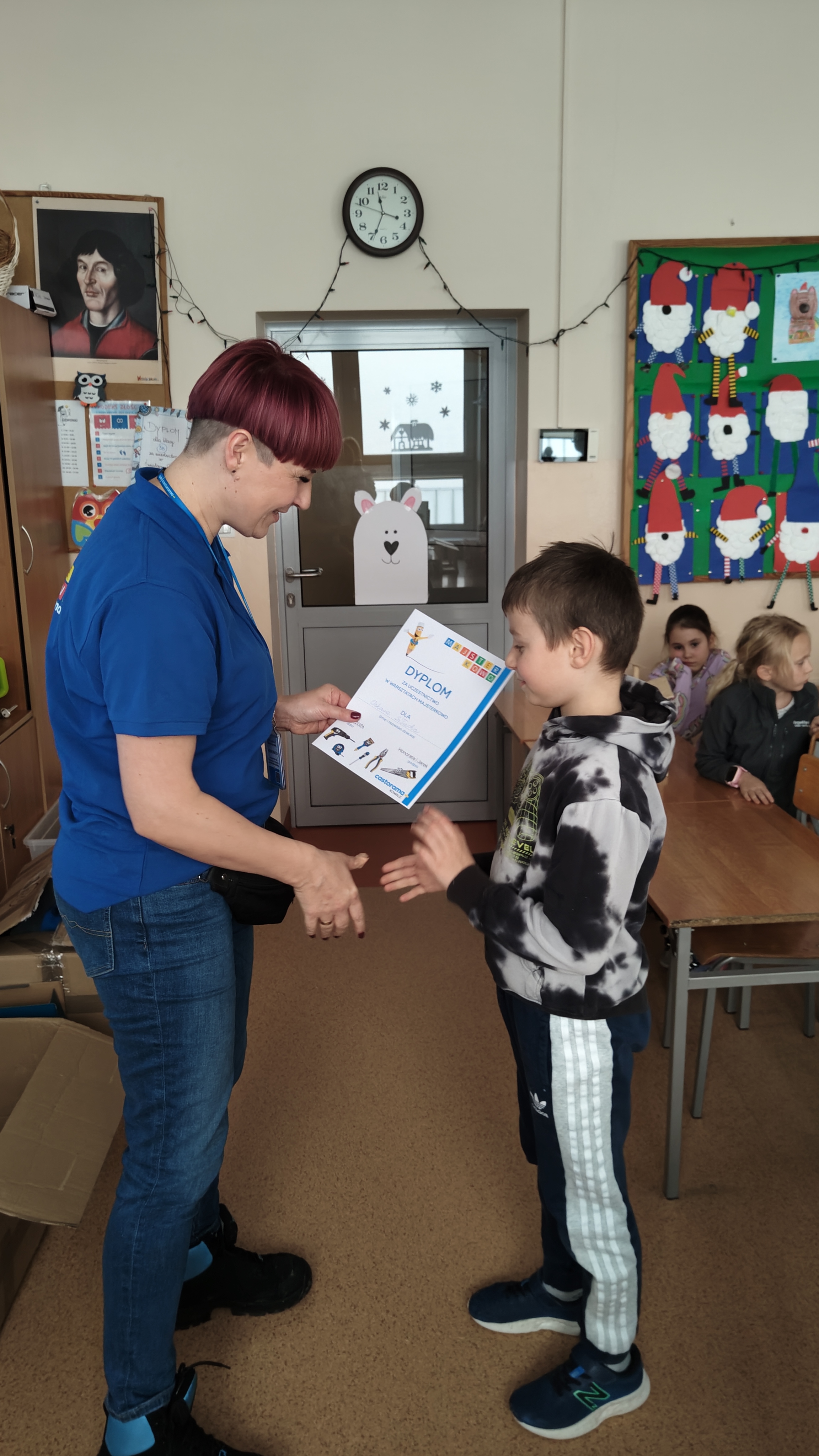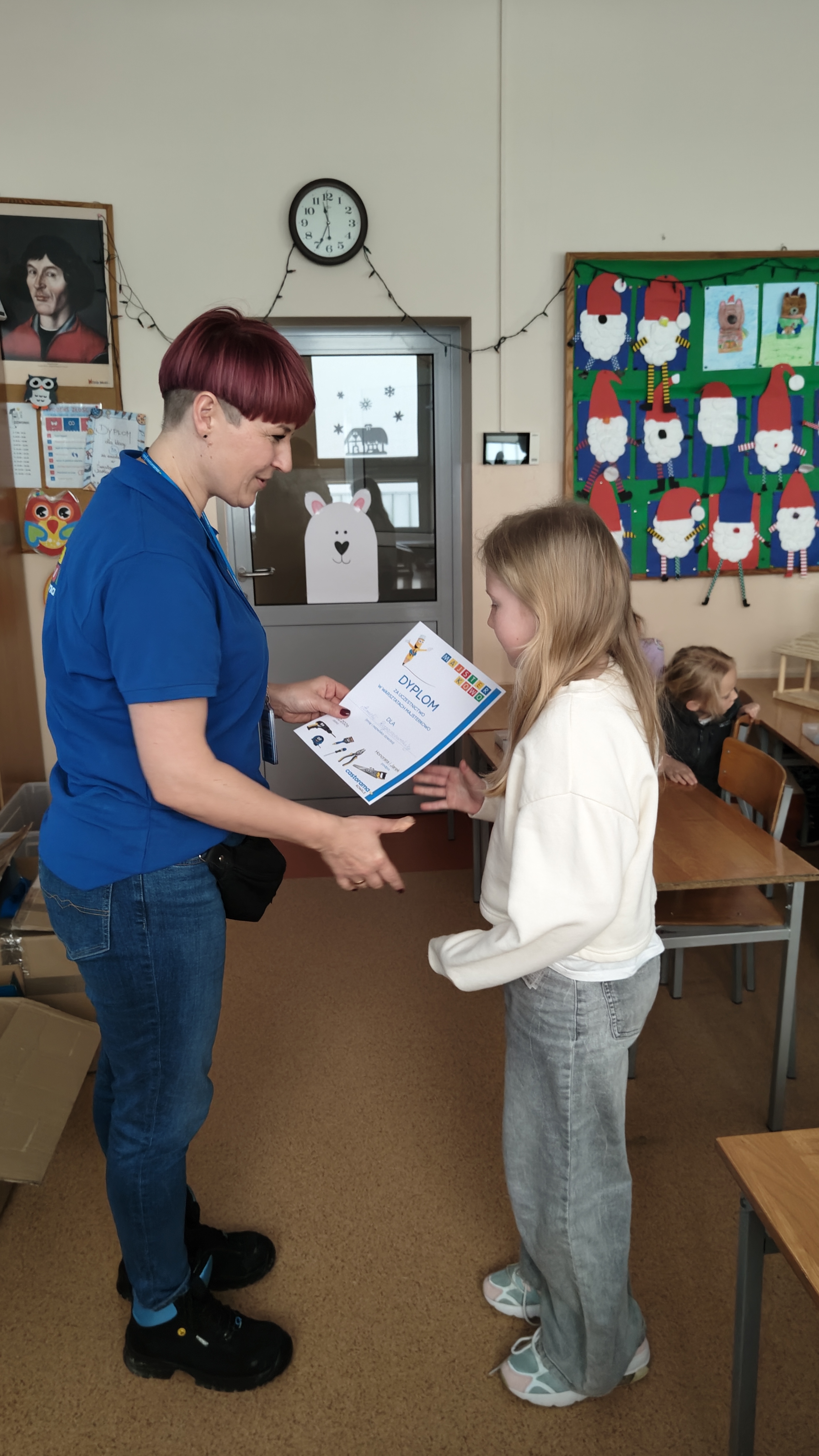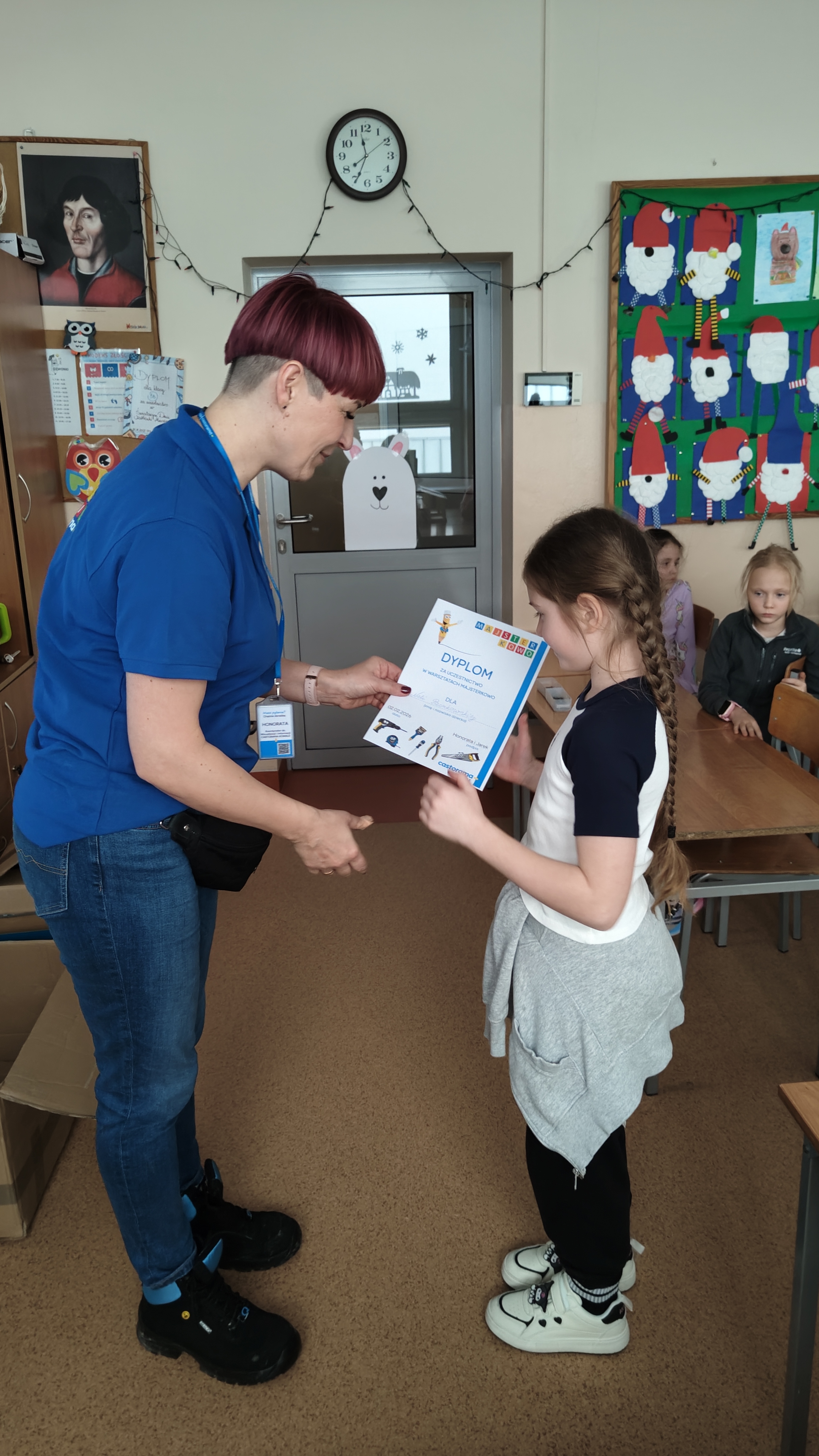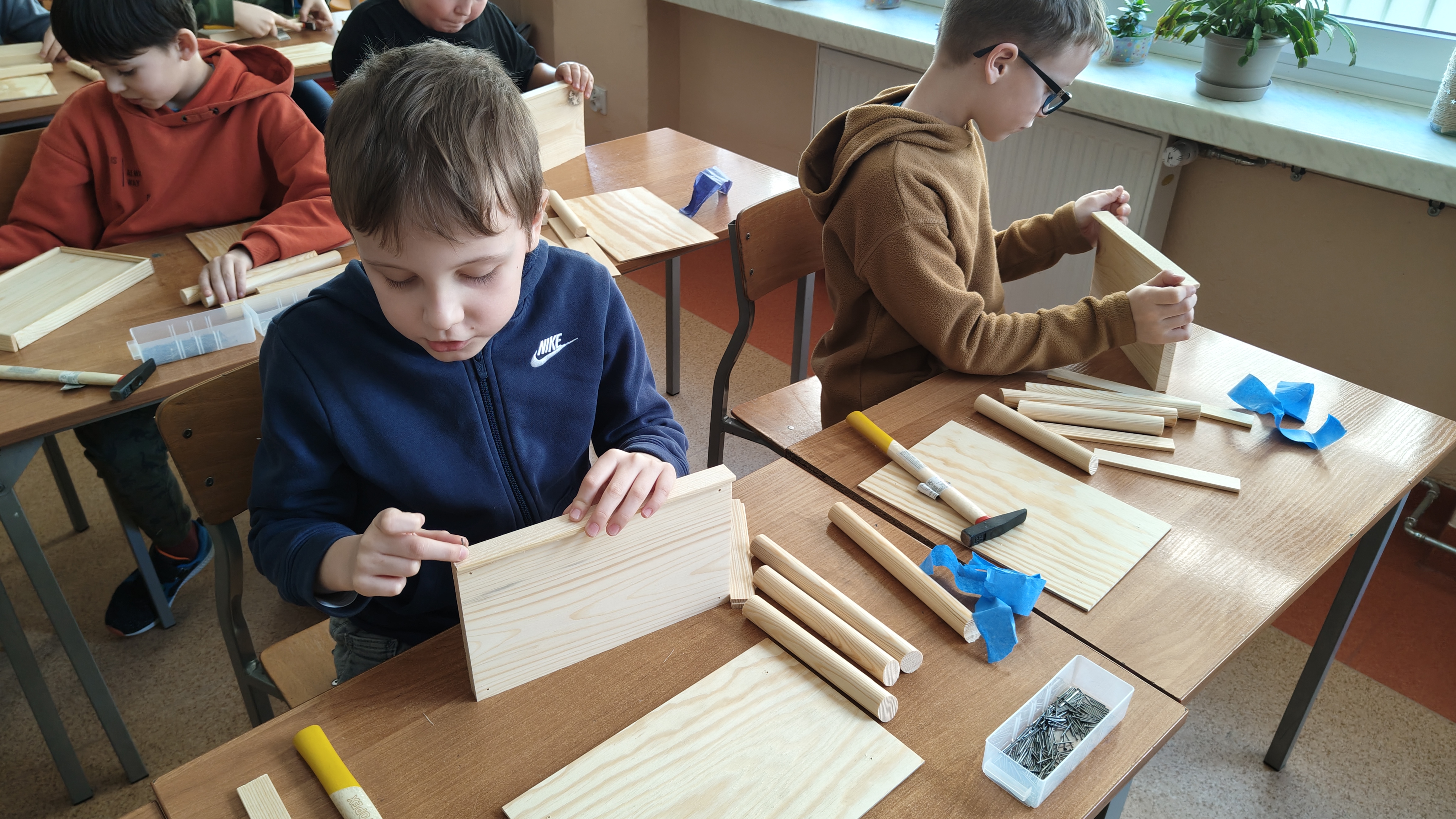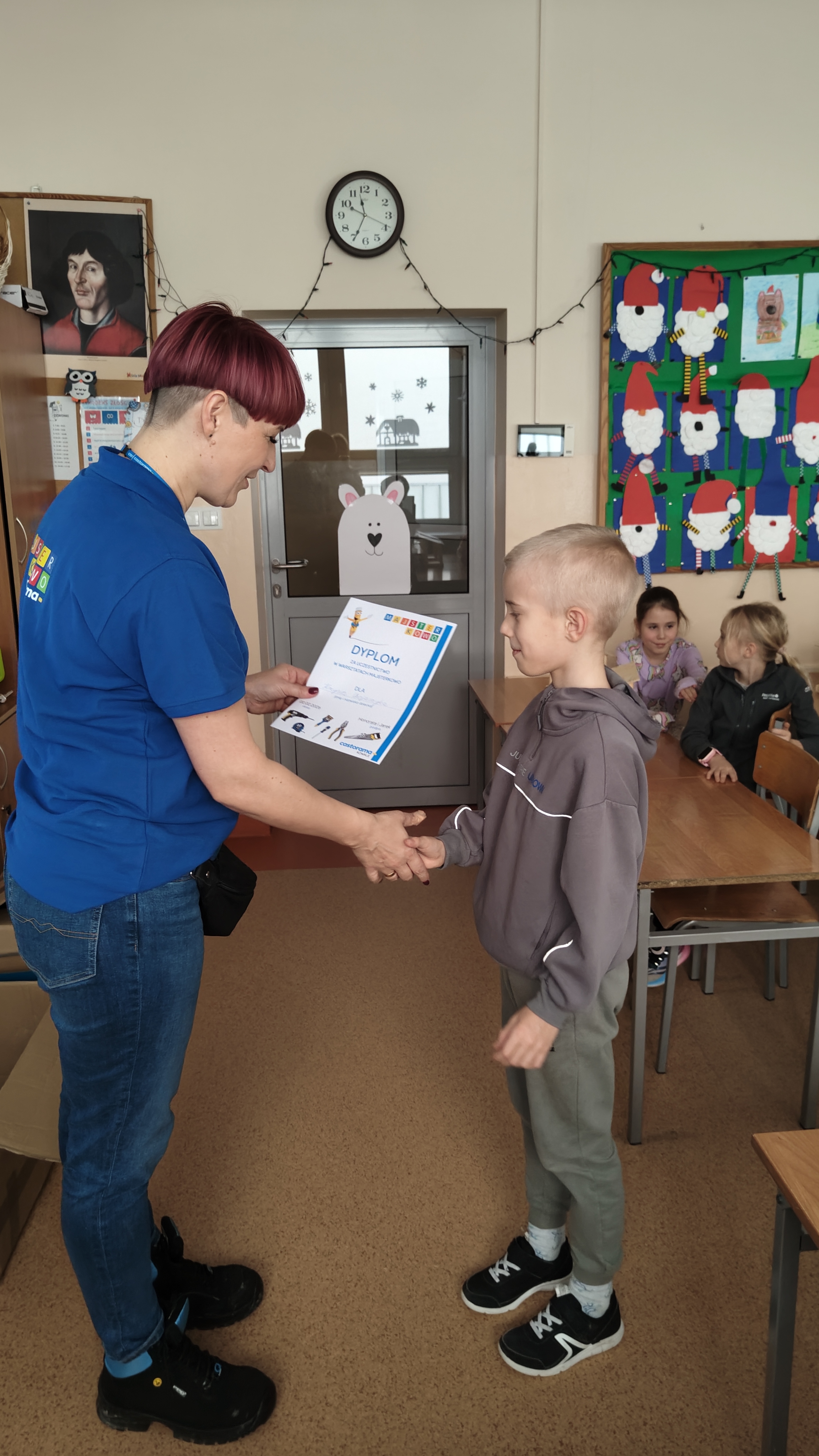 W poniedziałek 2 lutego, uczniowie klasy 2a, 2c i 3a, uczestniczyli w nietypowych warsztatach, prowadzonych przez uczennice trzeciej klasy LO w Pruszczu Gdańskim: Karolinę Witek, Oliwię Kowalik i Maję Wrona. Dziewczynki realizują projekt pod nazwą "Screen Away", którego celem jest zachęcenie dzieci do ograniczenia korzystania z telefonów komórkowych oraz odkrywania własnych pasji i aktywności pozascreenowych. Ponadto wymienione uczennice biorą udział w Ogólnopolskiej Olimpiadzie Projektów Społecznych pt. "Zwolnieni z teorii". Warsztaty miały charakter zajęć praktyczno-technicznych, na których dzieci własnoręcznie tworzyły -z użyciem prostych narzędzi- przestrzenną pracę z drewna. Aby uatrakcyjnić zajęcia, na spotkanie zaproszono przeszkolonych pracowników Castoramy, którzy przywieźli potrzebne materiały i służyli pomocą. Uczniowie z wielkim zaangażowaniem przystąpili do pracy, za którą otrzymali pamiątkowe dyplomy. Gotowe konstrukcje zabrali ze sobą do domu -tylko od ich wyobraźni zależy, jak będą one wykorzystane (karmnik dla ptaków, domek dla lalek czy też jako półka). To były z pewnością ciekawe i pożyteczne warsztaty!