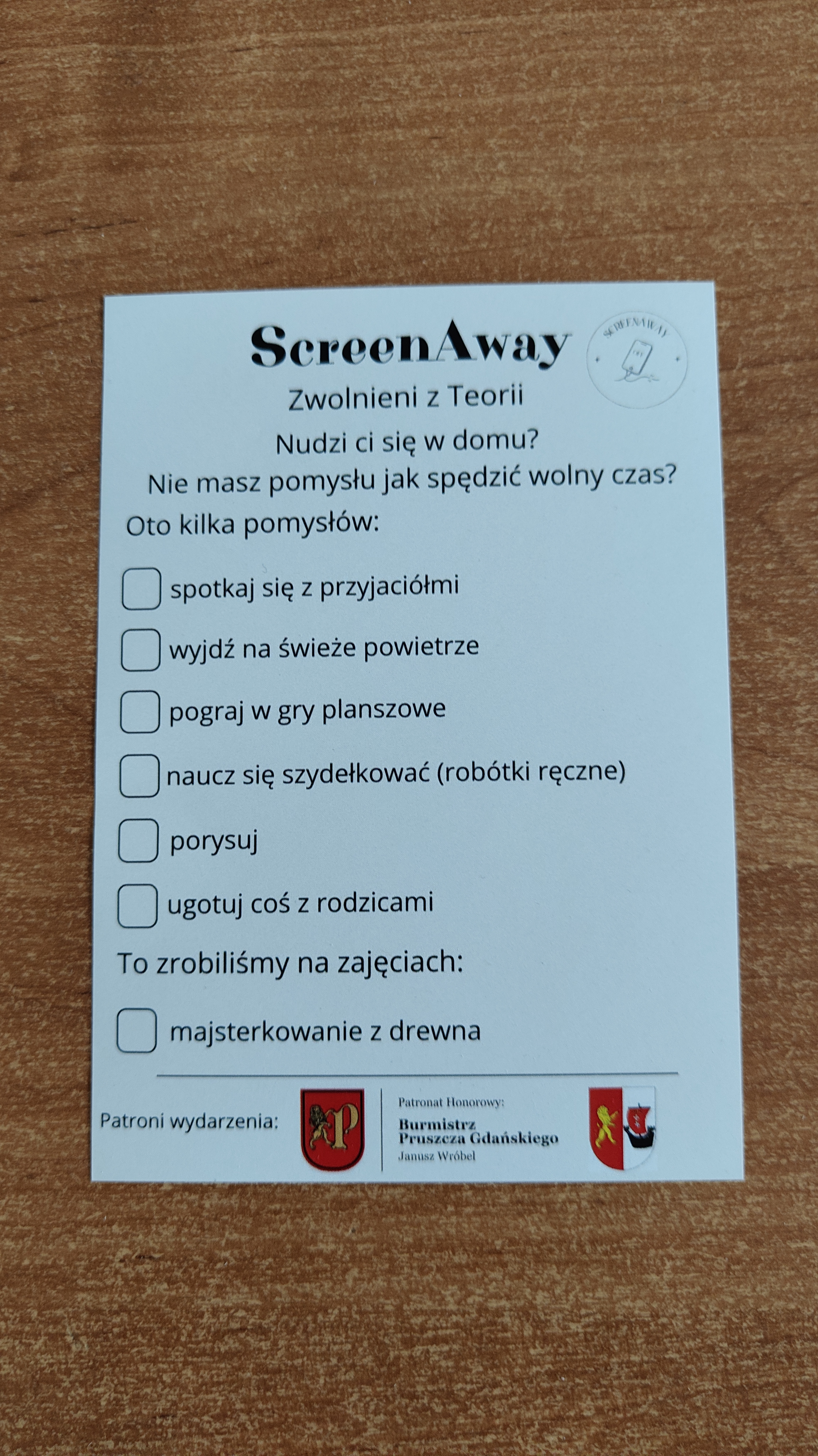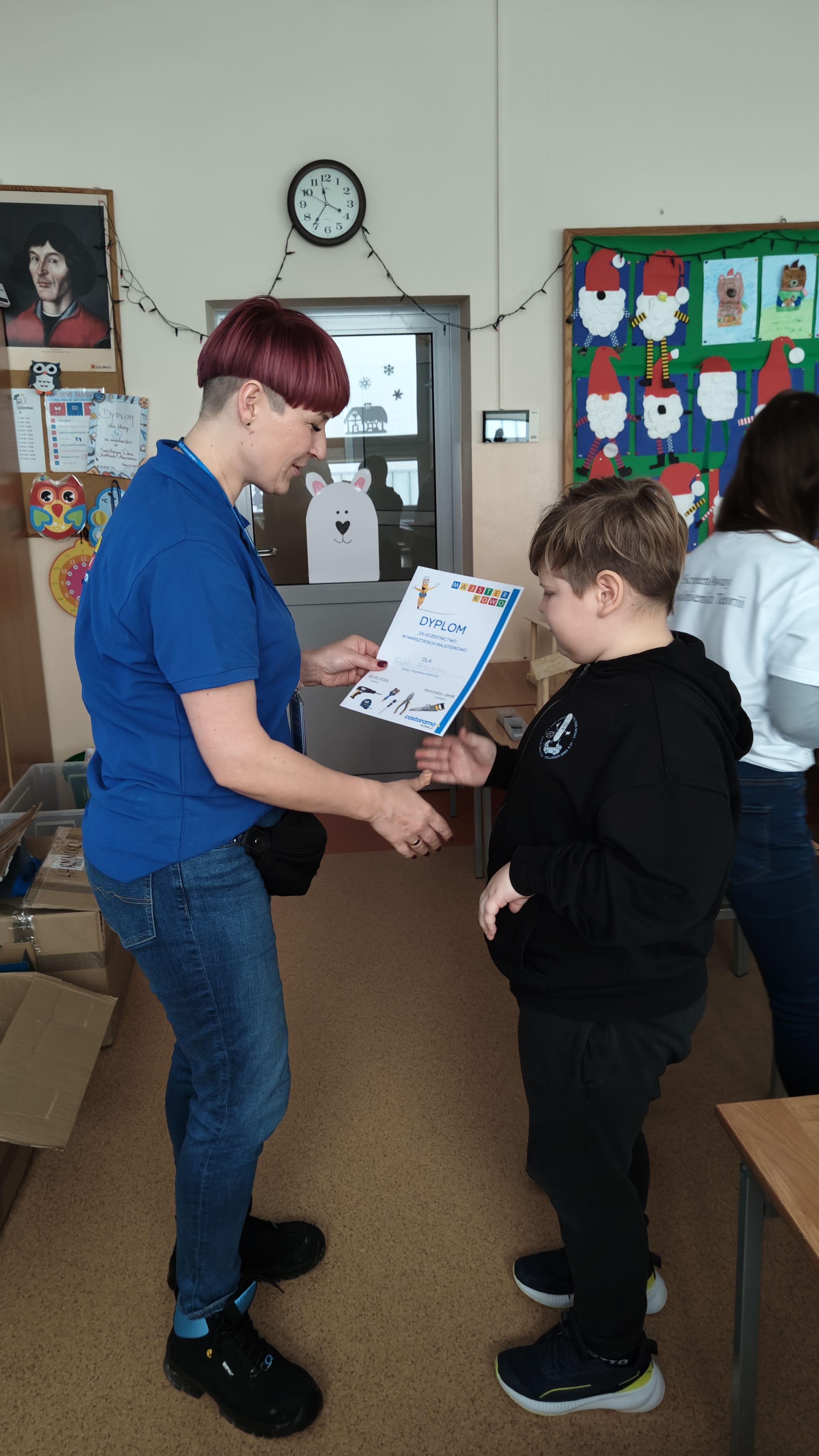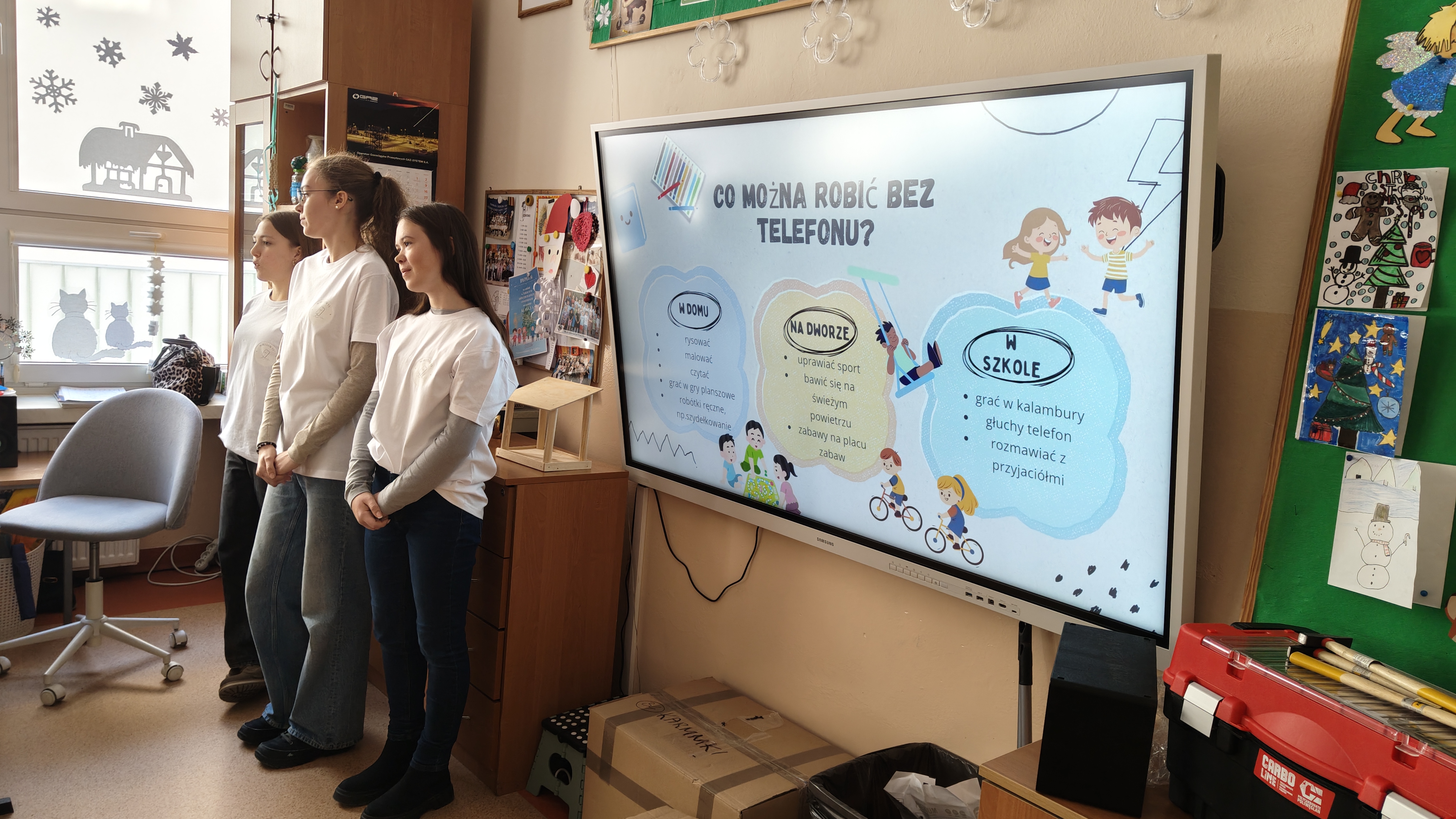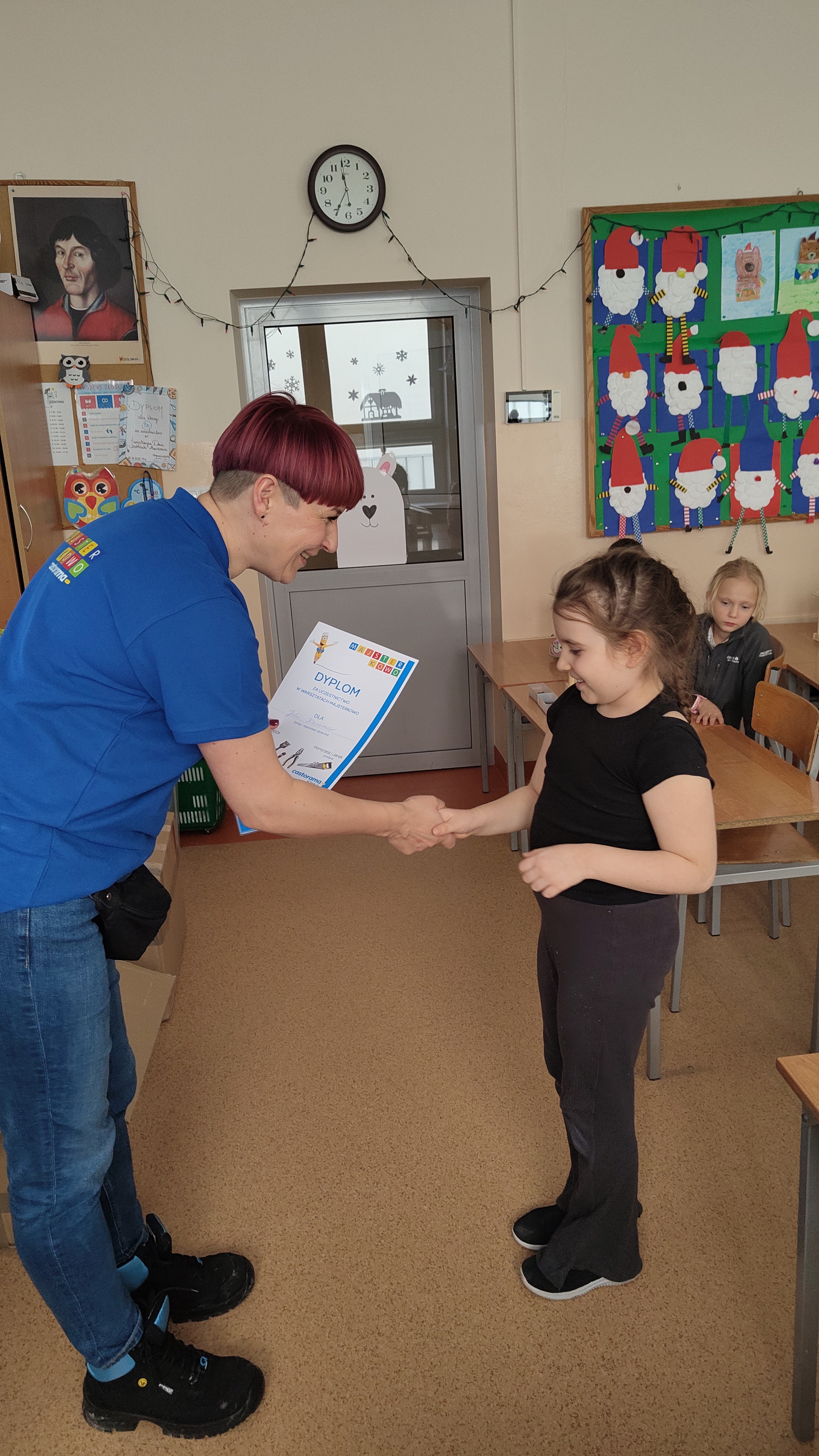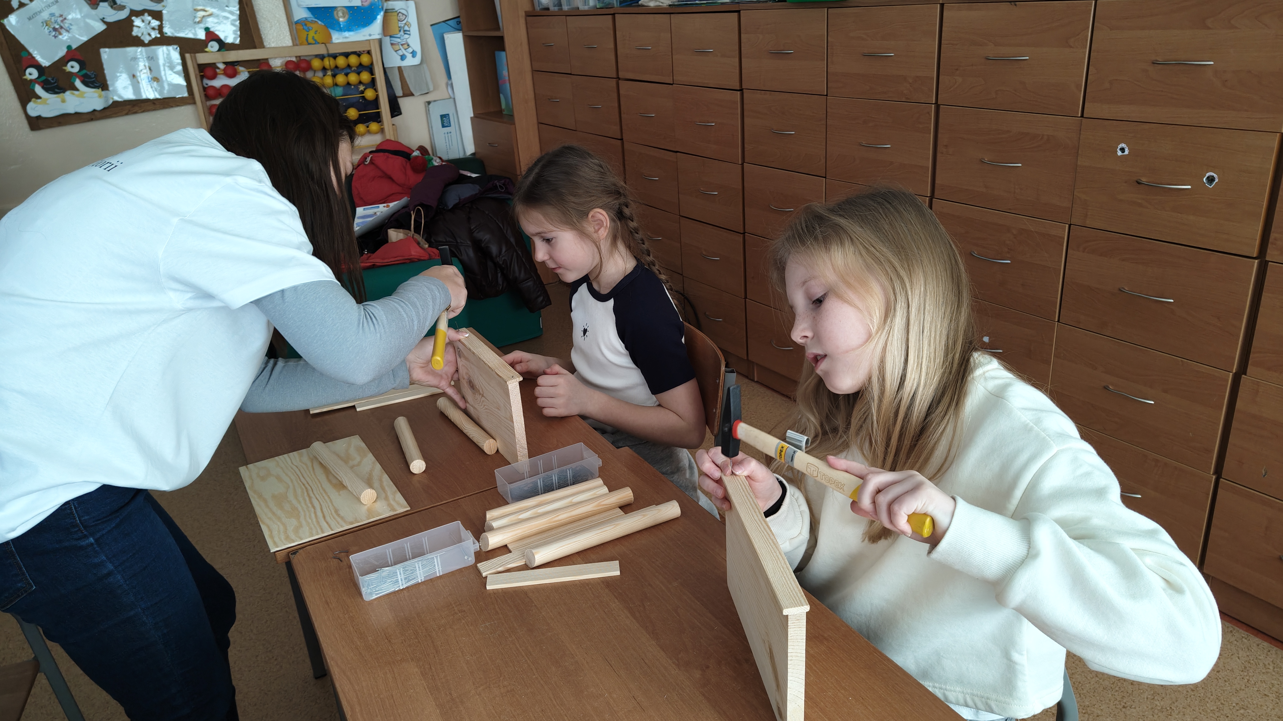 W poniedziałek 2 lutego, uczniowie klasy 2a, 2c i 3a, uczestniczyli w nietypowych warsztatach, prowadzonych przez uczennice trzeciej klasy LO w Pruszczu Gdańskim: Karolinę Witek, Oliwię Kowalik i Maję Wrona. Dziewczynki realizują projekt pod nazwą "Screen Away", którego celem jest zachęcenie dzieci do ograniczenia korzystania z telefonów komórkowych oraz odkrywania własnych pasji i aktywności pozascreenowych. Ponadto wymienione uczennice biorą udział w Ogólnopolskiej Olimpiadzie Projektów Społecznych pt. "Zwolnieni z teorii". Warsztaty miały charakter zajęć praktyczno-technicznych, na których dzieci własnoręcznie tworzyły -z użyciem prostych narzędzi- przestrzenną pracę z drewna. Aby uatrakcyjnić zajęcia, na spotkanie zaproszono przeszkolonych pracowników Castoramy, którzy przywieźli potrzebne materiały i służyli pomocą. Uczniowie z wielkim zaangażowaniem przystąpili do pracy, za którą otrzymali pamiątkowe dyplomy. Gotowe konstrukcje zabrali ze sobą do domu -tylko od ich wyobraźni zależy, jak będą one wykorzystane (karmnik dla ptaków, domek dla lalek czy też jako półka). To były z pewnością ciekawe i pożyteczne warsztaty!