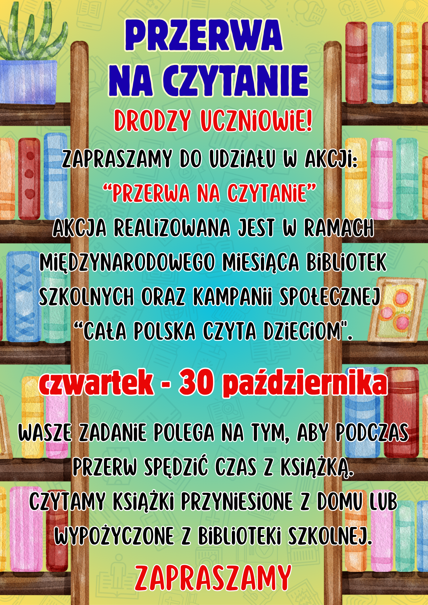 Już w najbliższy czwartek, 30 października, zapraszamy Was do udziału w szkolnej akcji „PRZERWA NA CZYTANIE”. To doskonała okazja, aby na chwilę oderwać się od codziennych obowiązków, zanurzyć w świecie książek i pokazać, że czytanie może być przyjemne i ciekawe.