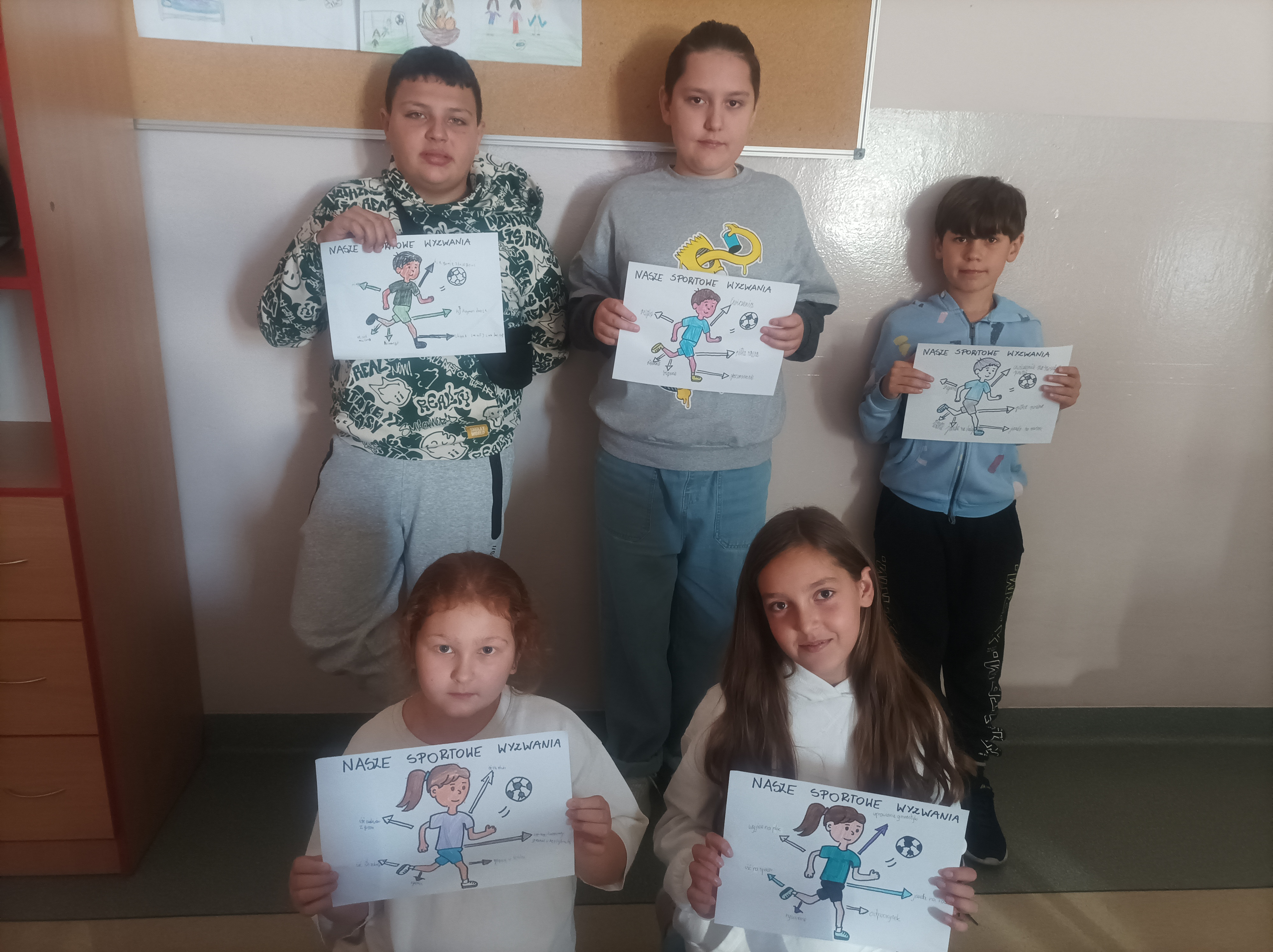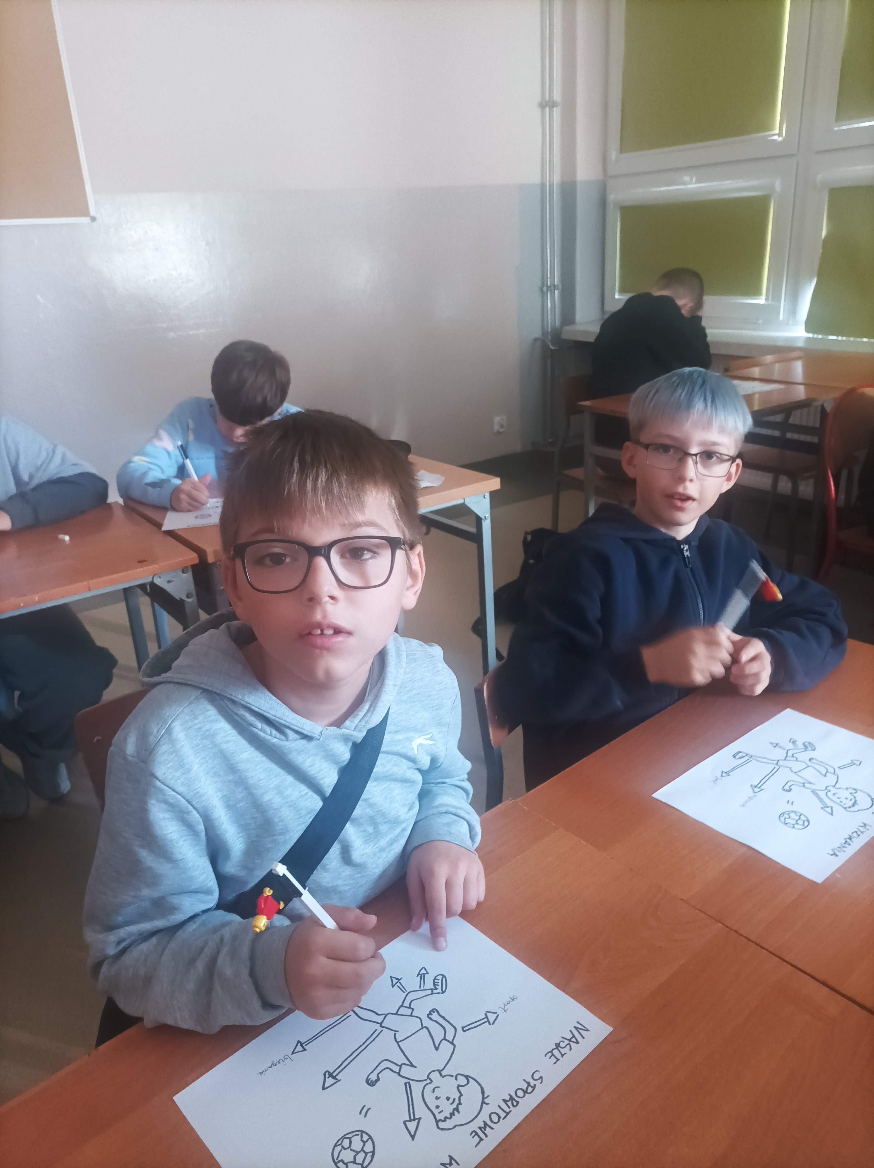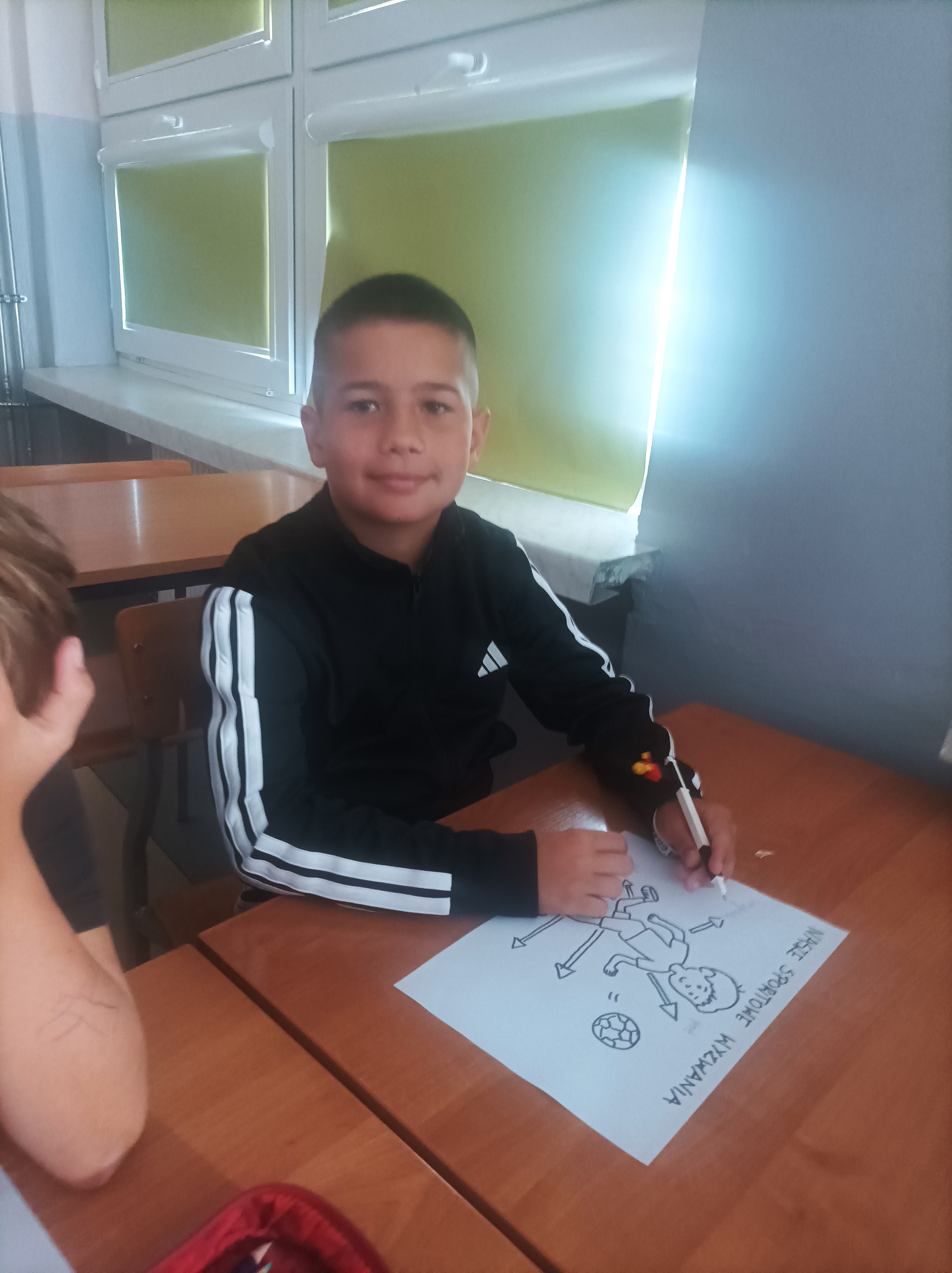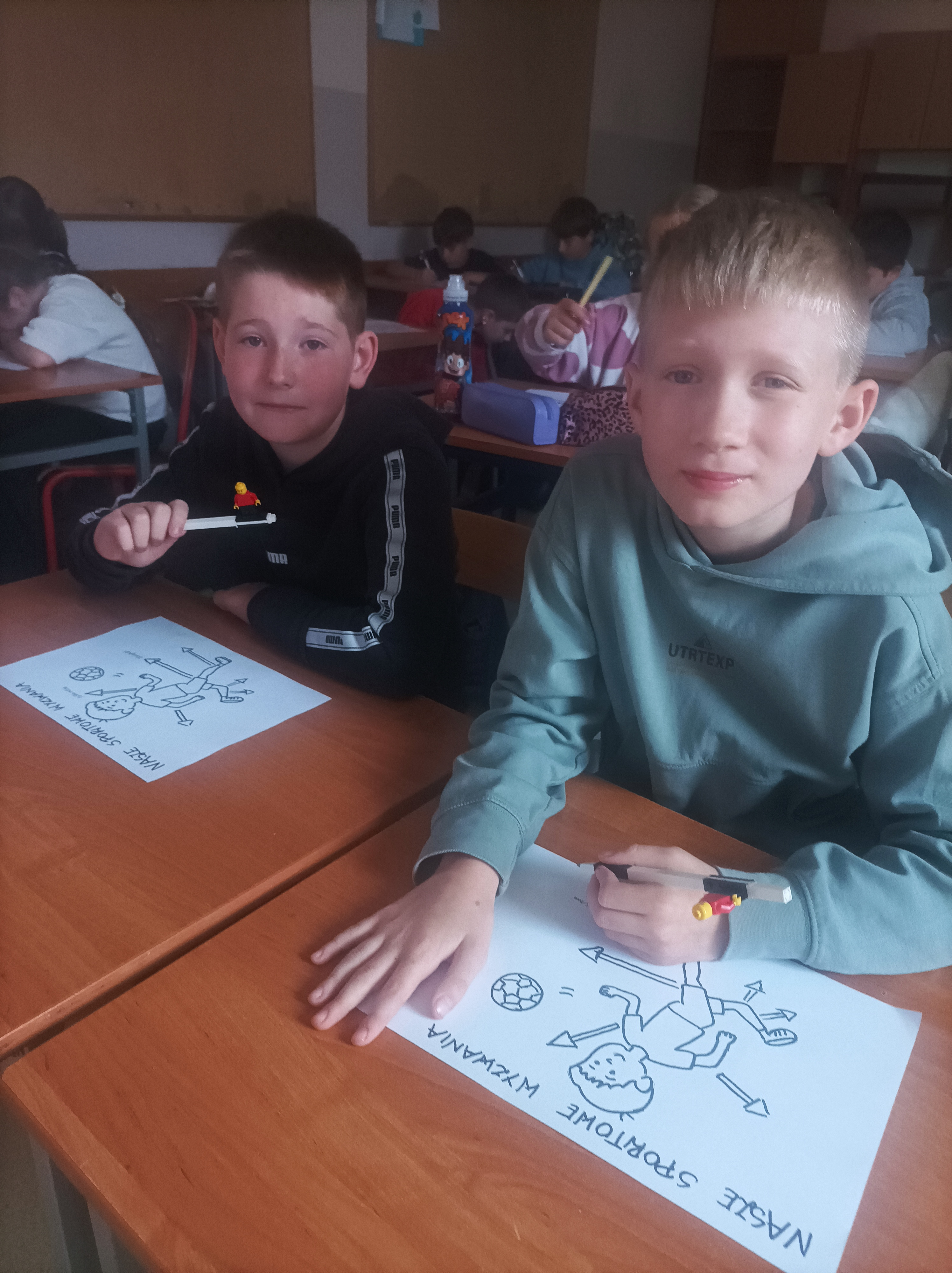 Uczniowie wymieniali swoje ulubione formy ruchu- jazdę na rowerze, spacery, pływanie, taniec, gry zespołowe oraz zabawy na świeżym powietrzu. Następnie każdy z uczniów wykonywał plakat „ Nasze sportowe wyzwania”, na którym zapisywał pomysły na aktywne spędzanie czasu wolnego.