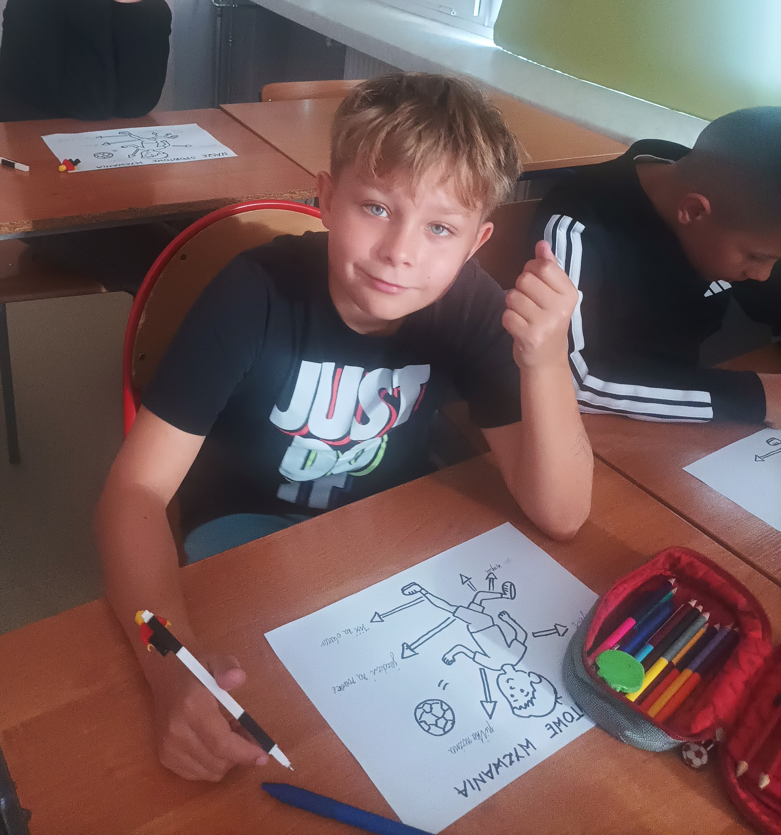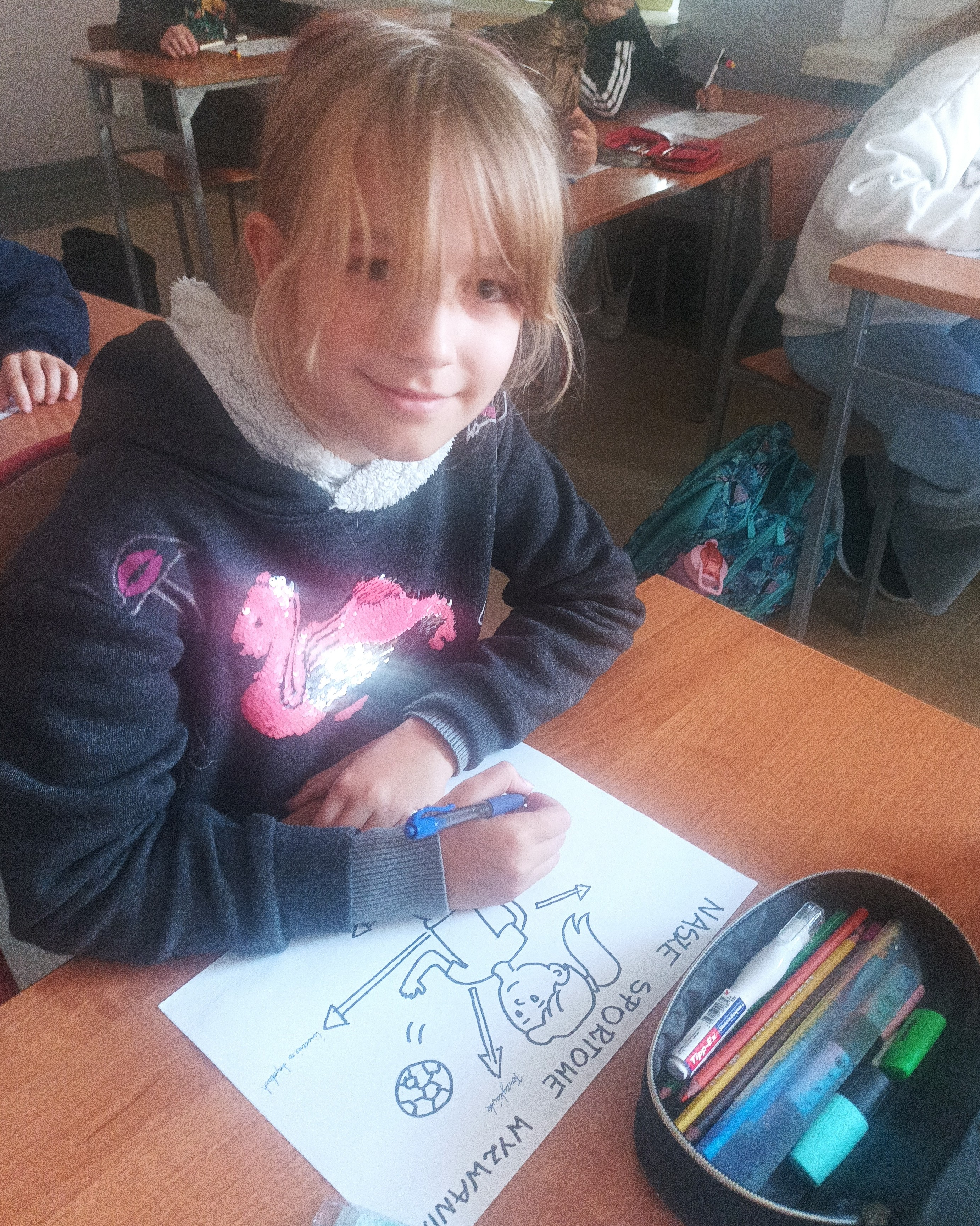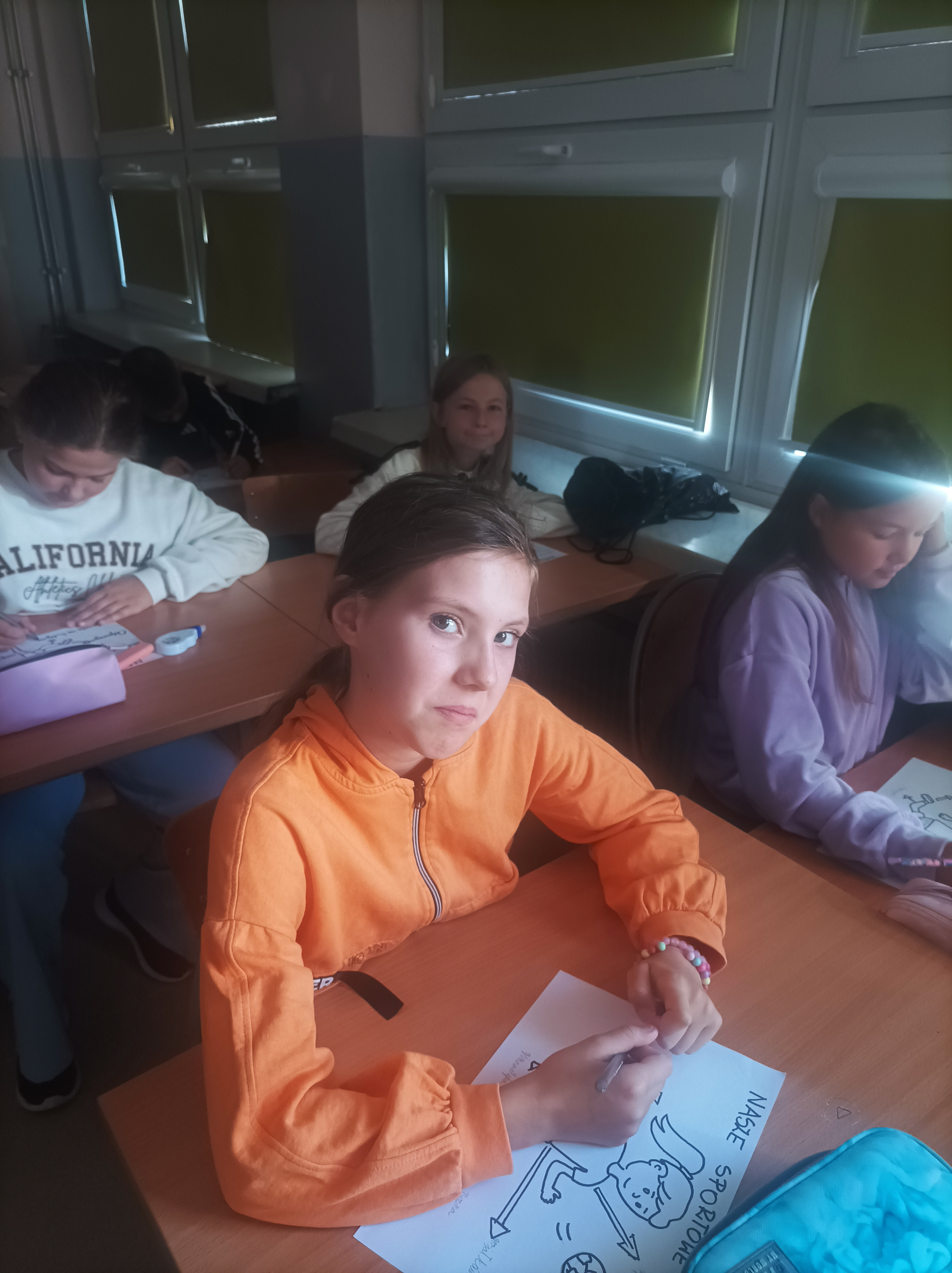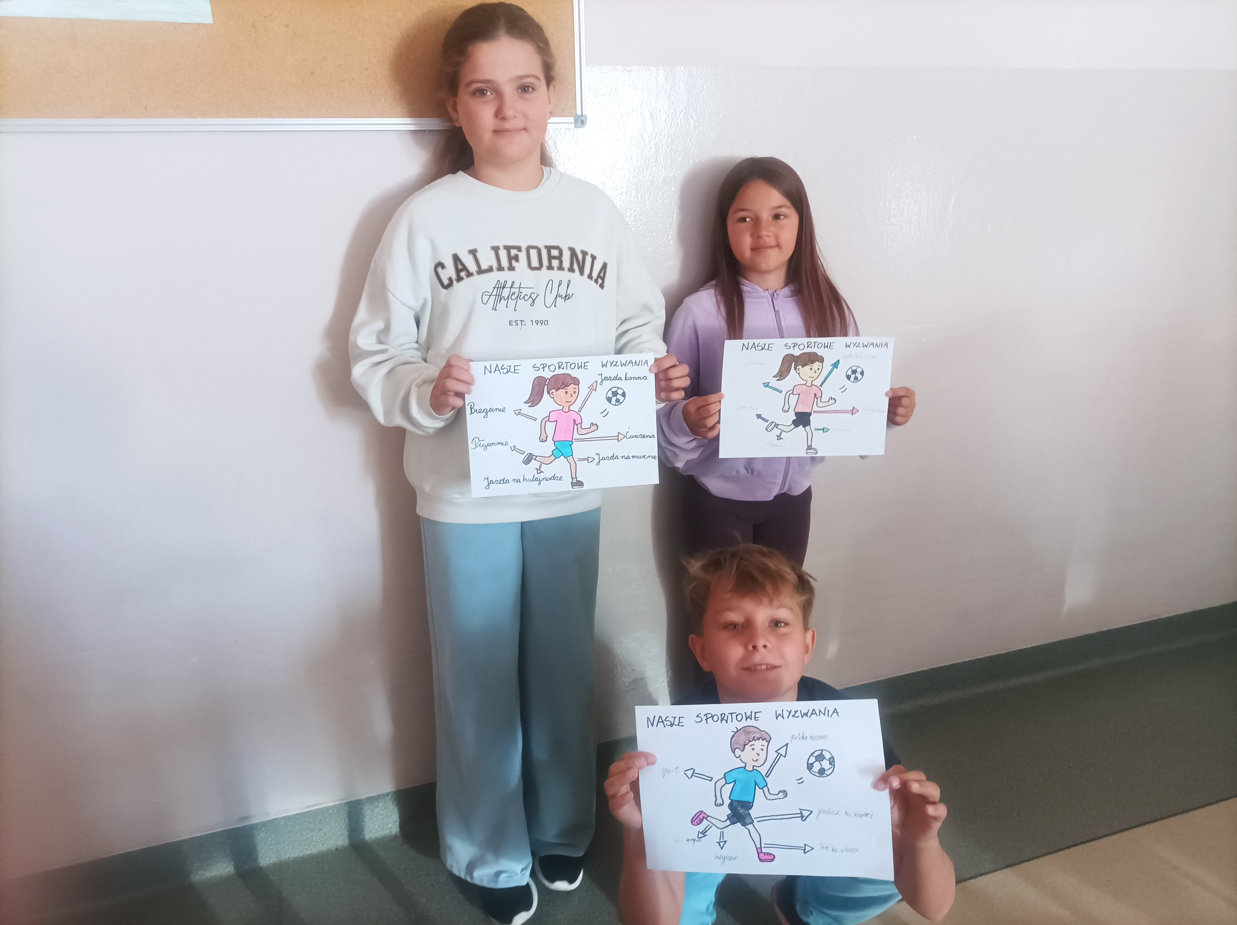Uczniowie wymieniali swoje ulubione formy ruchu- jazdę na rowerze, spacery, pływanie, taniec, gry zespołowe oraz zabawy na świeżym powietrzu. Następnie każdy z uczniów wykonywał plakat „ Nasze sportowe wyzwania”, na którym zapisywał pomysły na aktywne spędzanie czasu wolnego.