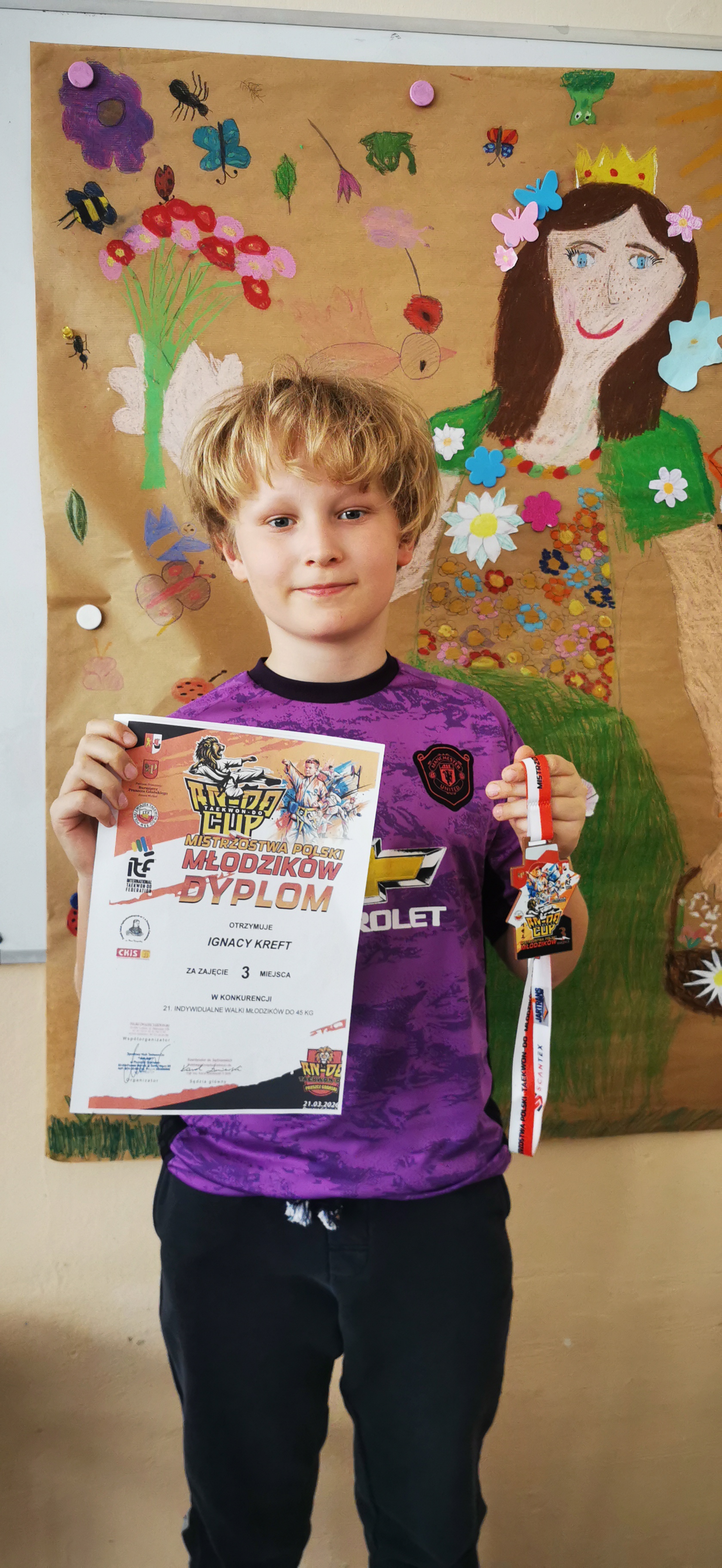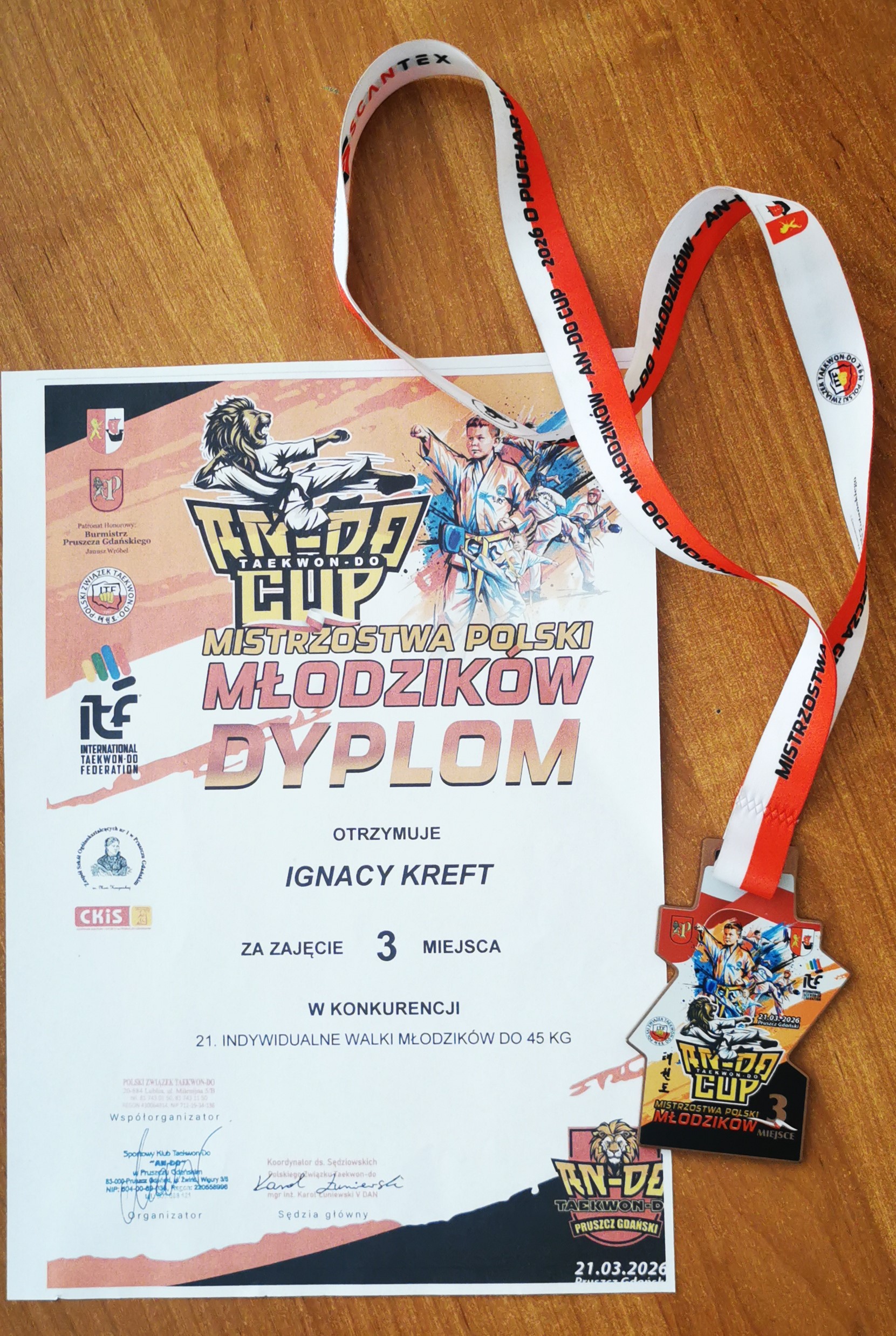 Ignacy Kreft, uczeń klasy 3c, odniósł znaczący sukces sportowy podczas sportowych zawodów Taekwon-do An-Do Cup – Mistrzostw Polski Młodzików. W rywalizacji, która odbyła się 21 marca 2026 roku w Pruszczu Gdańskim, zaprezentował wysoki poziom umiejętności, determinację oraz doskonałe przygotowanie fizyczne i mentalne.