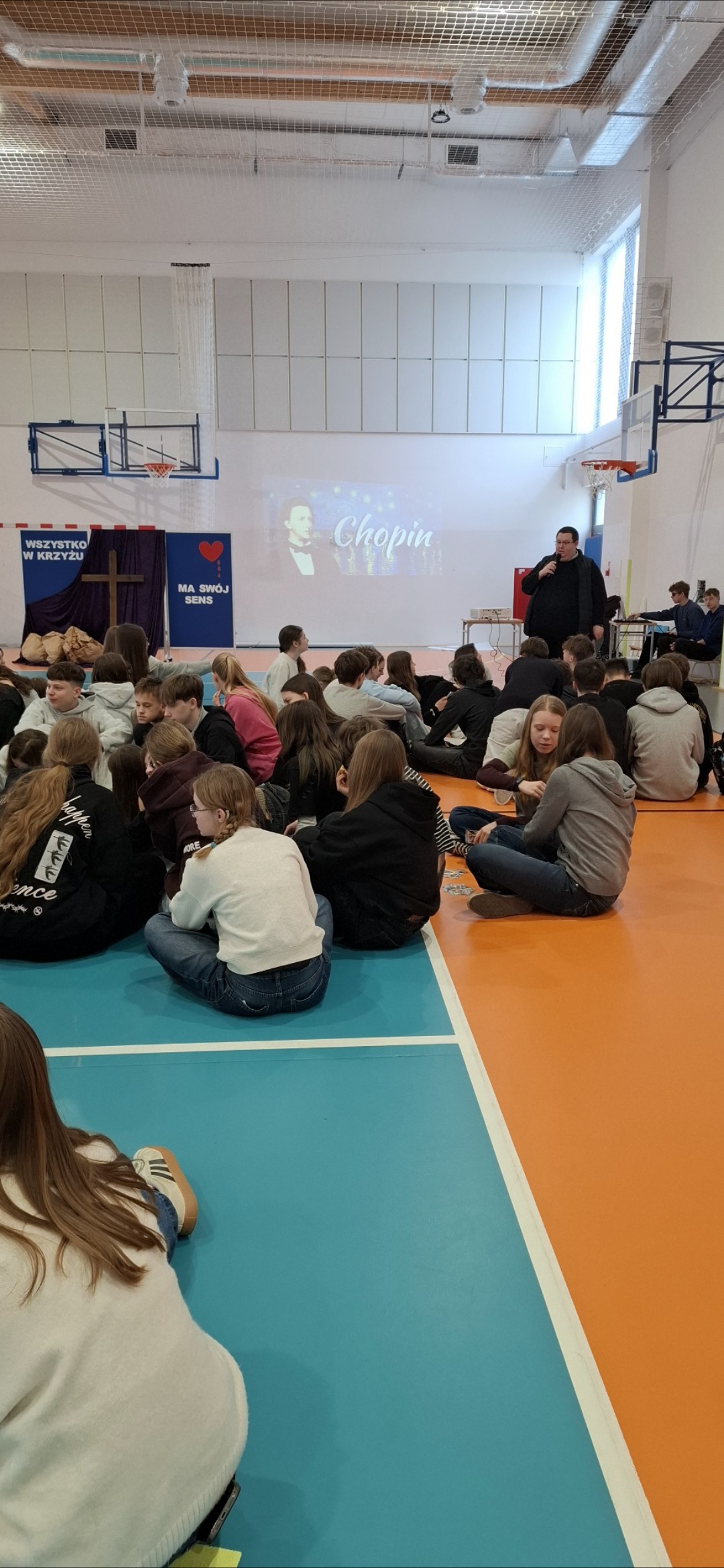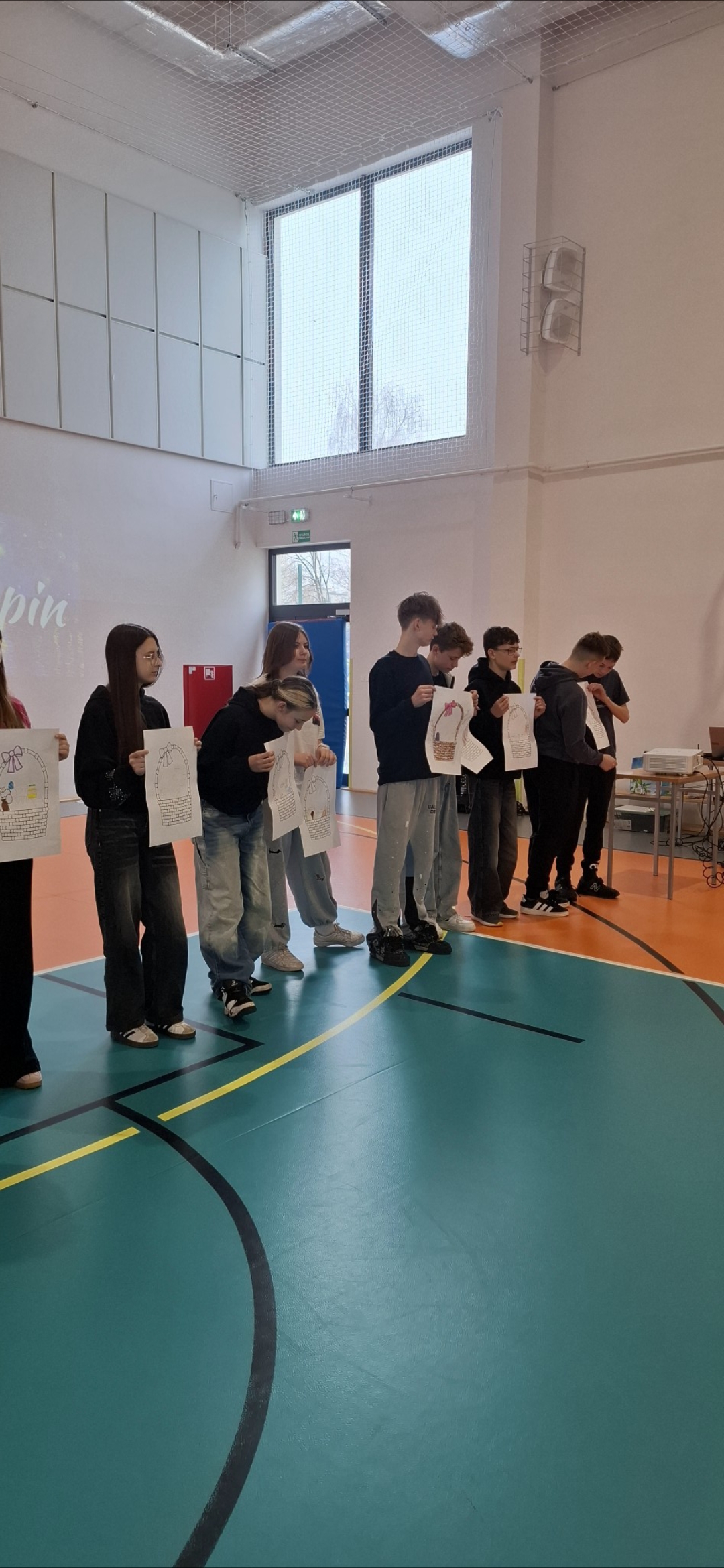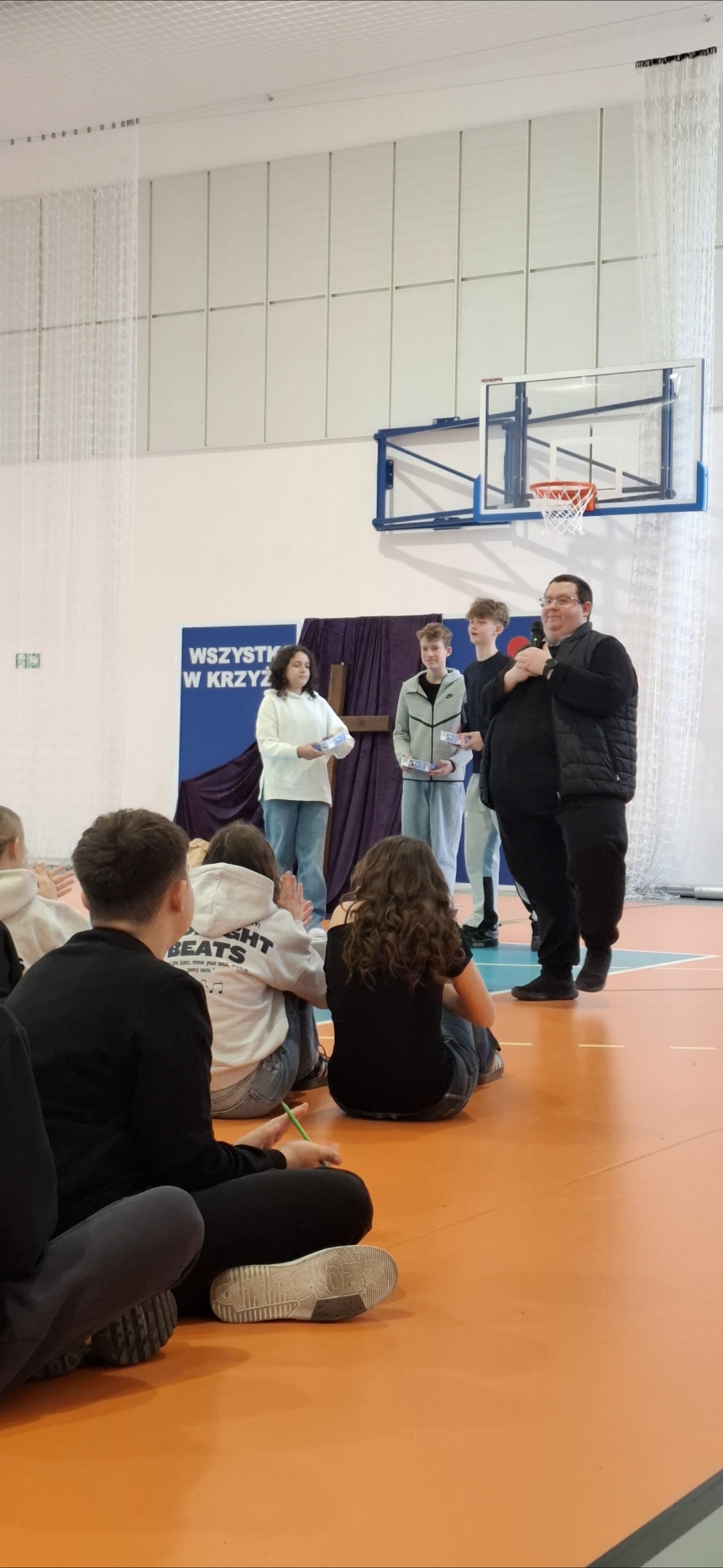 Spotkanie rozpoczęliśmy od wymownego symbolu pustego koszyka. Następnie tradycja spotkała się z technologią – uczniowie zmierzyli się w emocjonującym quizie Kahoot!, sprawdzając swoją wiedzę o nabożeństwach wielkopostnych.