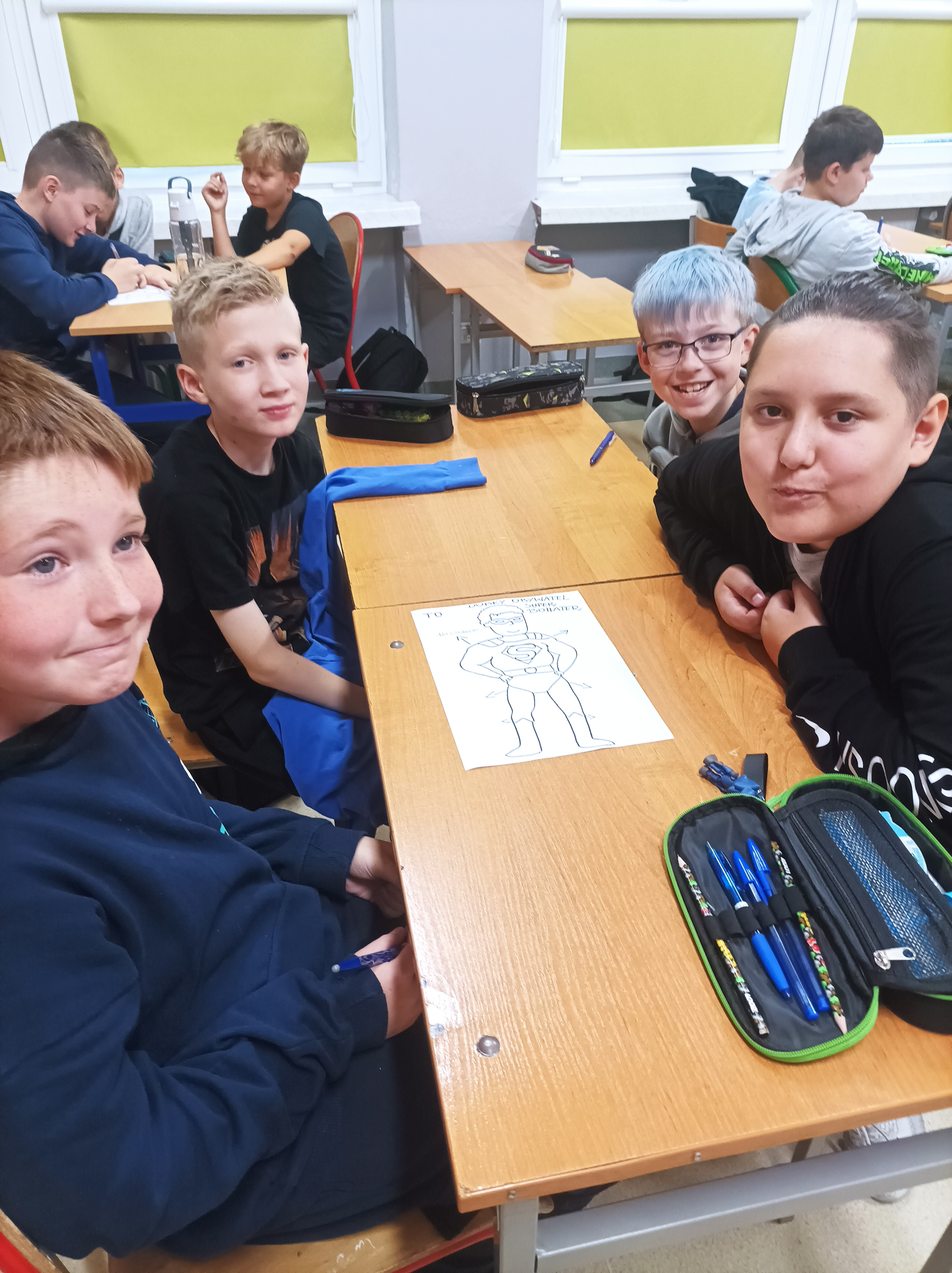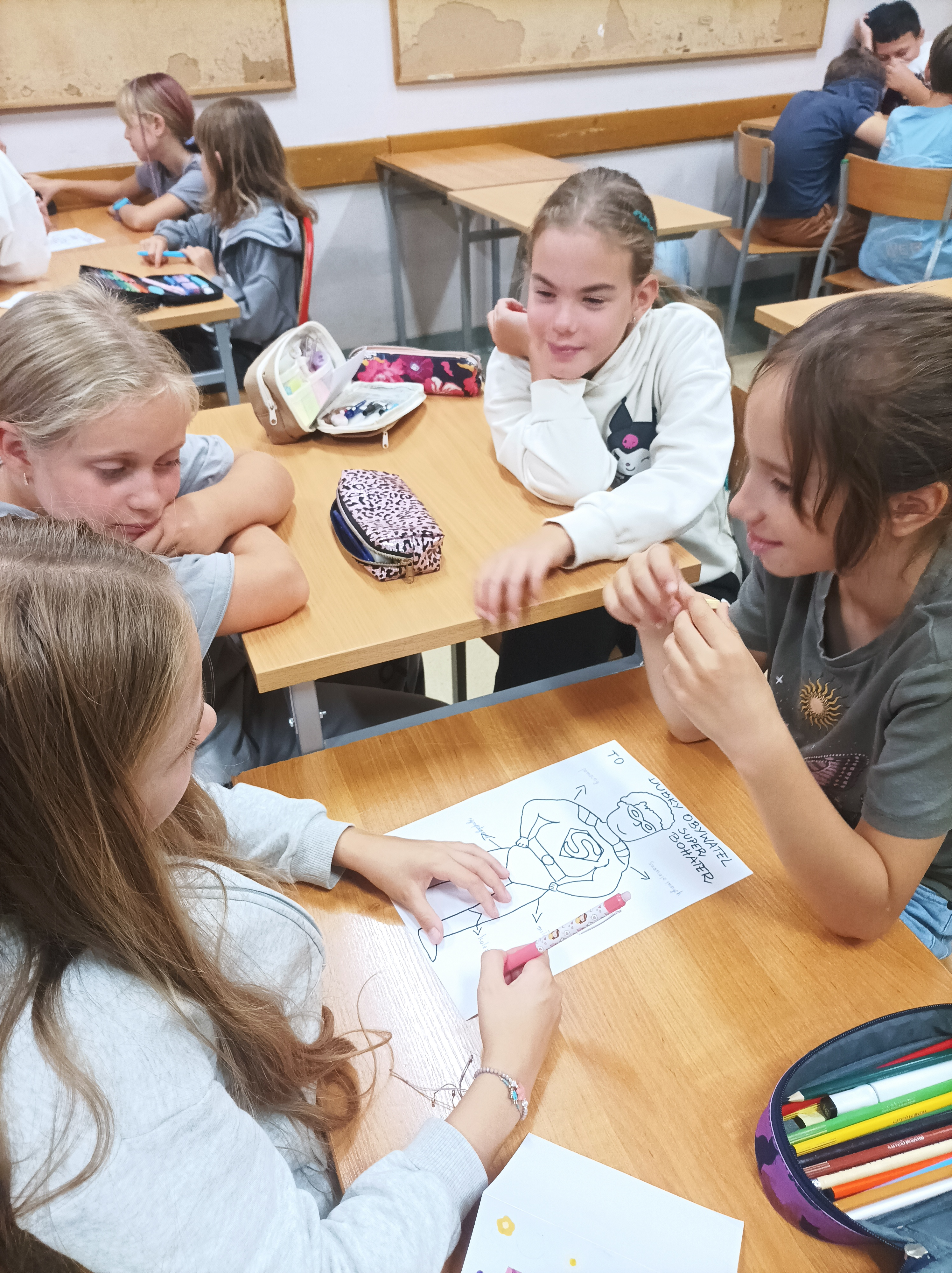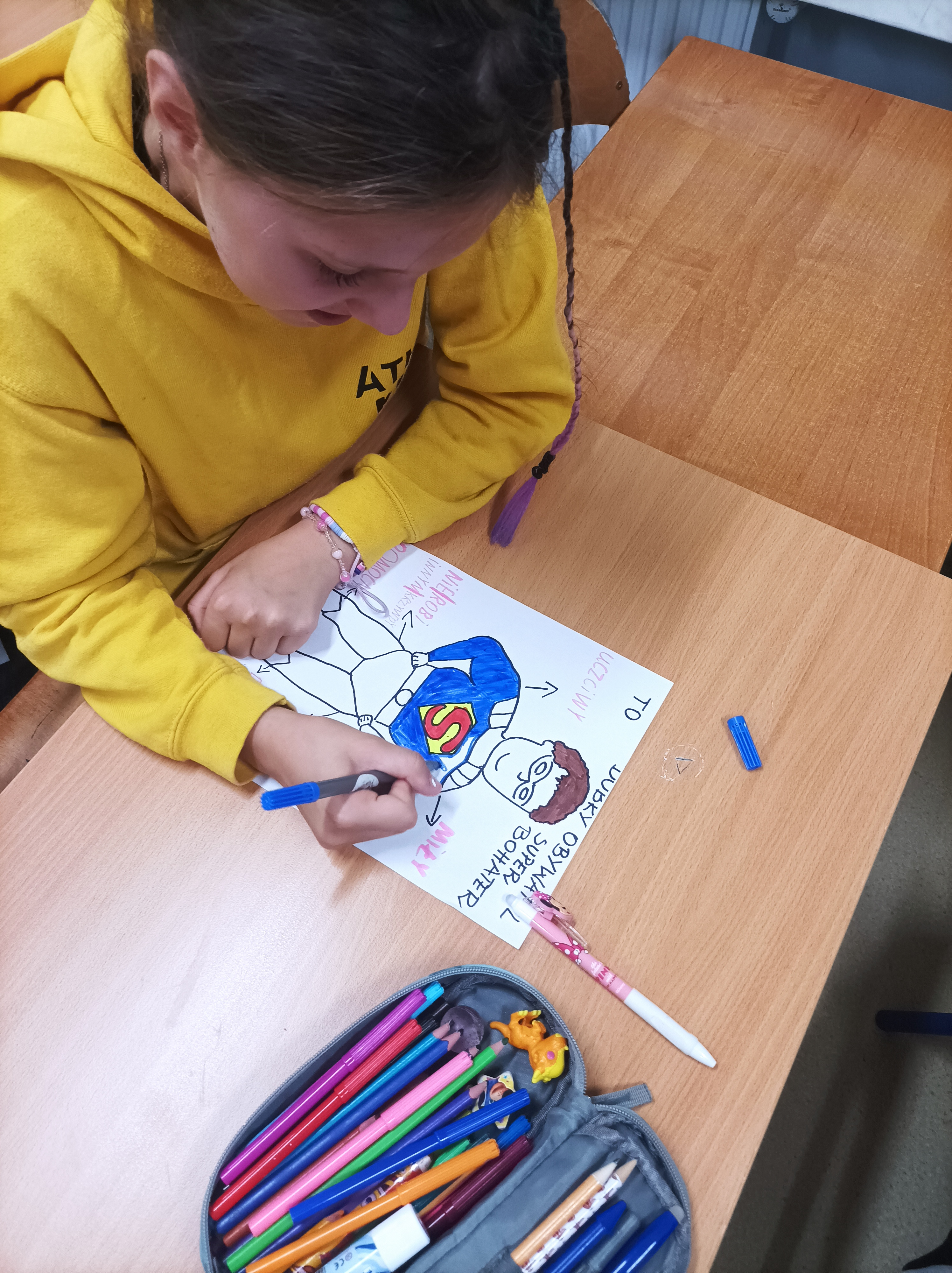 Uczniowie w grupach tworzyli plakaty z cechami super bohaterów, którzy pomagają w codziennych sytuacjach- w szkole, w domu i na ulicy.