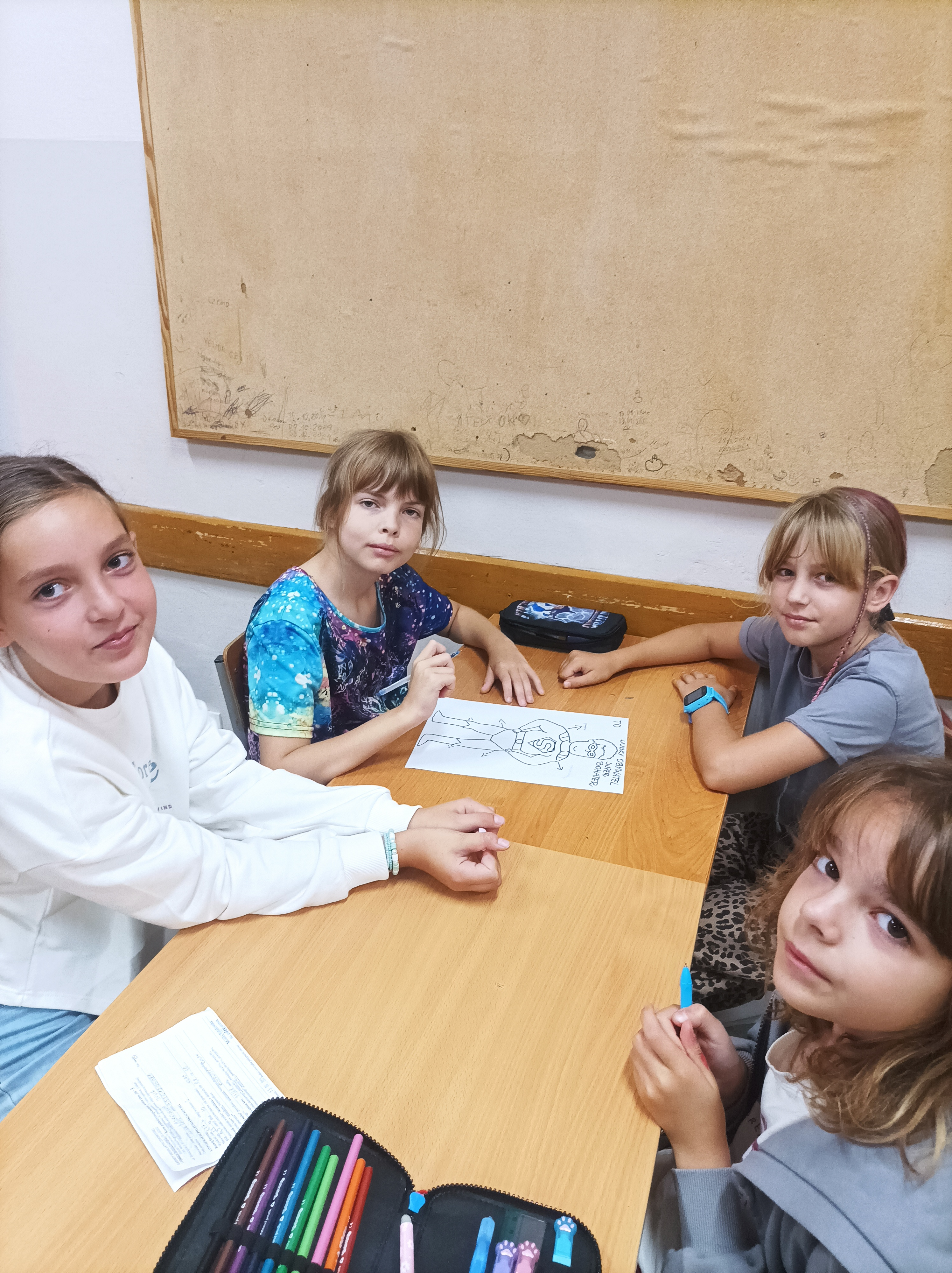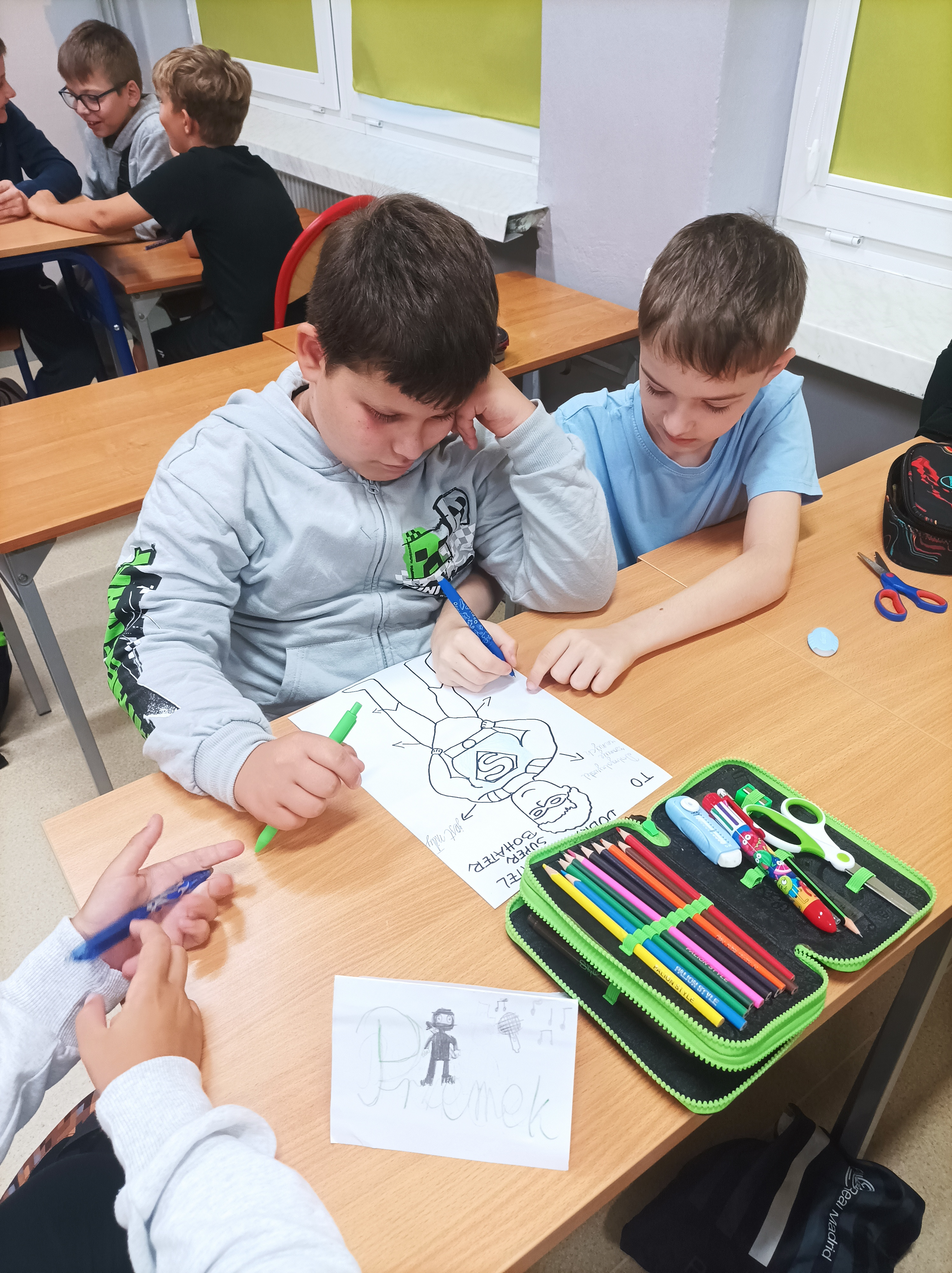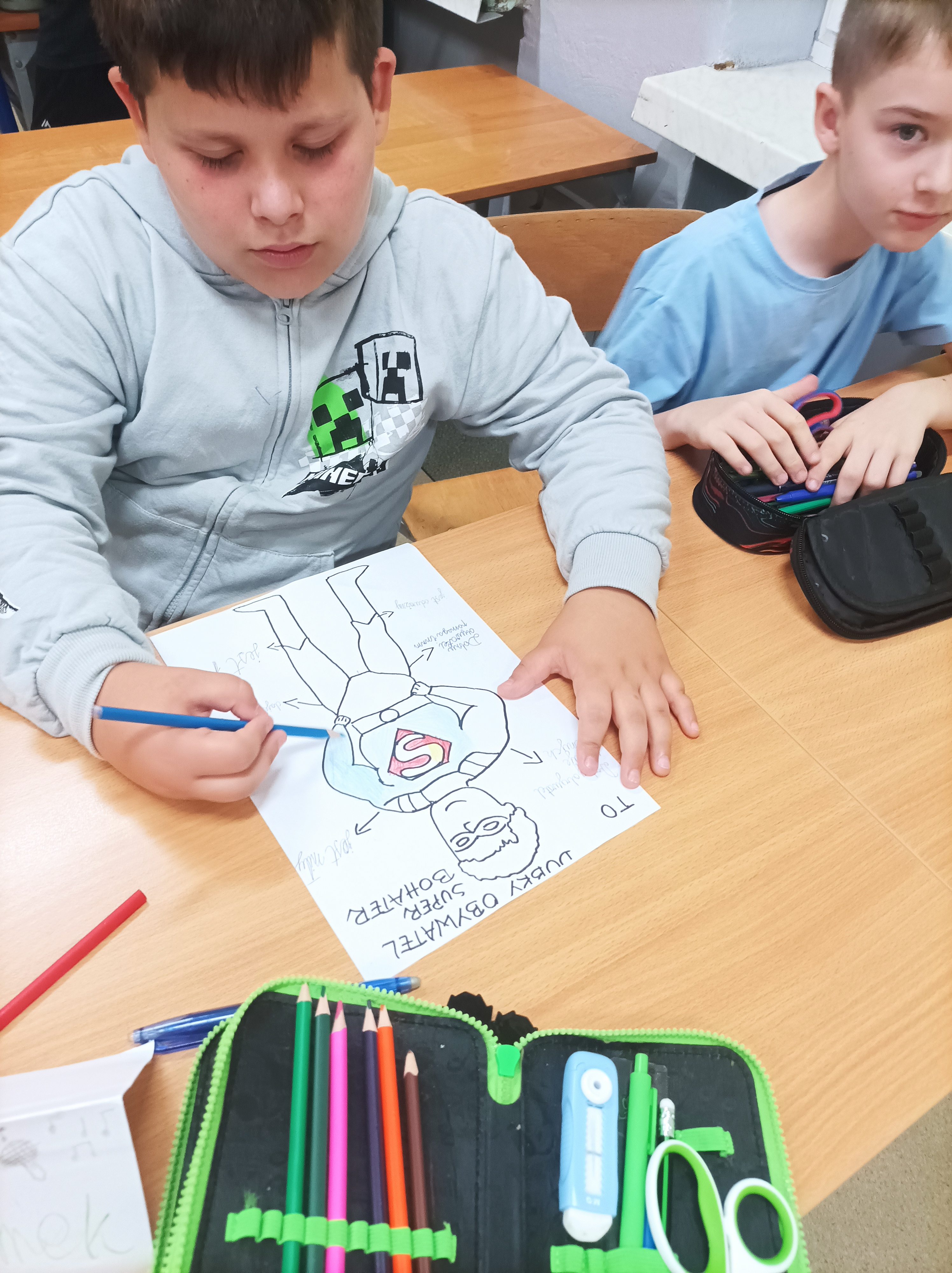 Uczniowie w grupach tworzyli plakaty z cechami super bohaterów, którzy pomagają w codziennych sytuacjach- w szkole, w domu i na ulicy.