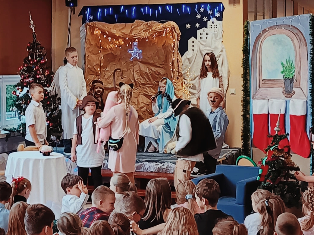 17 grudnia uczniowie klasy 3b zaprezentowali swoim rodzicom i bliskim wzruszające przedstawienie jasełkowe pt. „Polska Stajenka”. Mali aktorzy z ogromnym zaangażowaniem wcielili się w swoje role, a wspólne kolędowanie wprowadziło wszystkich w atmosferę radości i oczekiwania na święta.