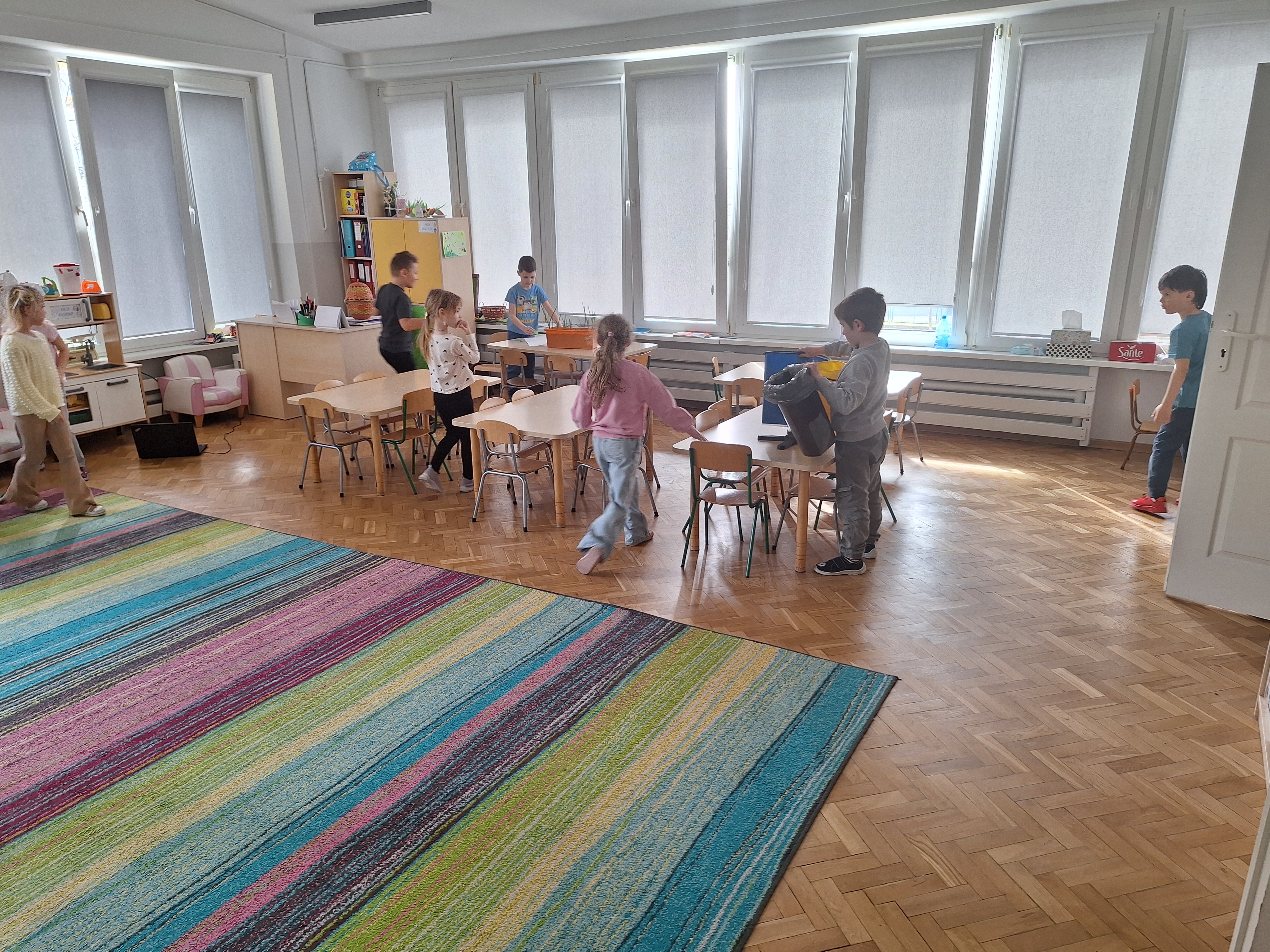 Po powrocie do sali czekała na nas niespodzianka – zastaliśmy straszny bałagan! Szybko okazało się, że to sprawka Zajączka Wielkanocnego, który postanowił zrobić nam żart prima aprilisowy.