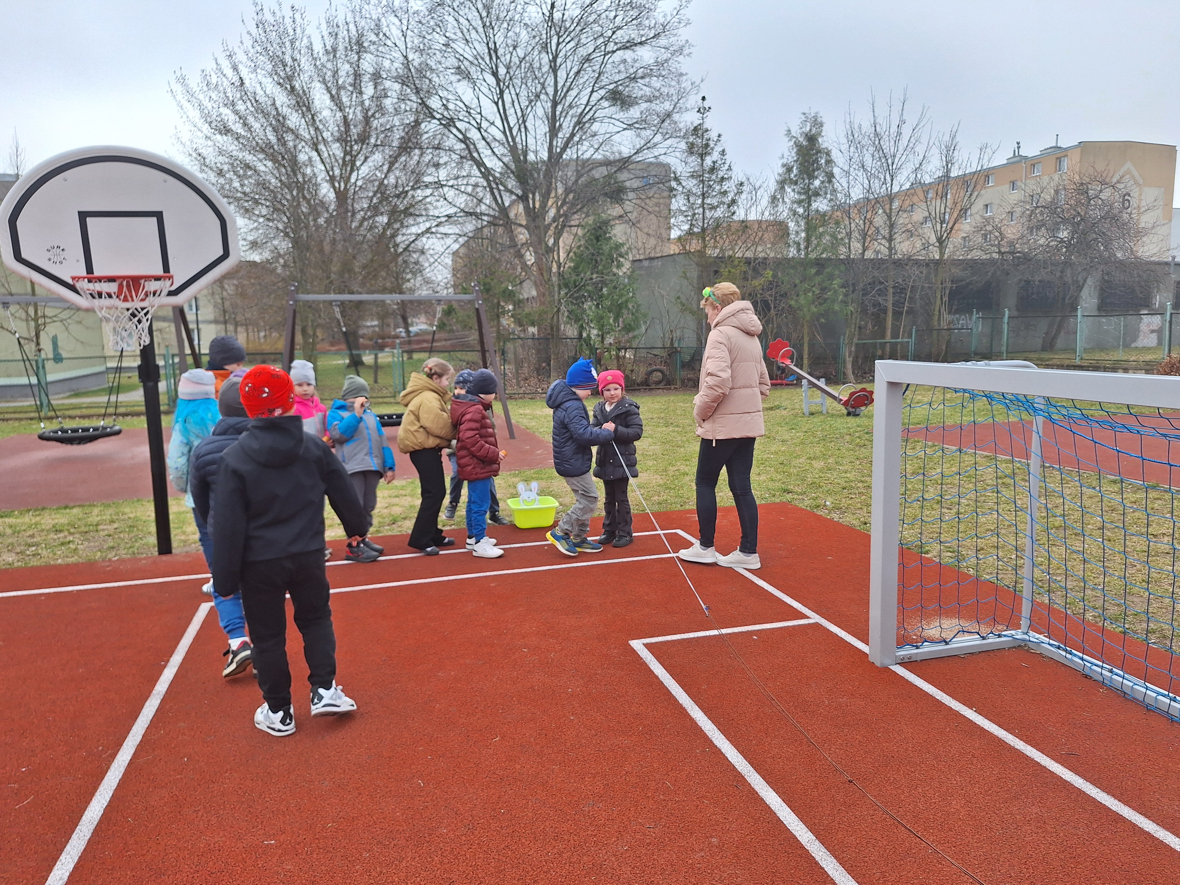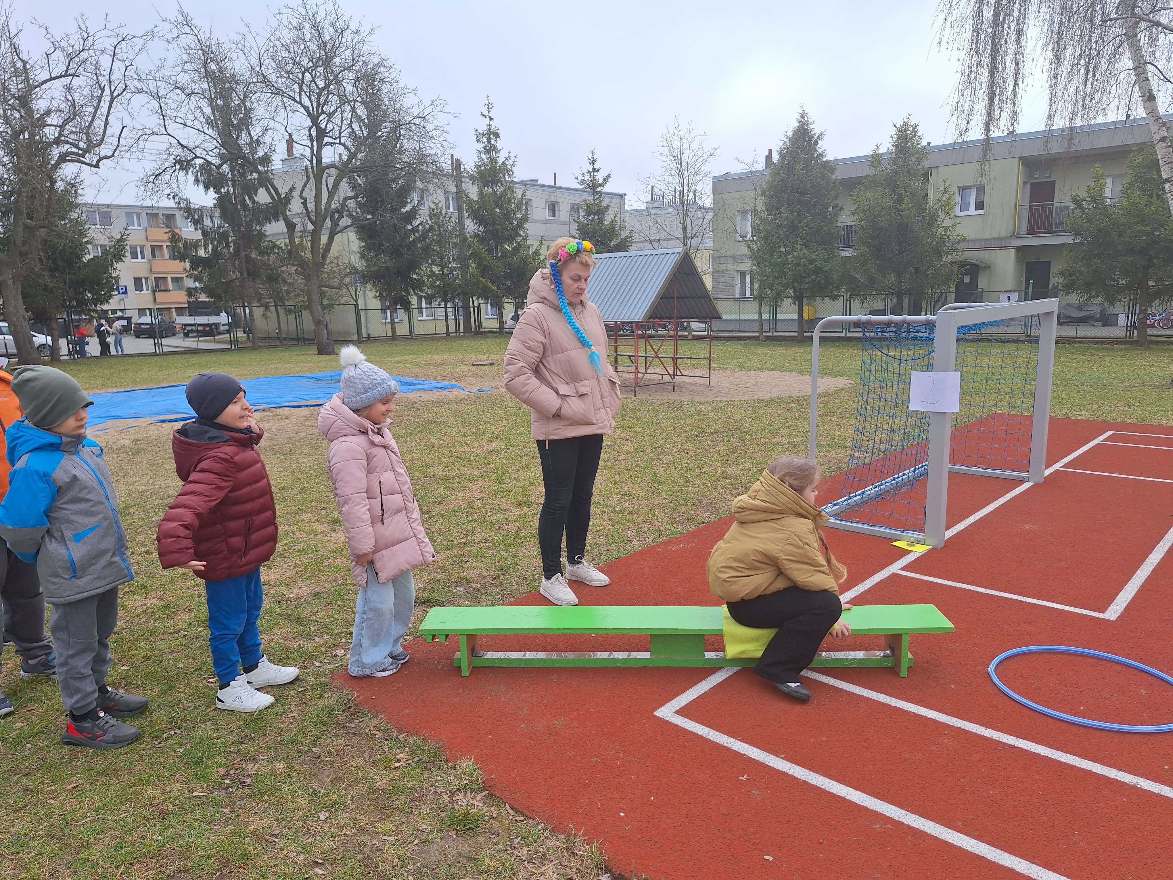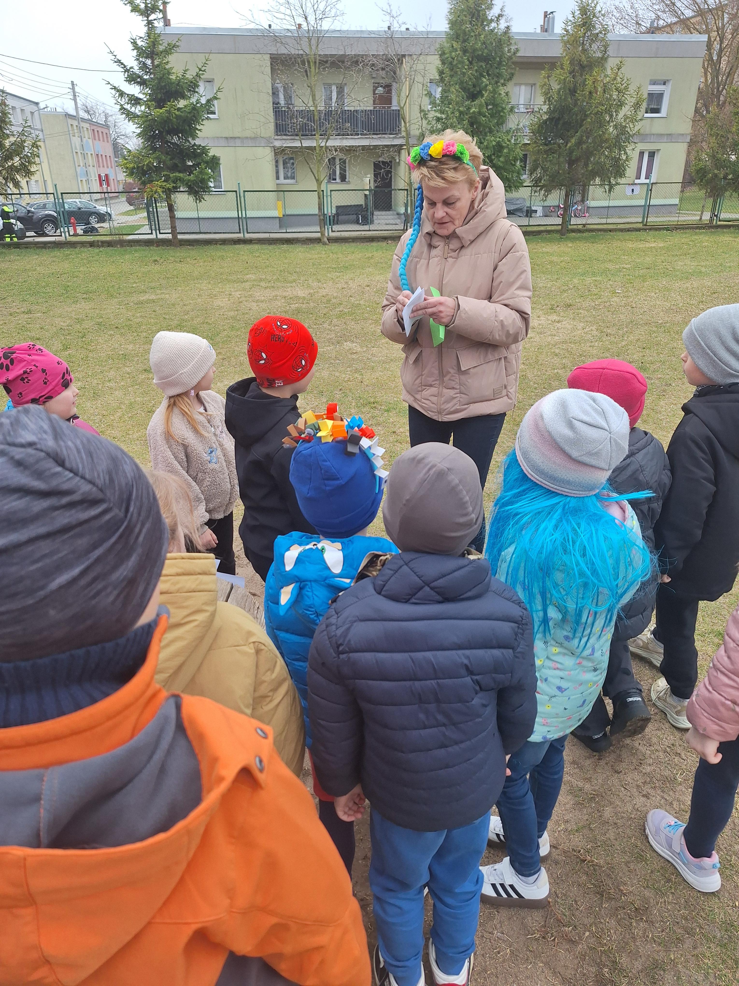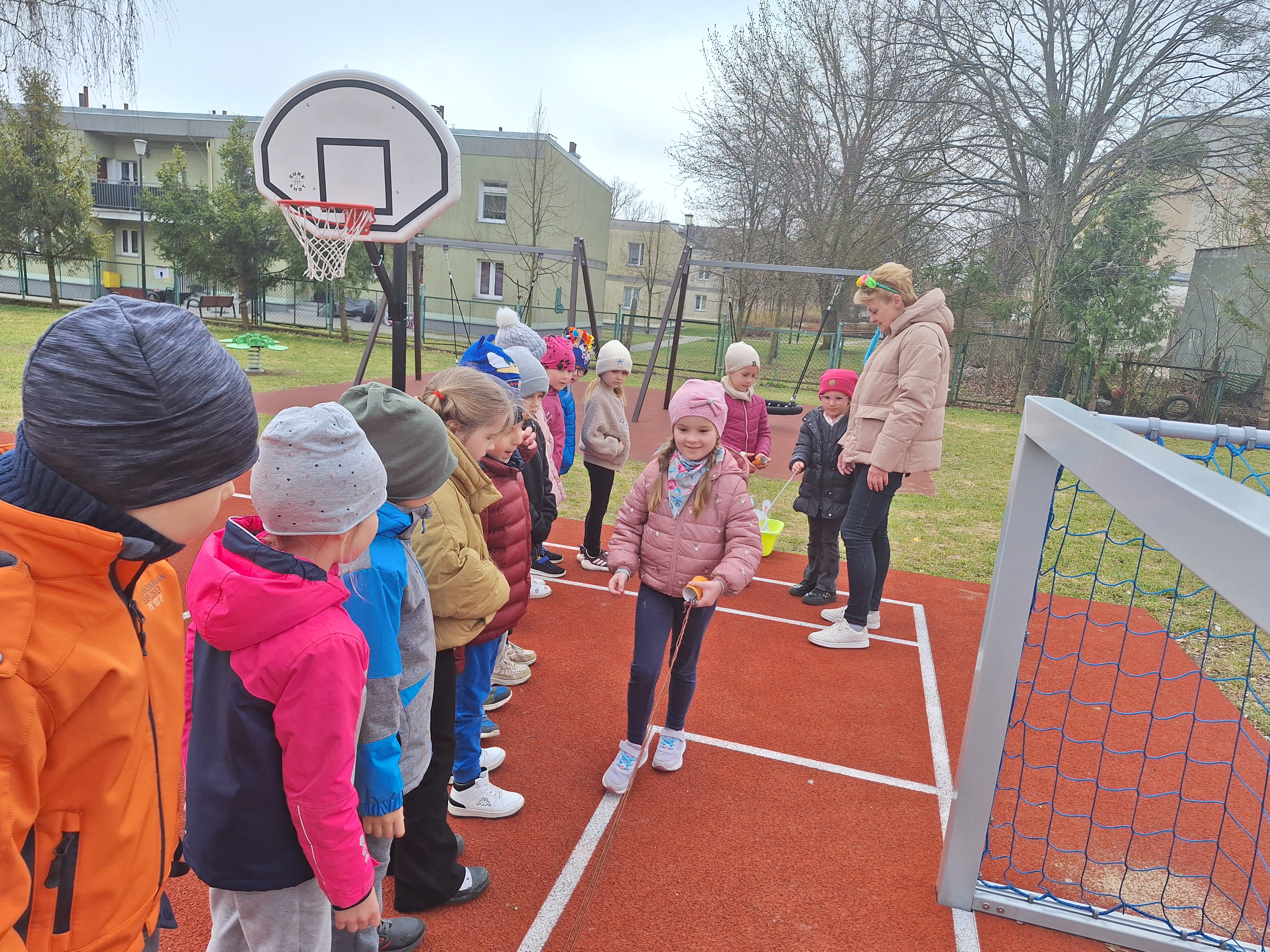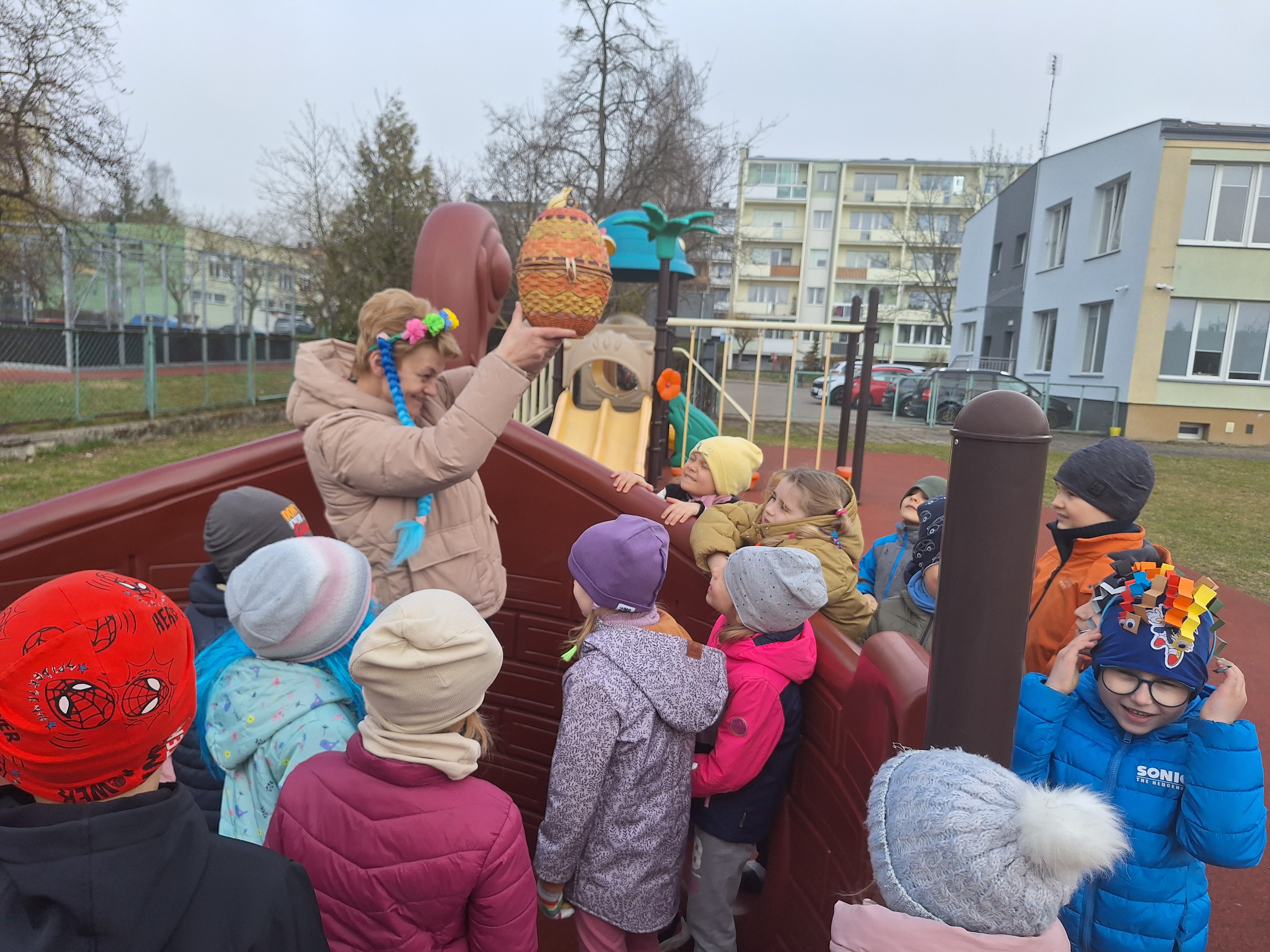 Następnie przedszkolaki wyszły na plac zabaw w poszukiwaniu Zajączka Wielkanocnego. Czekało tam na nie wiele atrakcji i zadań: rozwiązywanie zagadek, pokonywanie toru przeszkód oraz zabawy zręcznościowe. Po wykonaniu wszystkich wyzwań dzieci rozpoczęły poszukiwania i… udało się! Znalazły upominek pozostawiony przez Zajączka.