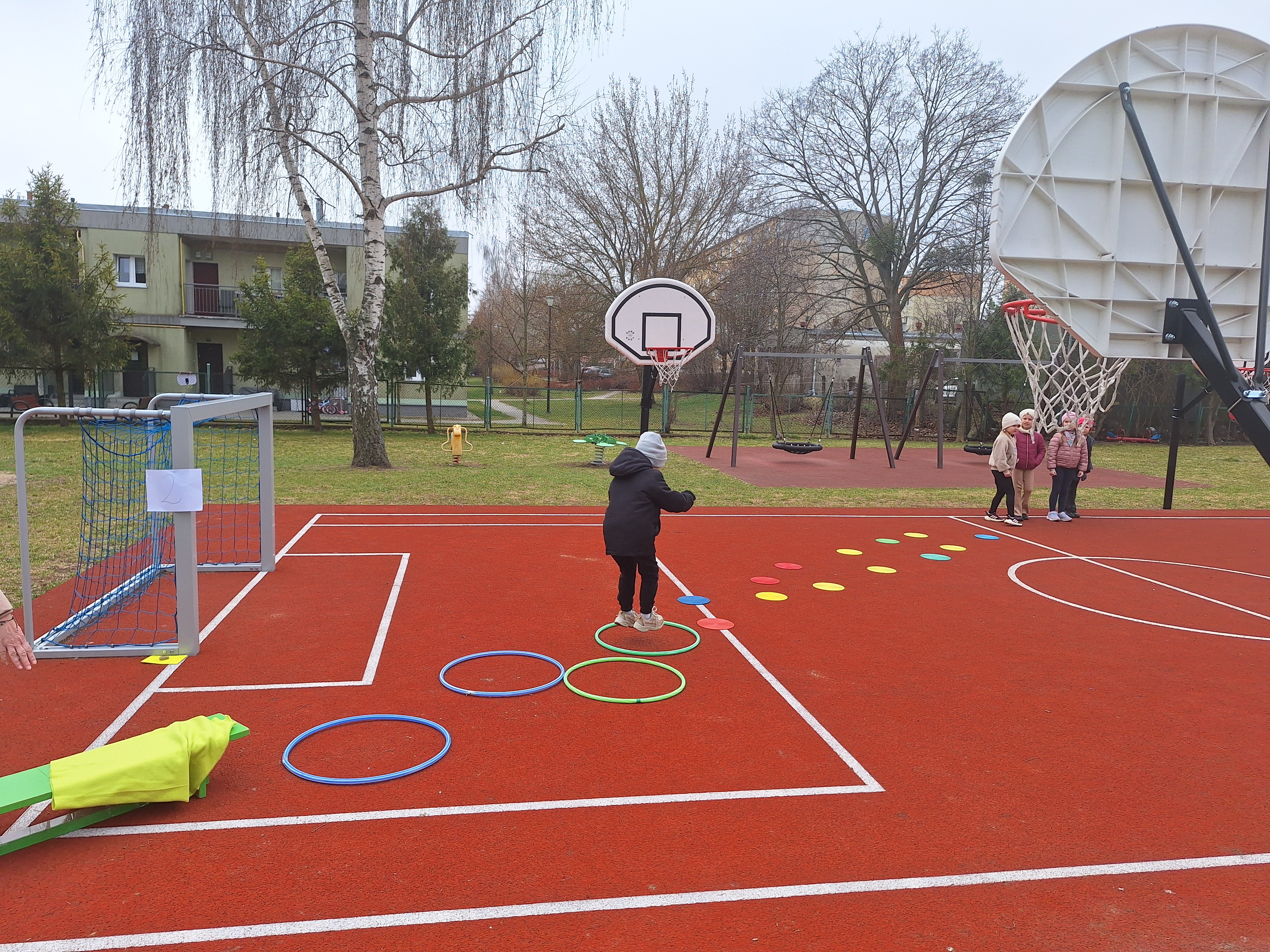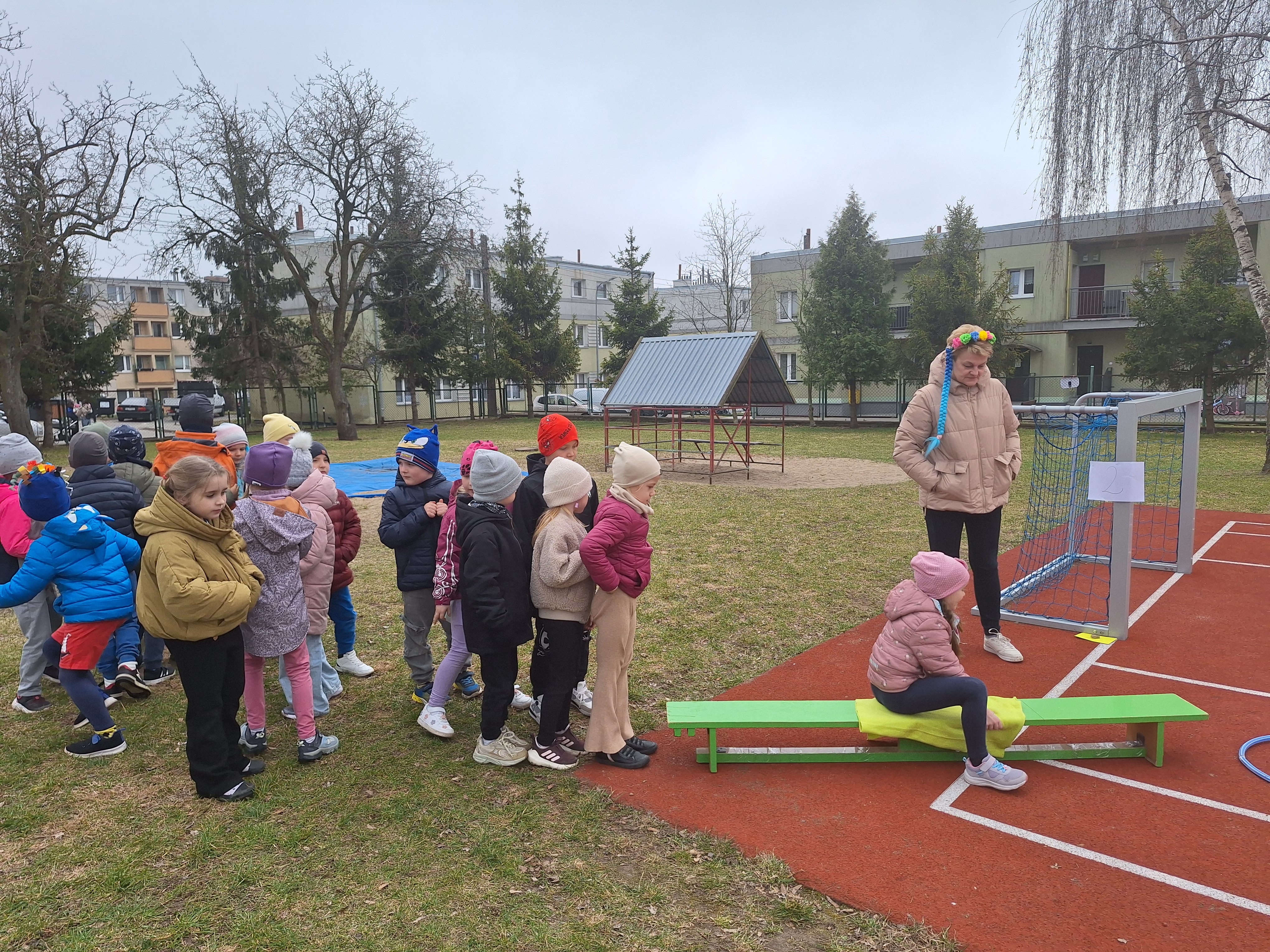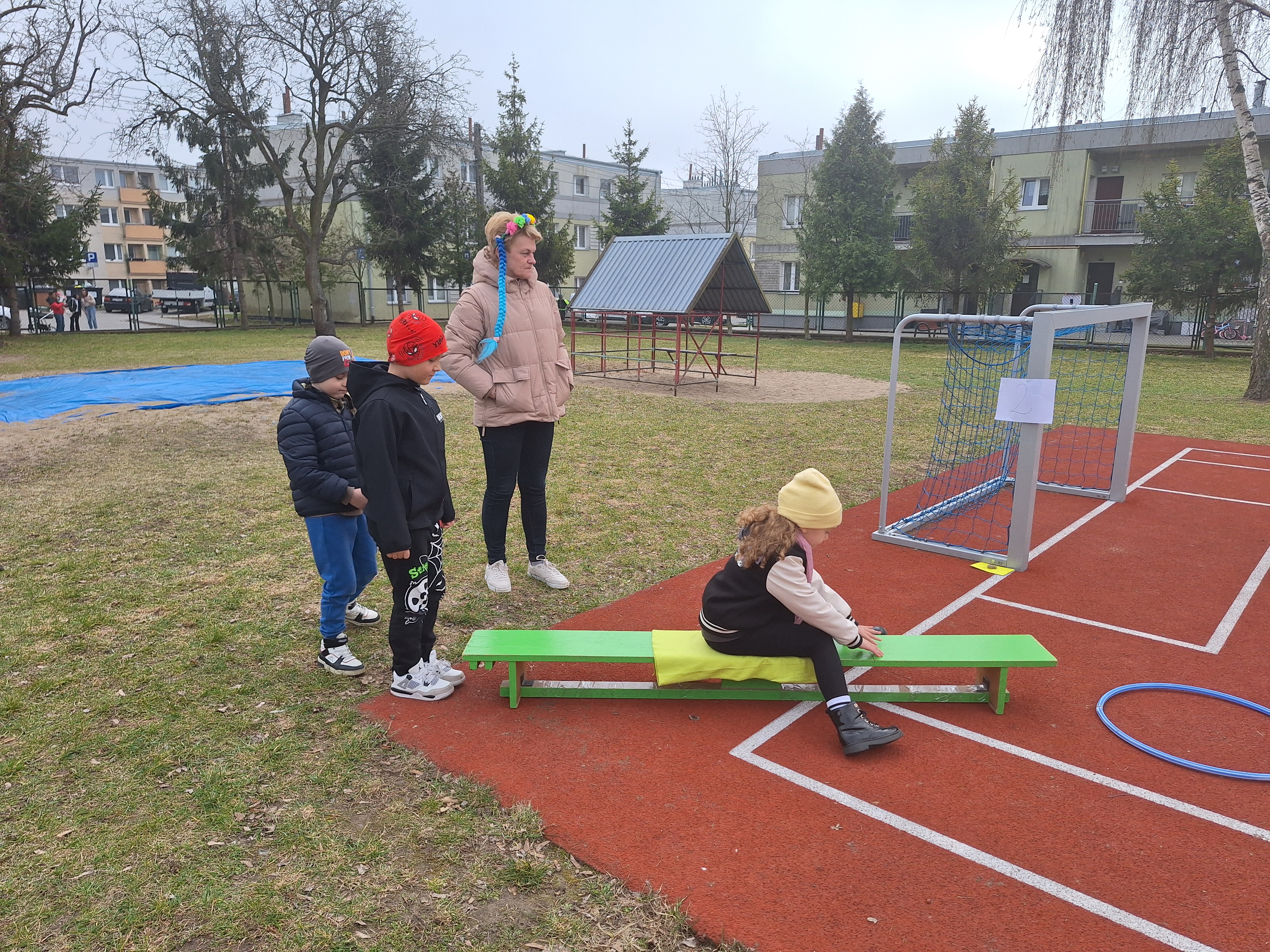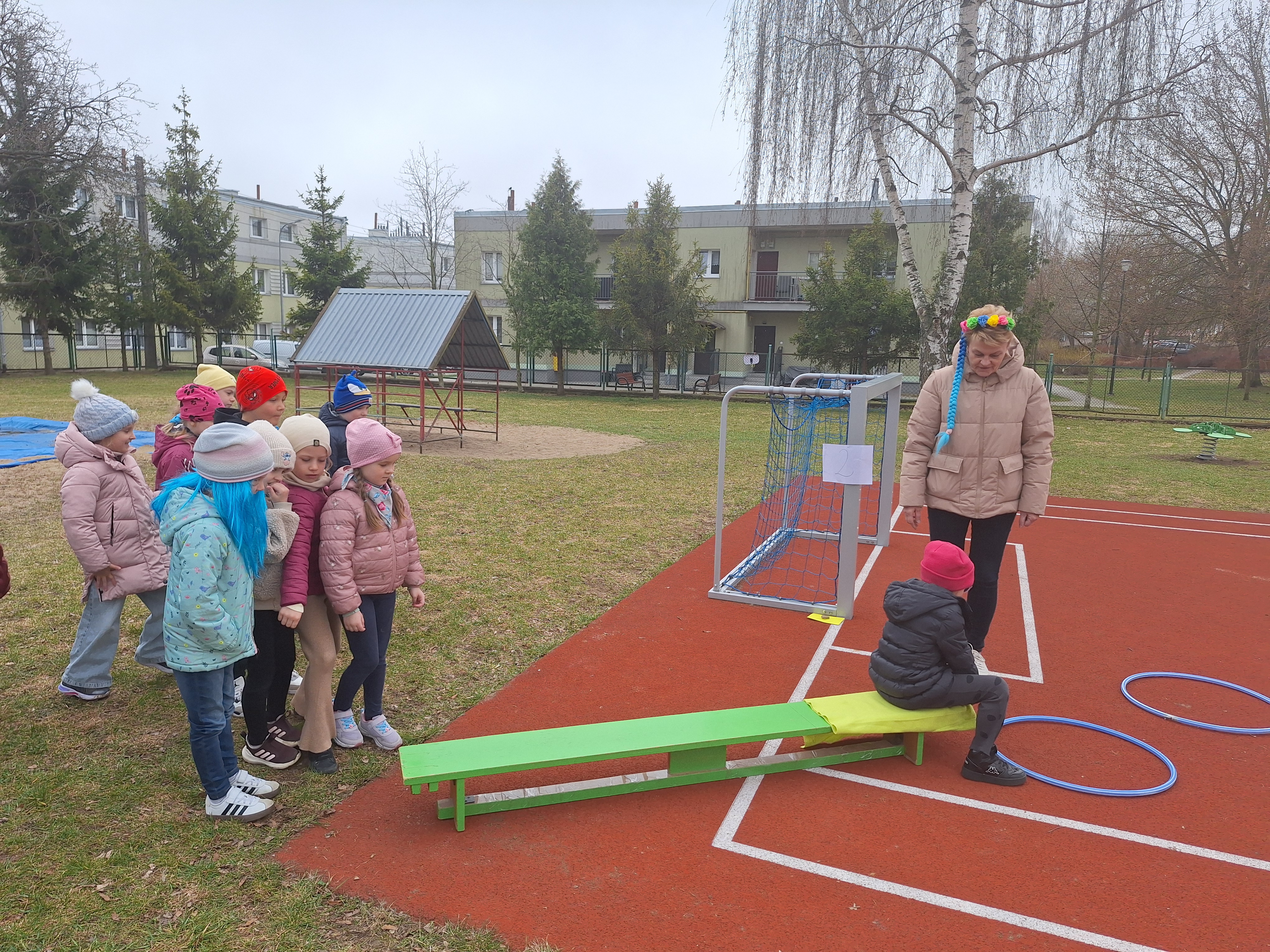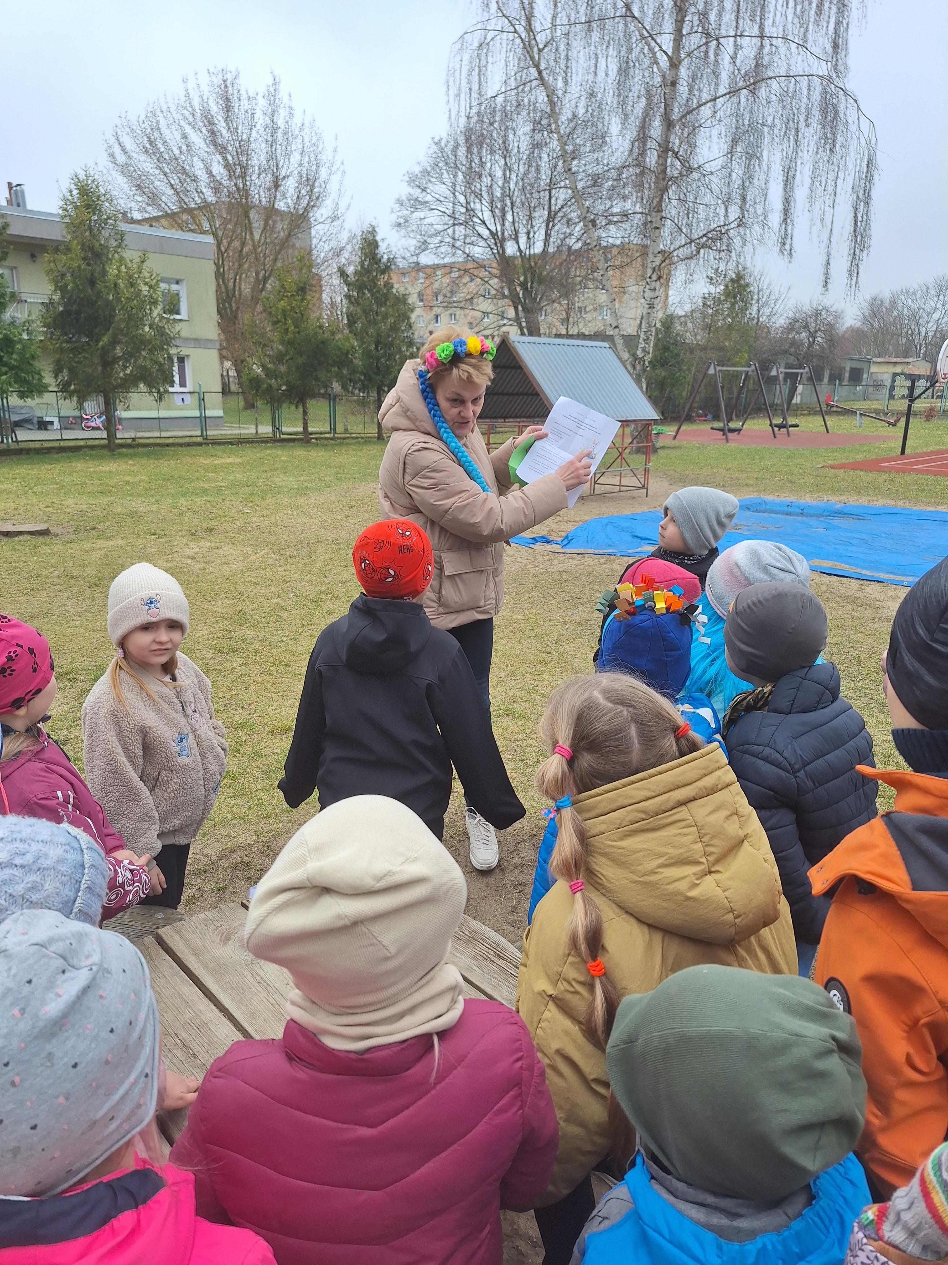 Następnie przedszkolaki wyszły na plac zabaw w poszukiwaniu Zajączka Wielkanocnego. Czekało tam na nie wiele atrakcji i zadań: rozwiązywanie zagadek, pokonywanie toru przeszkód oraz zabawy zręcznościowe. Po wykonaniu wszystkich wyzwań dzieci rozpoczęły poszukiwania i… udało się! Znalazły upominek pozostawiony przez Zajączka.