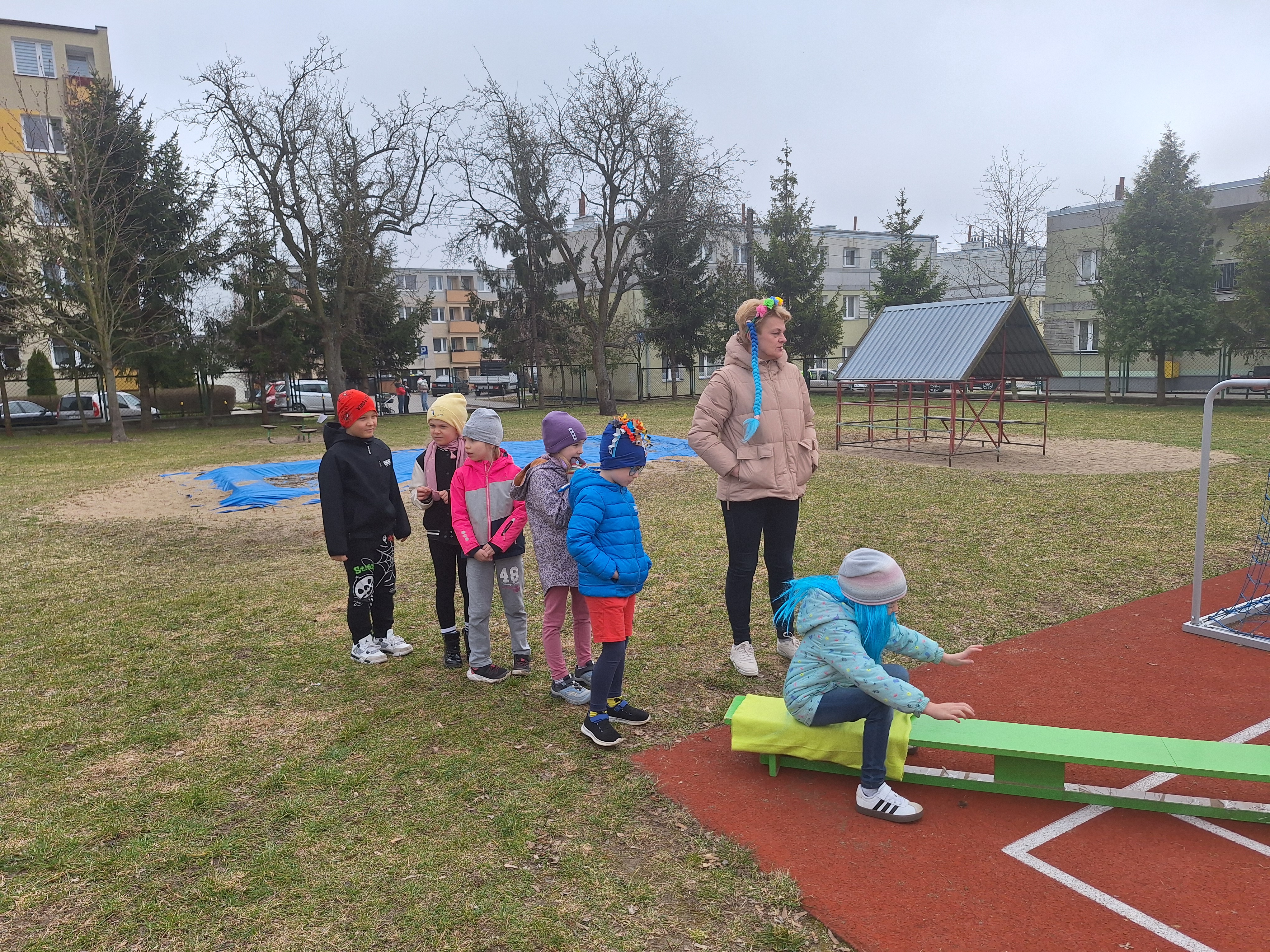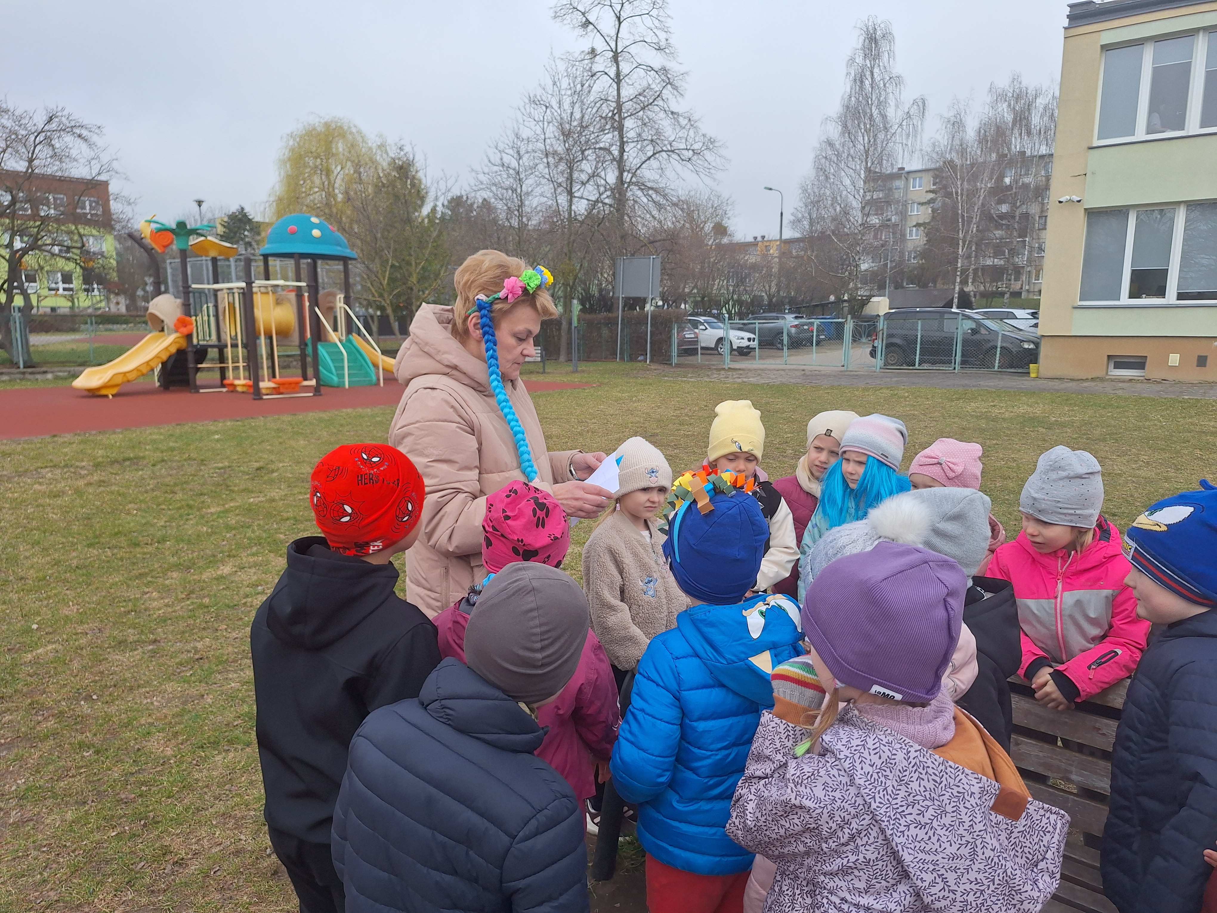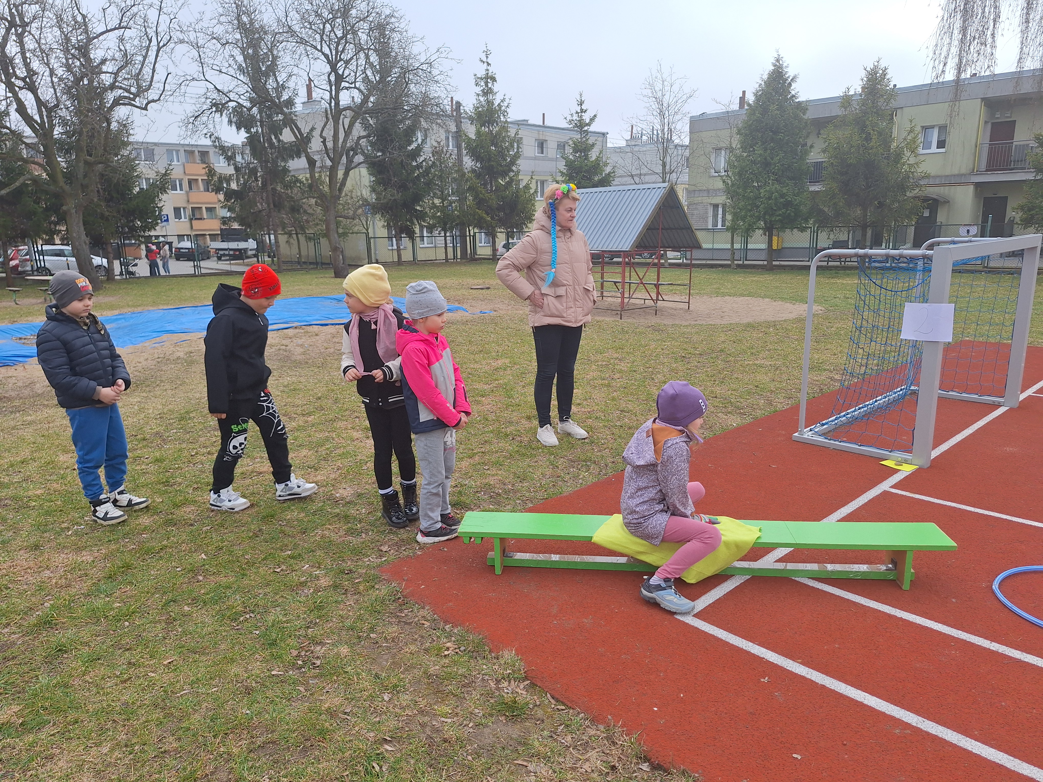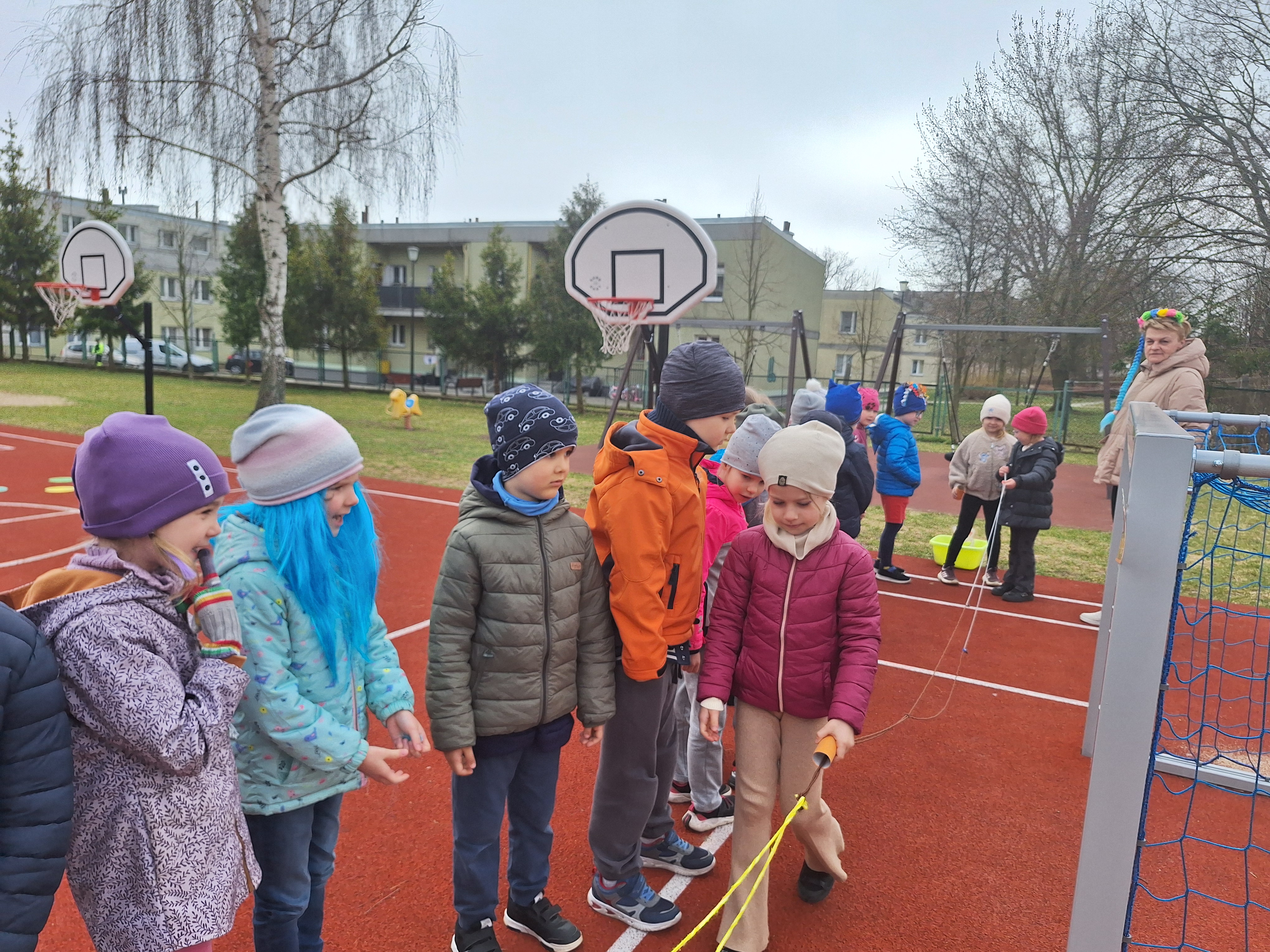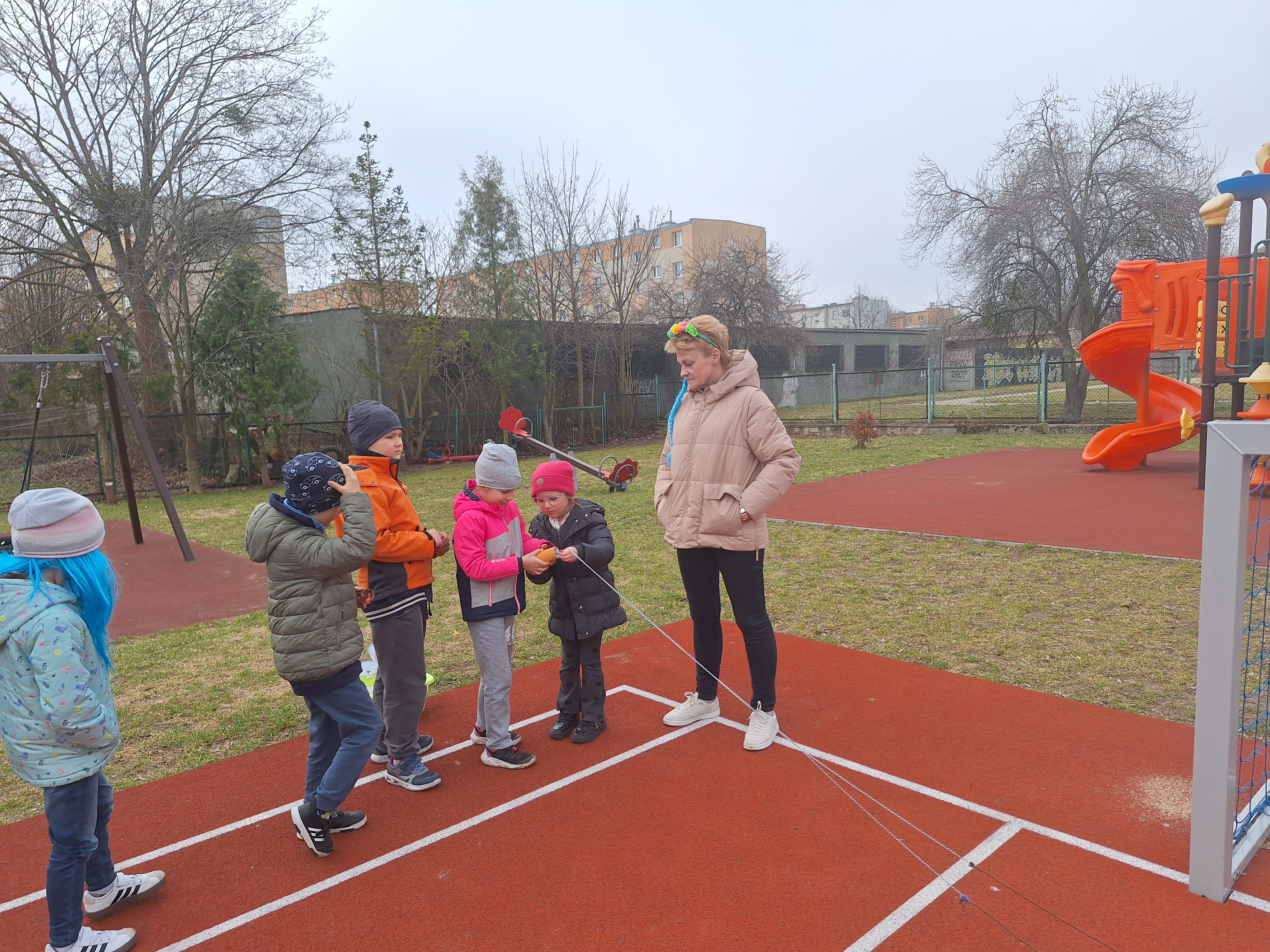 Następnie przedszkolaki wyszły na plac zabaw w poszukiwaniu Zajączka Wielkanocnego. Czekało tam na nie wiele atrakcji i zadań: rozwiązywanie zagadek, pokonywanie toru przeszkód oraz zabawy zręcznościowe. Po wykonaniu wszystkich wyzwań dzieci rozpoczęły poszukiwania i… udało się! Znalazły upominek pozostawiony przez Zajączka.