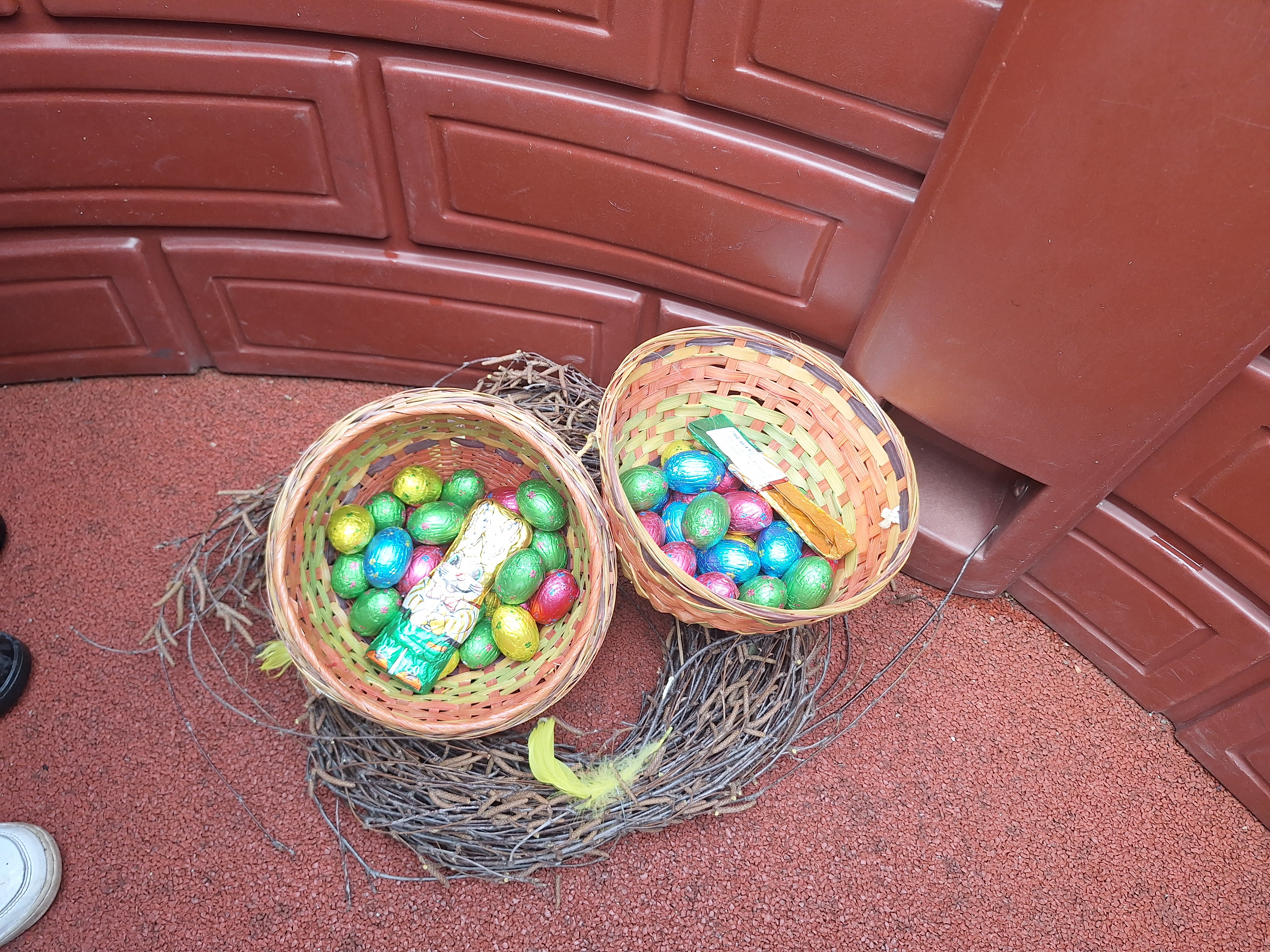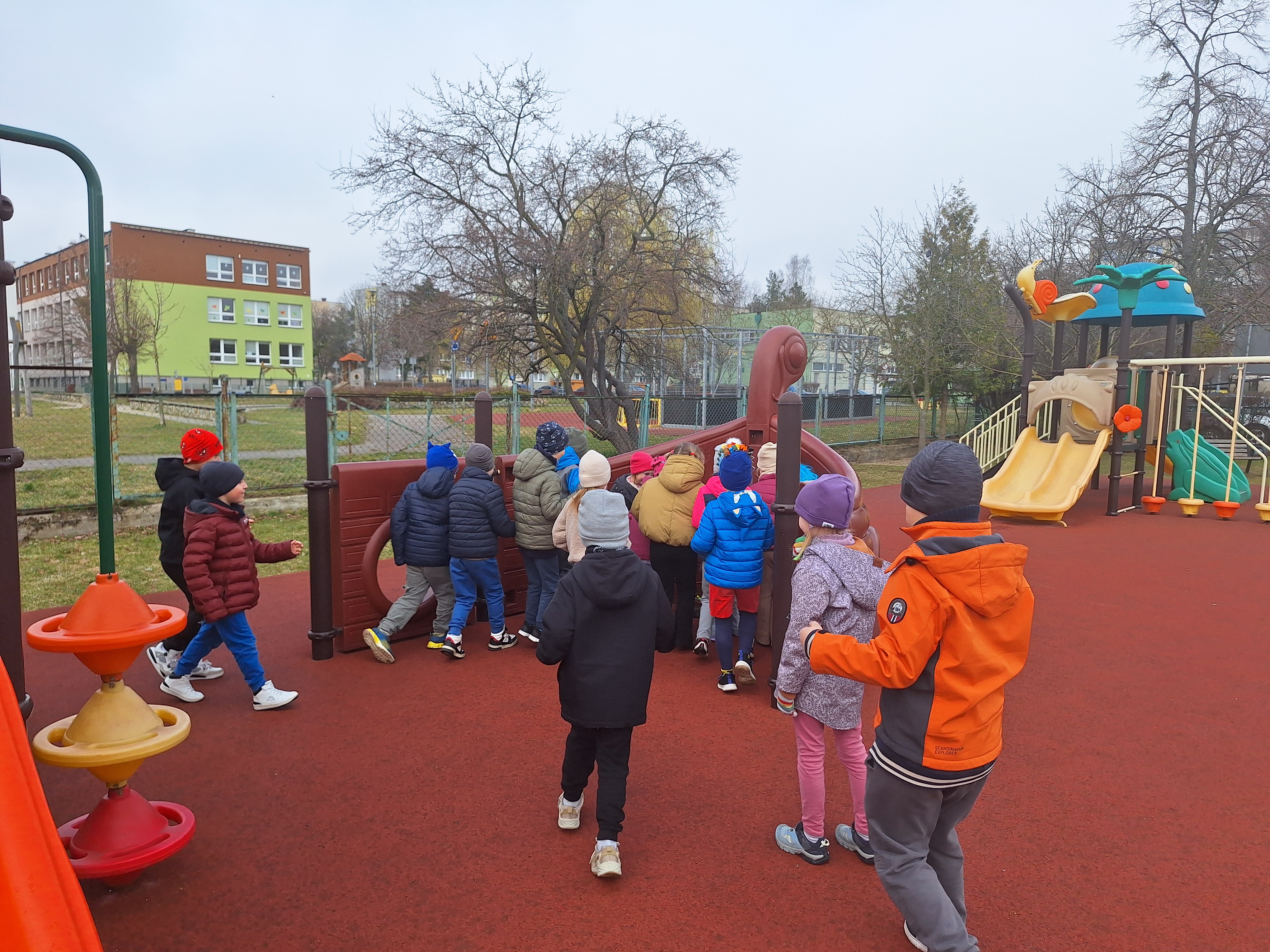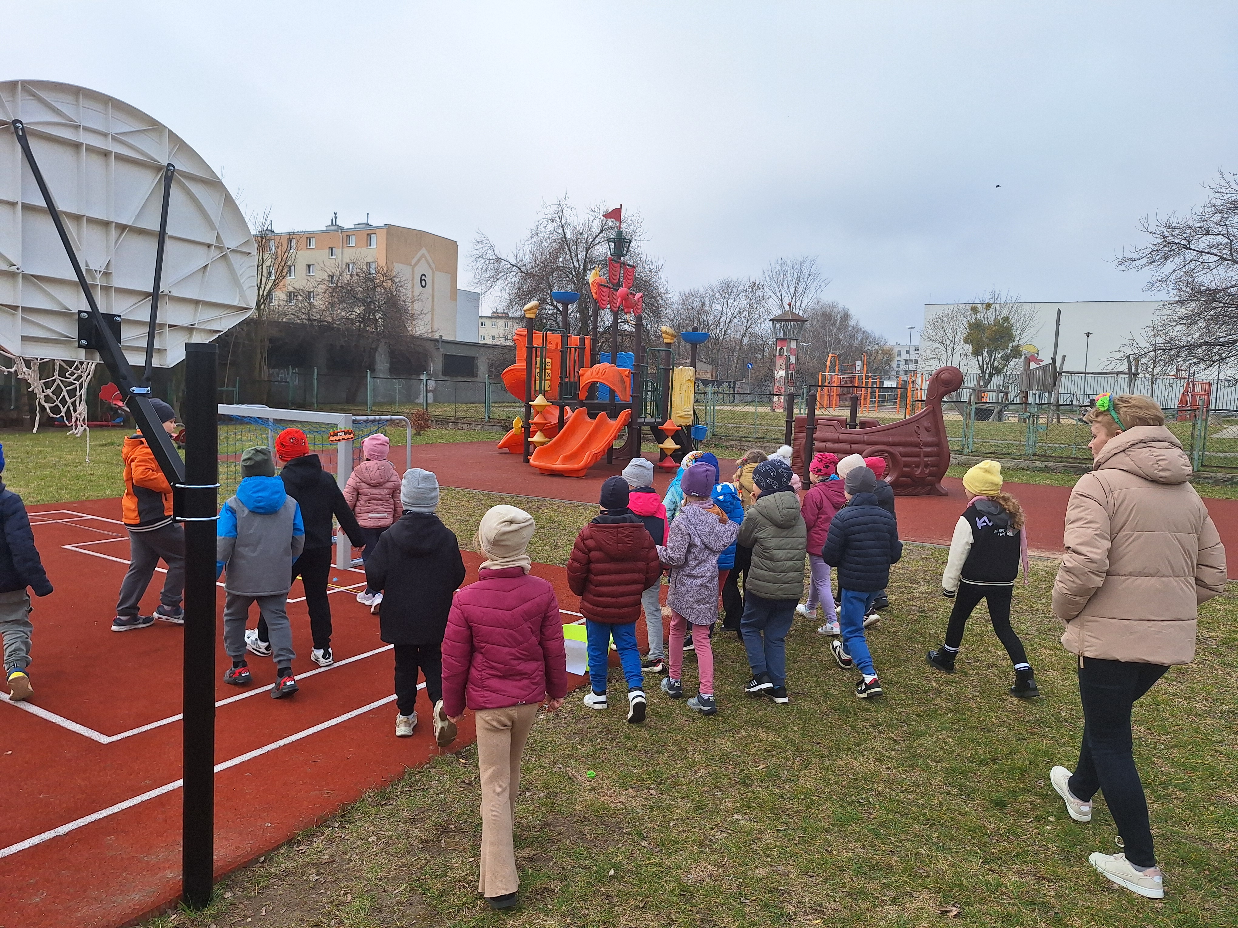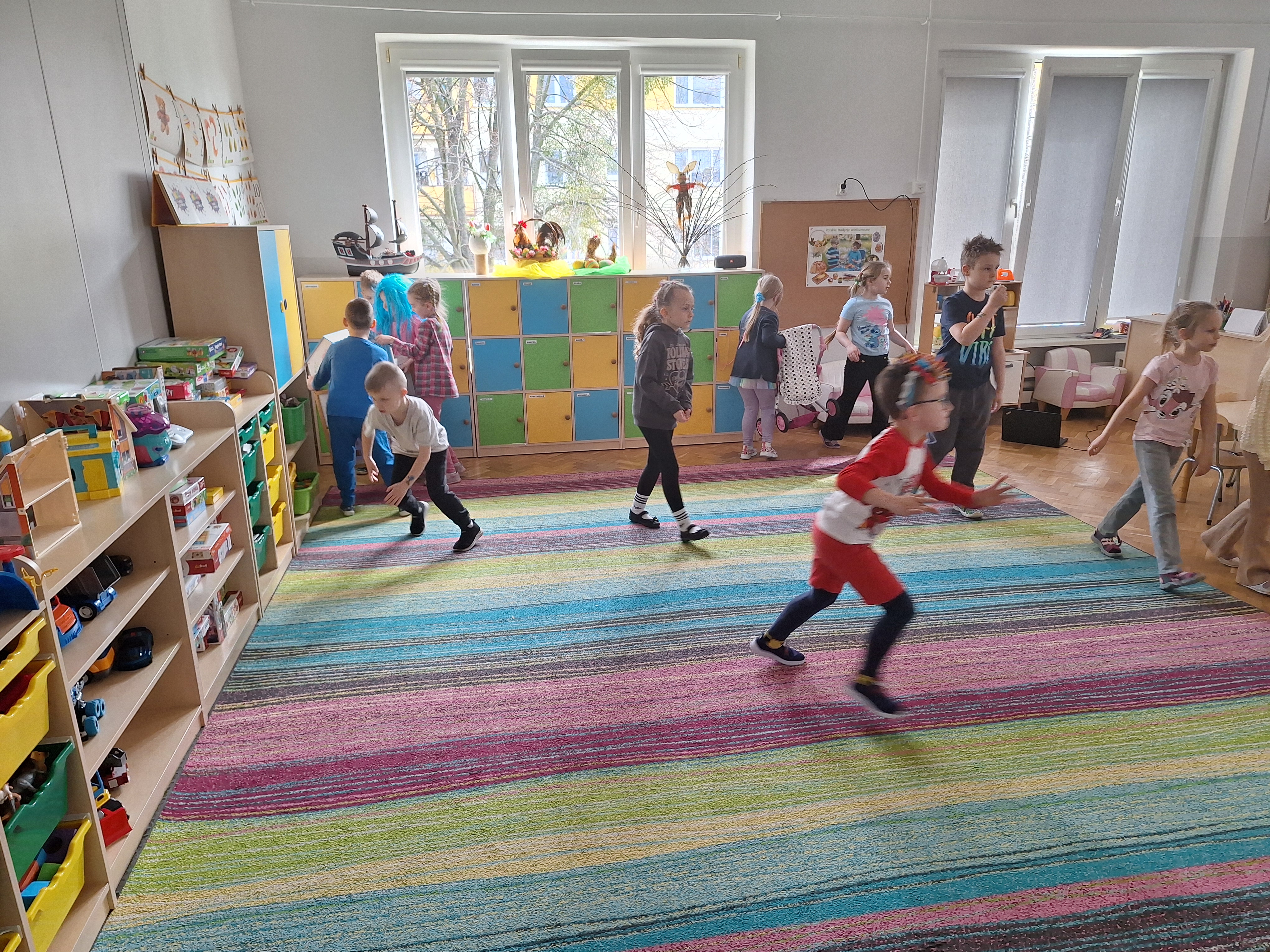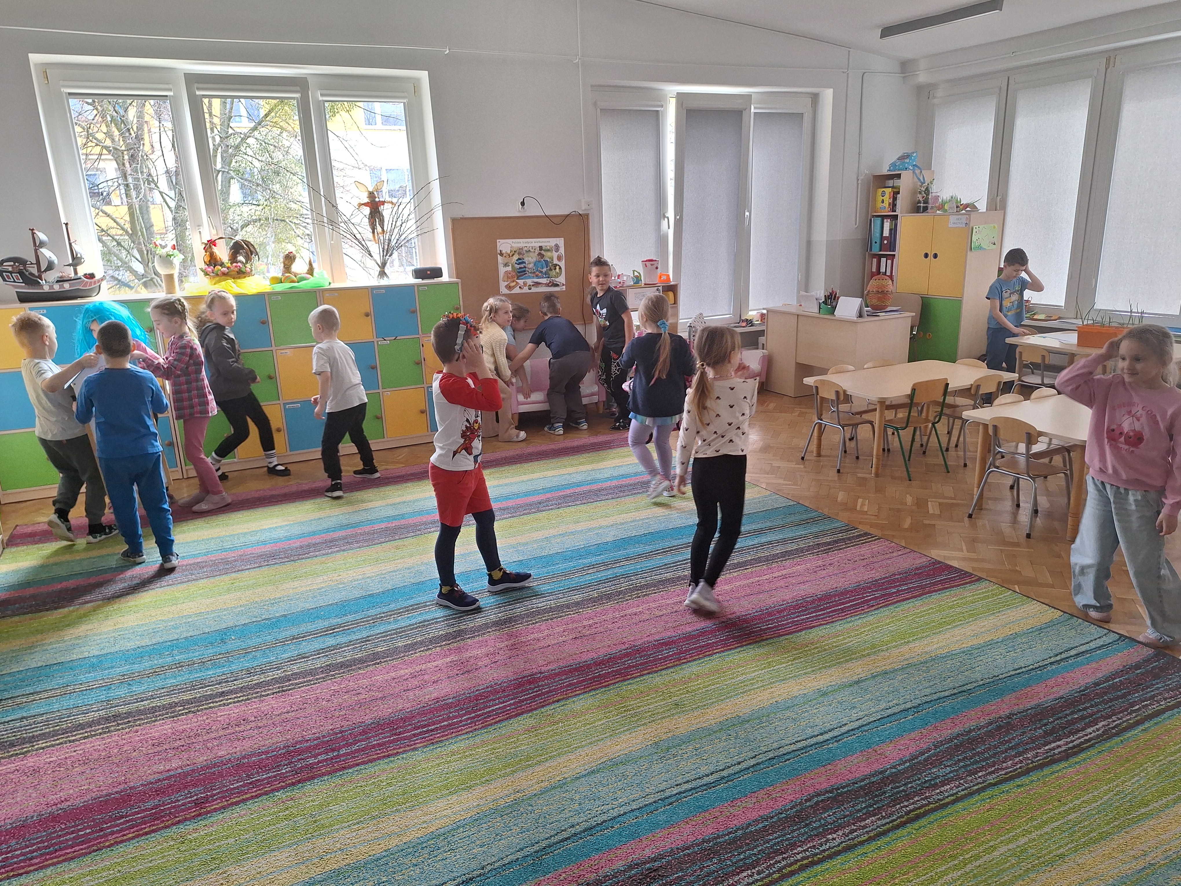 Następnie przedszkolaki wyszły na plac zabaw w poszukiwaniu Zajączka Wielkanocnego. Czekało tam na nie wiele atrakcji i zadań: rozwiązywanie zagadek, pokonywanie toru przeszkód oraz zabawy zręcznościowe. Po wykonaniu wszystkich wyzwań dzieci rozpoczęły poszukiwania i… udało się! Znalazły upominek pozostawiony przez Zajączka.