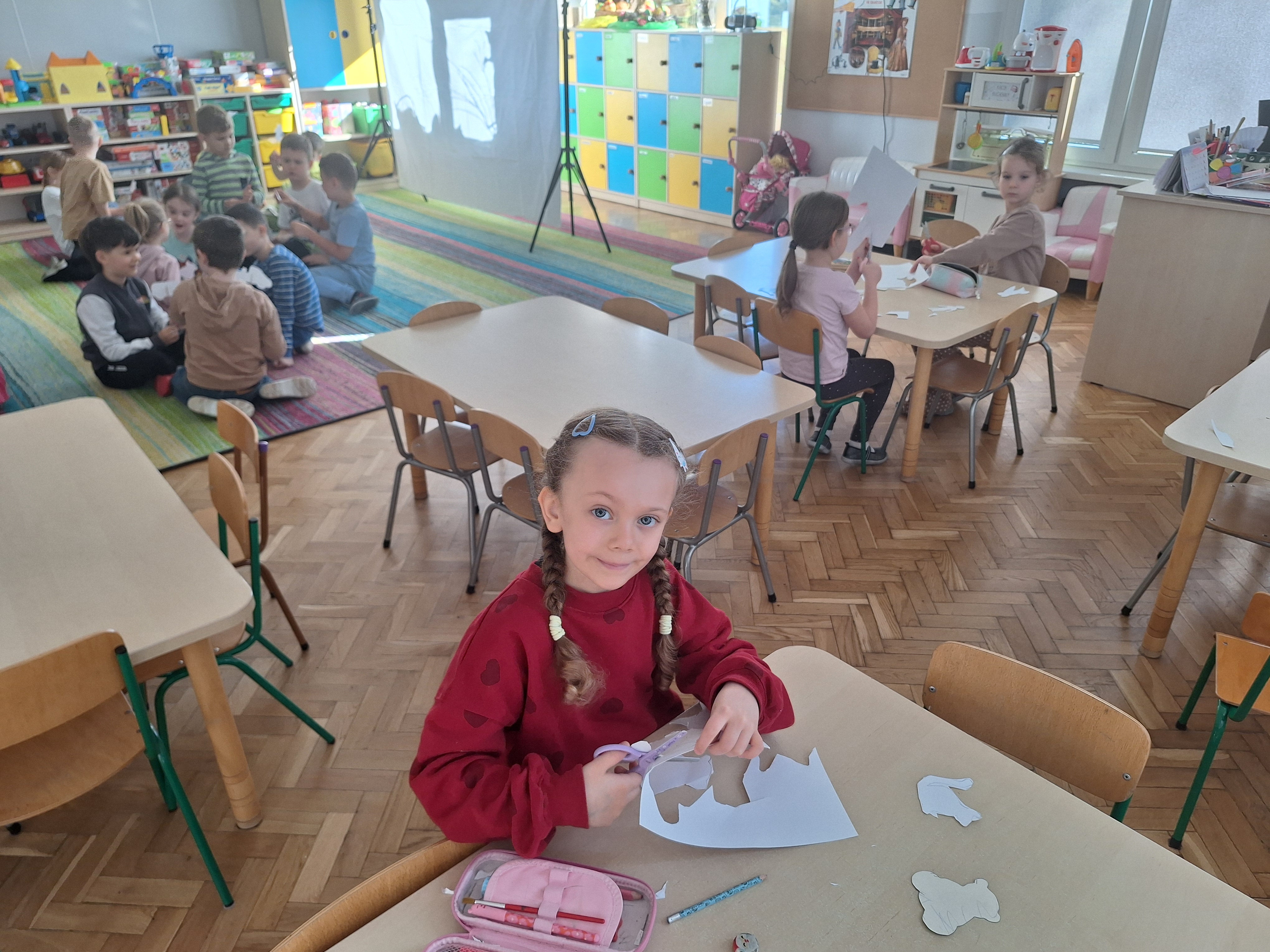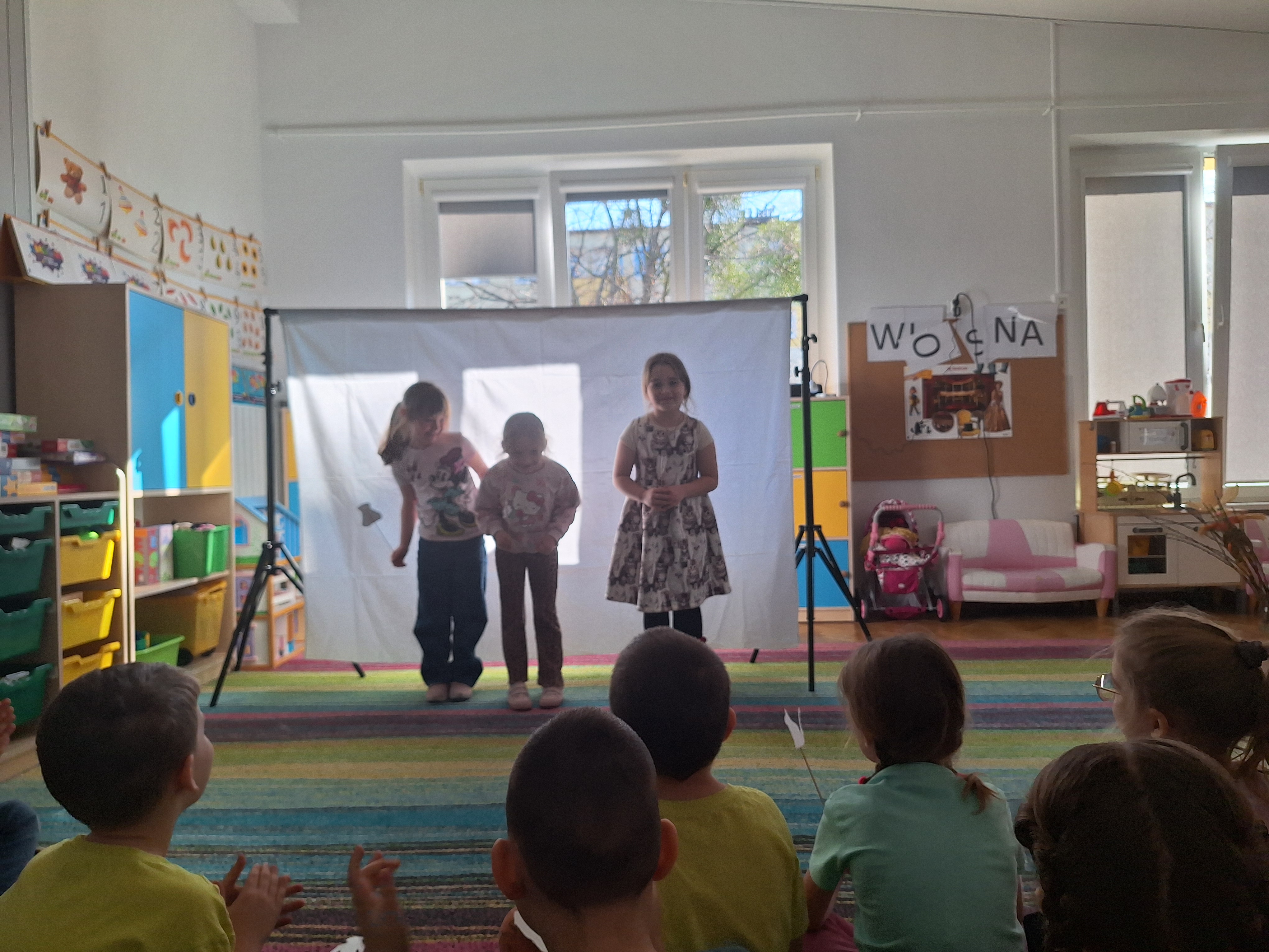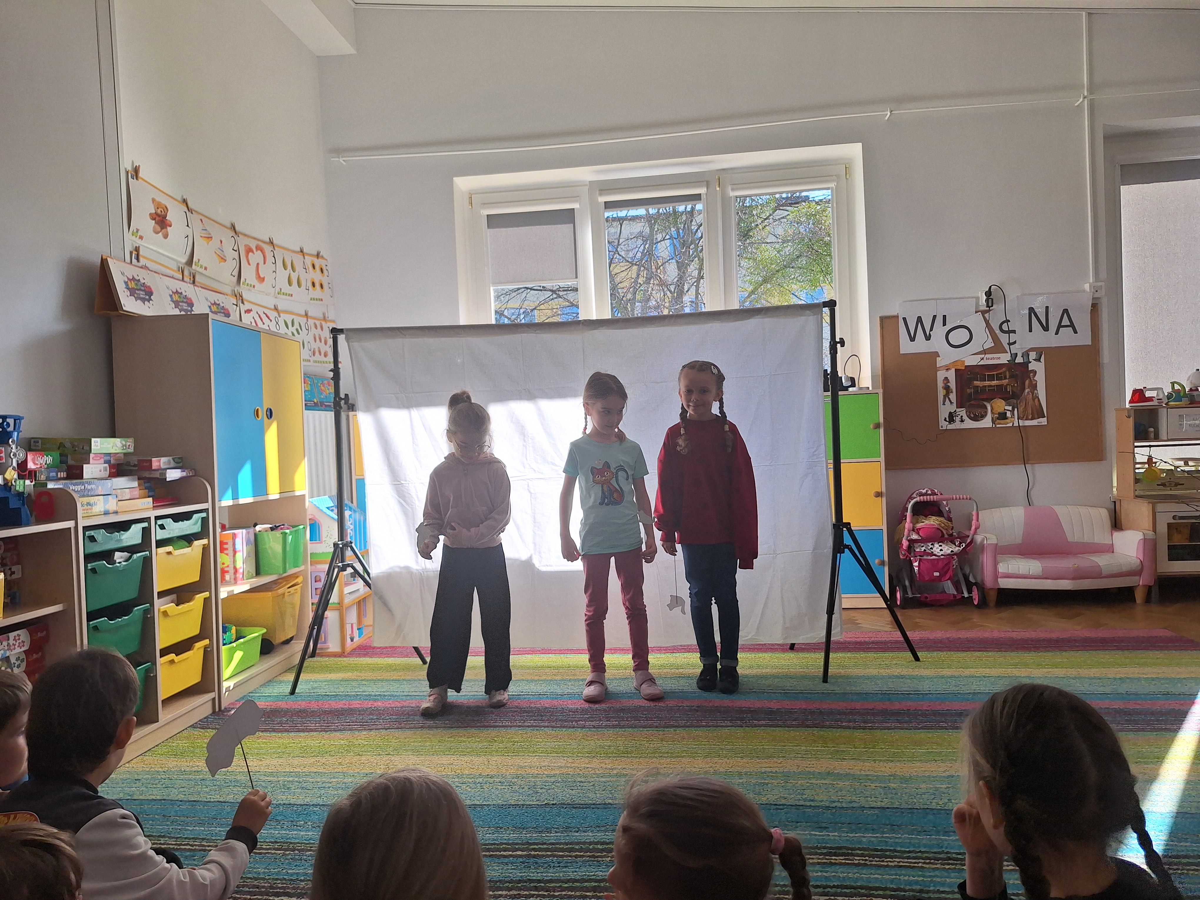 Zabawa w teatr trwała przez cały dzień i cieszyła się ogromnym zainteresowaniem. Zauważyliśmy, że dialogi między „aktorami” stawały się coraz dłuższe, bardziej rozwinięte i kreatywne. Dzieci chętnie improwizowały, rozwijały wątki i współpracowały ze sobą, co sprzyjało rozwijaniu umiejętności językowych, społecznych oraz wyobraźni.