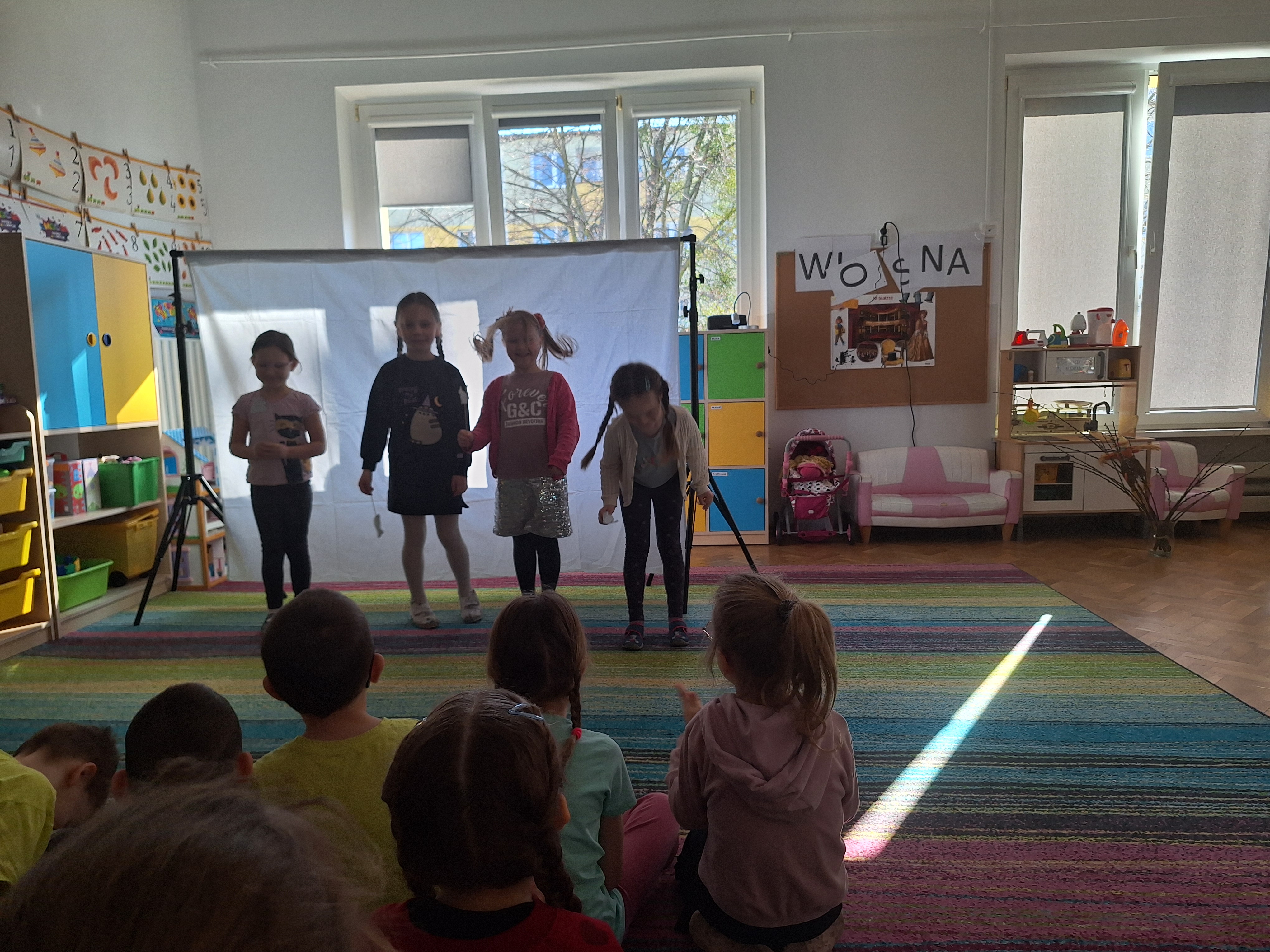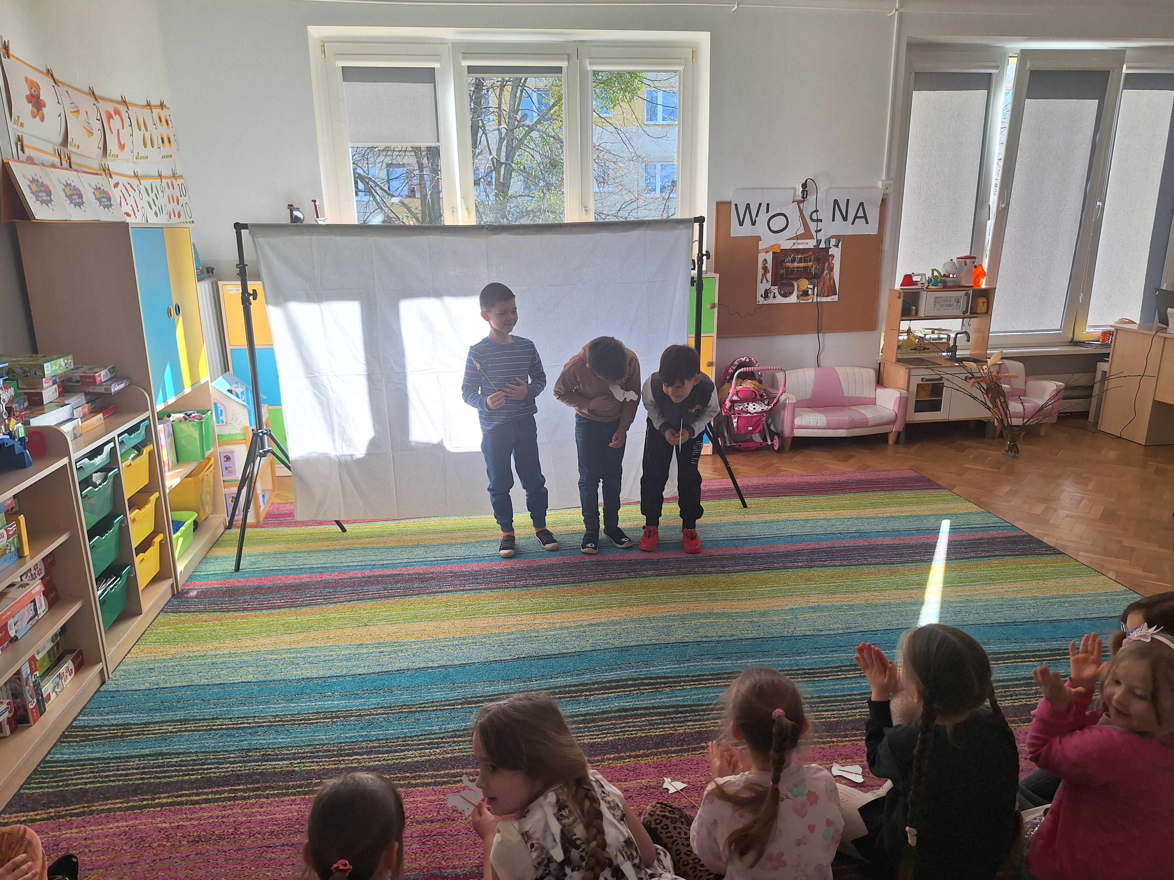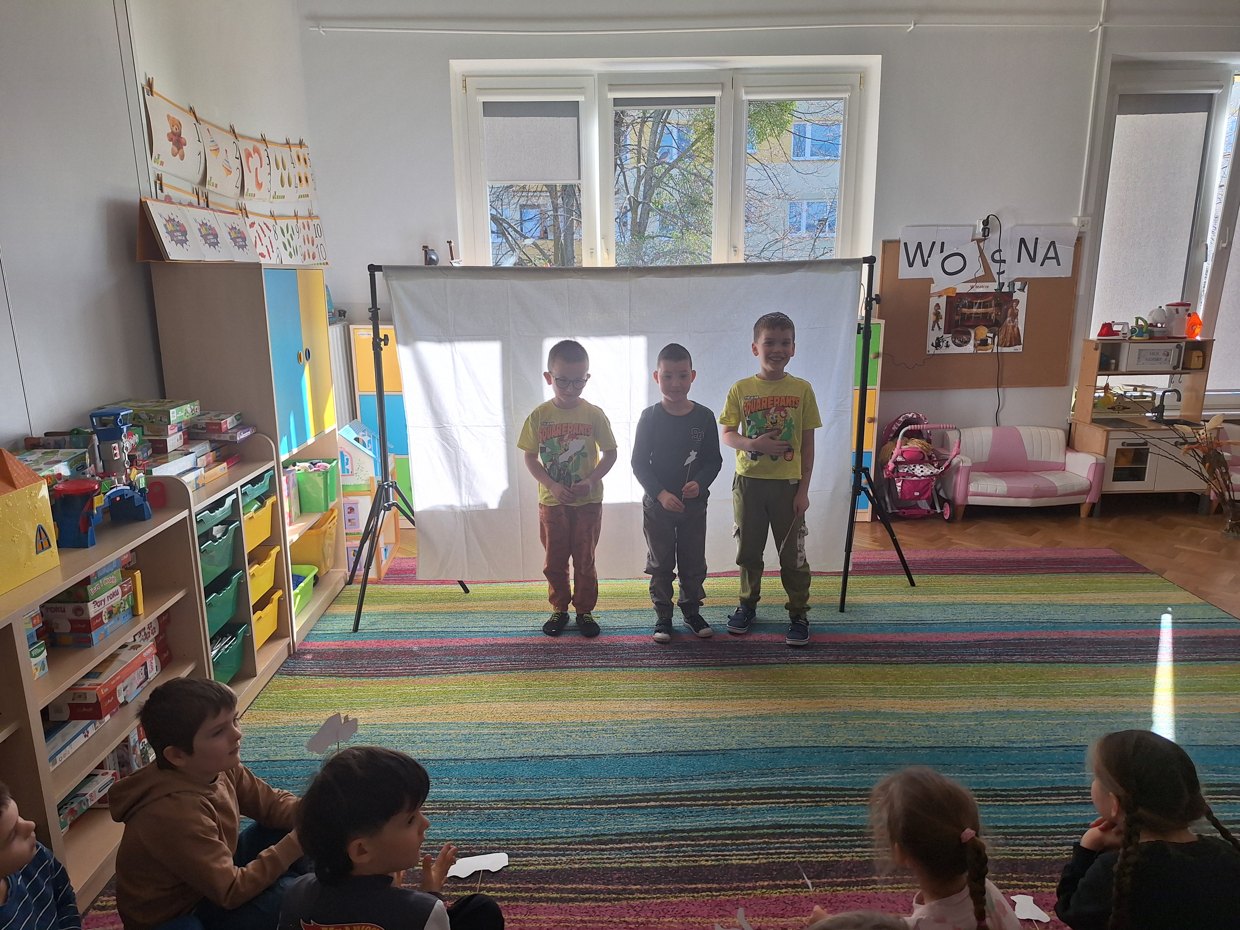 Zabawa w teatr trwała przez cały dzień i cieszyła się ogromnym zainteresowaniem. Zauważyliśmy, że dialogi między „aktorami” stawały się coraz dłuższe, bardziej rozwinięte i kreatywne. Dzieci chętnie improwizowały, rozwijały wątki i współpracowały ze sobą, co sprzyjało rozwijaniu umiejętności językowych, społecznych oraz wyobraźni.