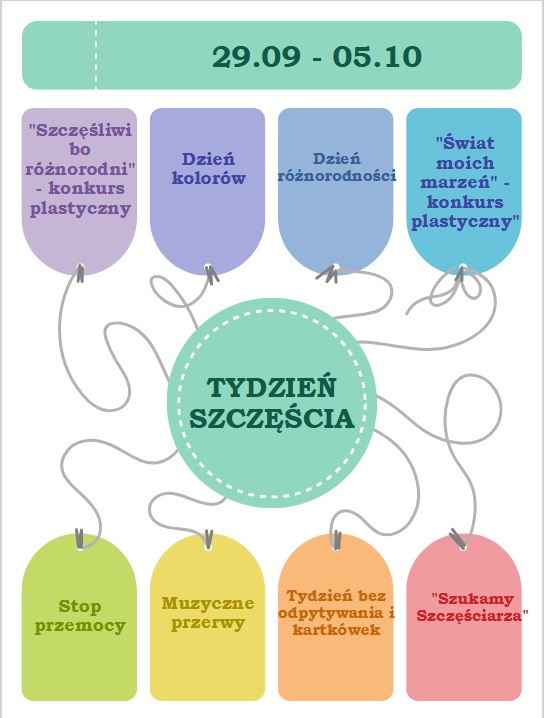 Z ogromną radością informujemy, że od poniedziałku, 29 września, w naszej szkole rozpocznie się „Tydzień Szczęścia”. To wyjątkowy czas, podczas którego czeka na nas wiele inspirujących działań, zabaw i okazji do wspólnego świętowania! ✨