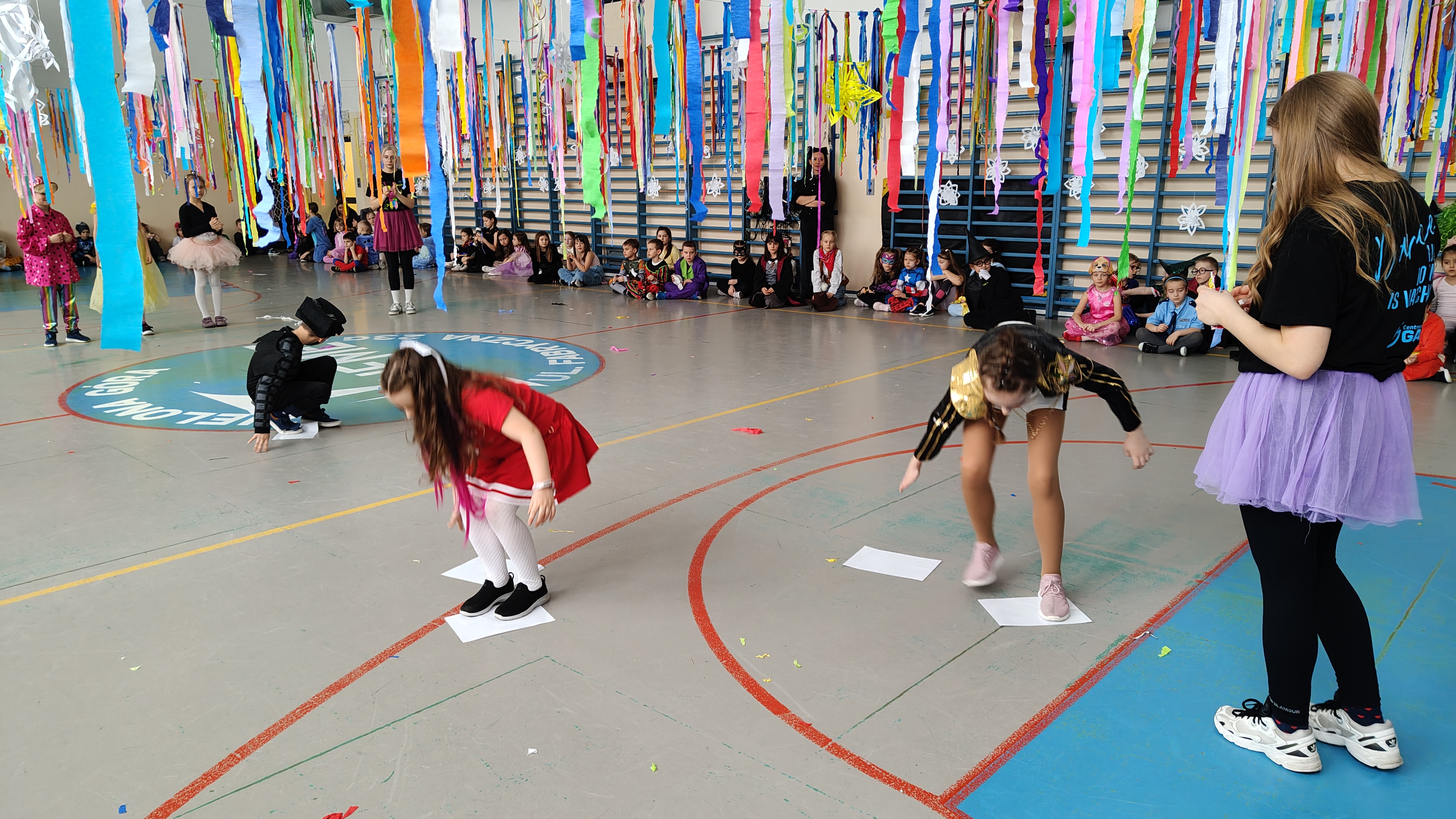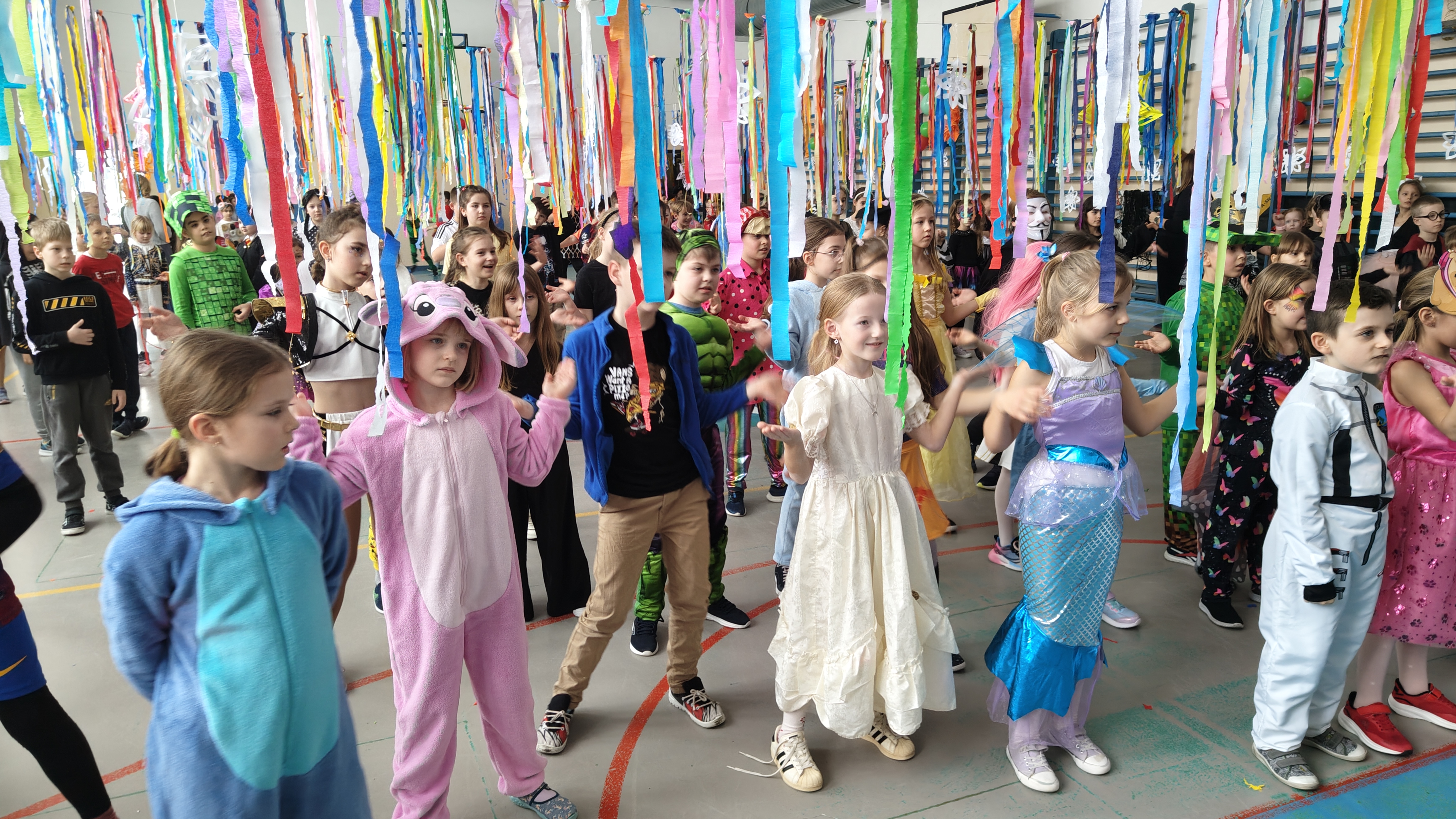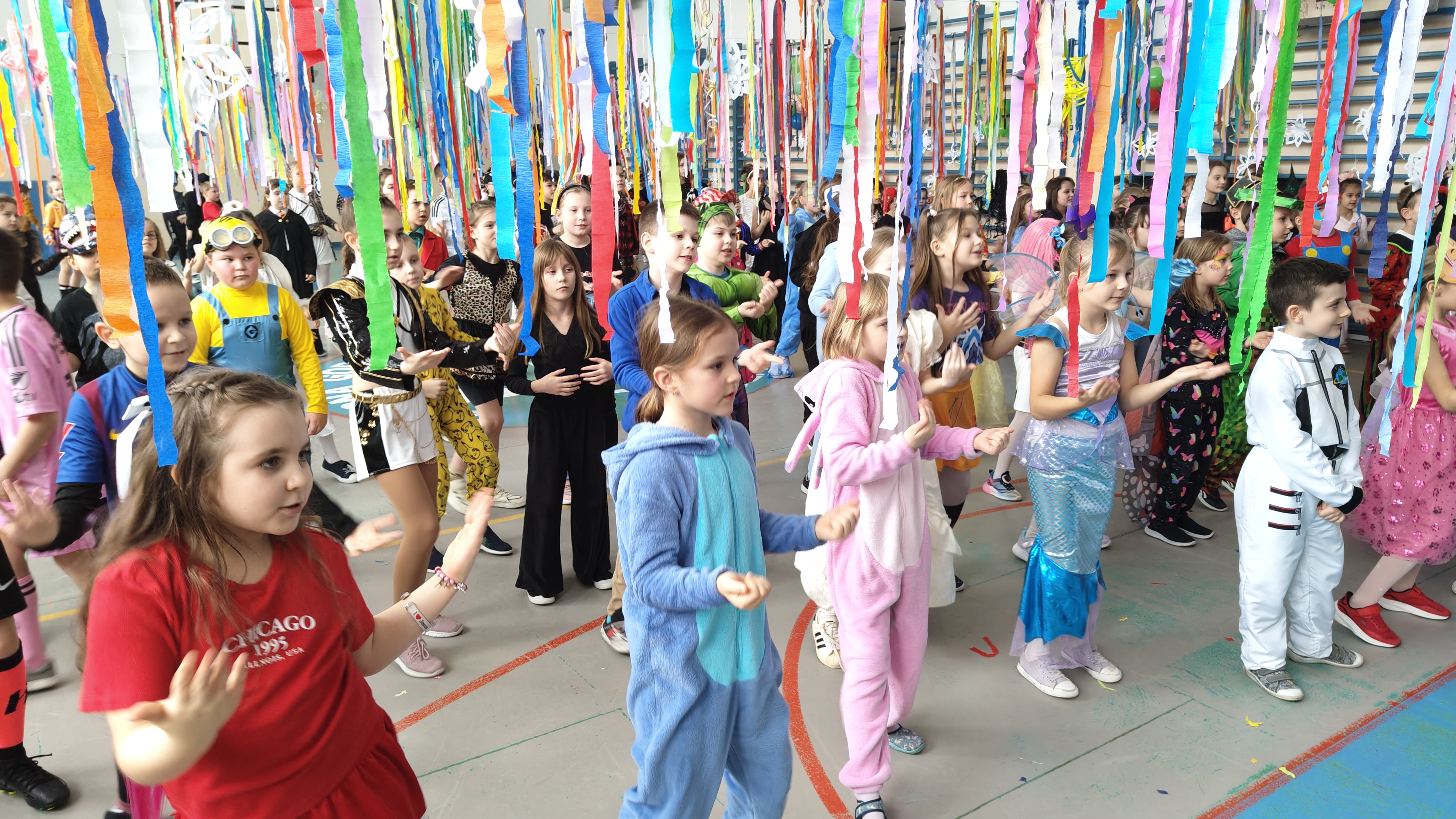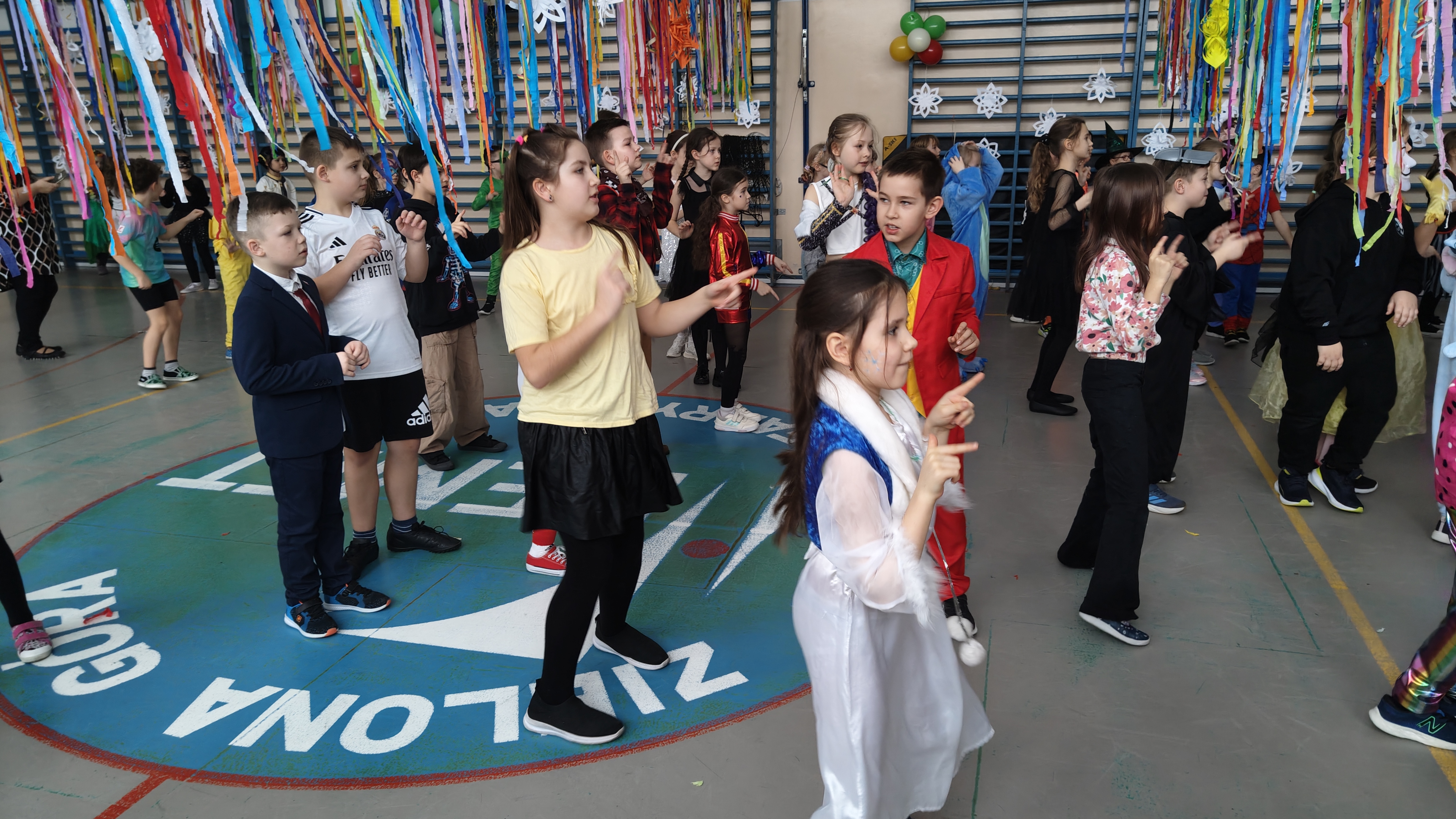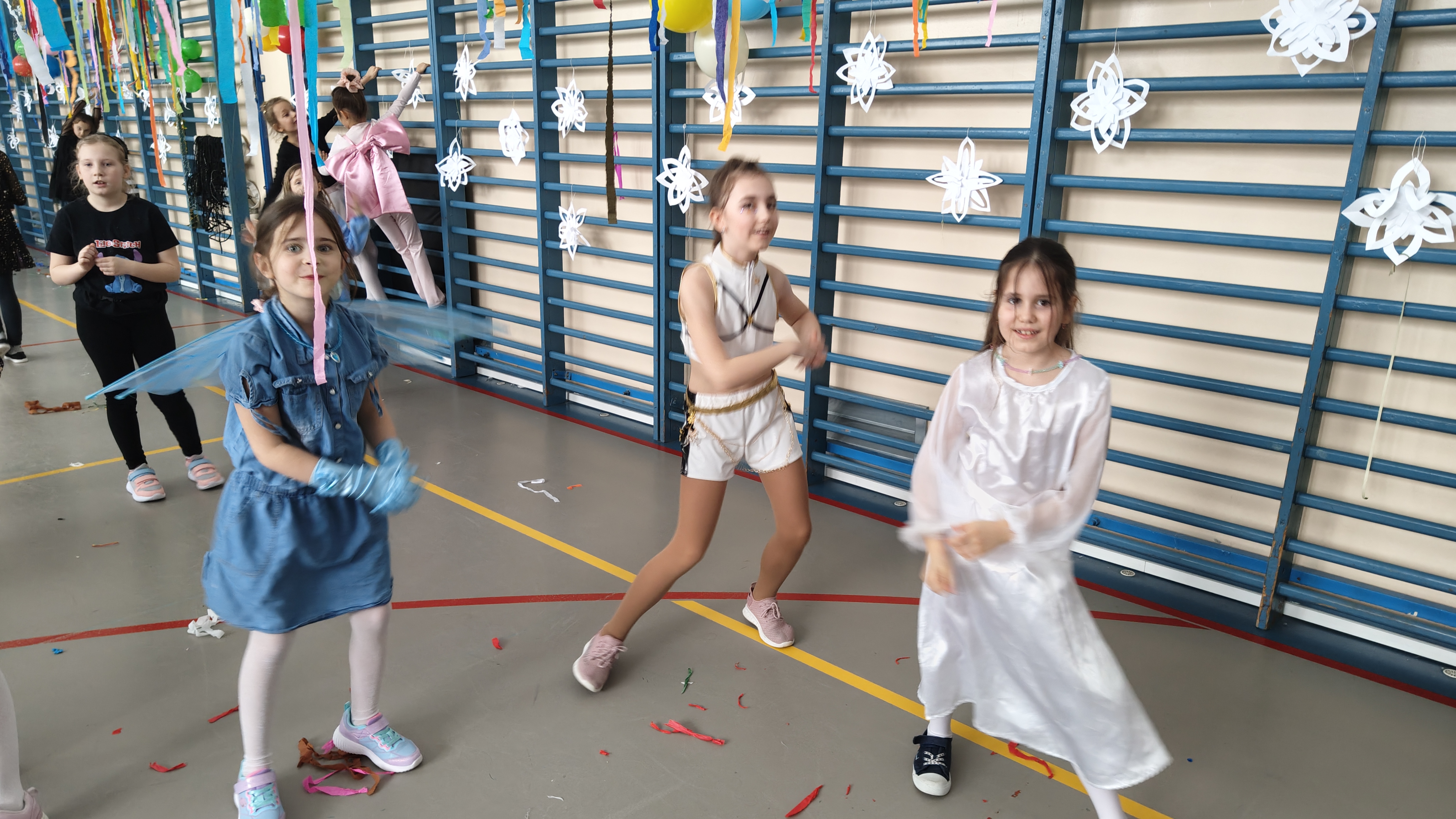 W "tłusty czwartek" 12.02. odbył się w szkole bal karnawałowy dla klas 1-3, prowadzony przez Szkołę Tańca "GABI". Różnorodne stroje, dobry humor i muzyka zagwarantowały świetną zabawę, przeplataną konkursami sprawnościowymi. Aby tradycji stało się zadość, na zmęczonych uczniów w sali czekał słodki poczęstunek, zorganizowany przez rodziców. Natomiast nazajutrz obchodziliśmy "WALENTYNKI": była poczta walentynkowa, symboliczny lizak dla każdego oraz pamiątkowe zdjęcie z przepiękną dekoracją w tle.