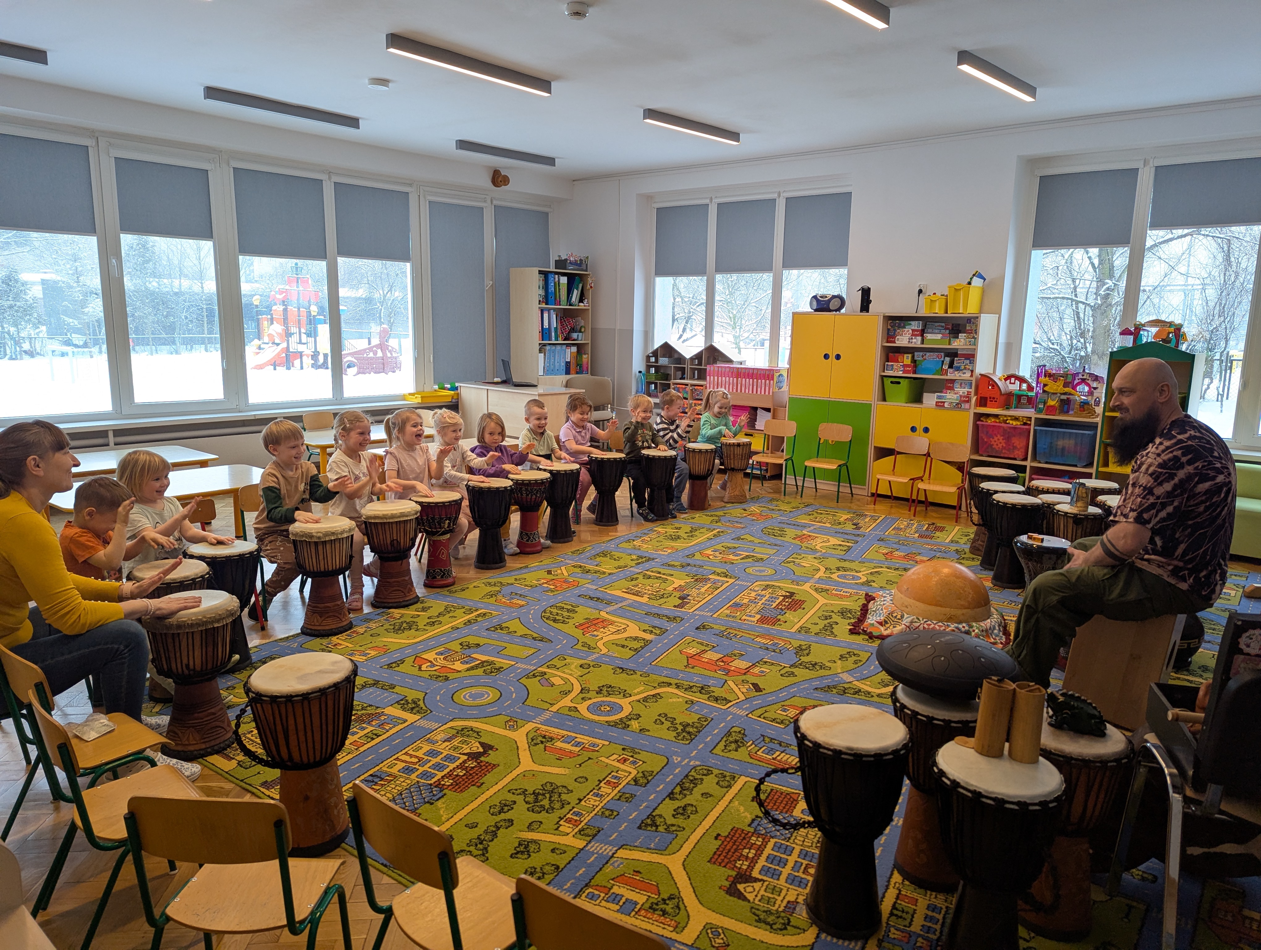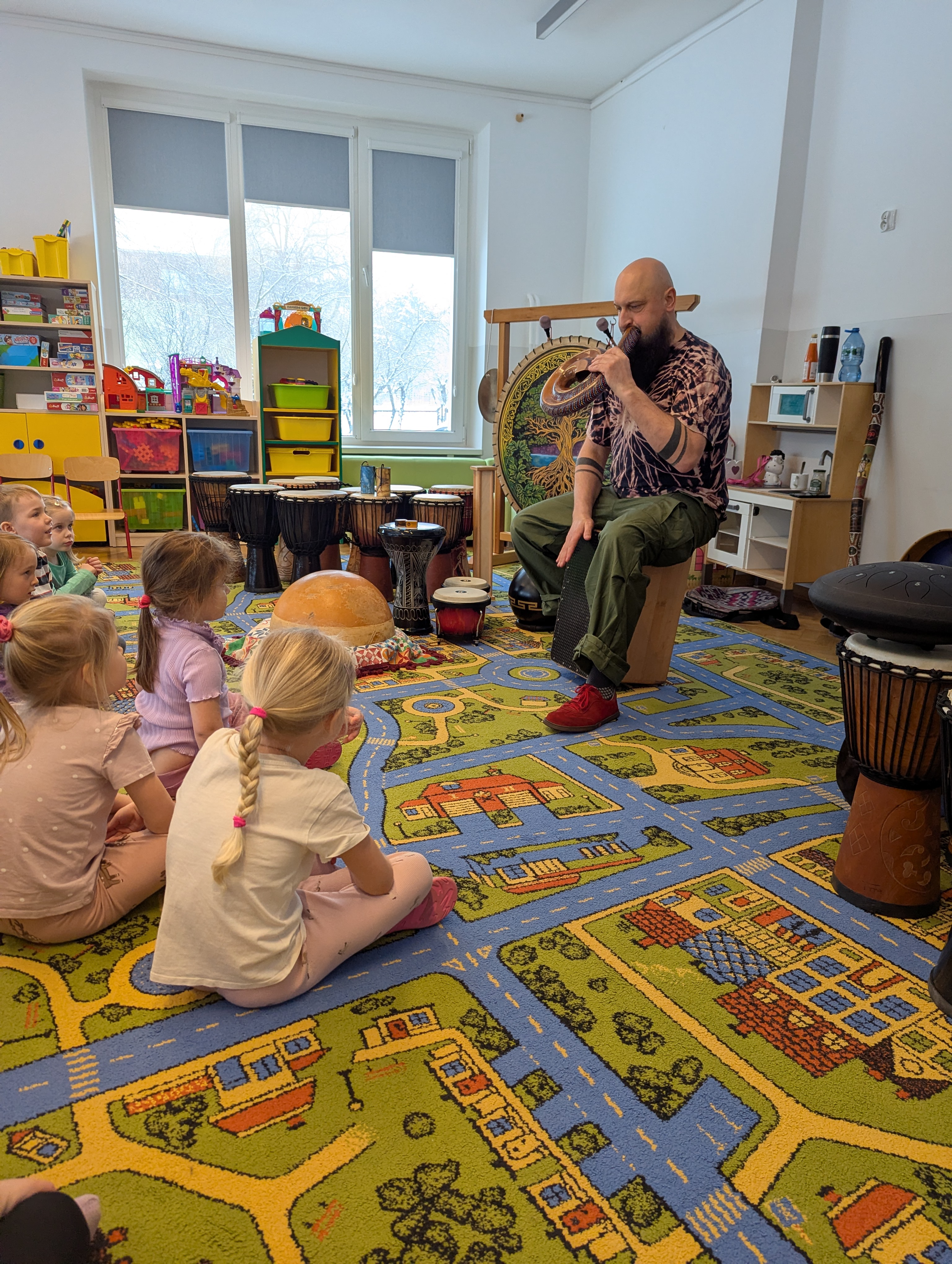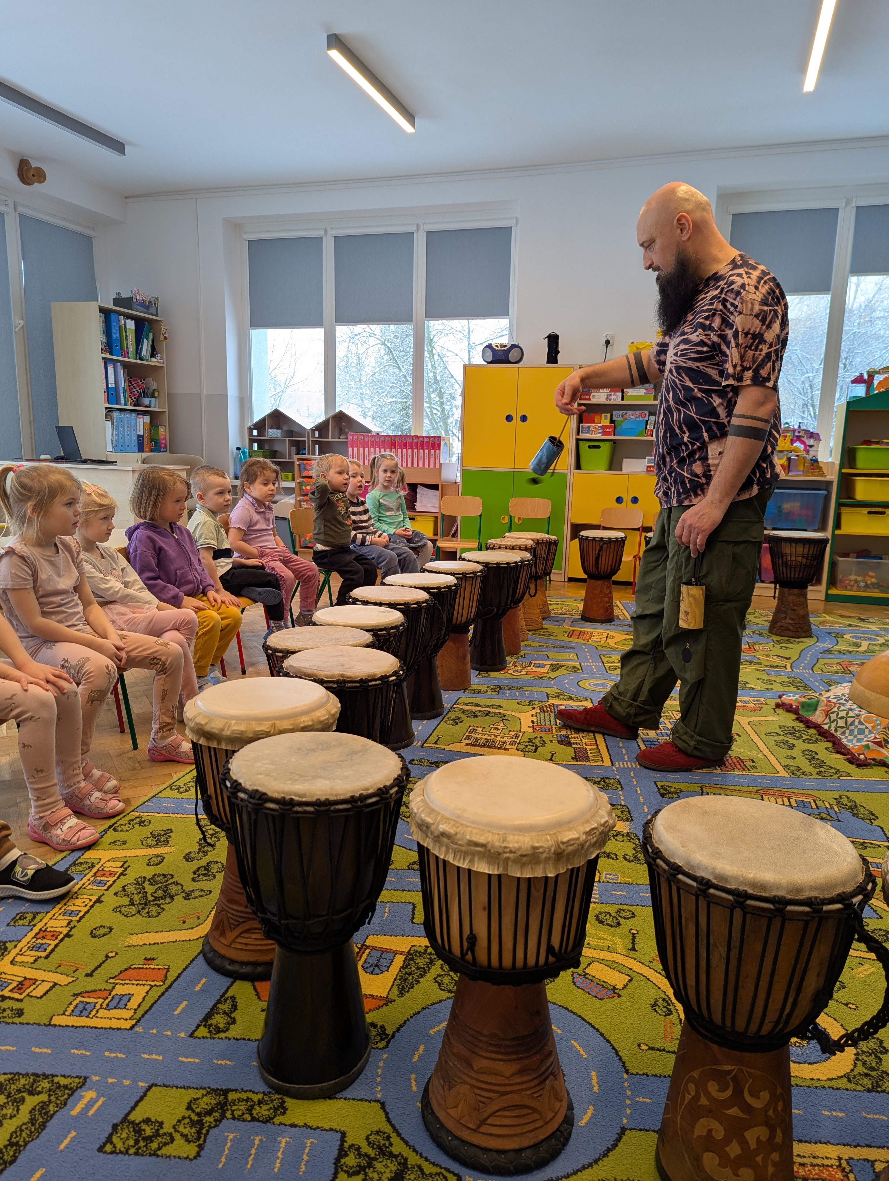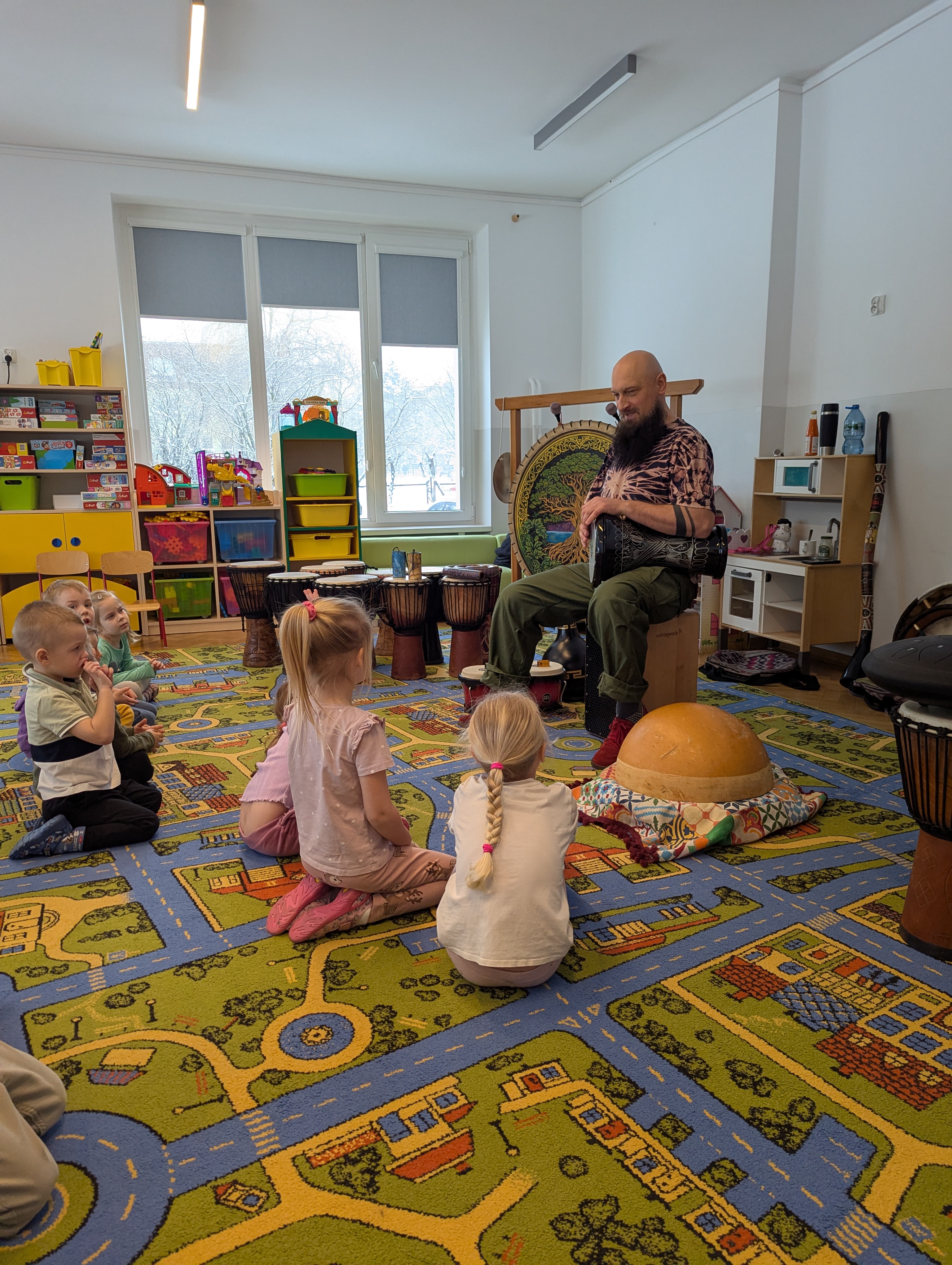 11.02.2026 r. odbyły się wyjątkowe warsztaty rytmiczno-bębniarskie, które dostarczyły dzieciom wielu nowych muzycznych doświadczeń. Pan Bogdan Kulik zaprezentował różnorodne instrumenty z różnych stron świata, opowiadając o ich pochodzeniu i sposobie wydobywania dźwięków.