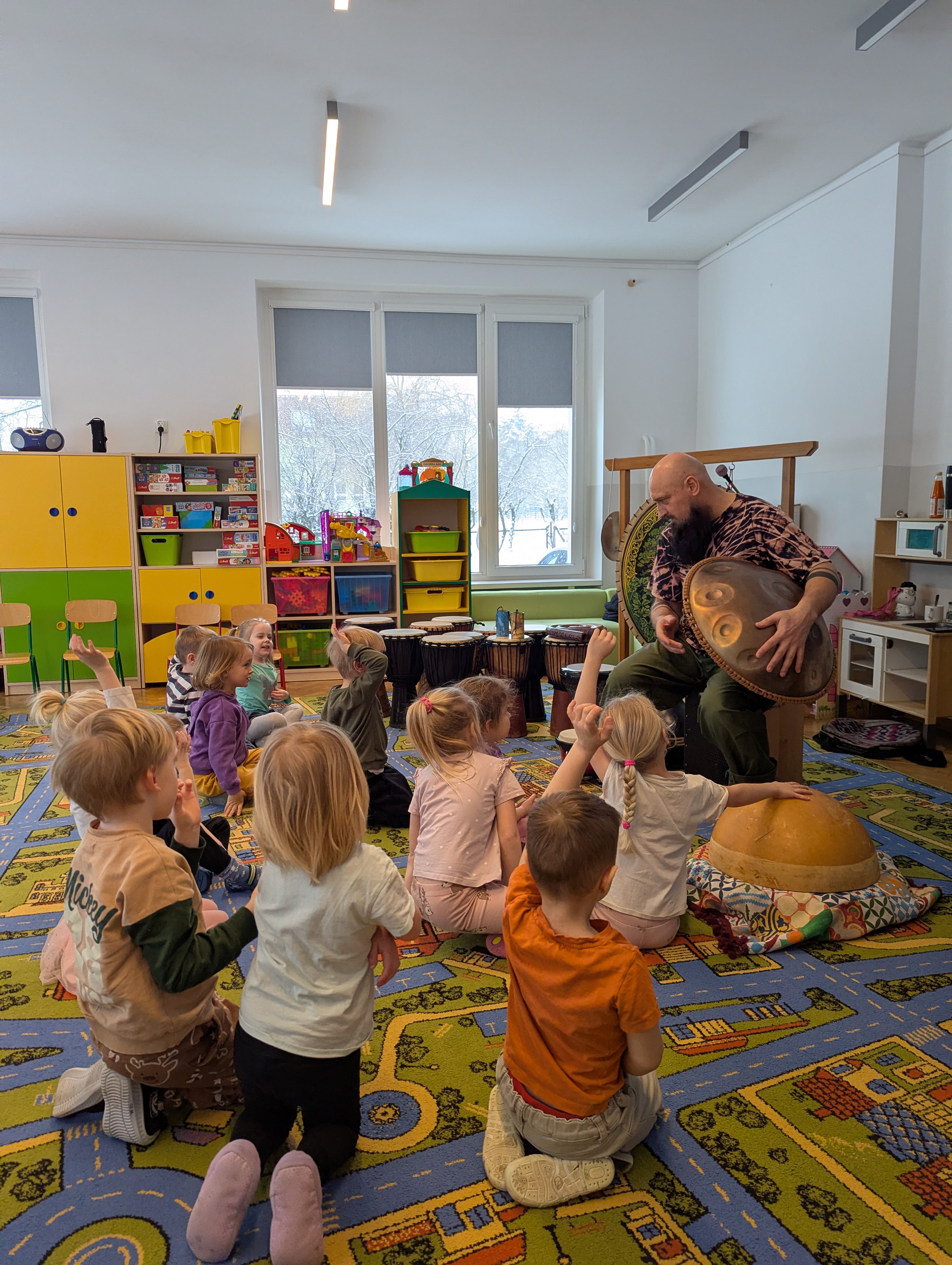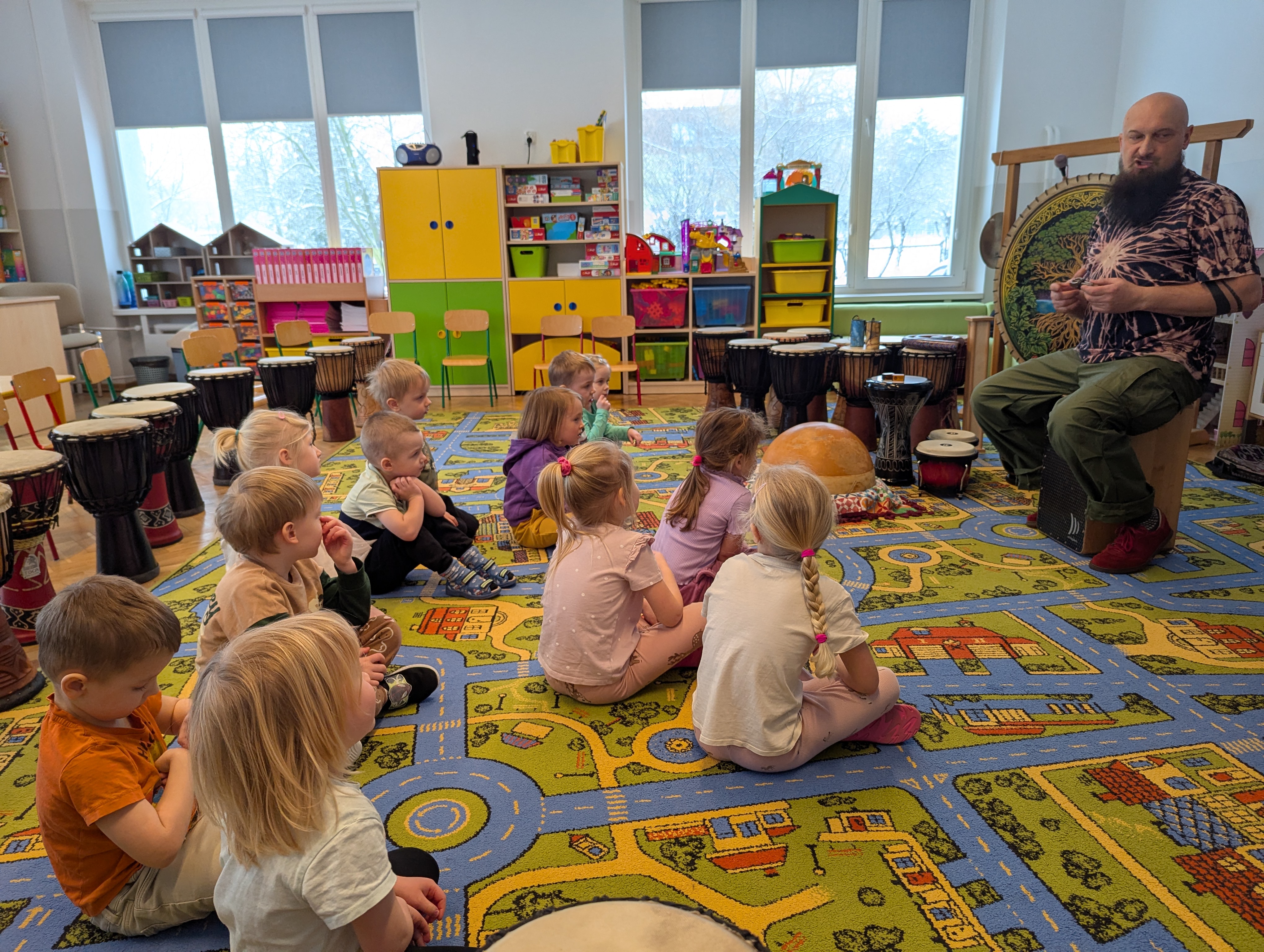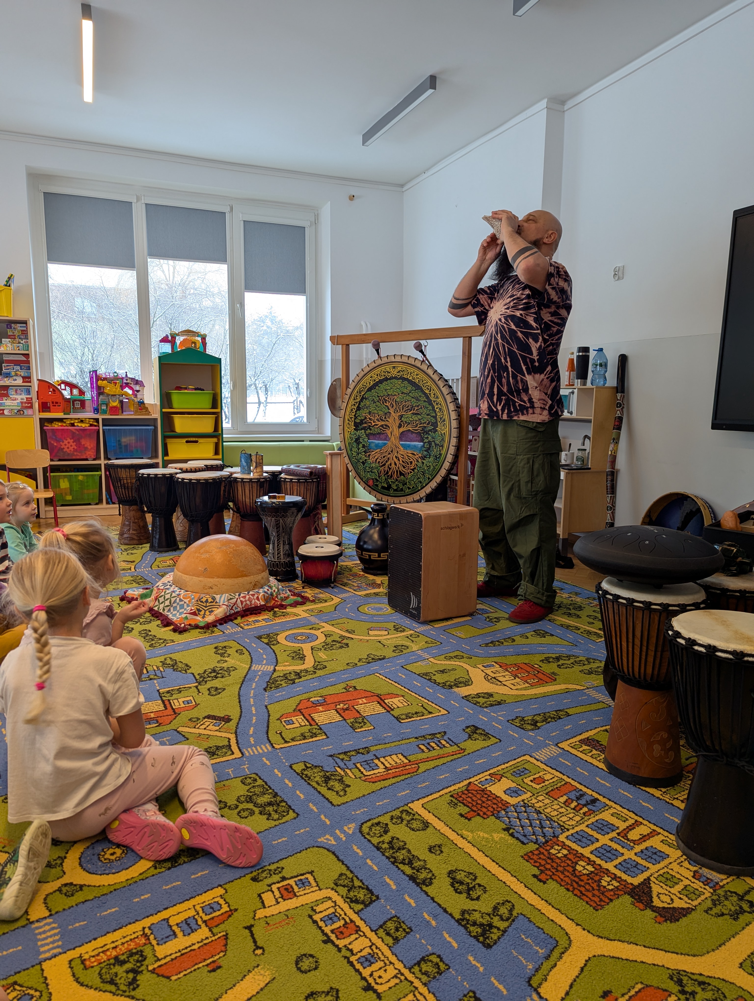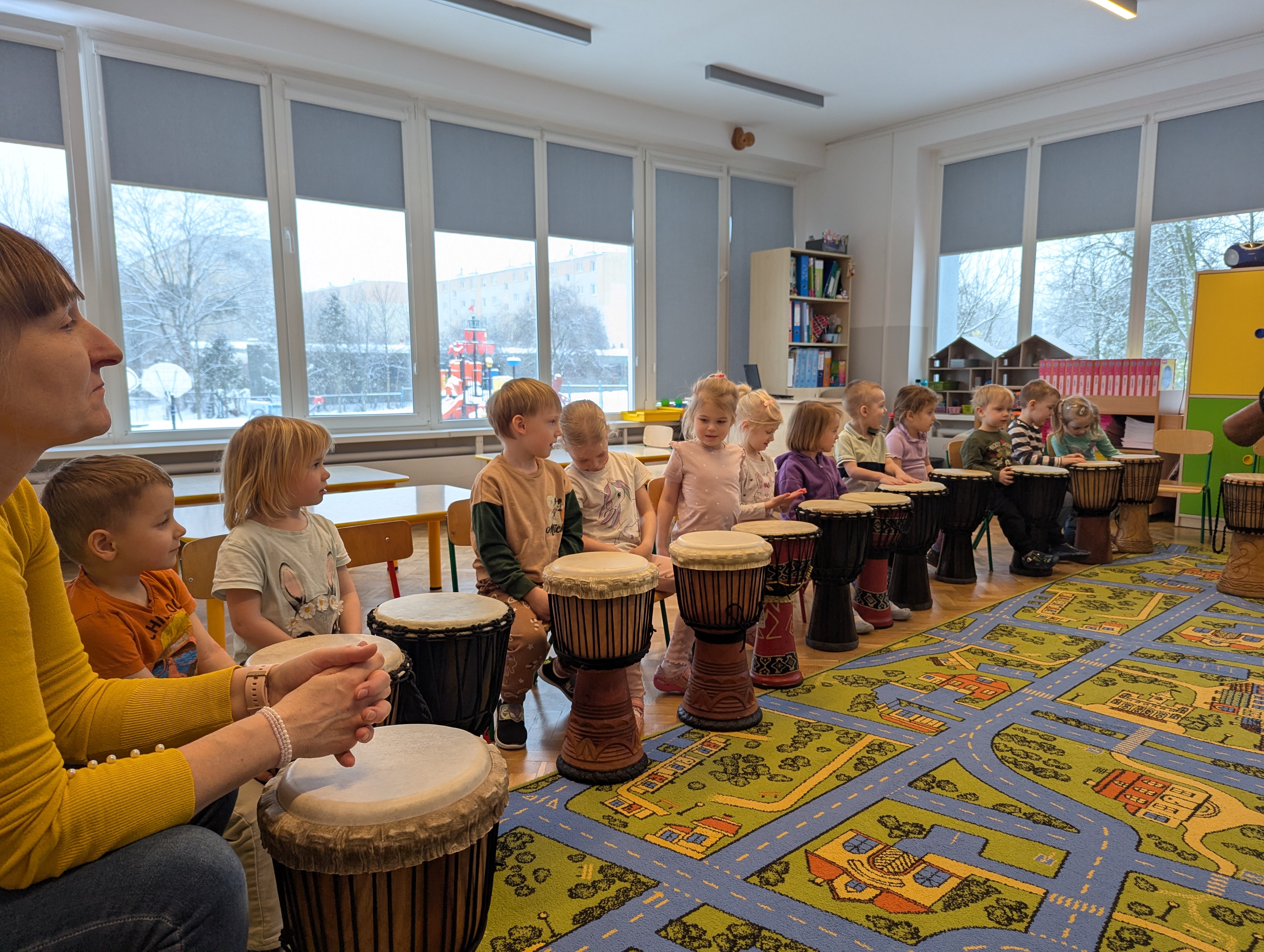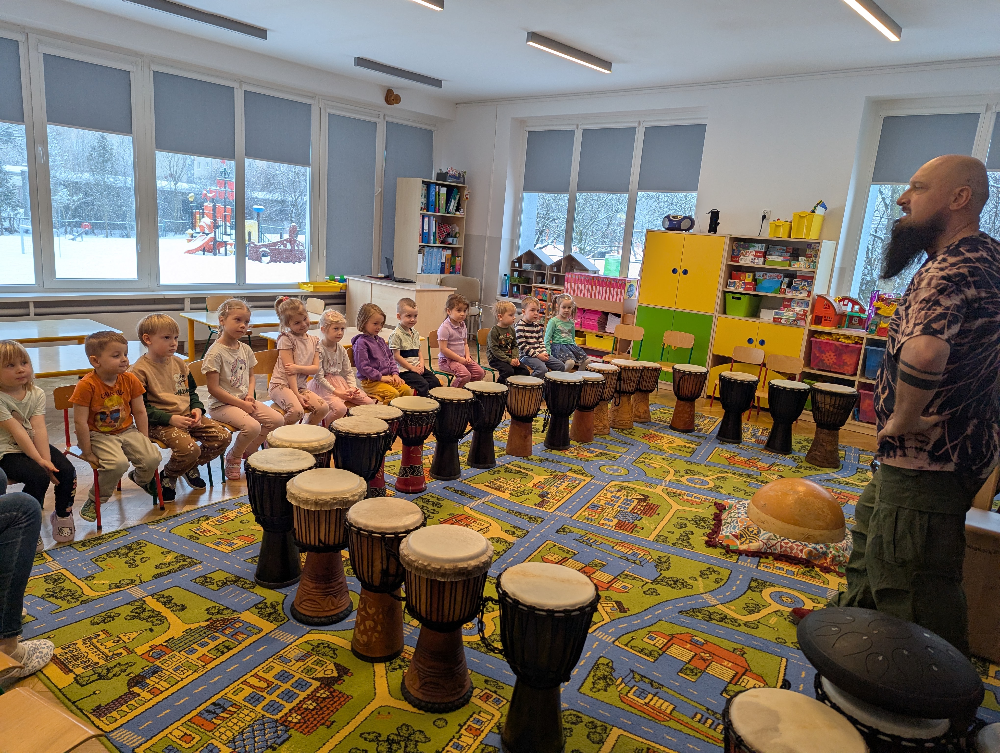 11.02.2026 r. odbyły się wyjątkowe warsztaty rytmiczno-bębniarskie, które dostarczyły dzieciom wielu nowych muzycznych doświadczeń. Pan Bogdan Kulik zaprezentował różnorodne instrumenty z różnych stron świata, opowiadając o ich pochodzeniu i sposobie wydobywania dźwięków.