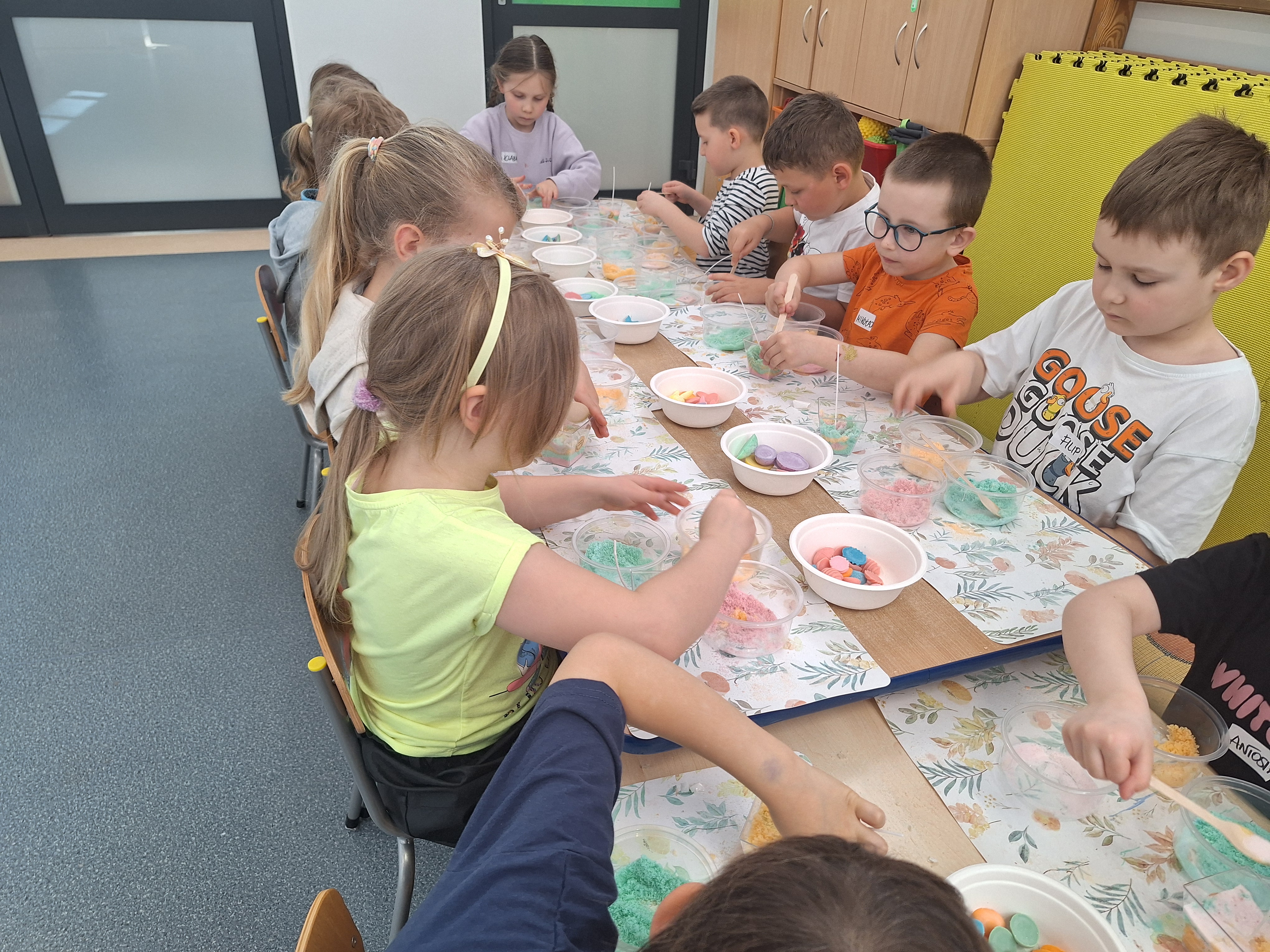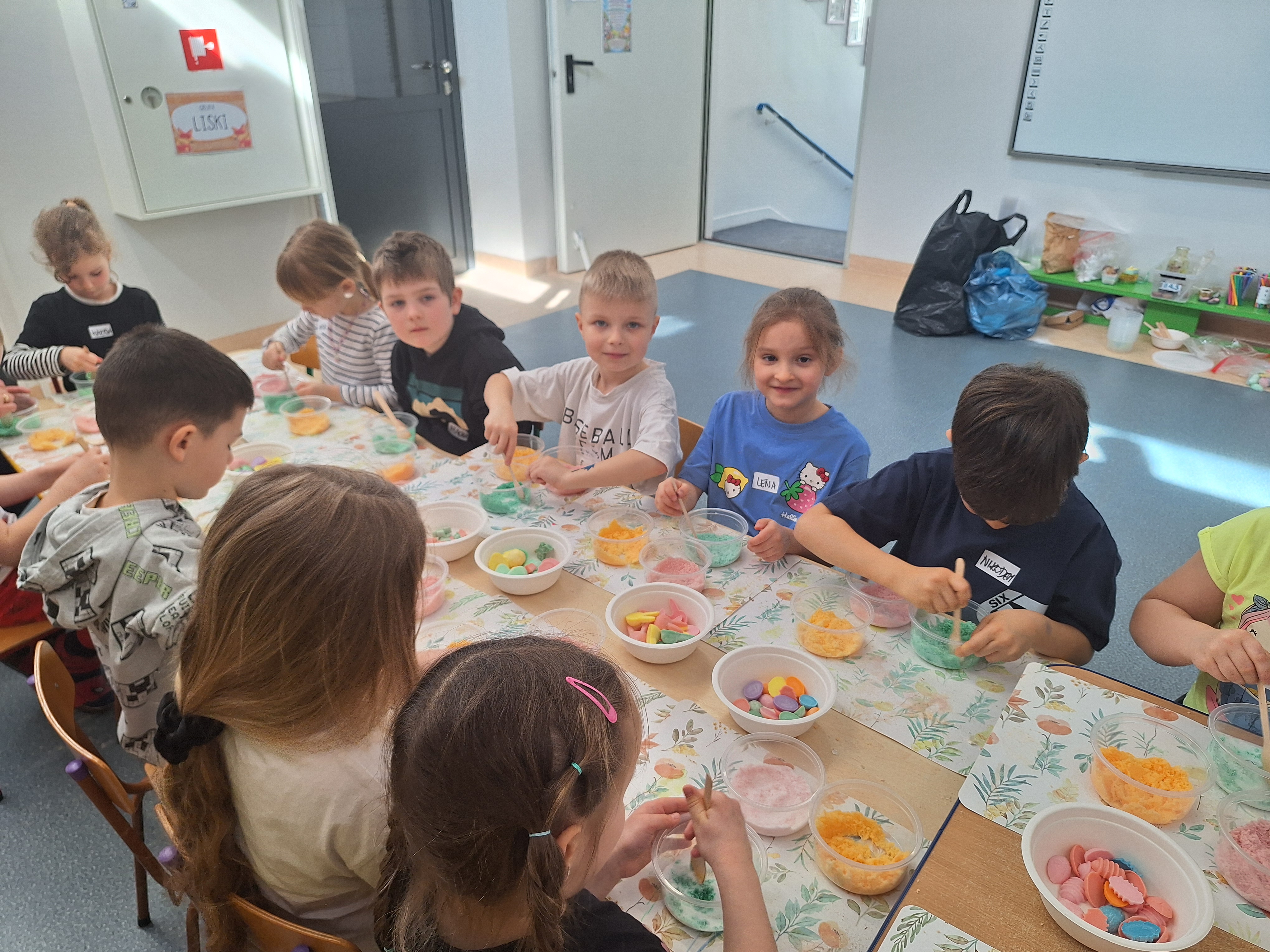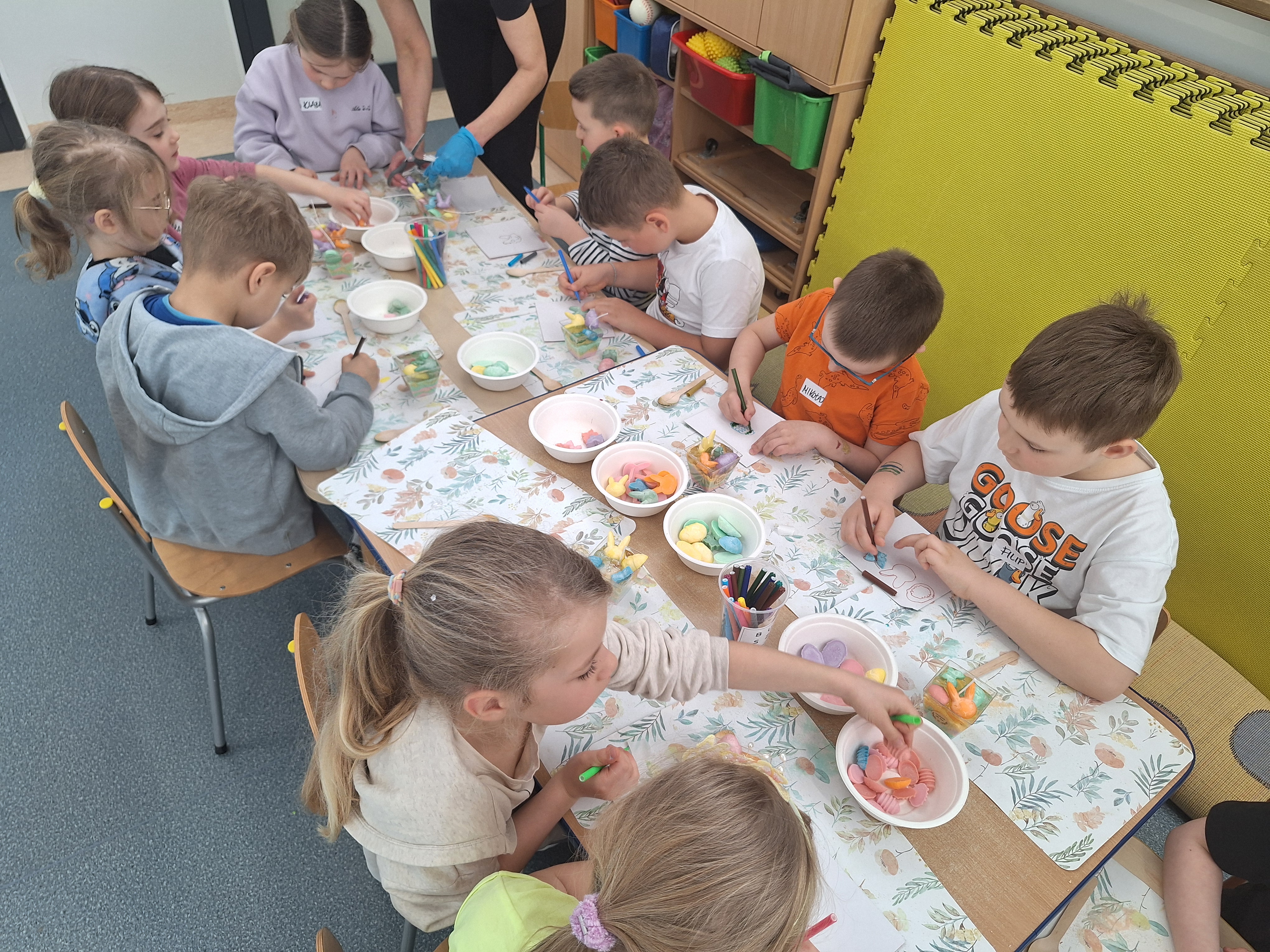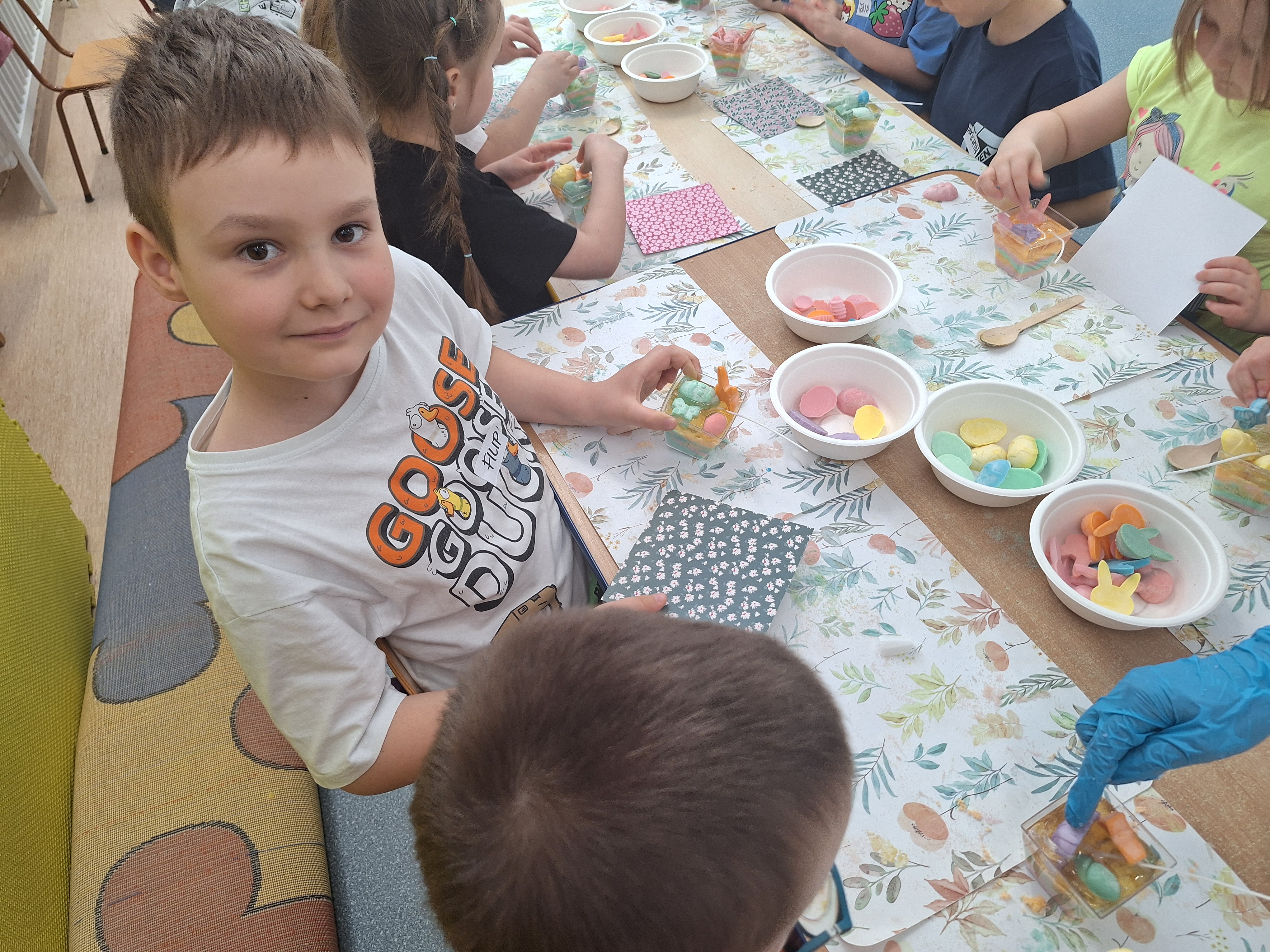 Podczas ostatnich warsztatów „Busz” dzieci miały okazję rozwijać swoją kreatywność i zdolności manualne, wykonując świece wielkanocne. W pracy wykorzystywały różnorodne akcesoria tematycznie związane ze Świętami Wielkanocnymi, takie jak elementy w kształcie jajek, kokard oraz zajączków, utrzymane w świątecznej, wiosennej kolorystyce, a także inne dekoracyjne dodatki.