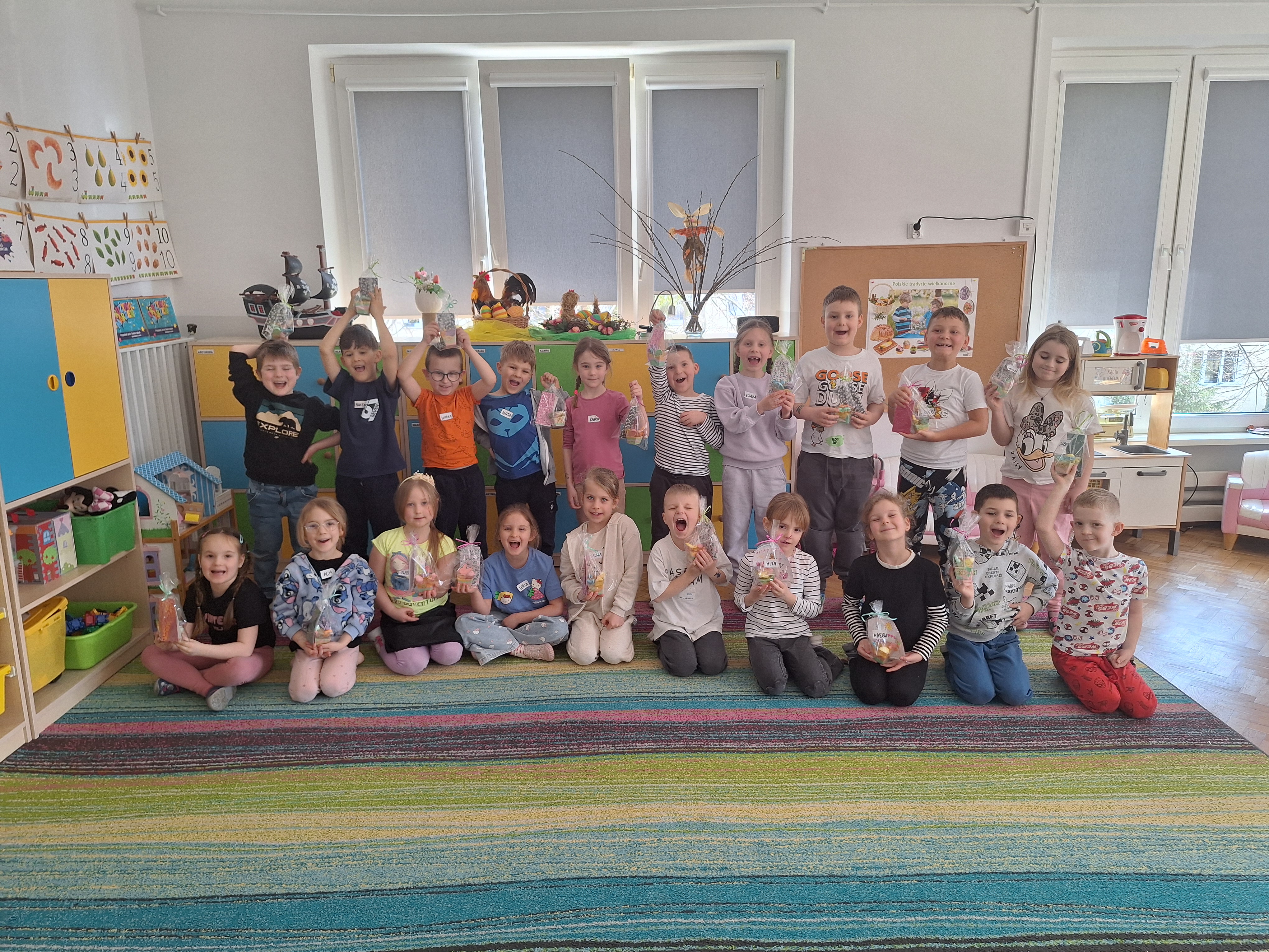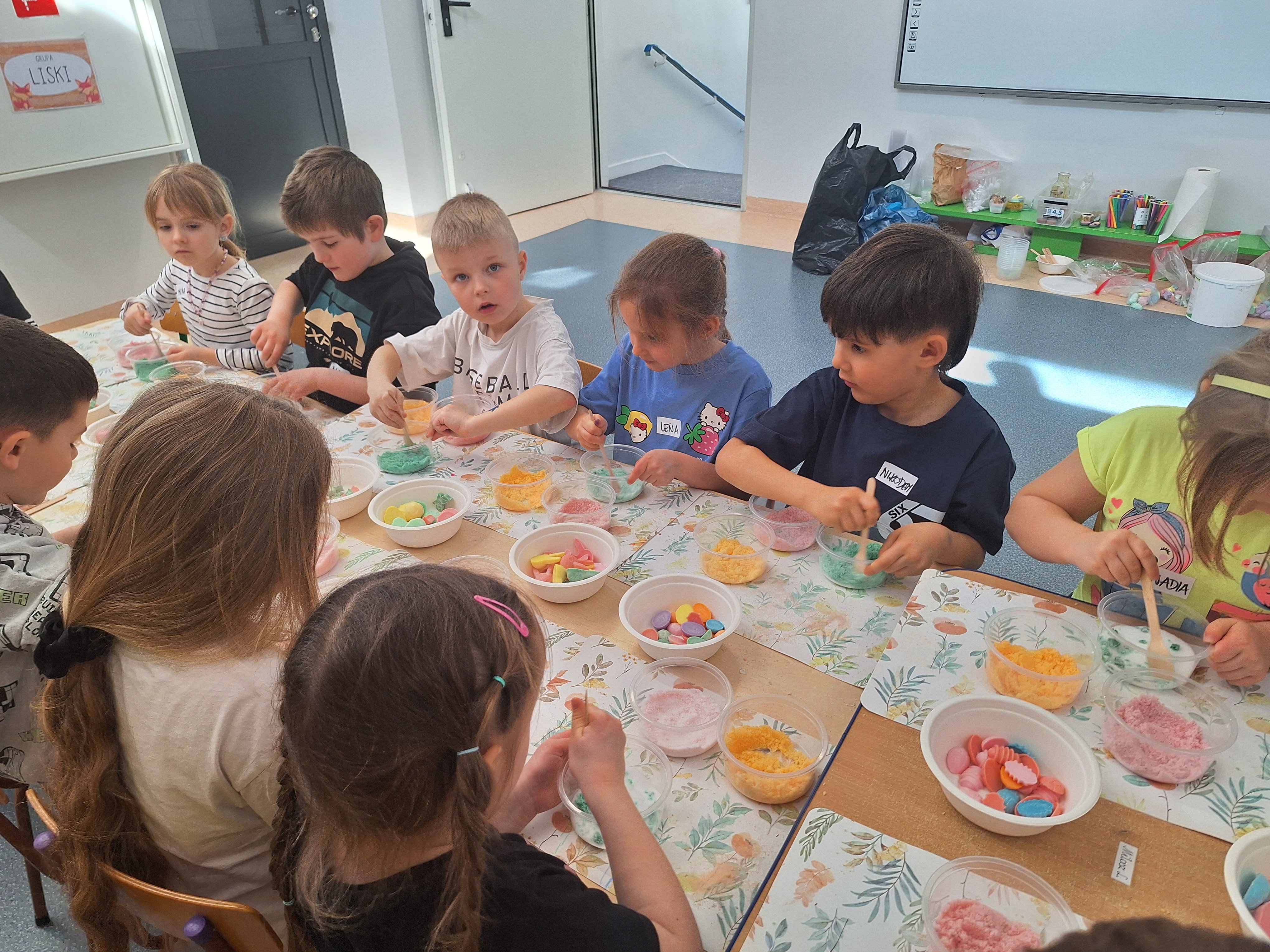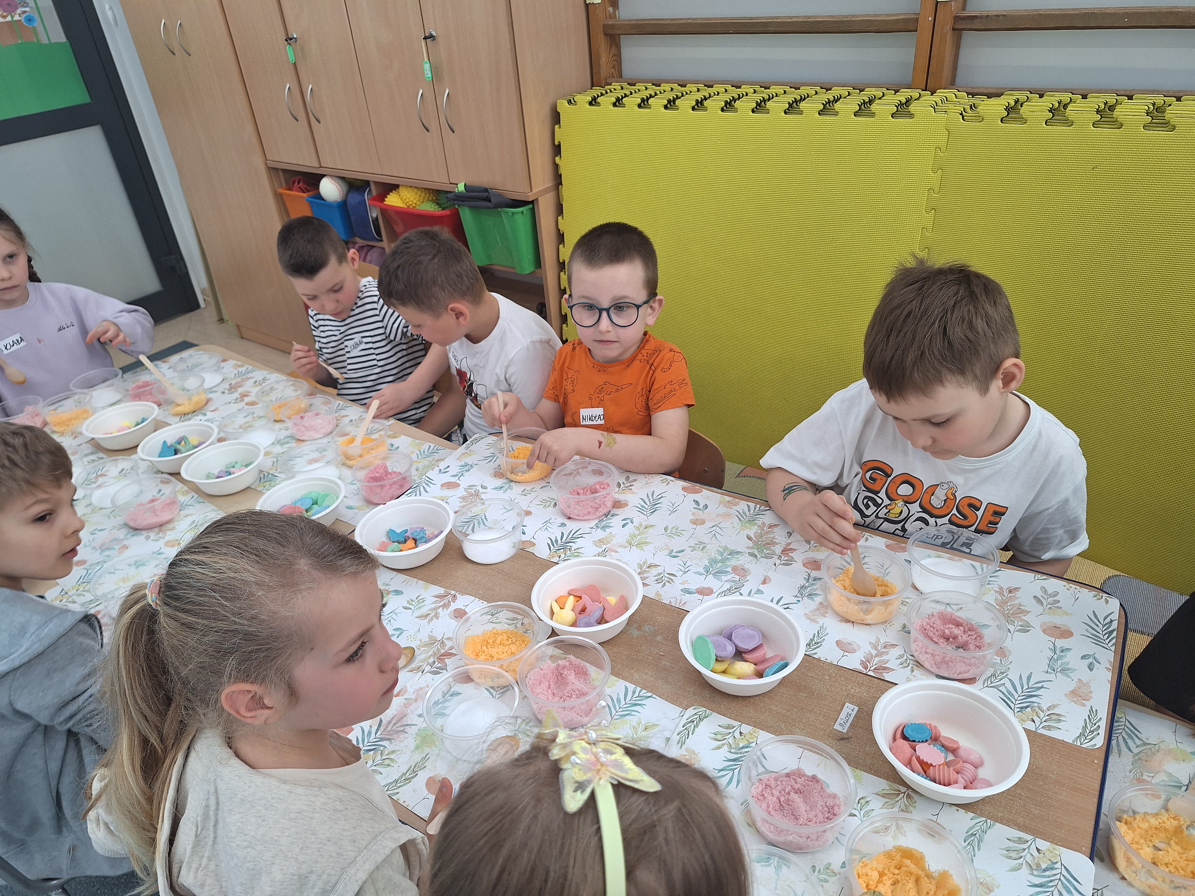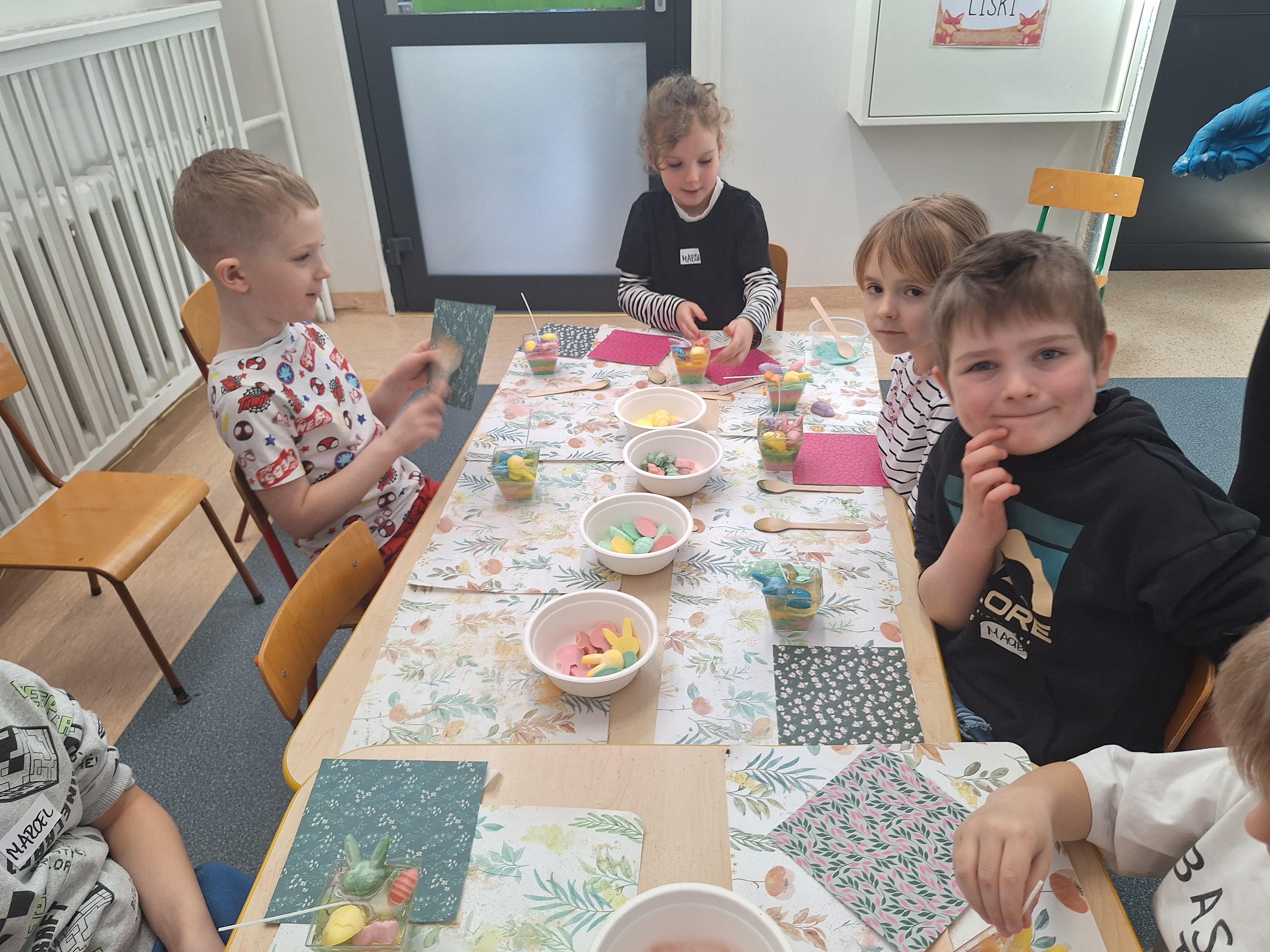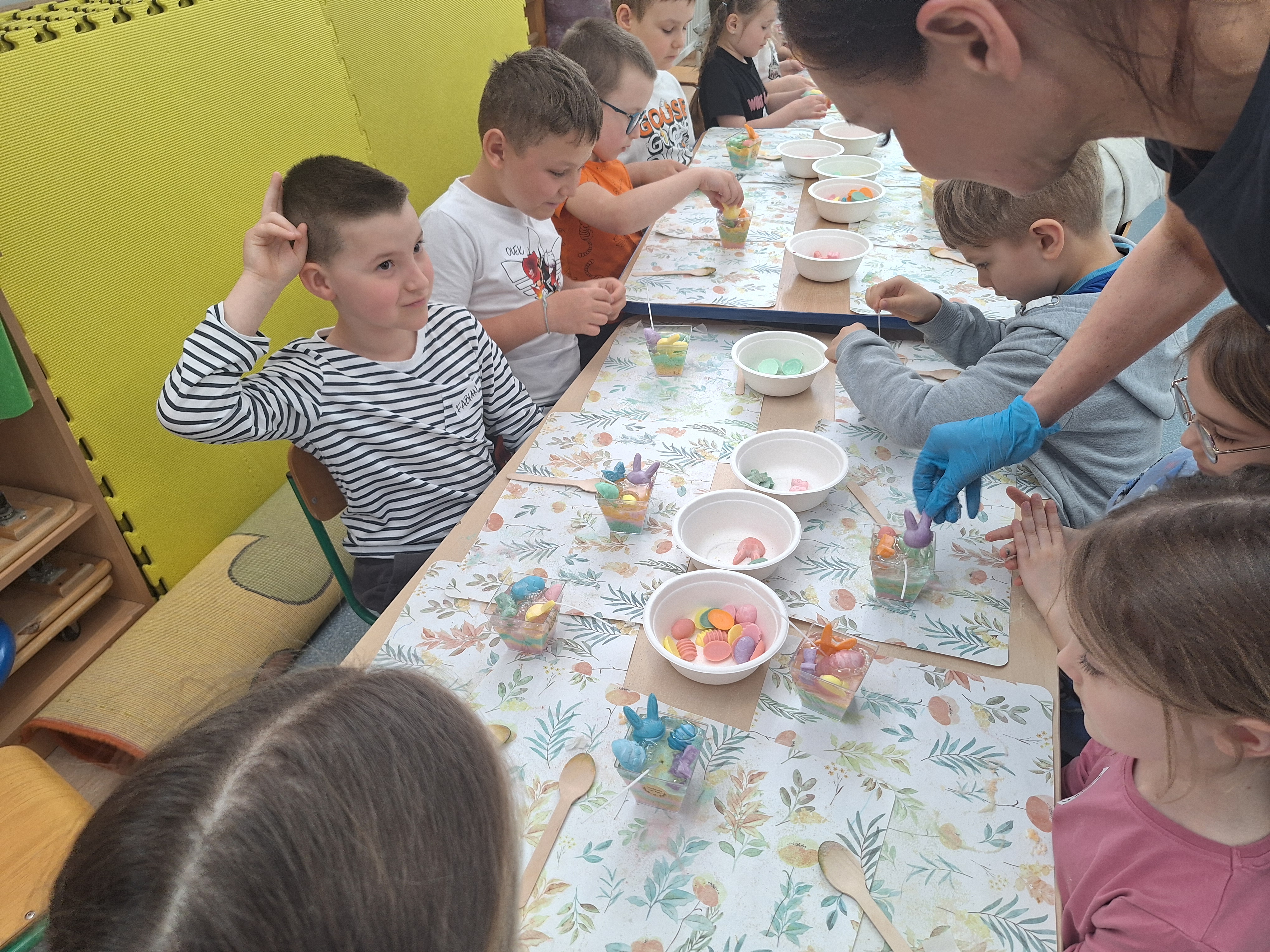 Podczas ostatnich warsztatów „Busz” dzieci miały okazję rozwijać swoją kreatywność i zdolności manualne, wykonując świece wielkanocne. W pracy wykorzystywały różnorodne akcesoria tematycznie związane ze Świętami Wielkanocnymi, takie jak elementy w kształcie jajek, kokard oraz zajączków, utrzymane w świątecznej, wiosennej kolorystyce, a także inne dekoracyjne dodatki.