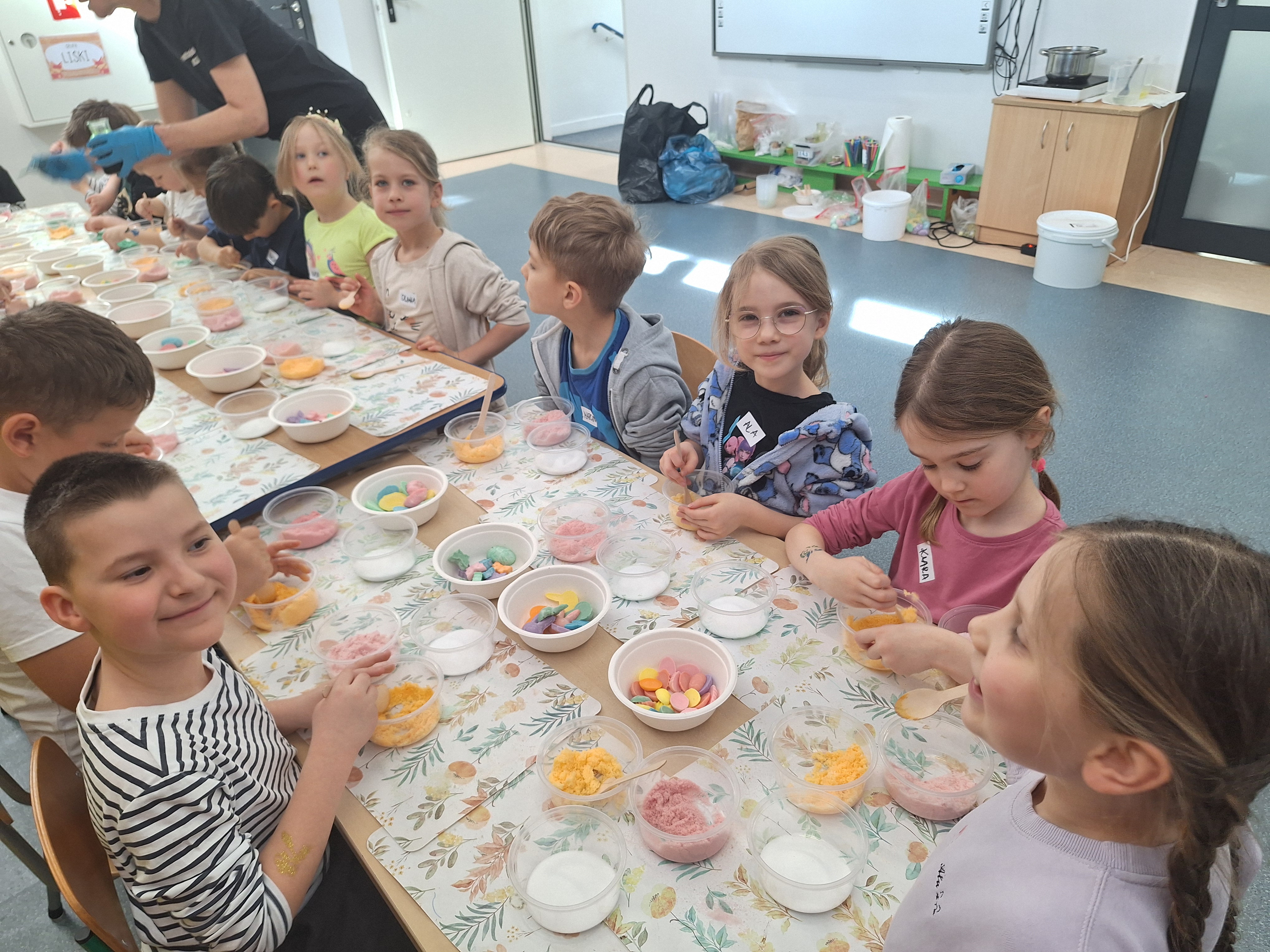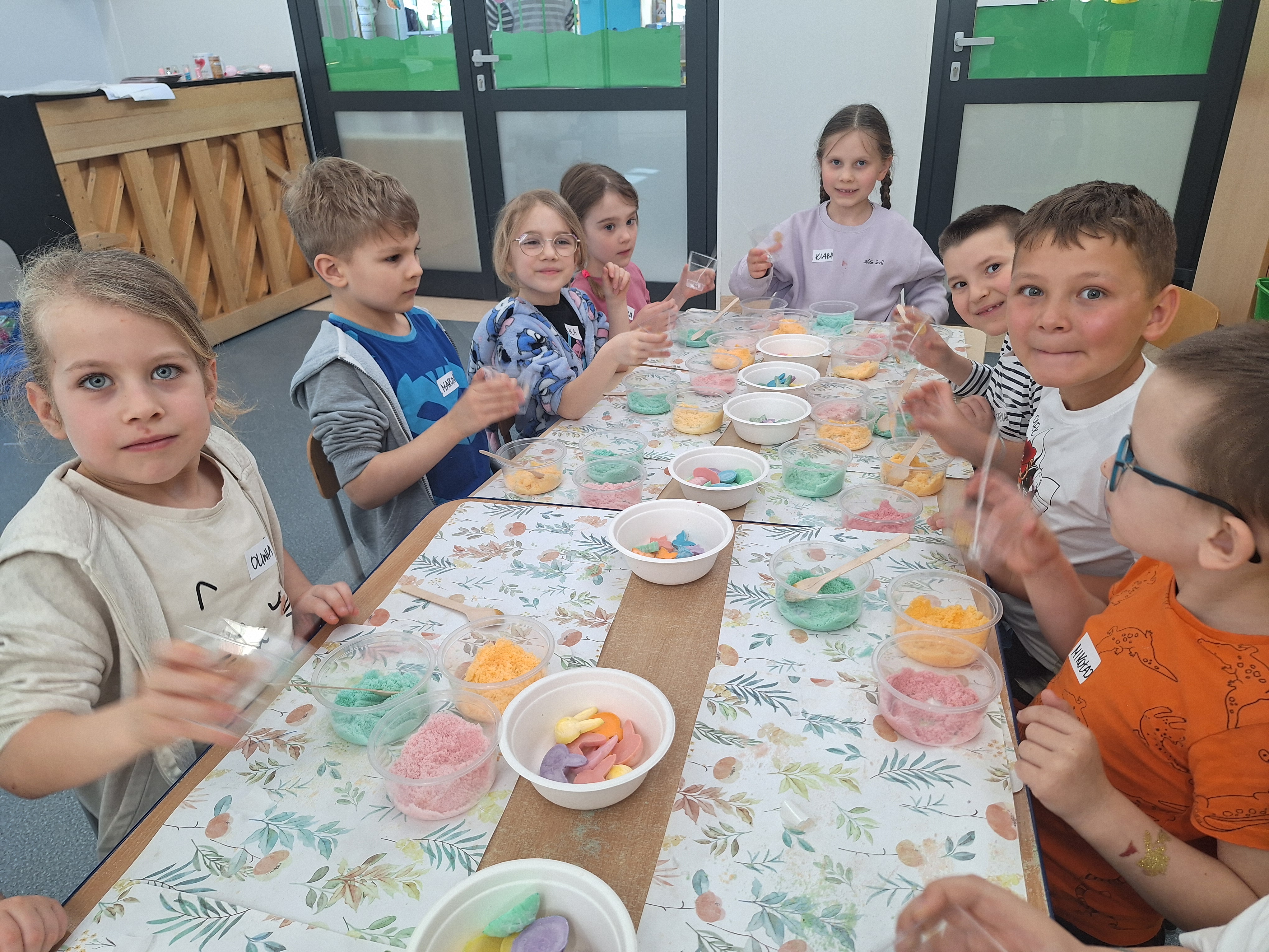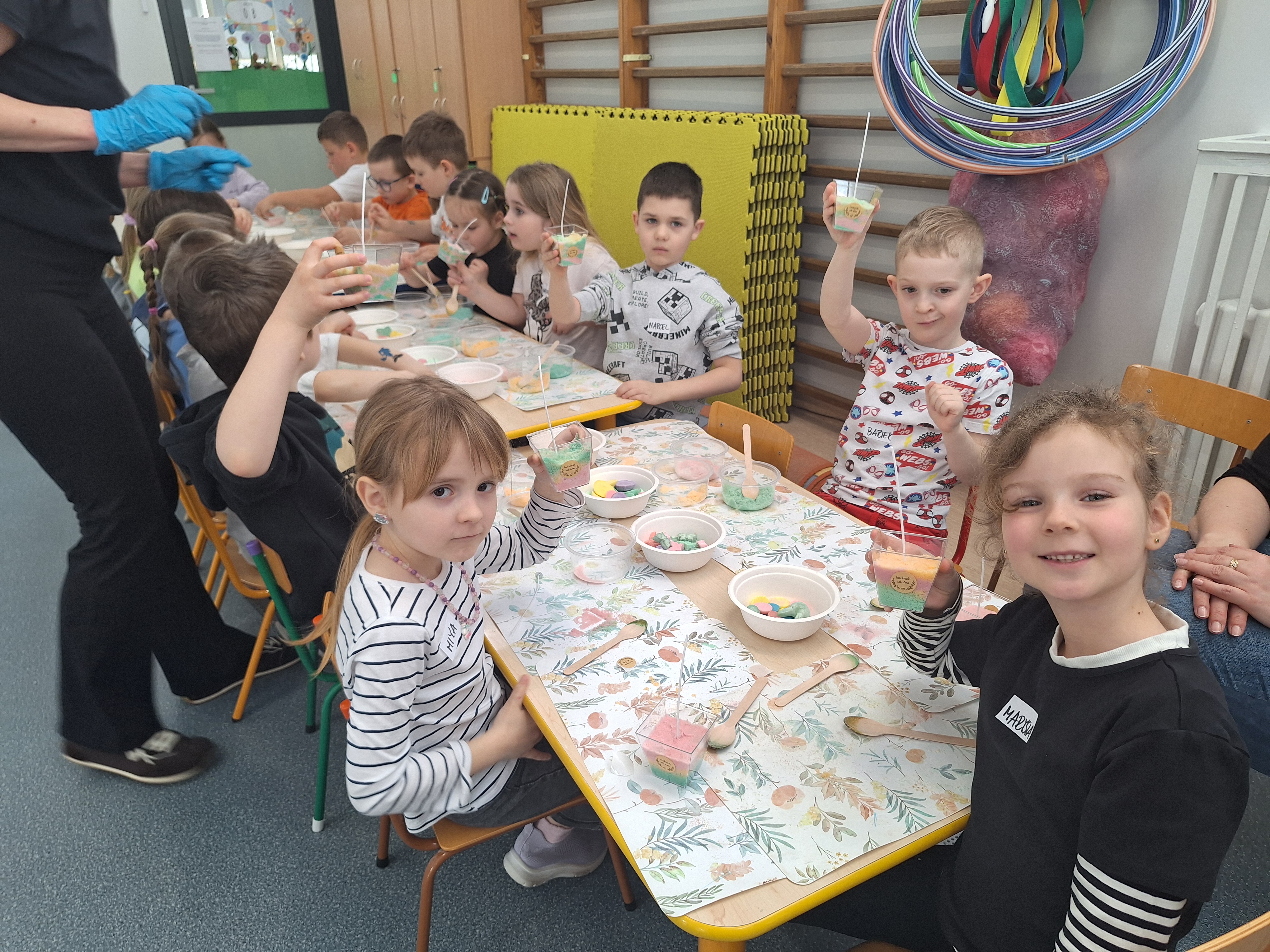 Zajęcia przebiegały w miłej i twórczej atmosferze, a dzieci z dużym zaangażowaniem tworzyły swoje unikalne prace. Każda świeca była wyjątkowa i odzwierciedlała indywidualne pomysły oraz wyobraźnię jej autora.