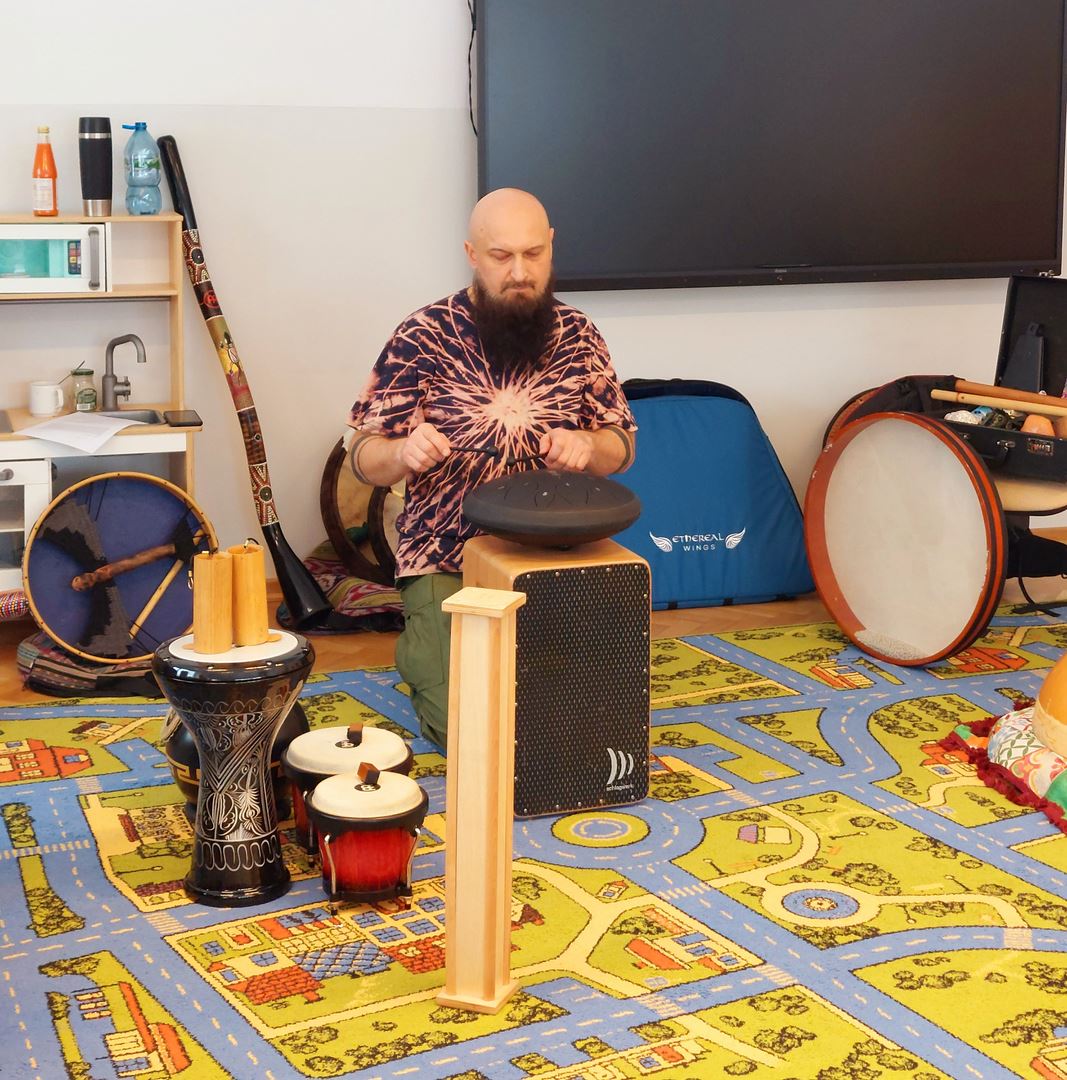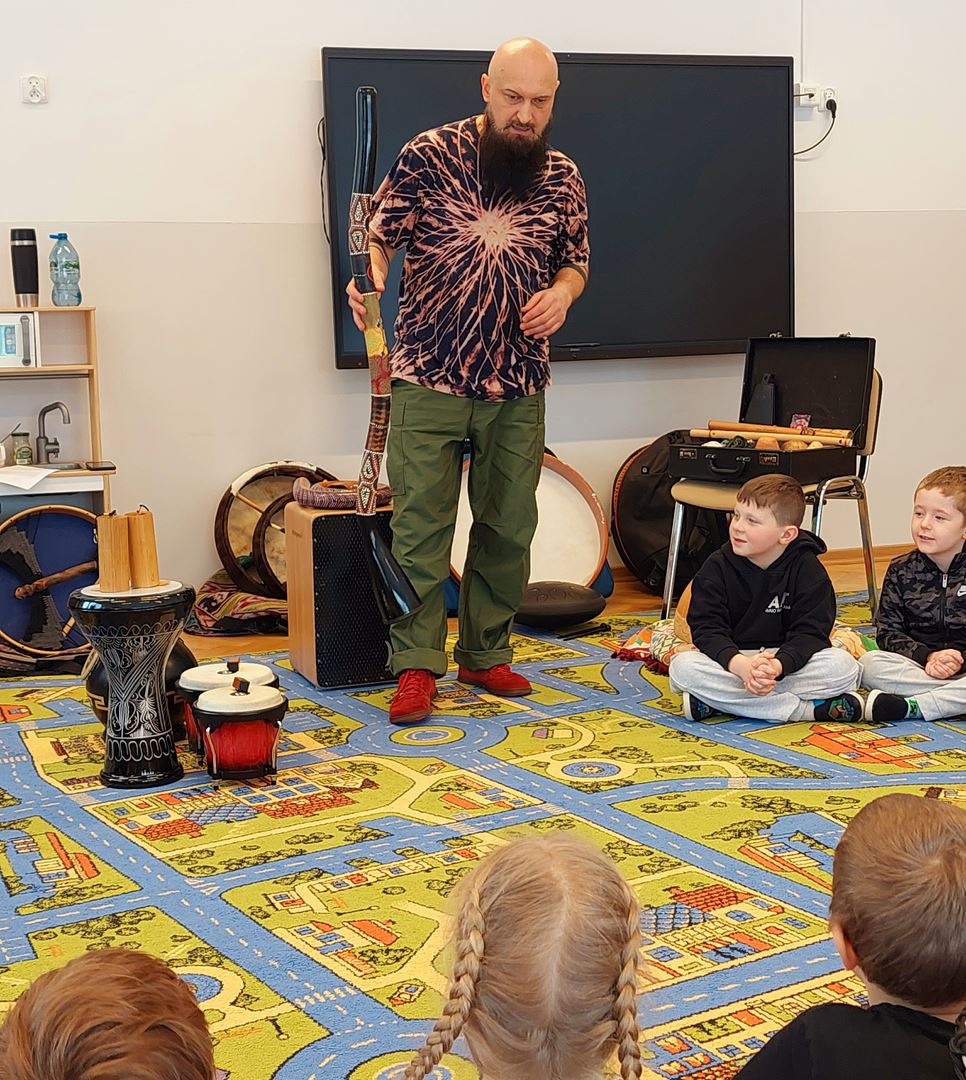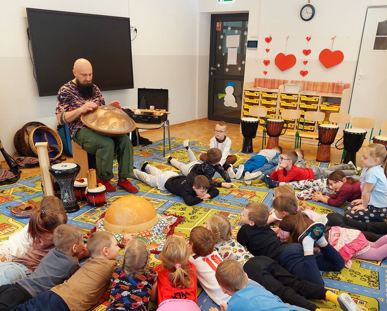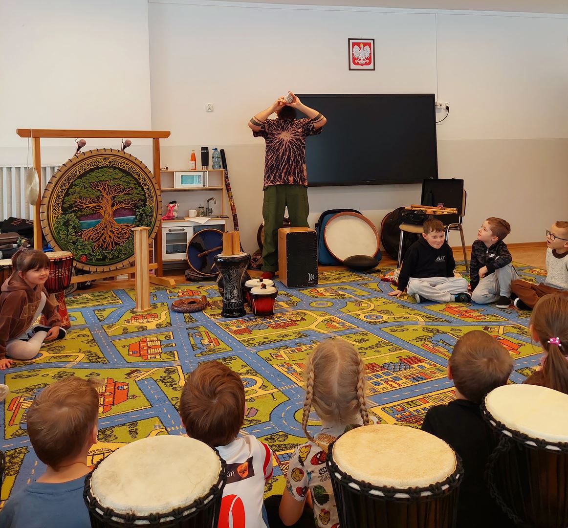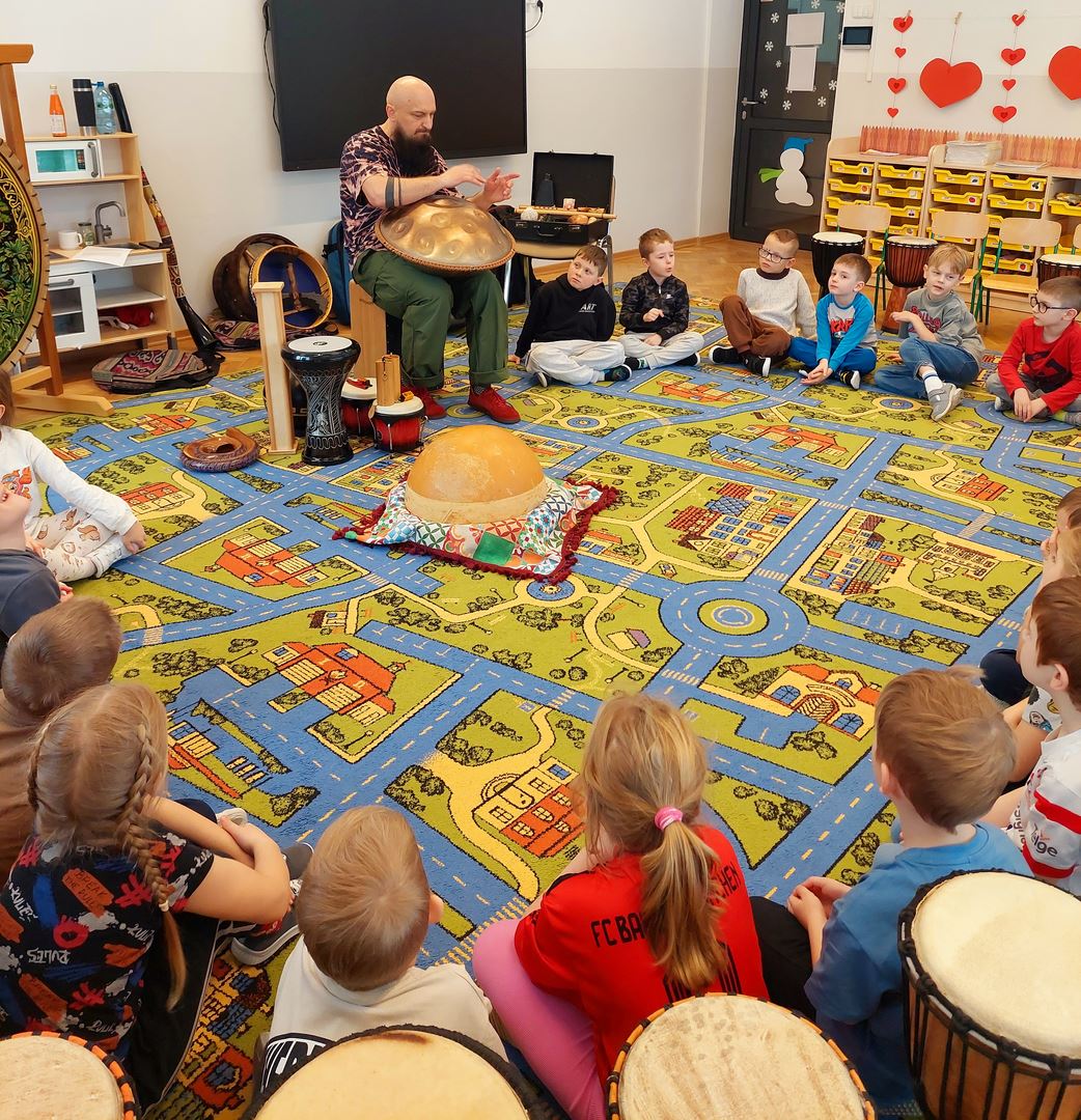 Dzieci były zachwycone! Z ogromnym zainteresowaniem słuchały, próbowały i odkrywały nowe dźwięki. Wśród ogromu prezentowanych instrumentów znalazły się m.in.: djembe, kazu, didgeridoo, handpan, drumla i wiele innych. Były także takie, imitujące dźwięk ptaków , deszcz czy szum oceanu...
